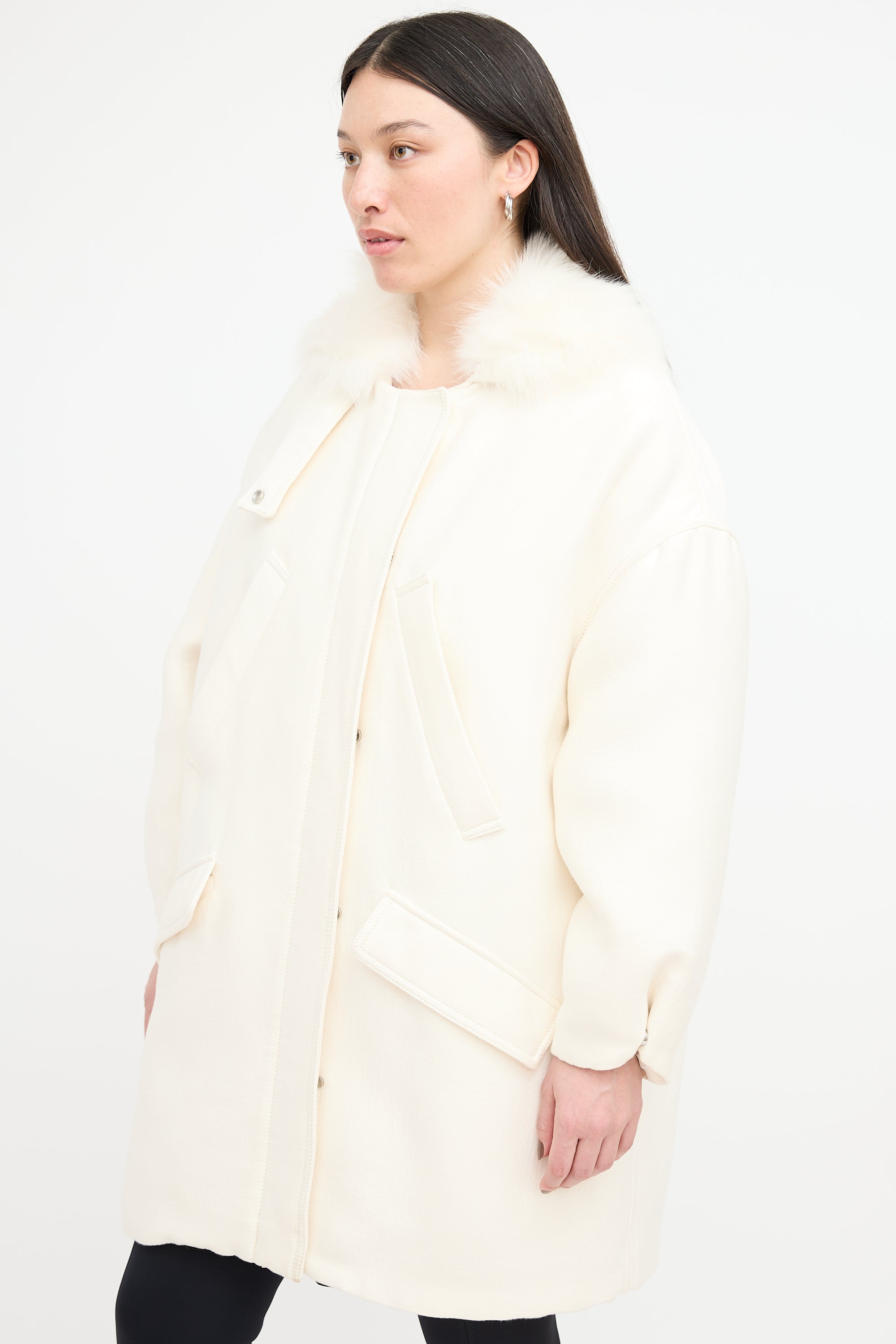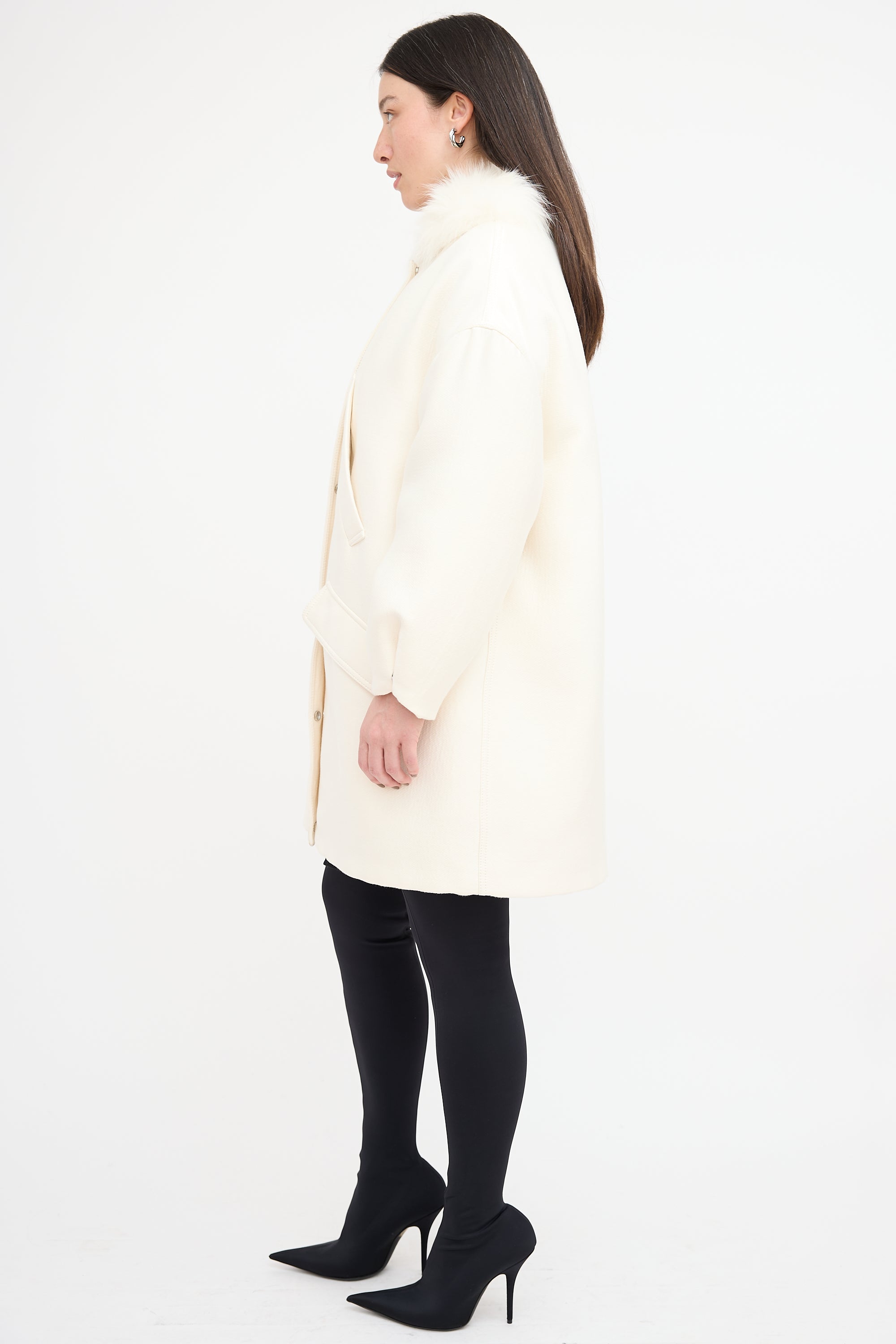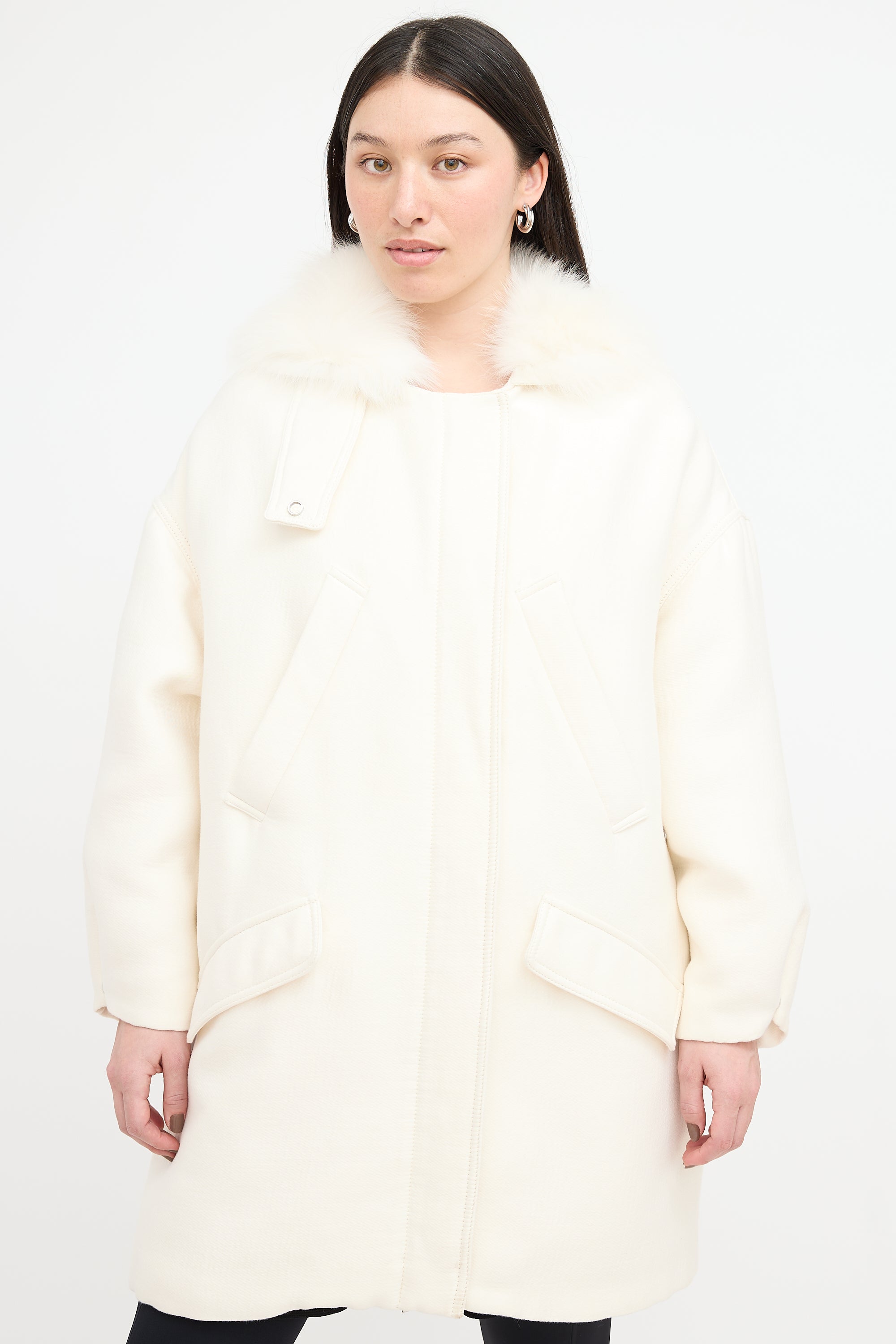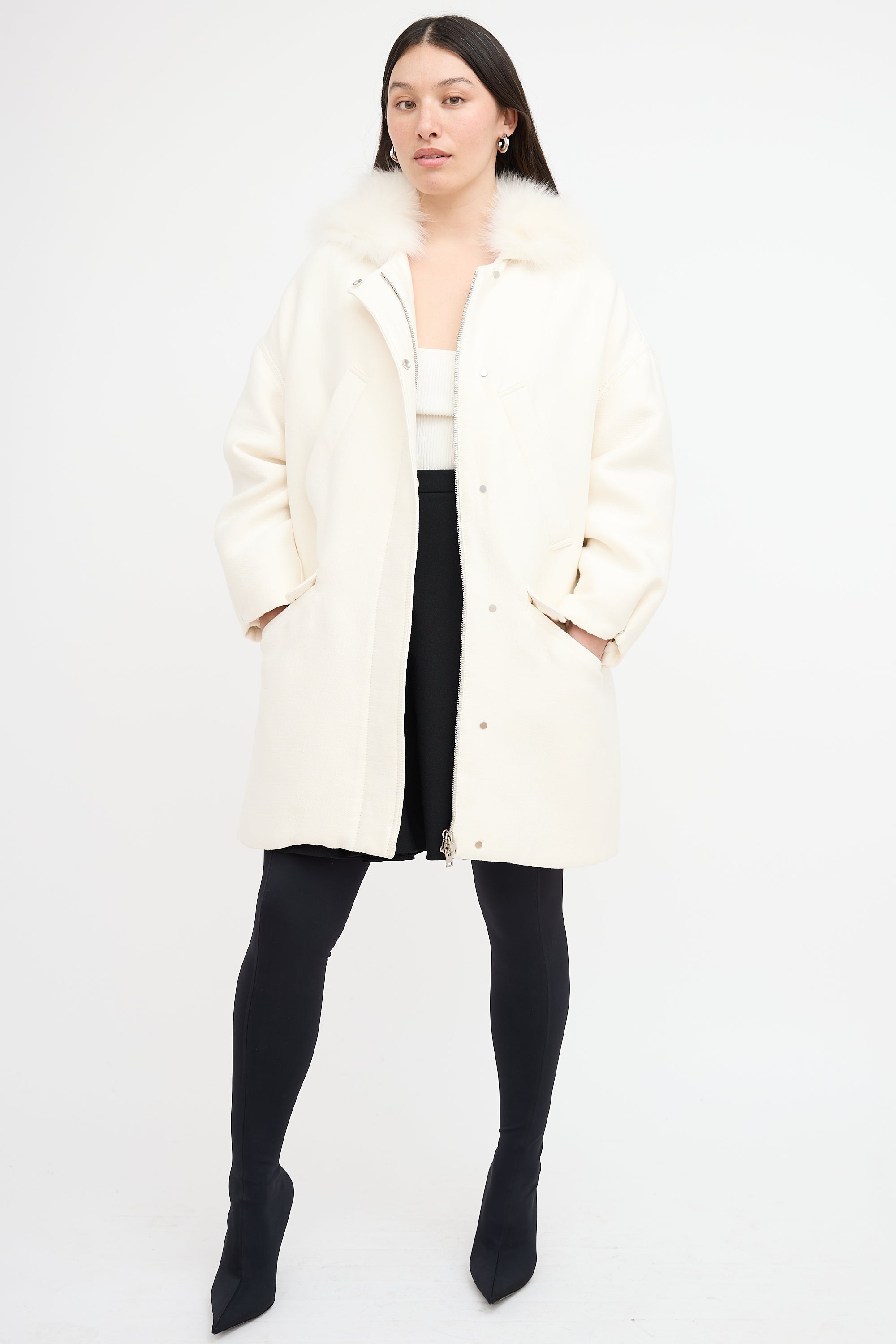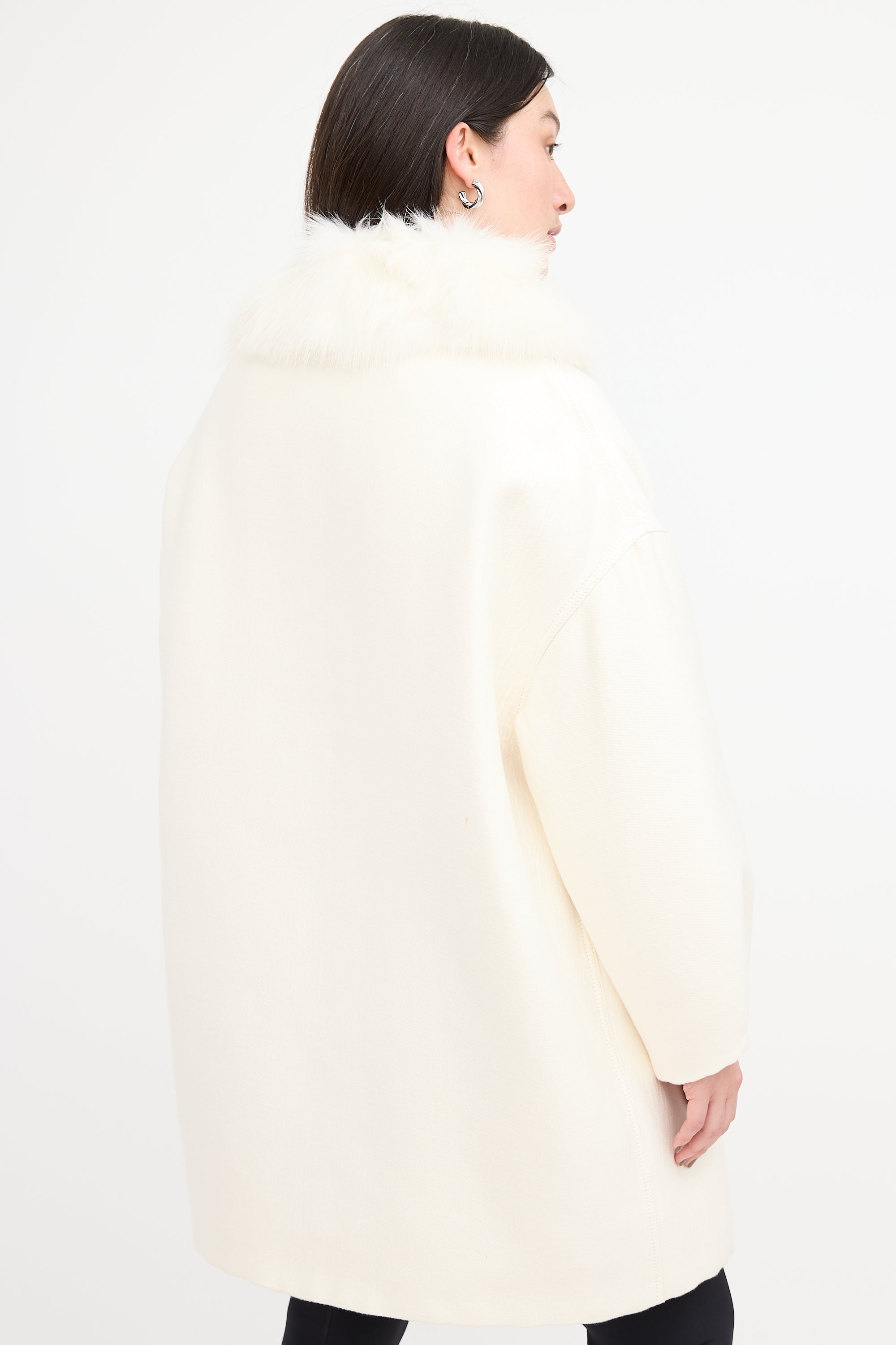 Pre-owned Giambattista Valli white neoprene coat featuring a fur layered collar with strap detail, front double zip, snap button placket, four front pockets, and snap buttoned cuffs. Lined.