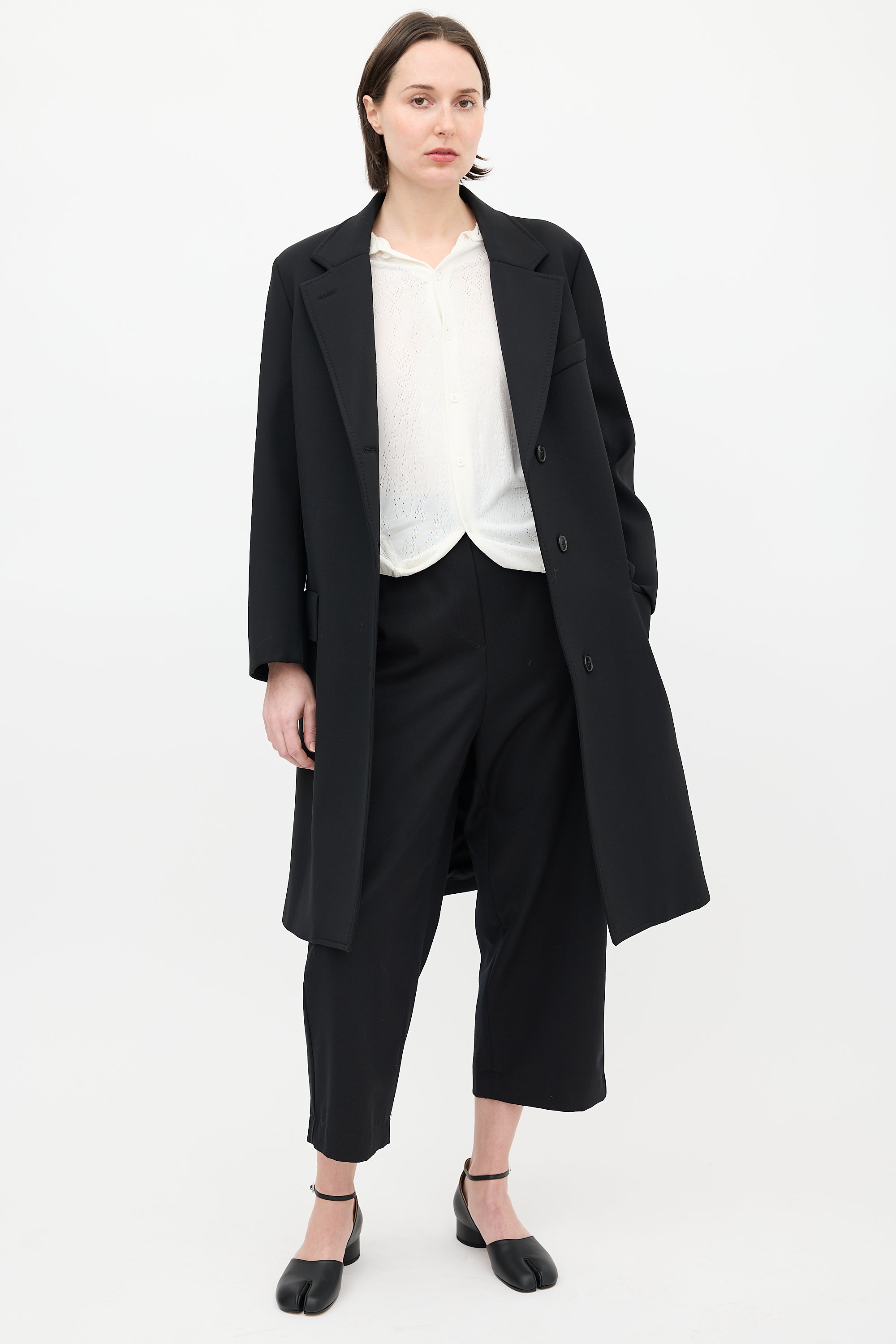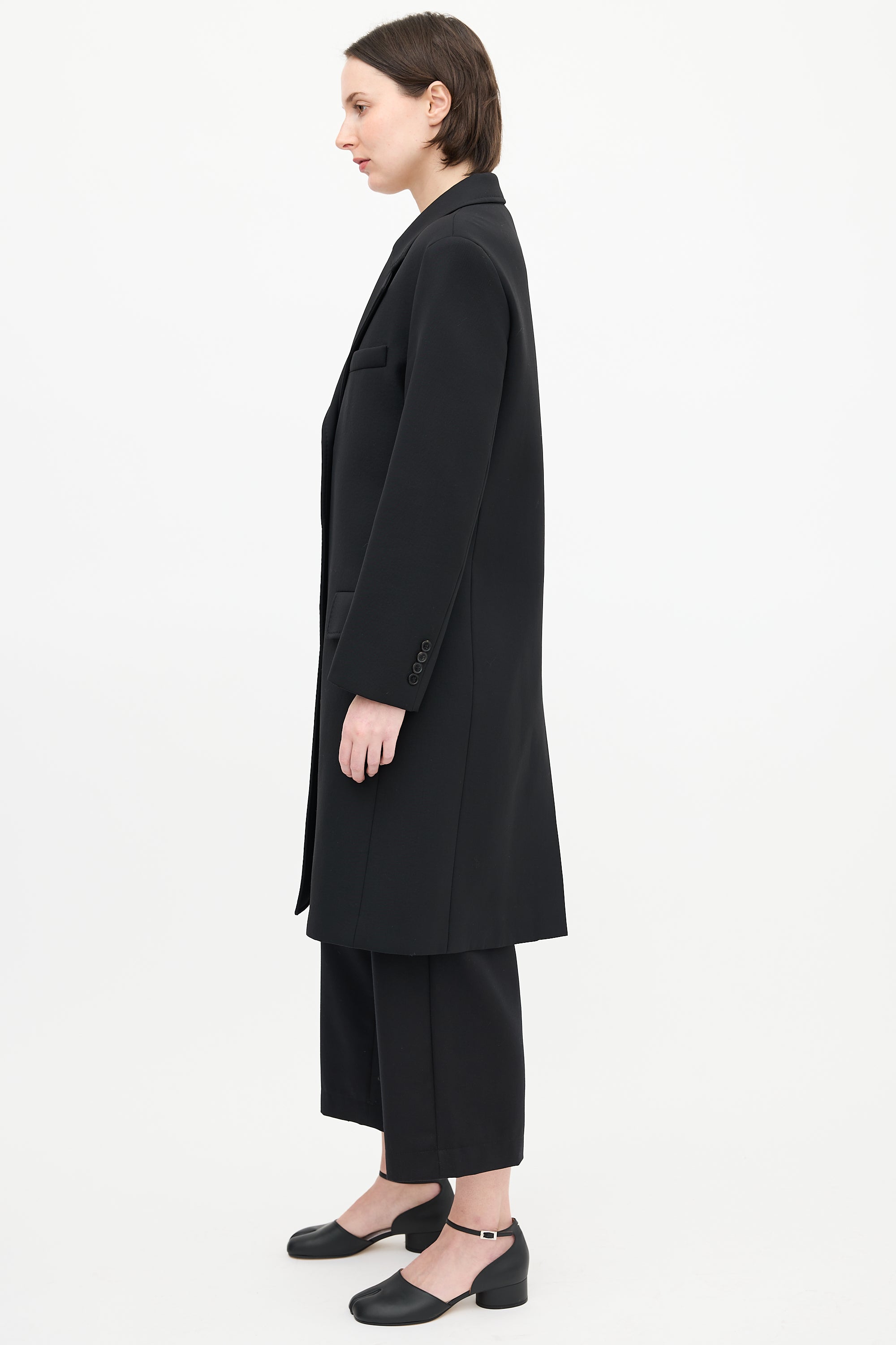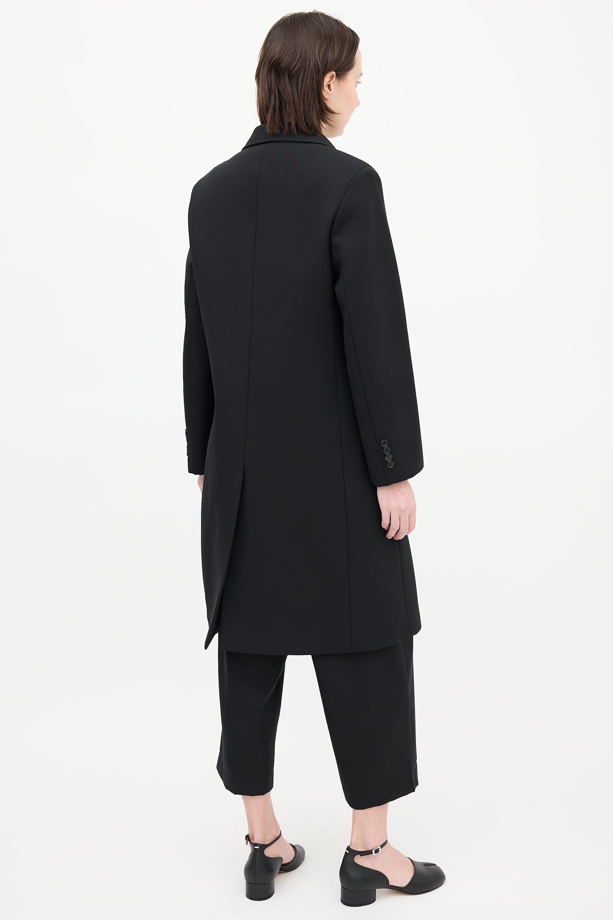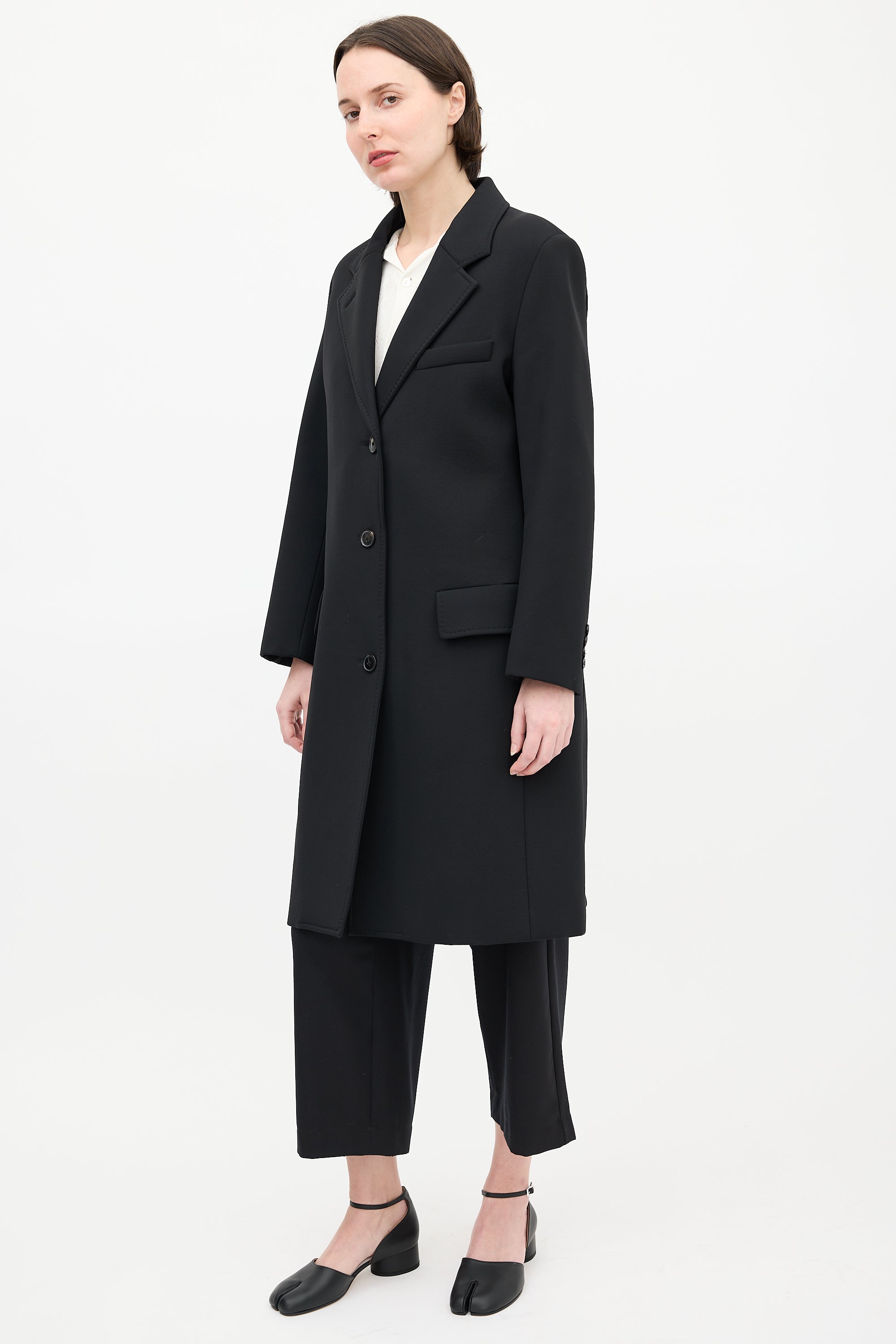 Pre-owned Maison Margiela black neoprene coat featuring a notched lapel, buttoned front, three front pockets, one interior pocket, back vent, and buttoned cuffs. Lined.