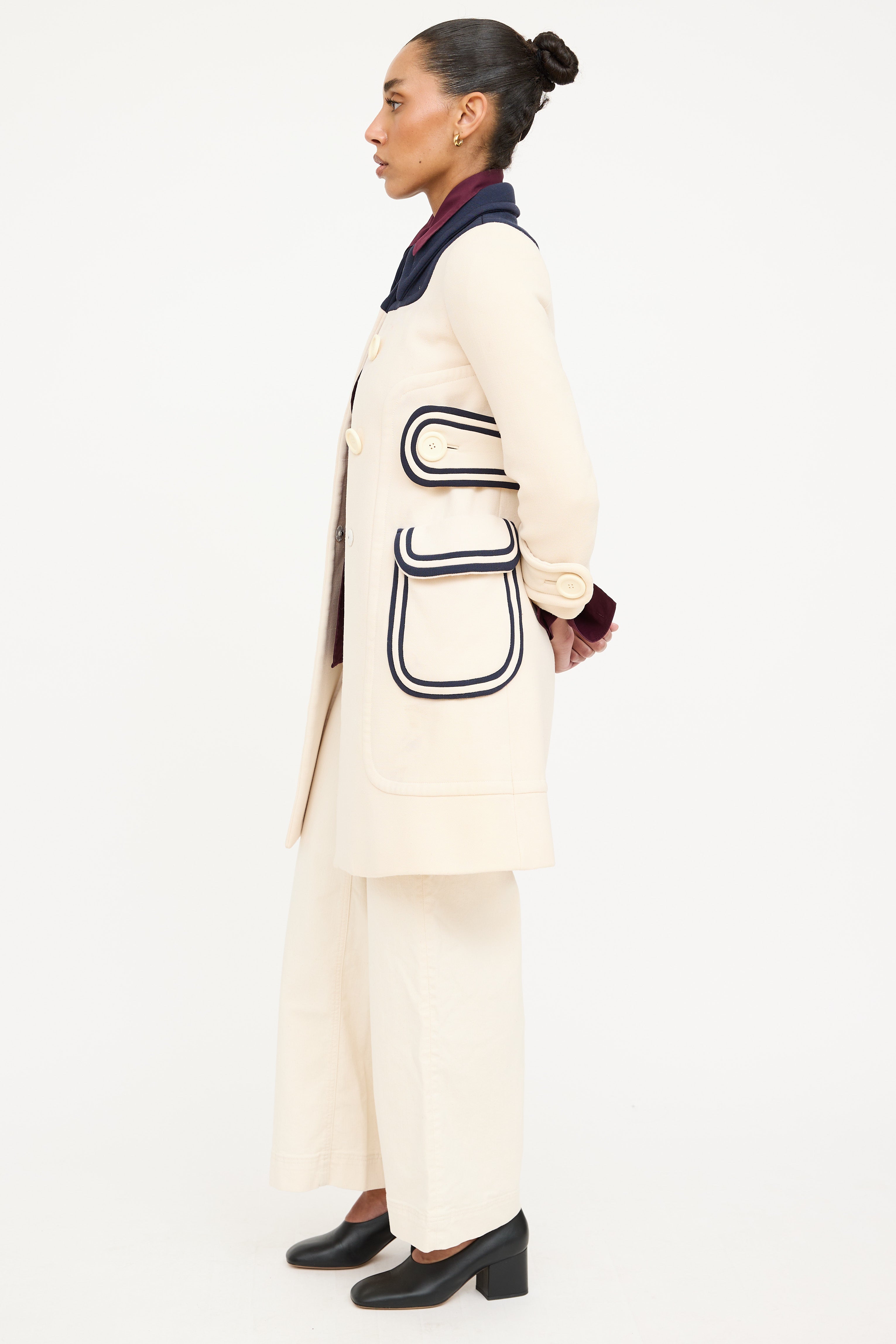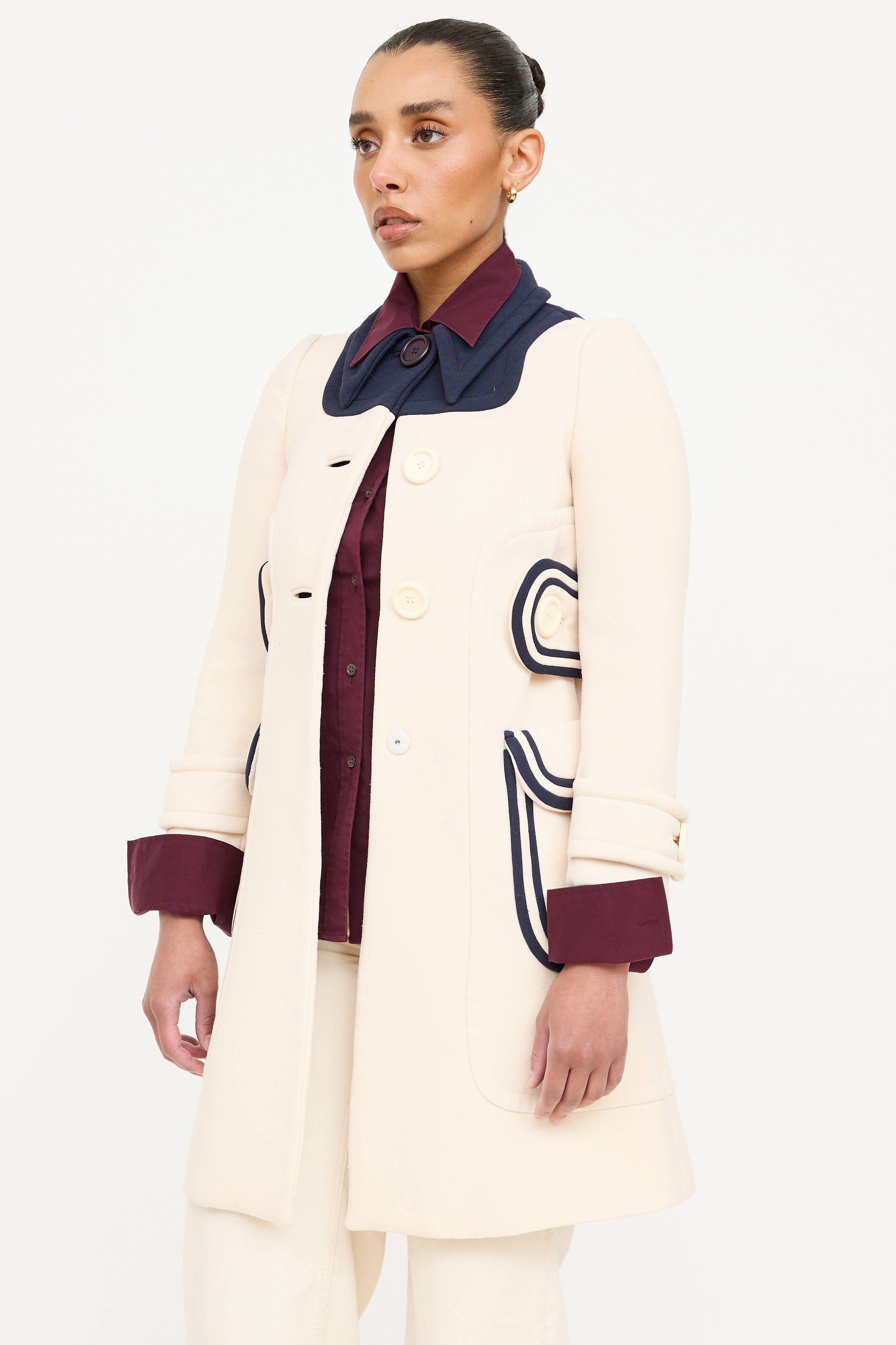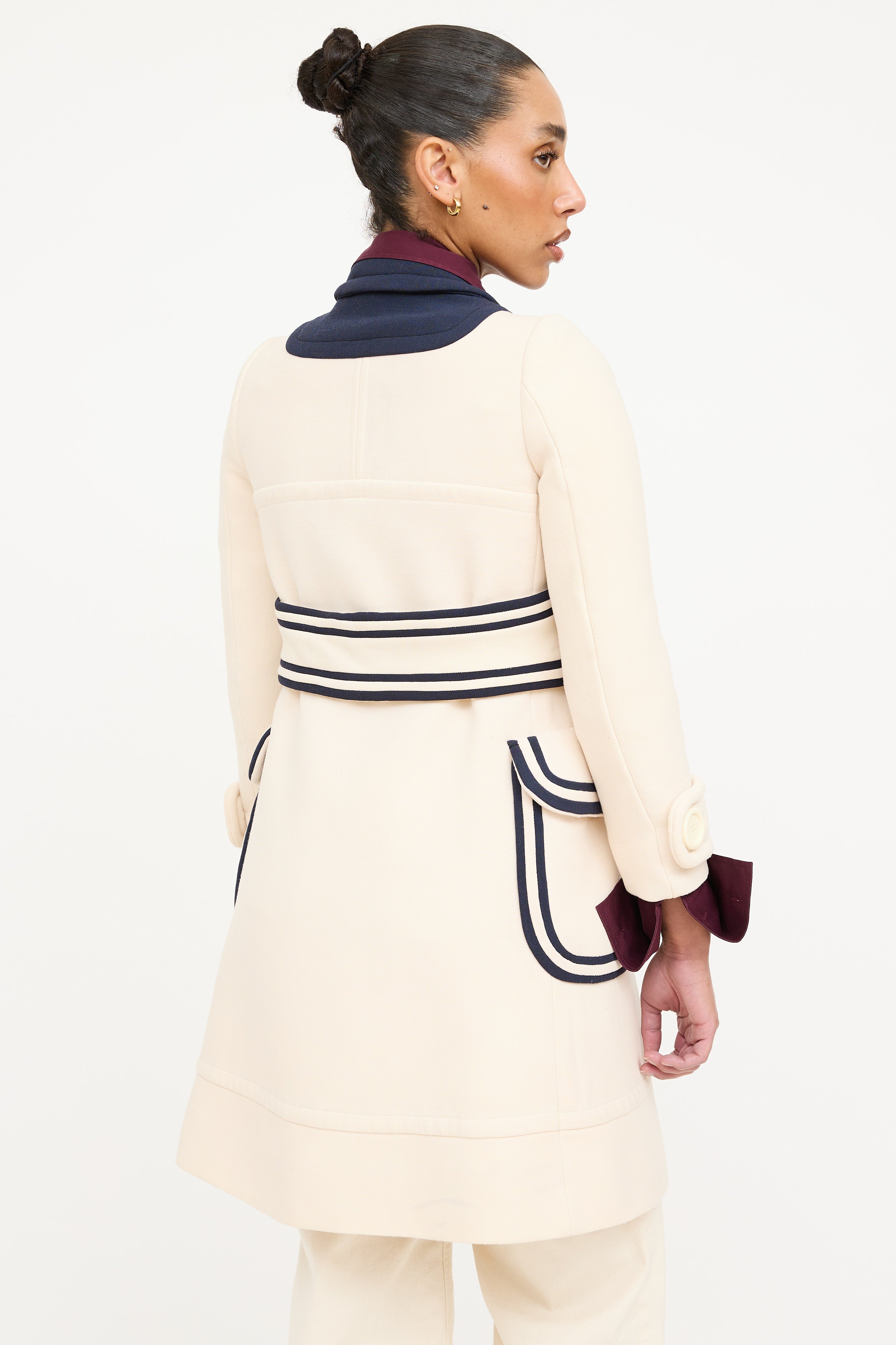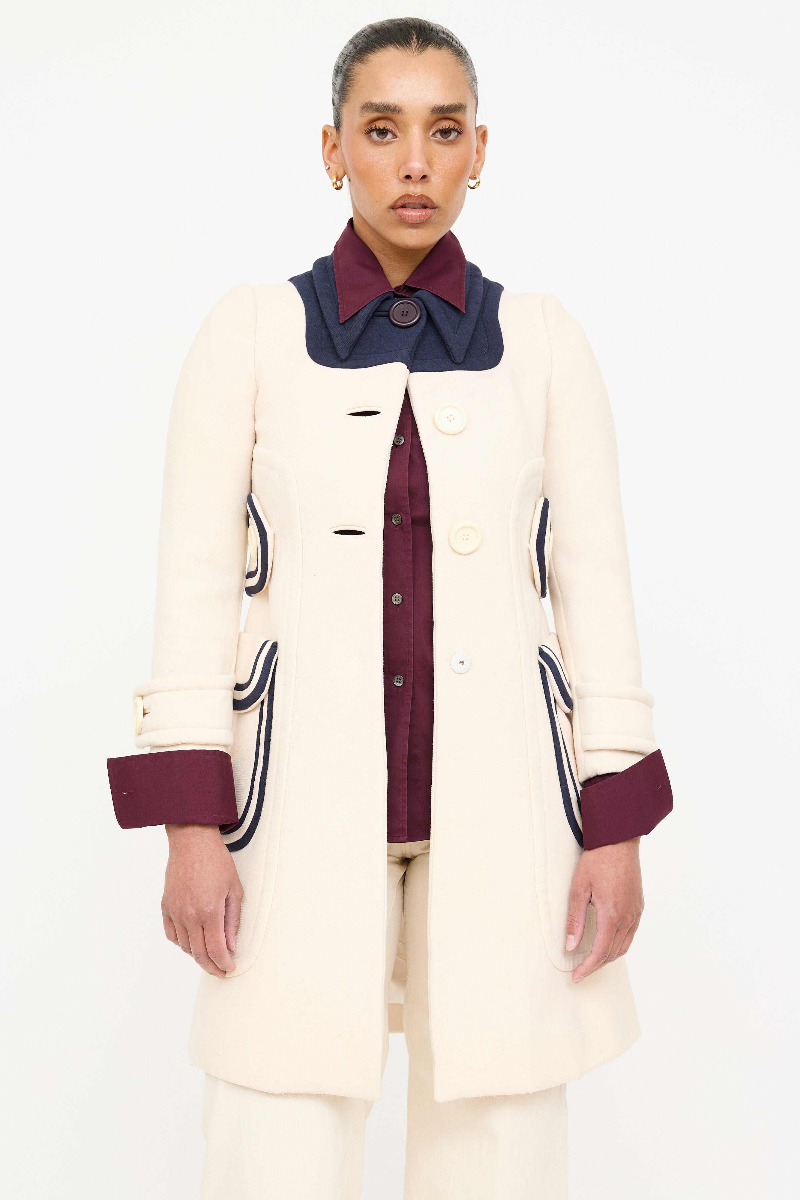 Pre-owned Miu Miu 2013 cream wool coat featuring a navy pointed collar, long sleeves with buttoned cuffs, two flap pockets at hip, buttoned belt at back, piped trim, and button up closure. Lined.