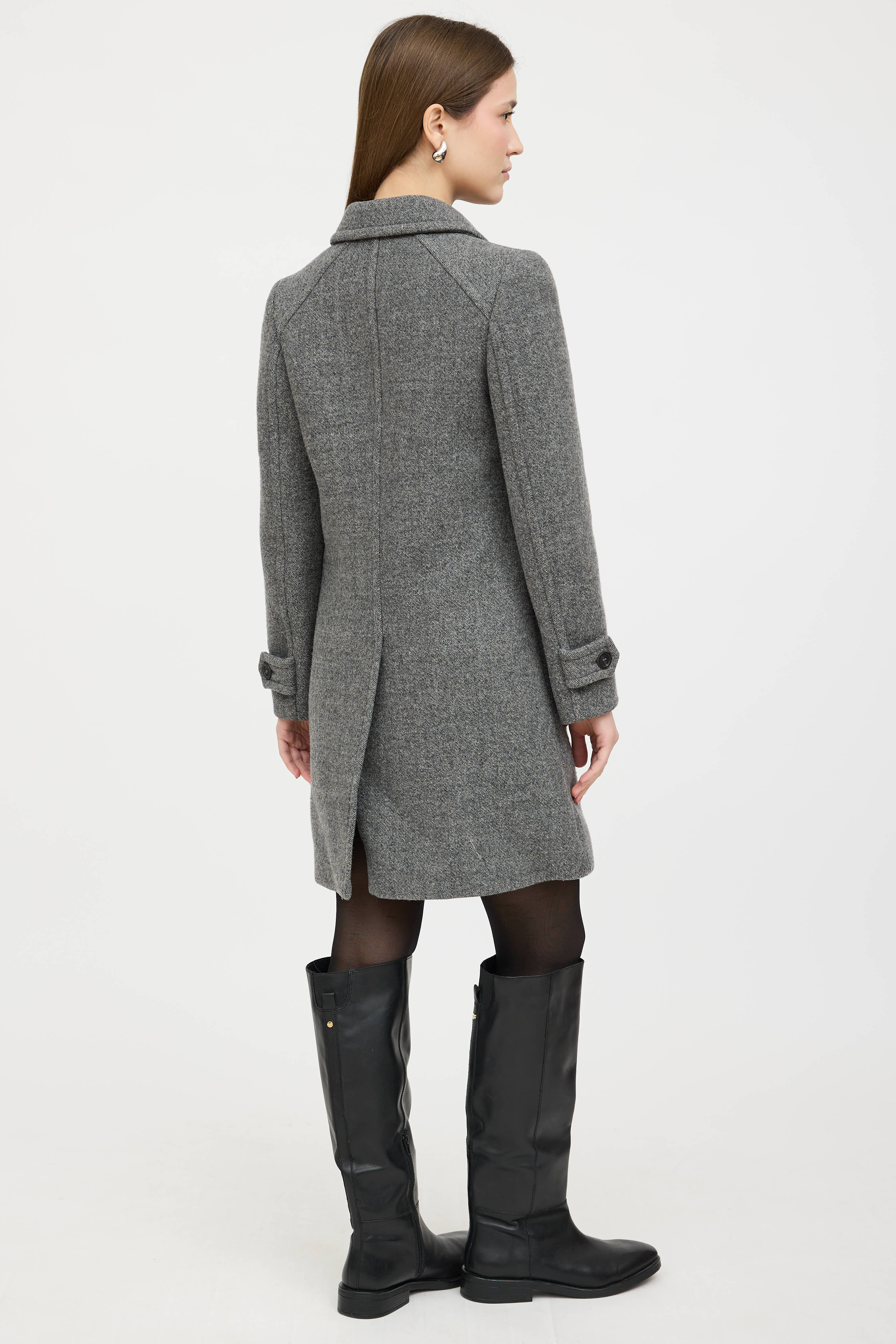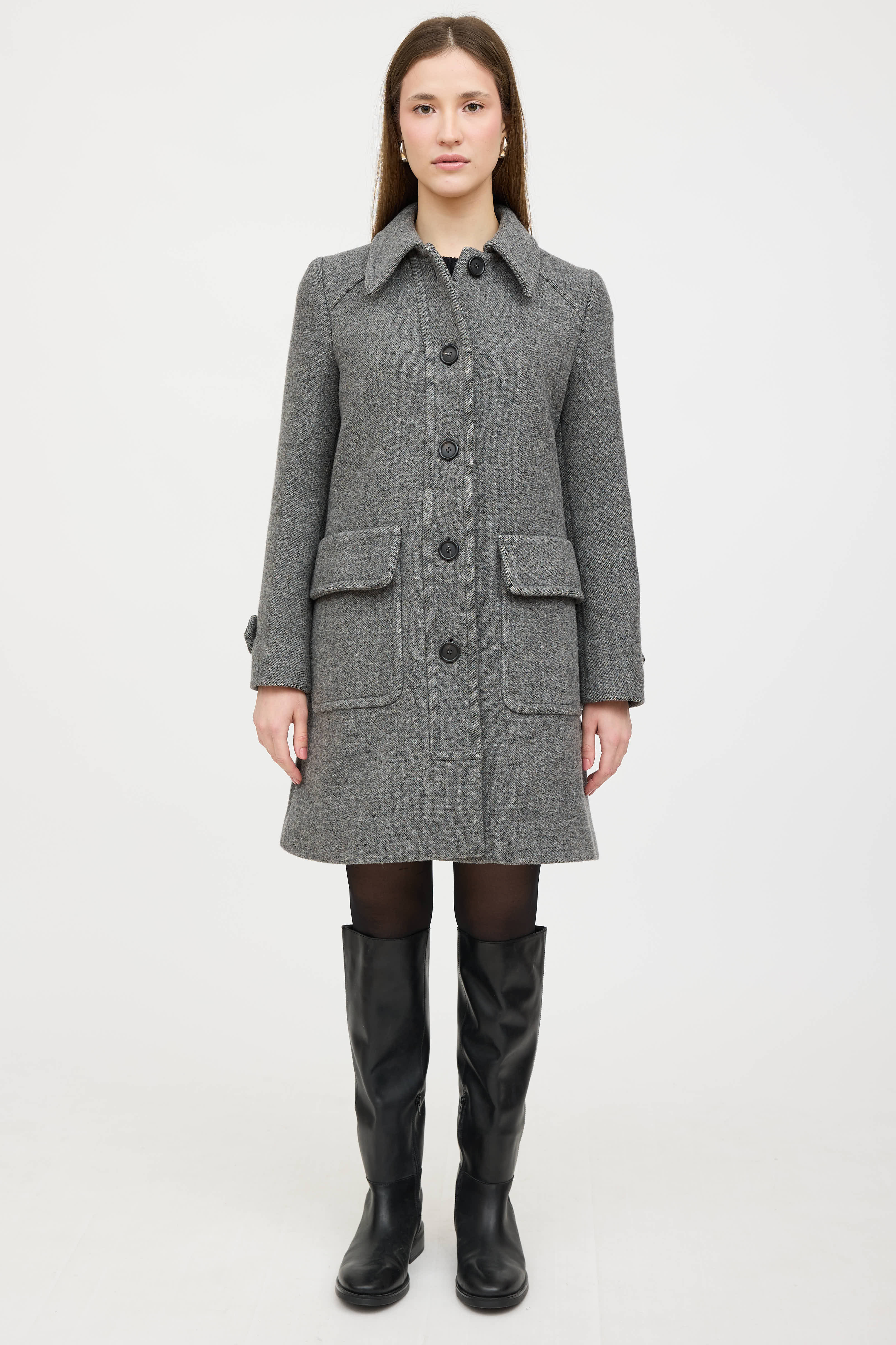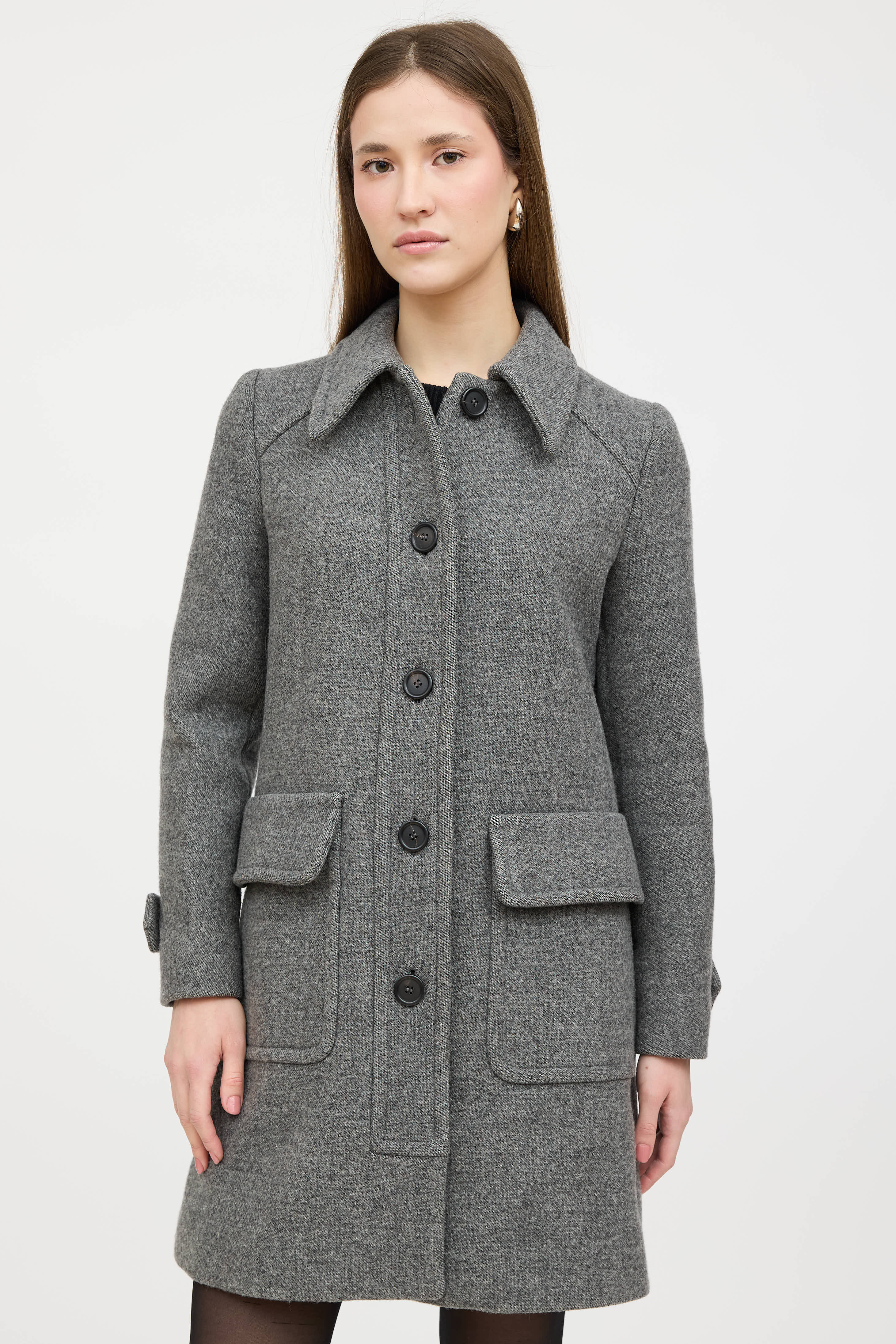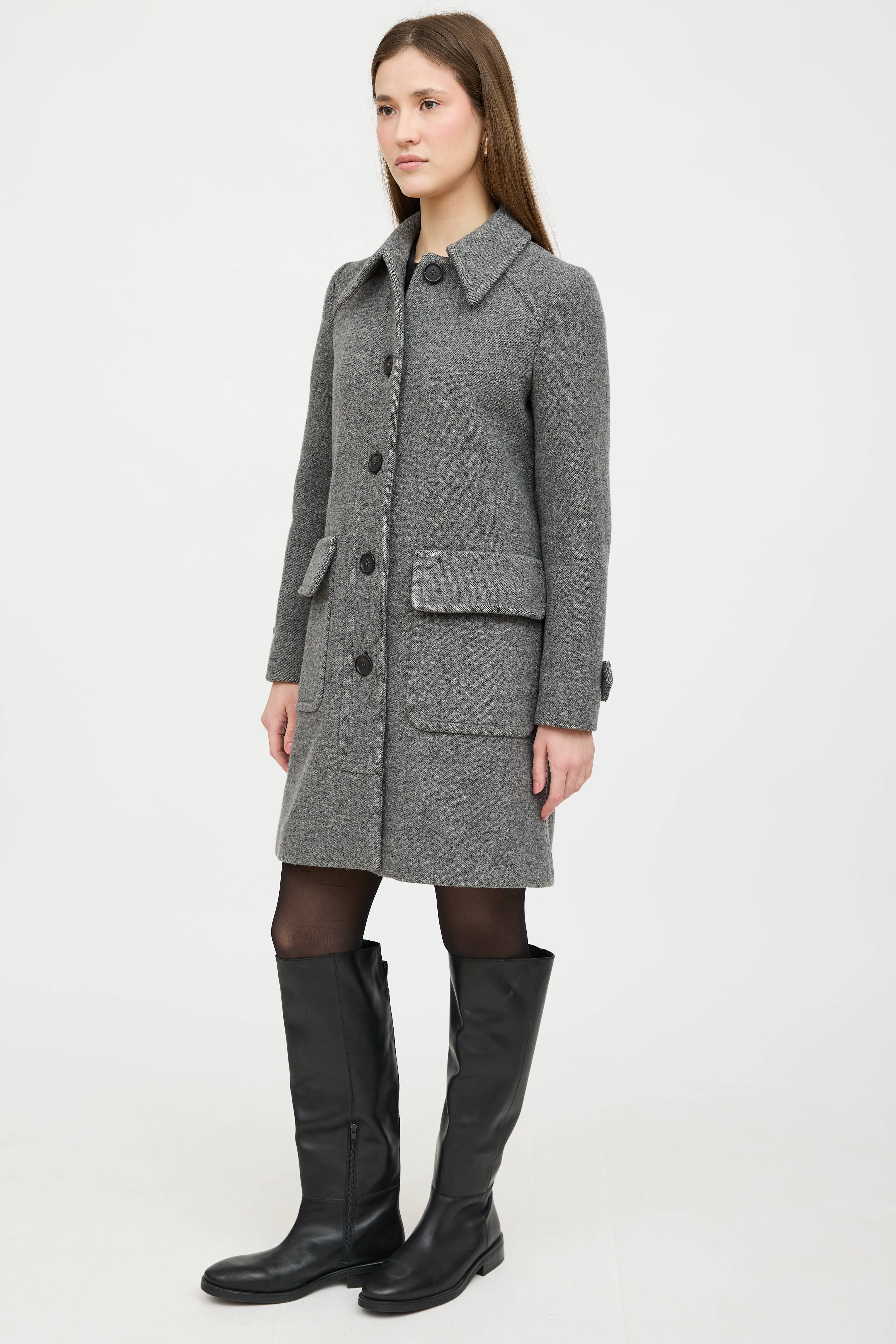 Pre-owned Prada 2014 grey wool coat featuring a pointed collar, long sleeves with buttoned cuffs, two patch pockets at hip, and button up closure. Lined.