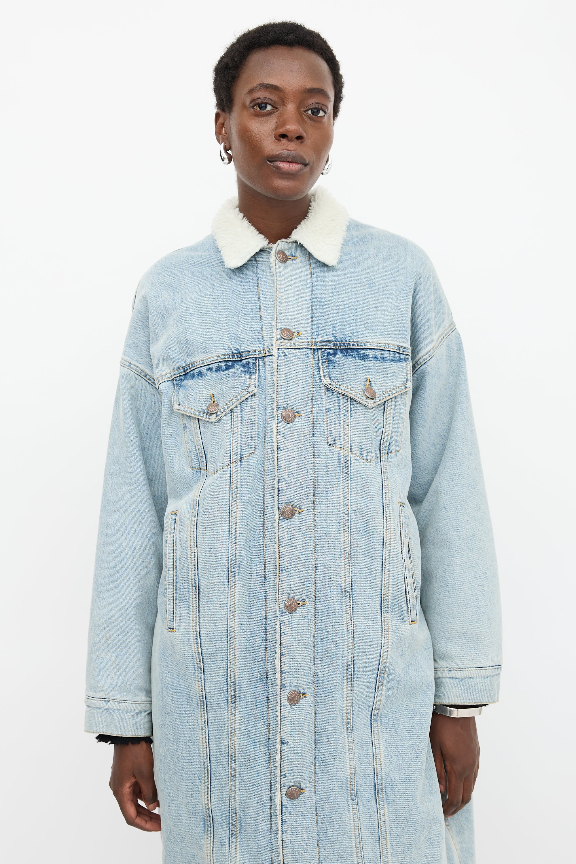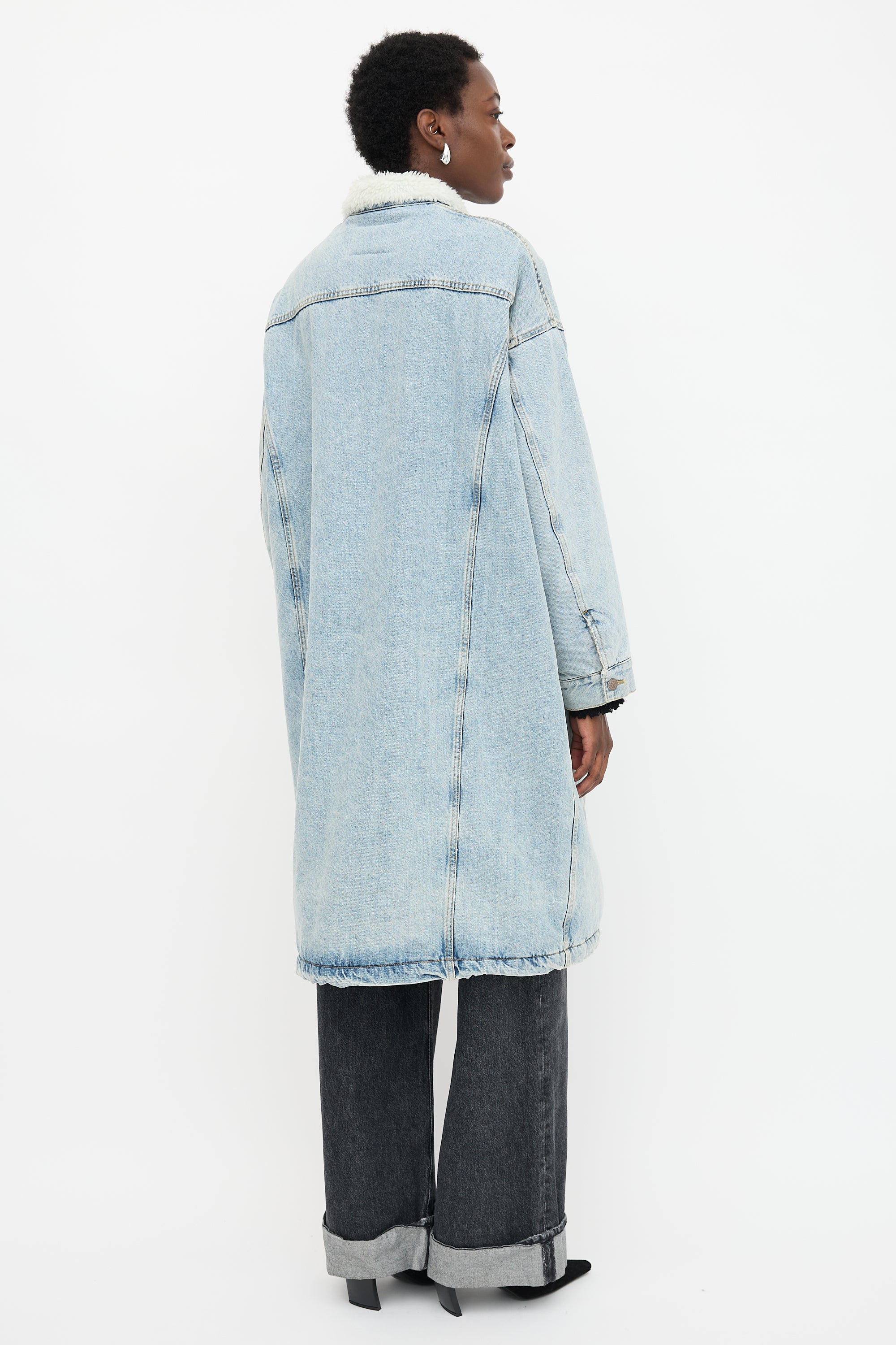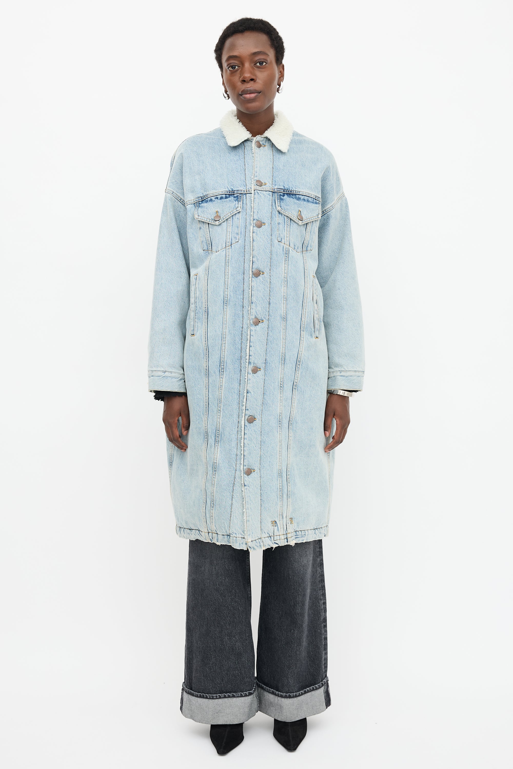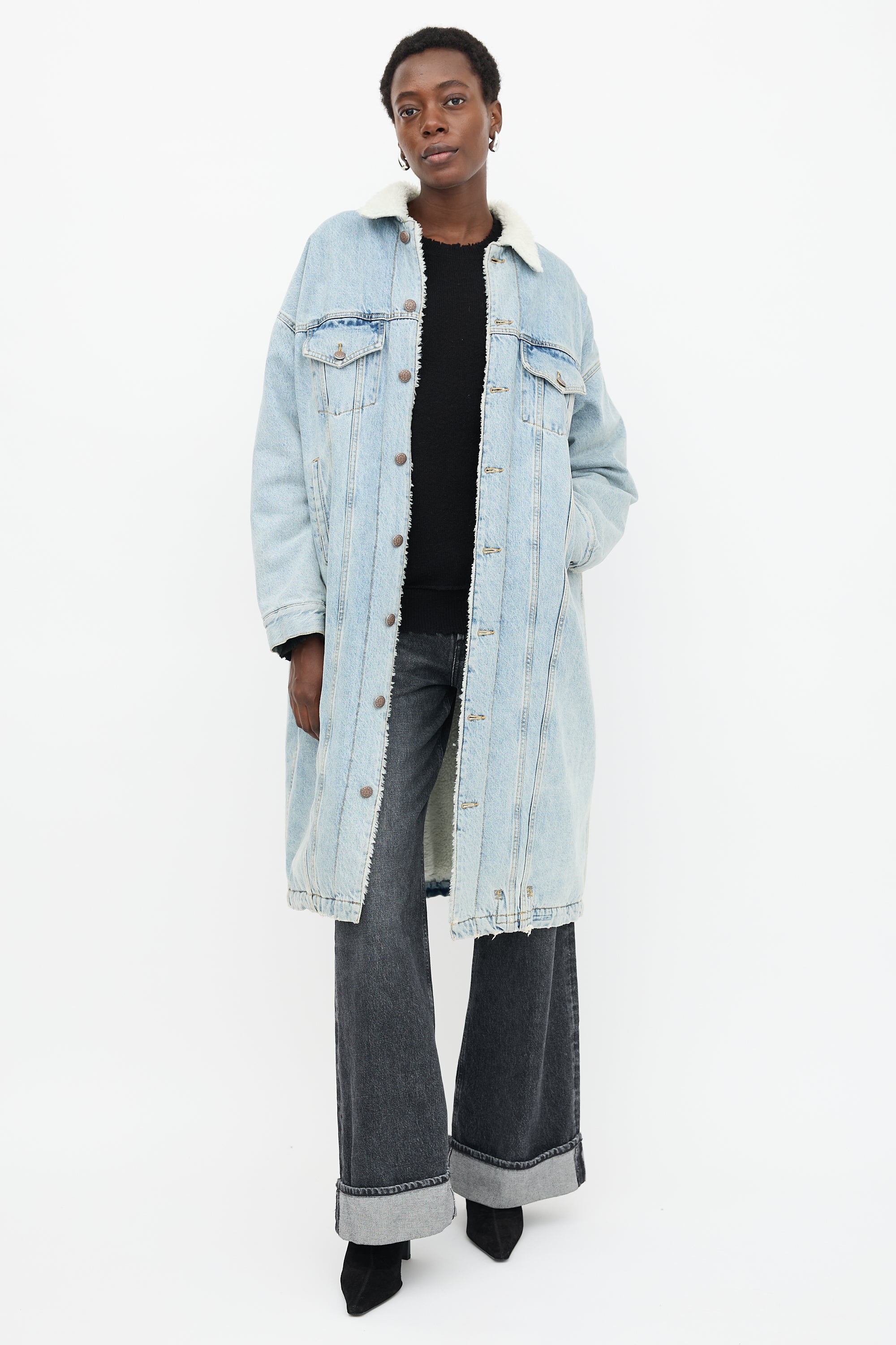 Pre-owned R13 light wash denim Lyle Trucker coat featuring a white faux shearling lining, intentional distressing, oversized fit, button front, and welt pockets.