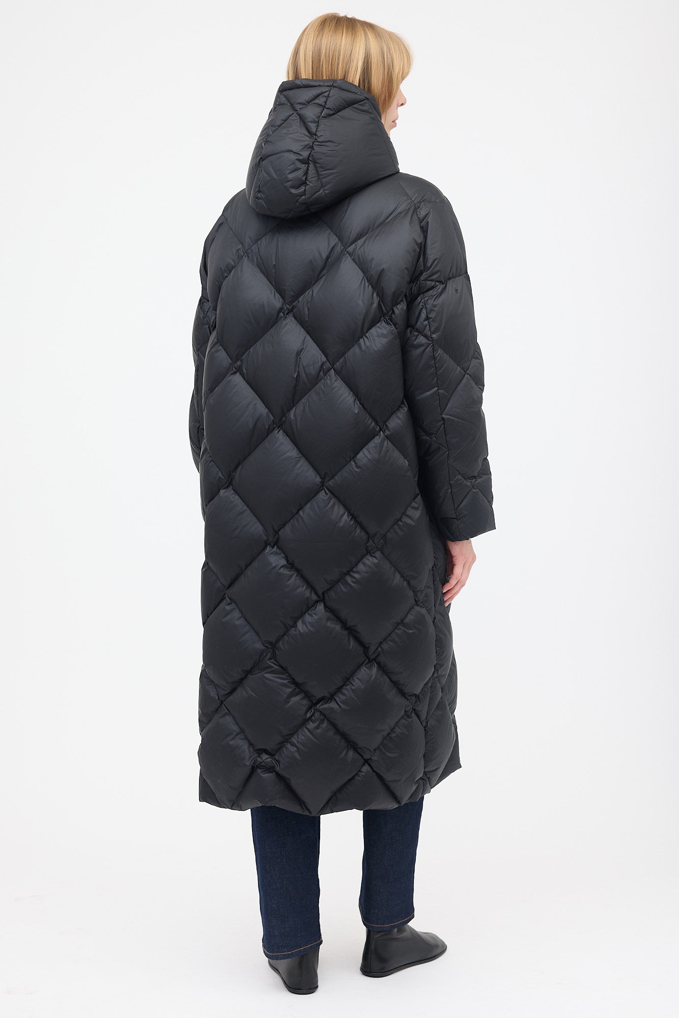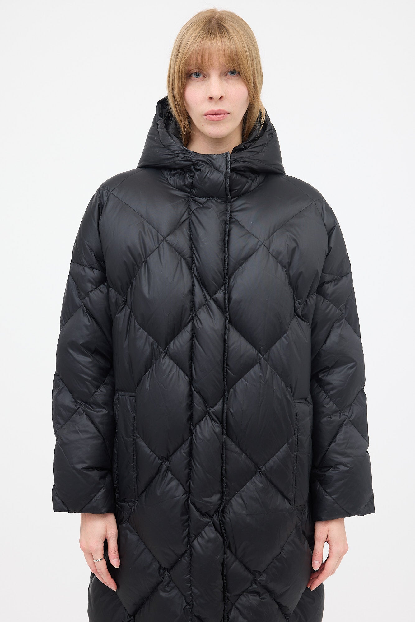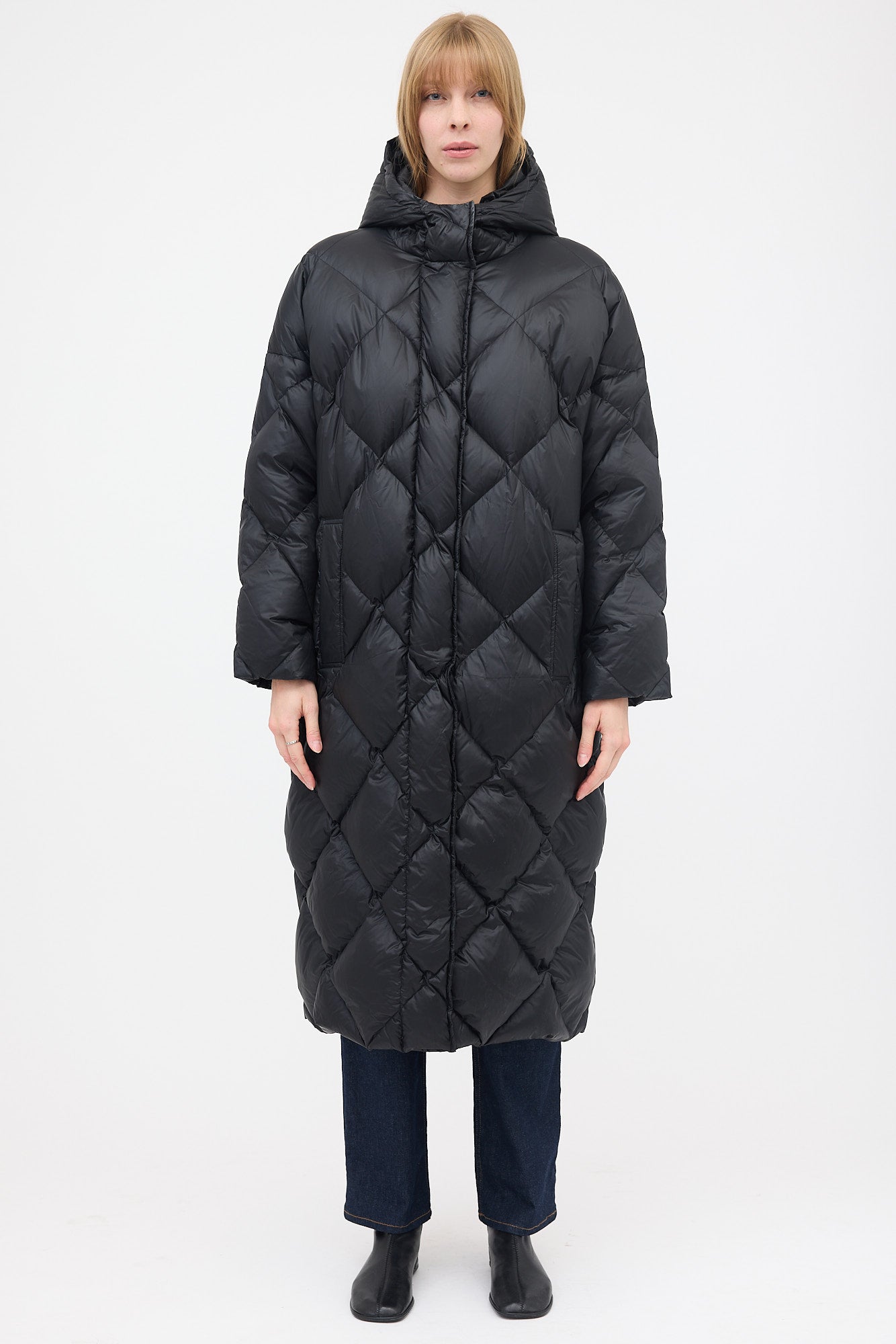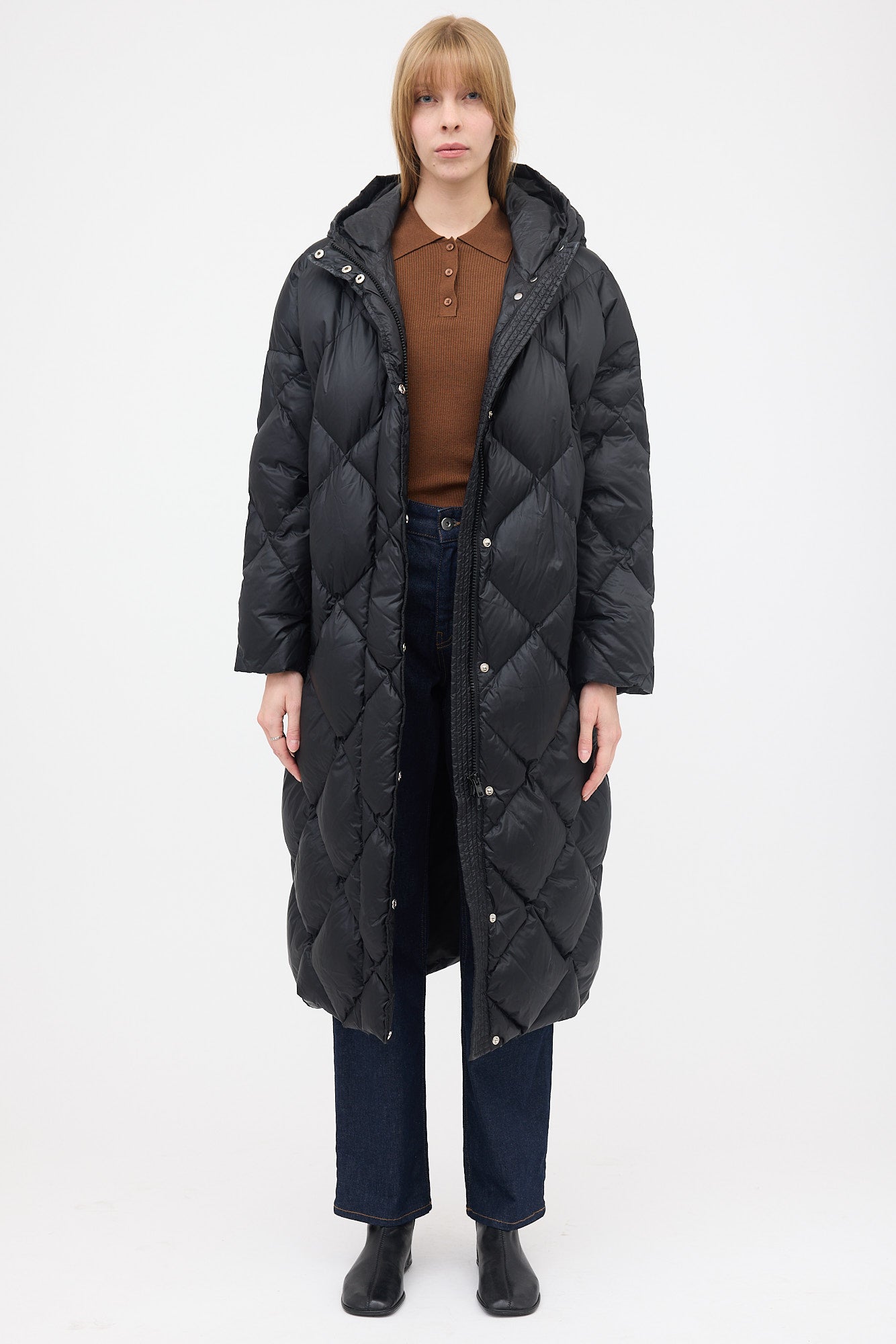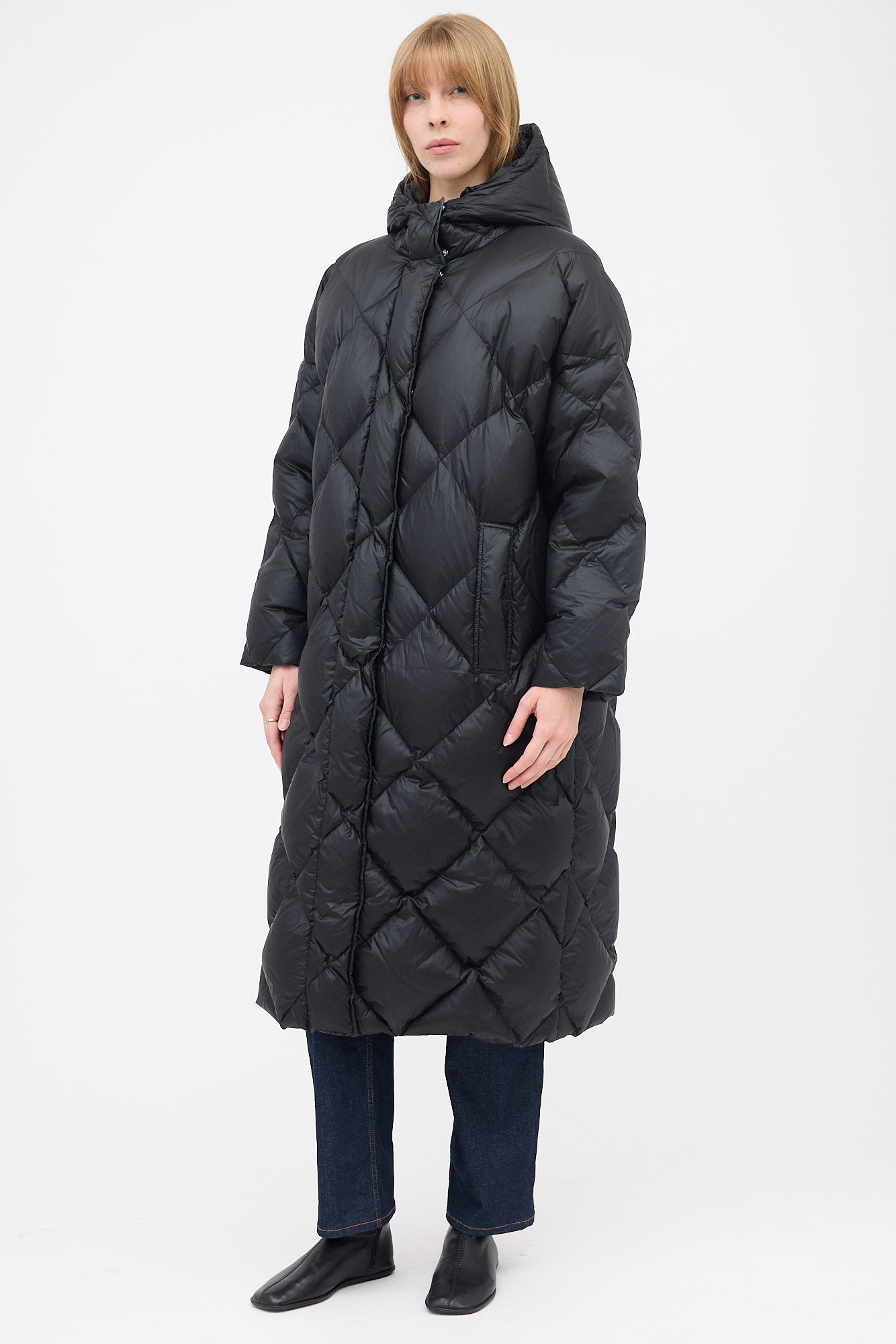 Pre-owned Stand Studio black down-filled Farrah coat featuring a funnel neck with attached hood, two way zip front with snap button placket, quilted construction, and two welt pockets at front. Lined.