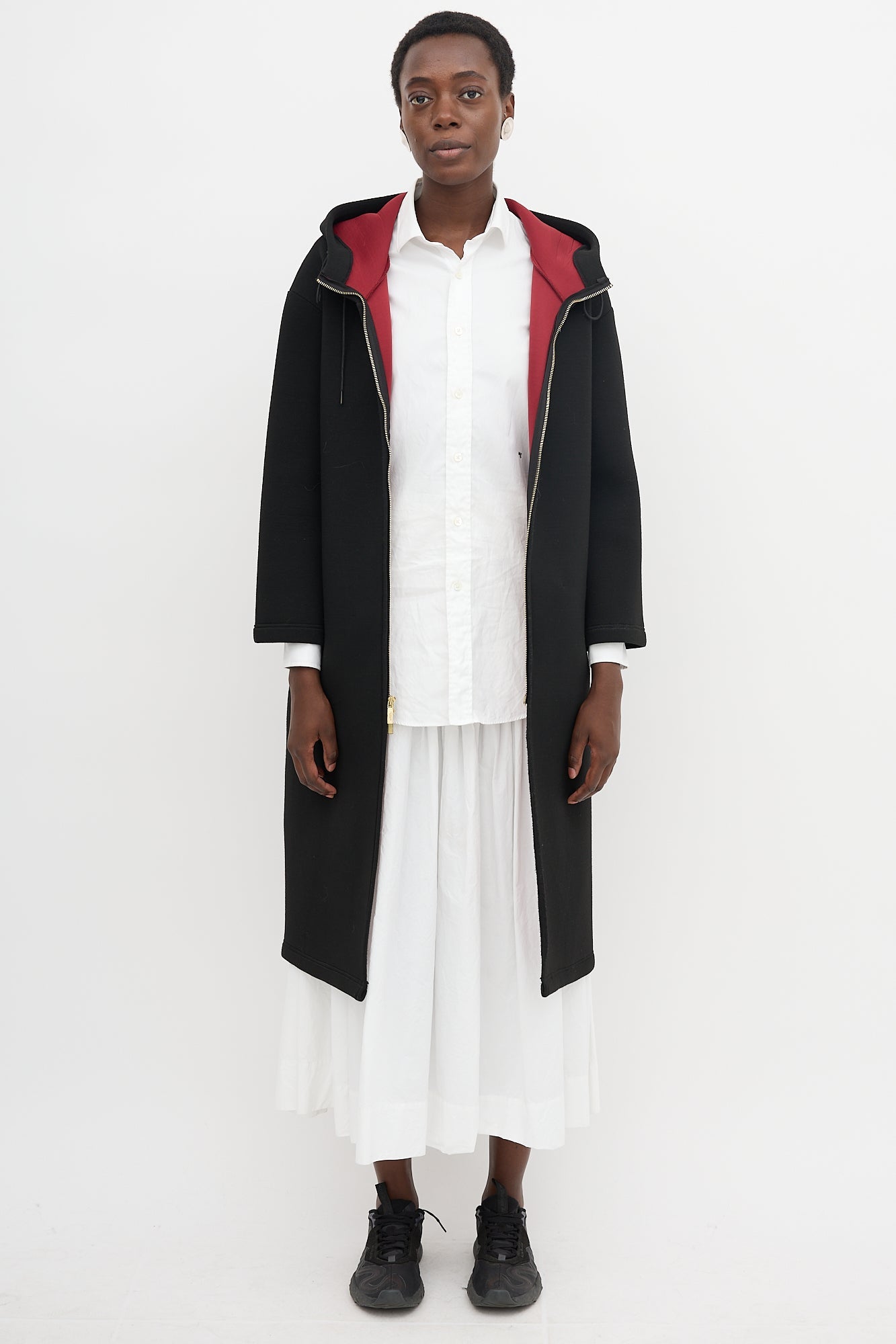 Pre-owned Thom Browne black neoprene coat featuring a drawstring hood, front two-way zip, two welt pockets, and burgundy reverse.
