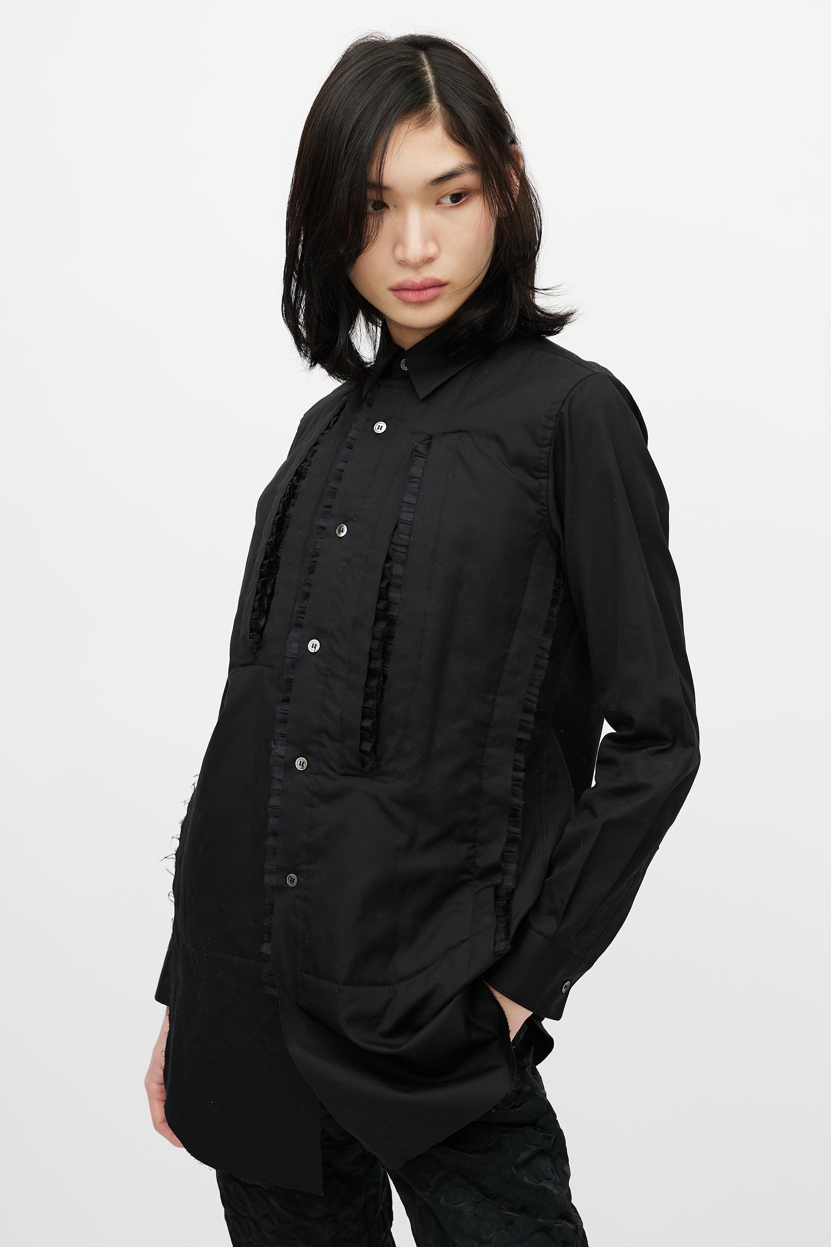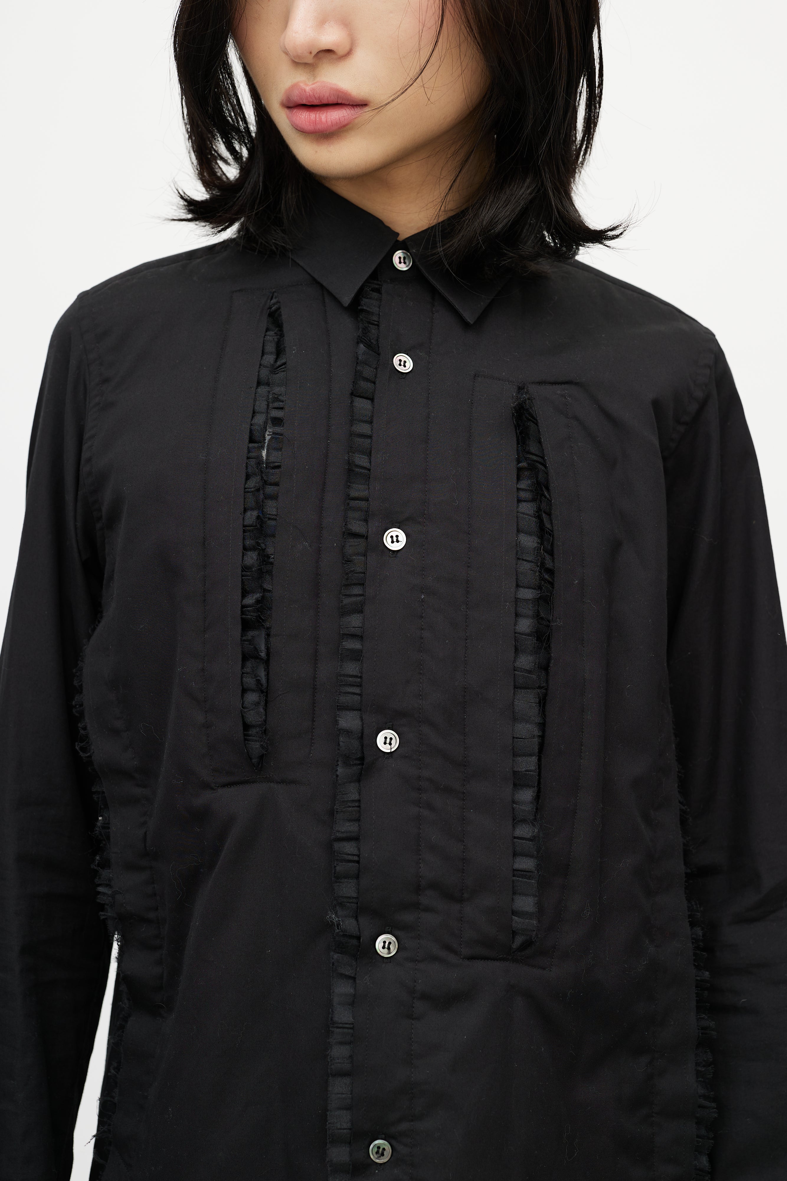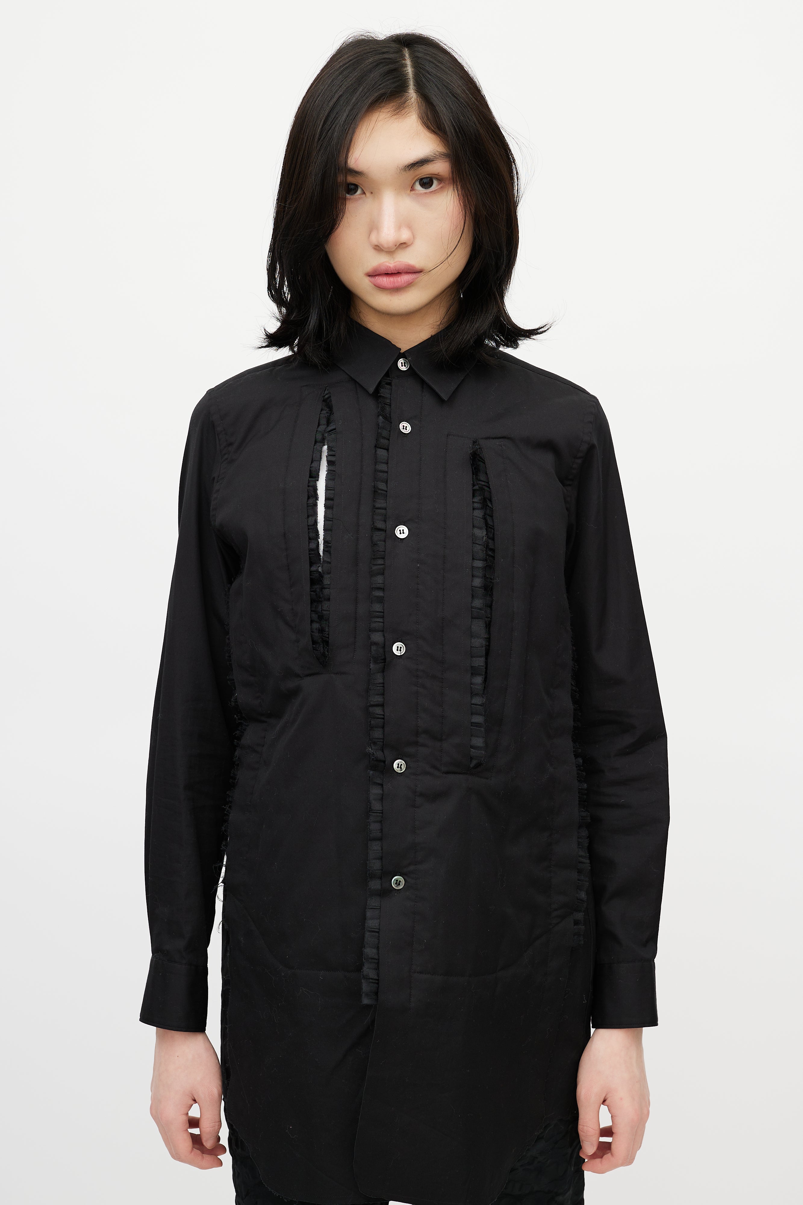 Pre-owned Comme des Garçons black shirt featuring pointed collar, button up front, asymmetrical cut out at front chest, slight padding at front, and tonal tulle ruffle trim.