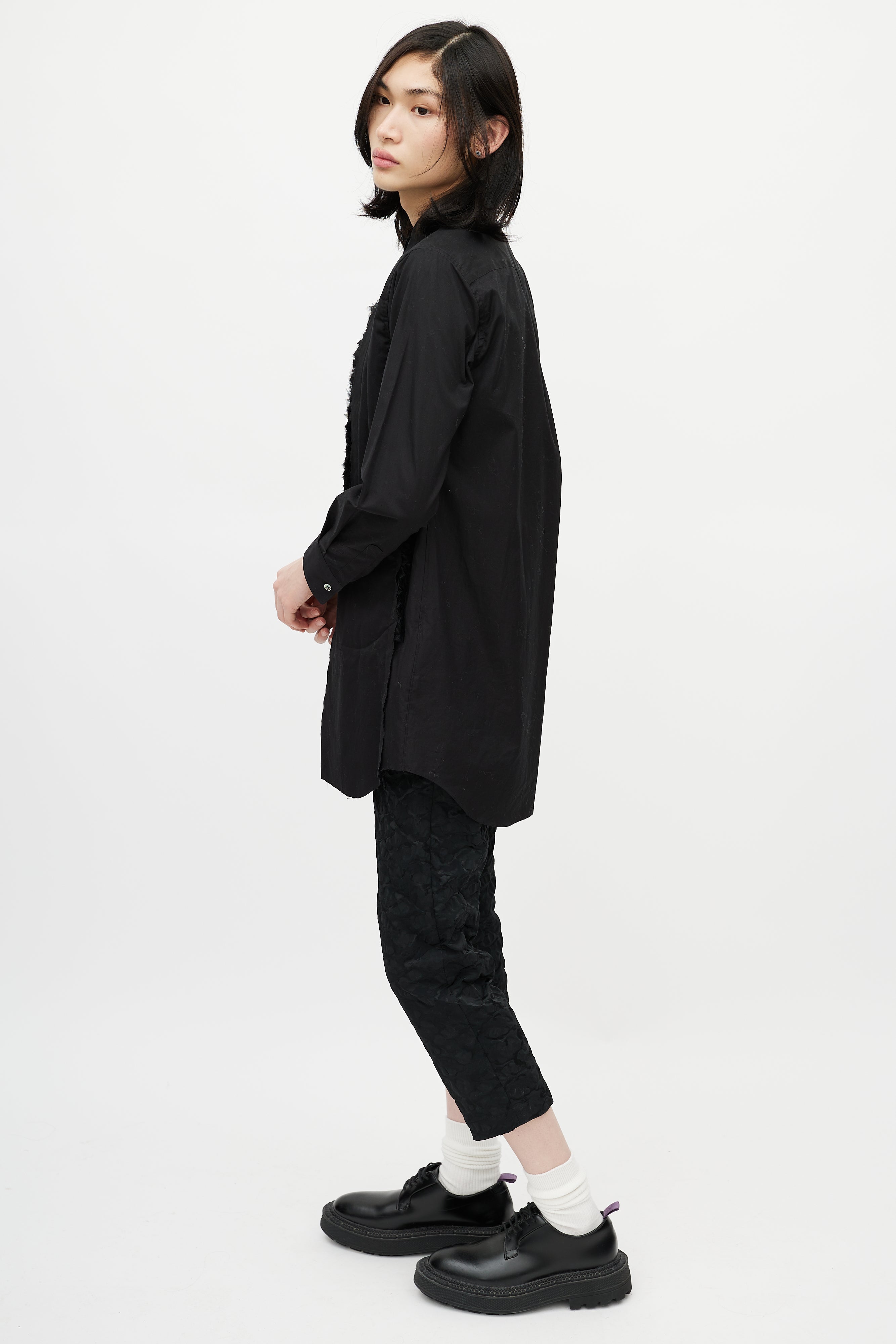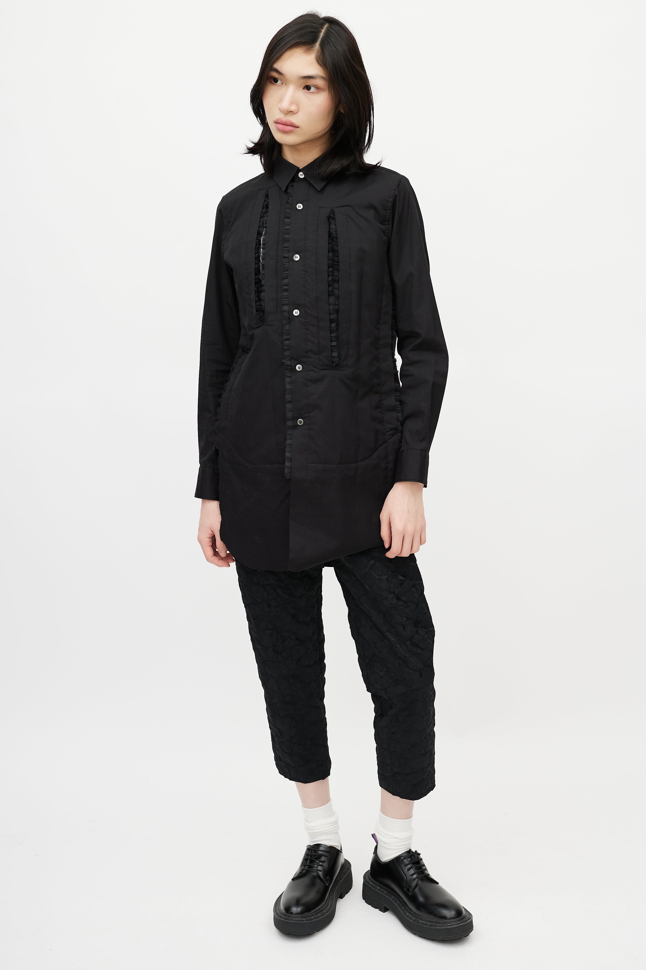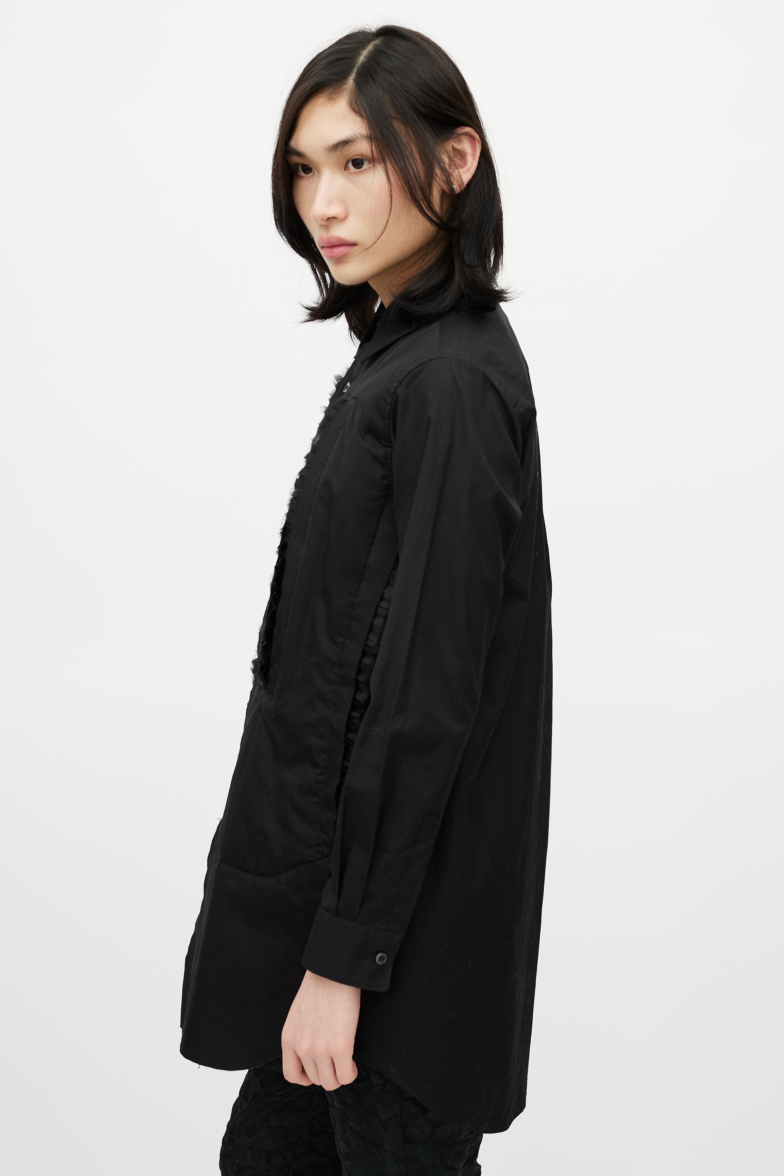 Pre-owned Comme des Garçons black shirt featuring pointed collar, button up front, asymmetrical cut out at front chest, slight padding at front, and tonal tulle ruffle trim.