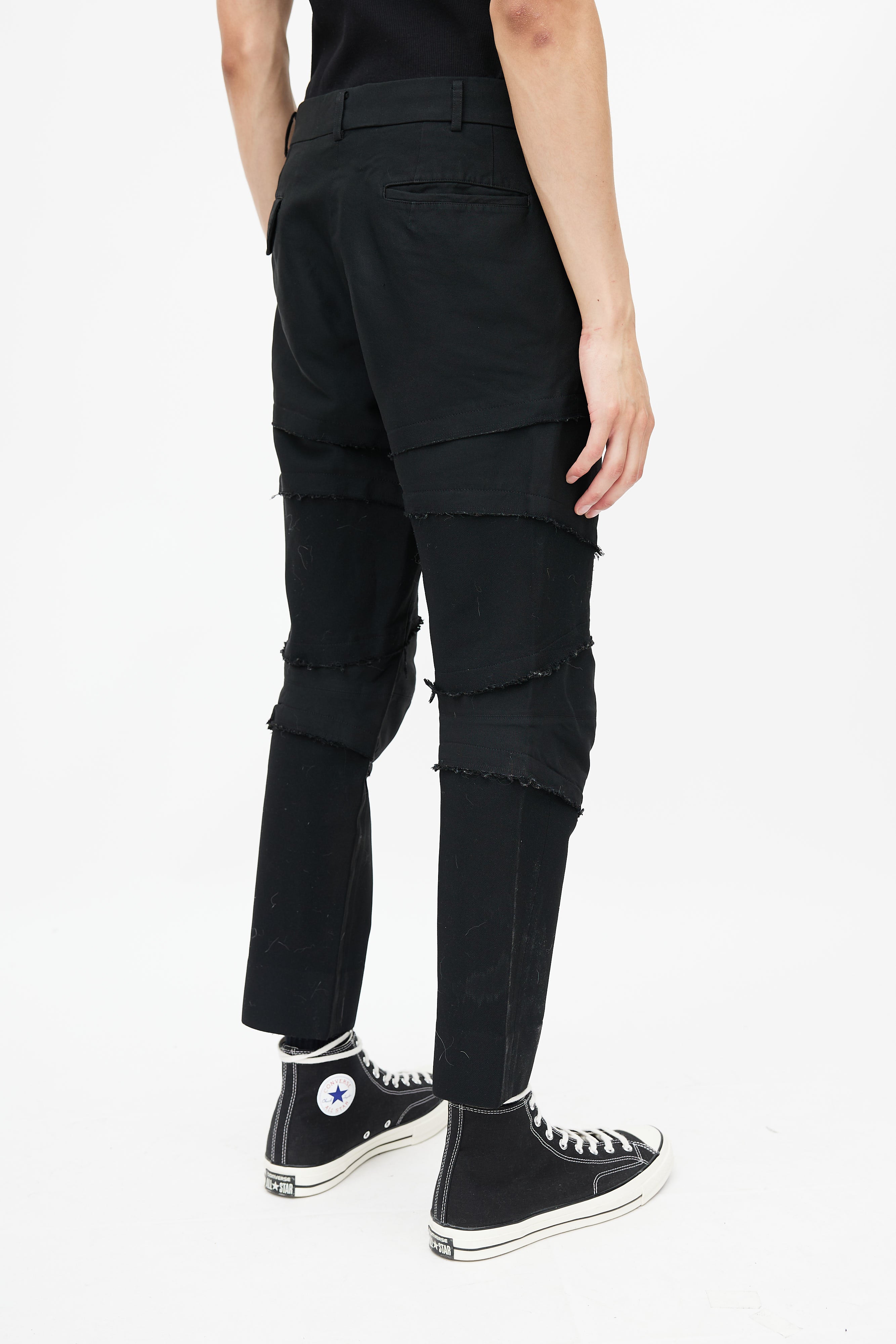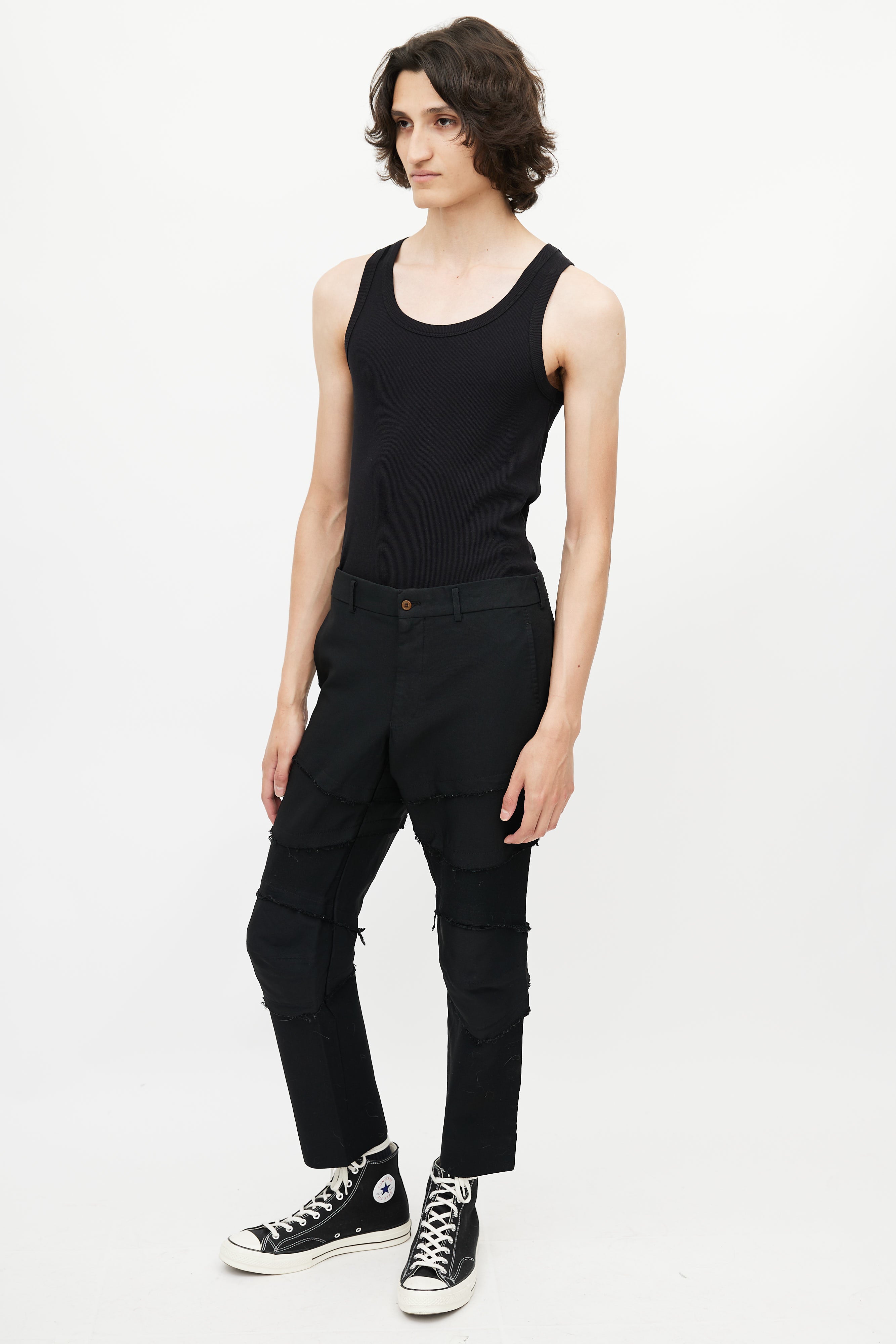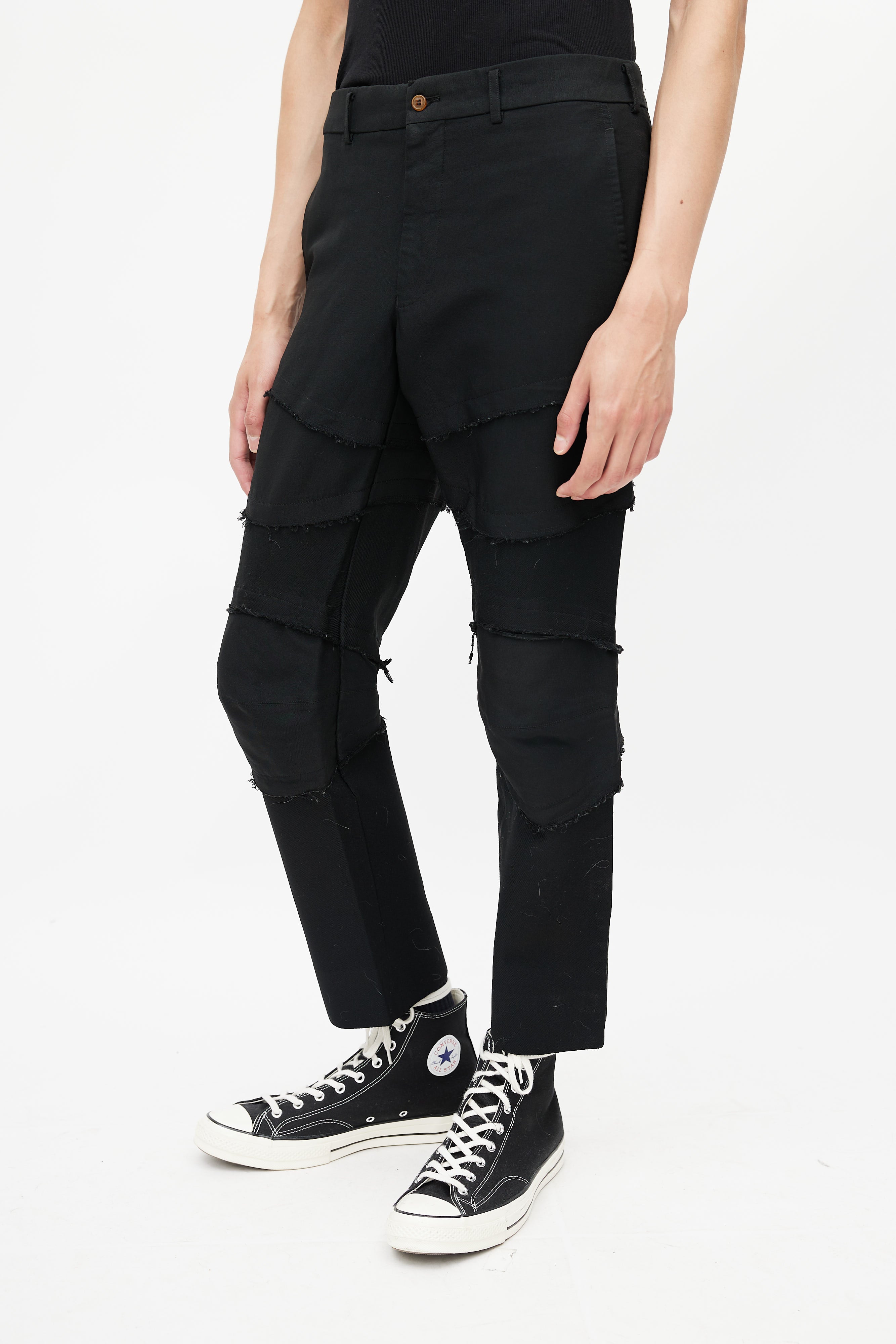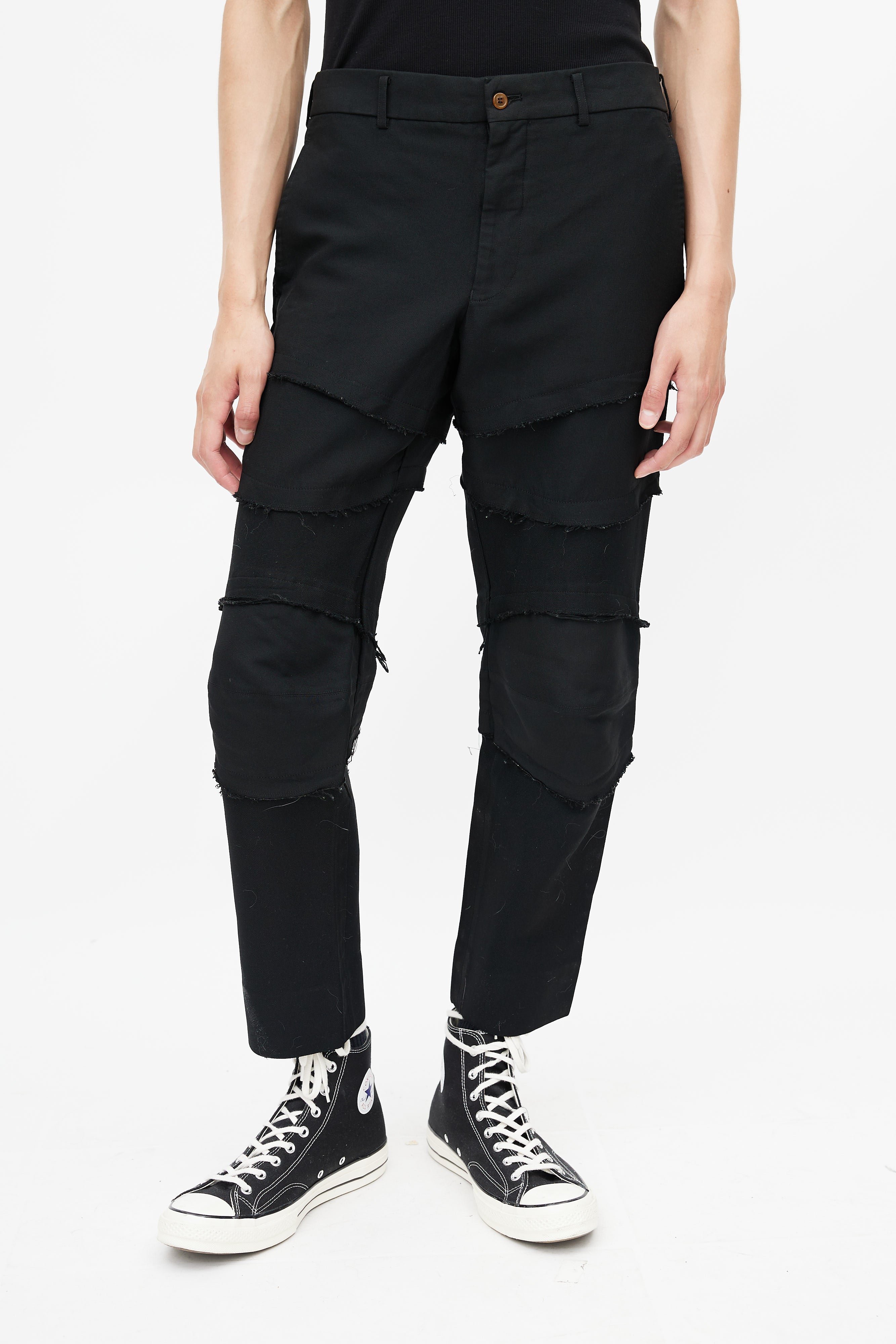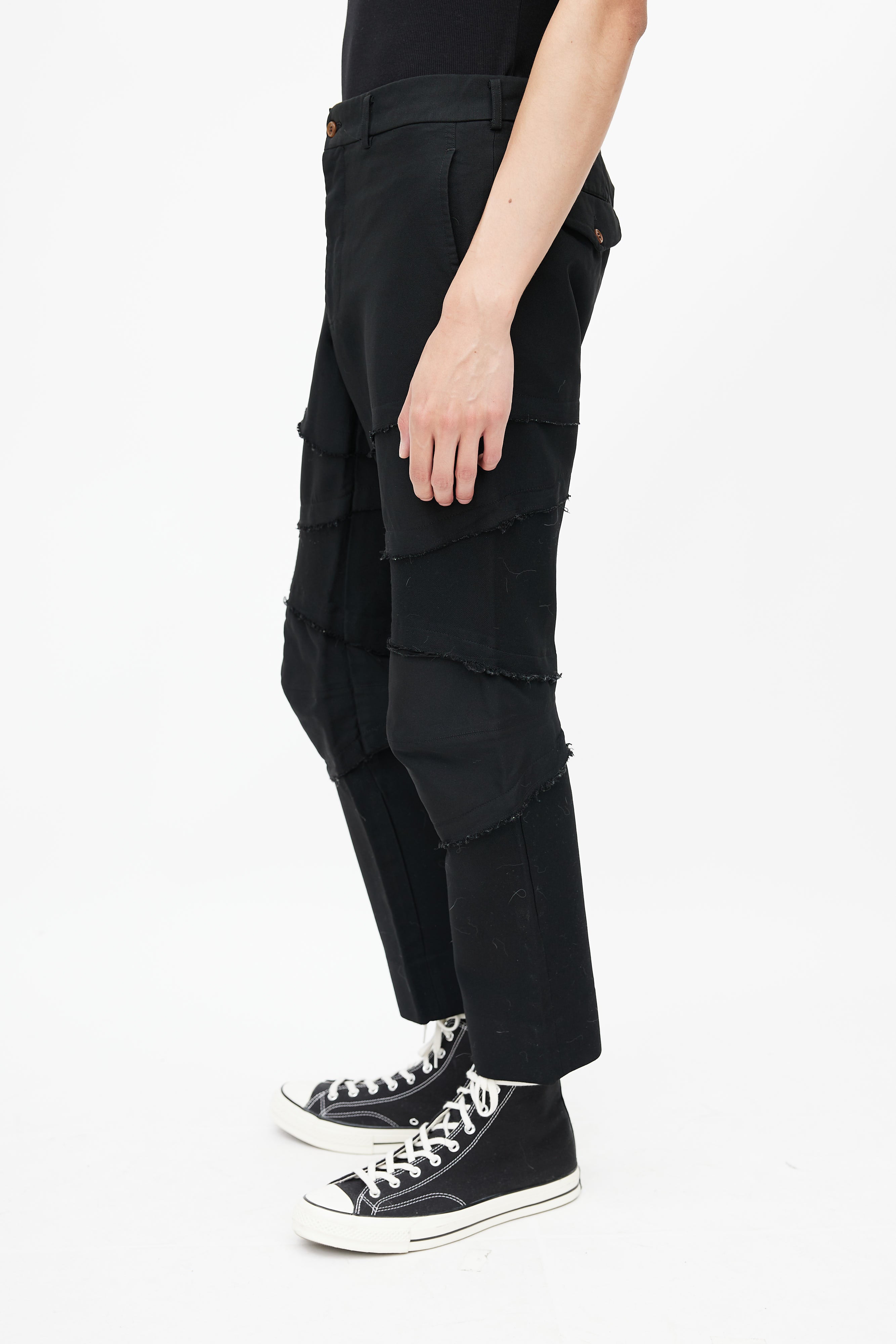Pre-owned Comme des Garçons black trousers featuring panelled distressed seams throughout, two slash pockets at hip, two welted pockets at back, and zip fly with button closure.