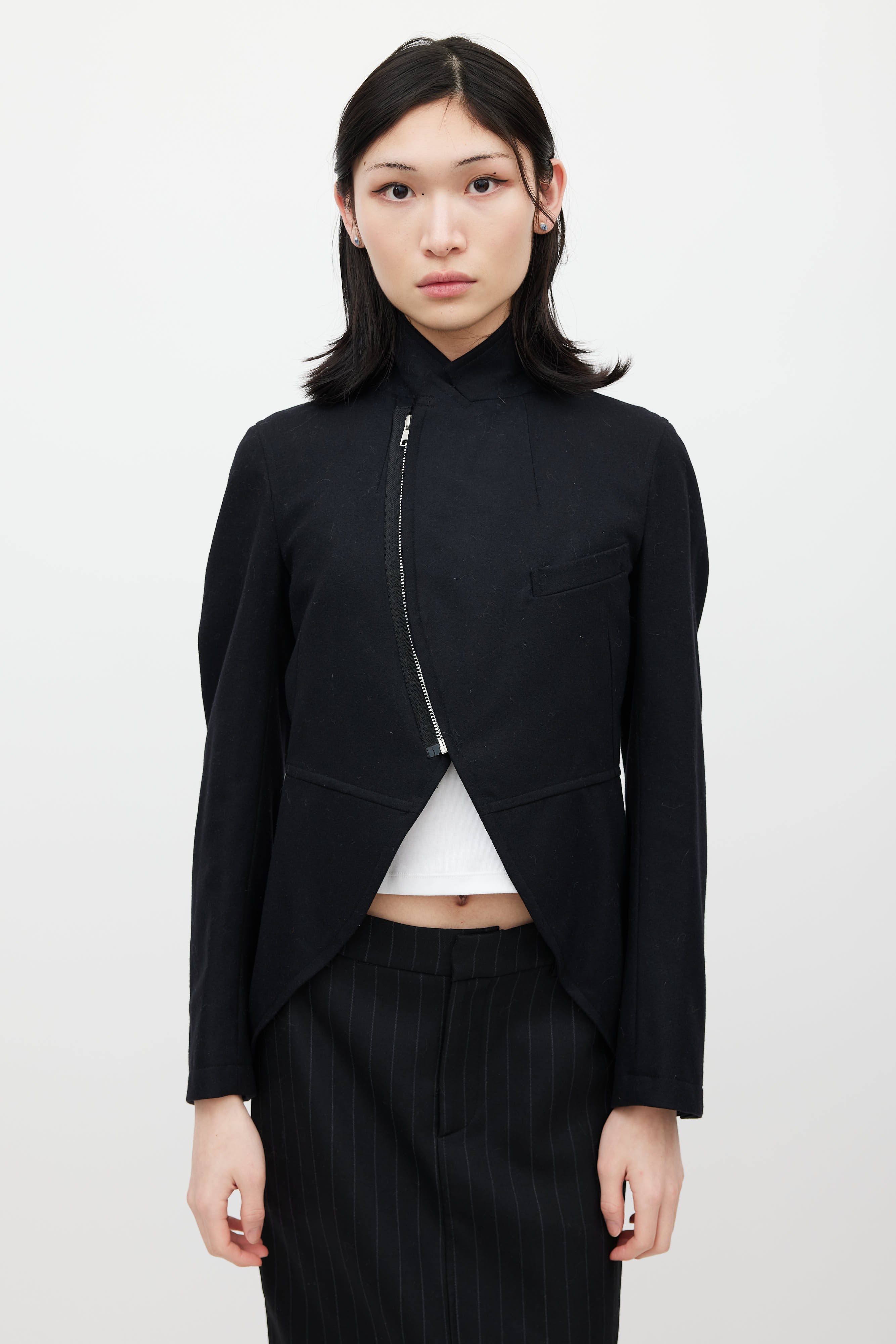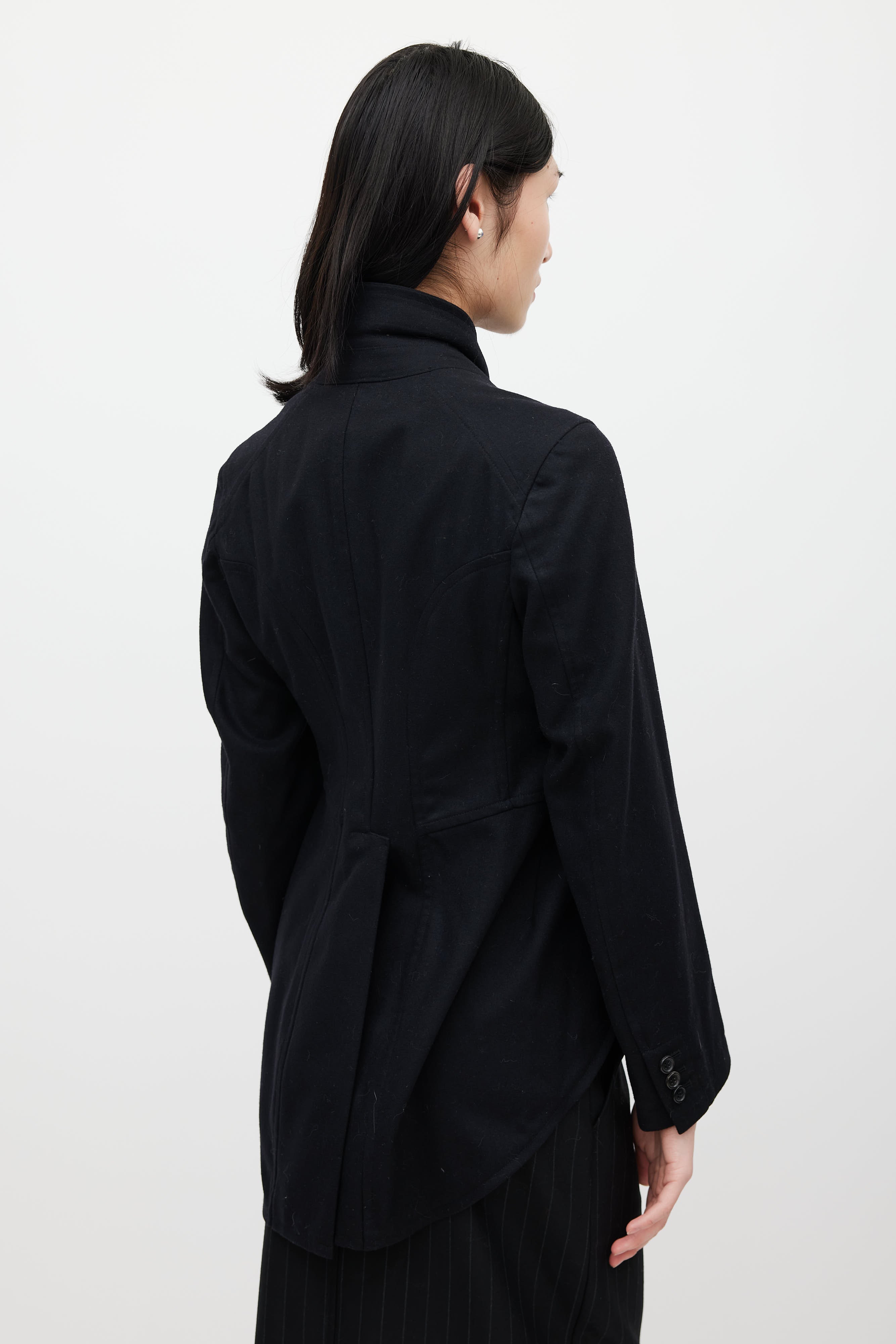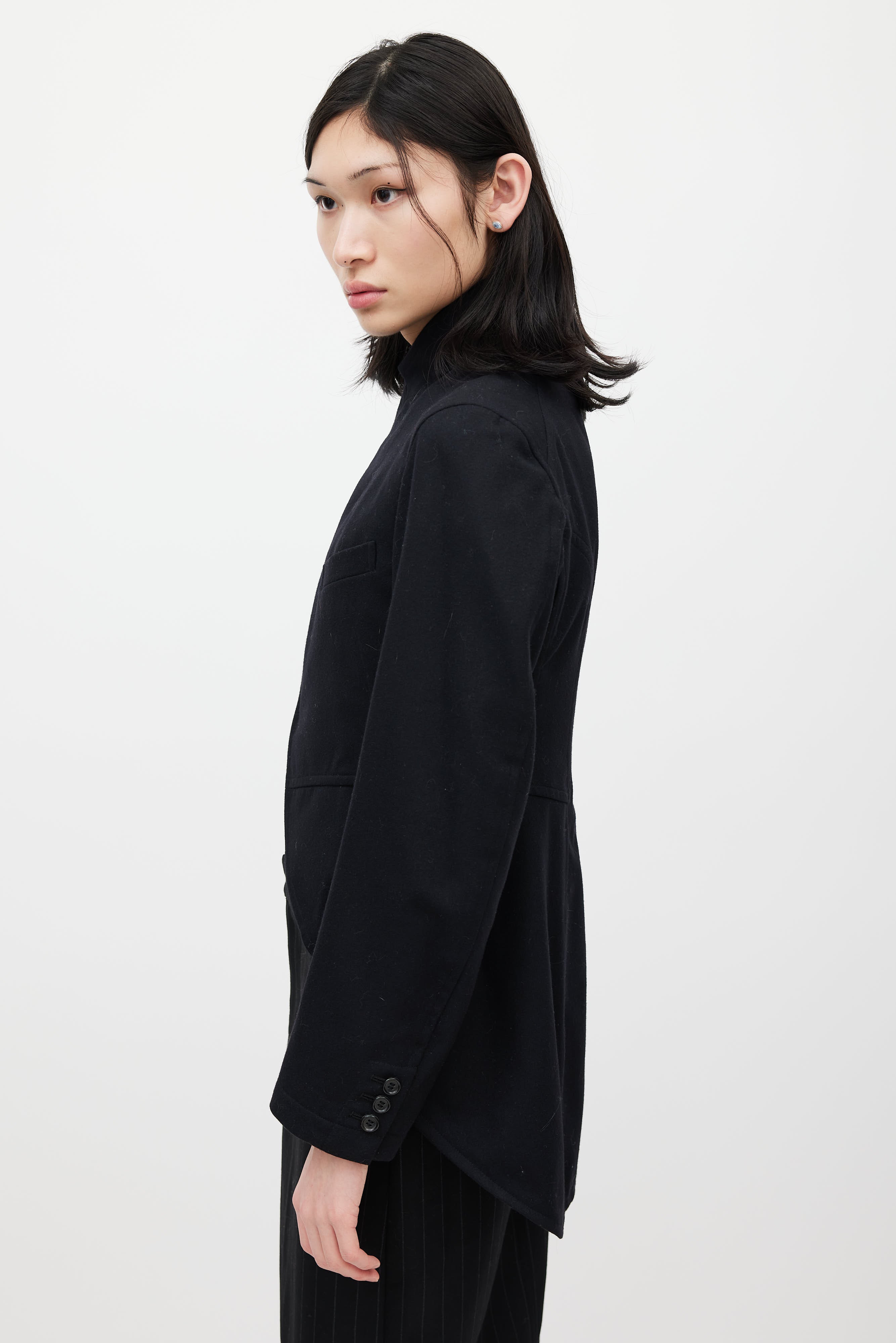 Pre-owned Comme des Garçons black wool blazer featuring a peak lapel, long sleeves, one welt pocket at chest, and zip closure. Lined.