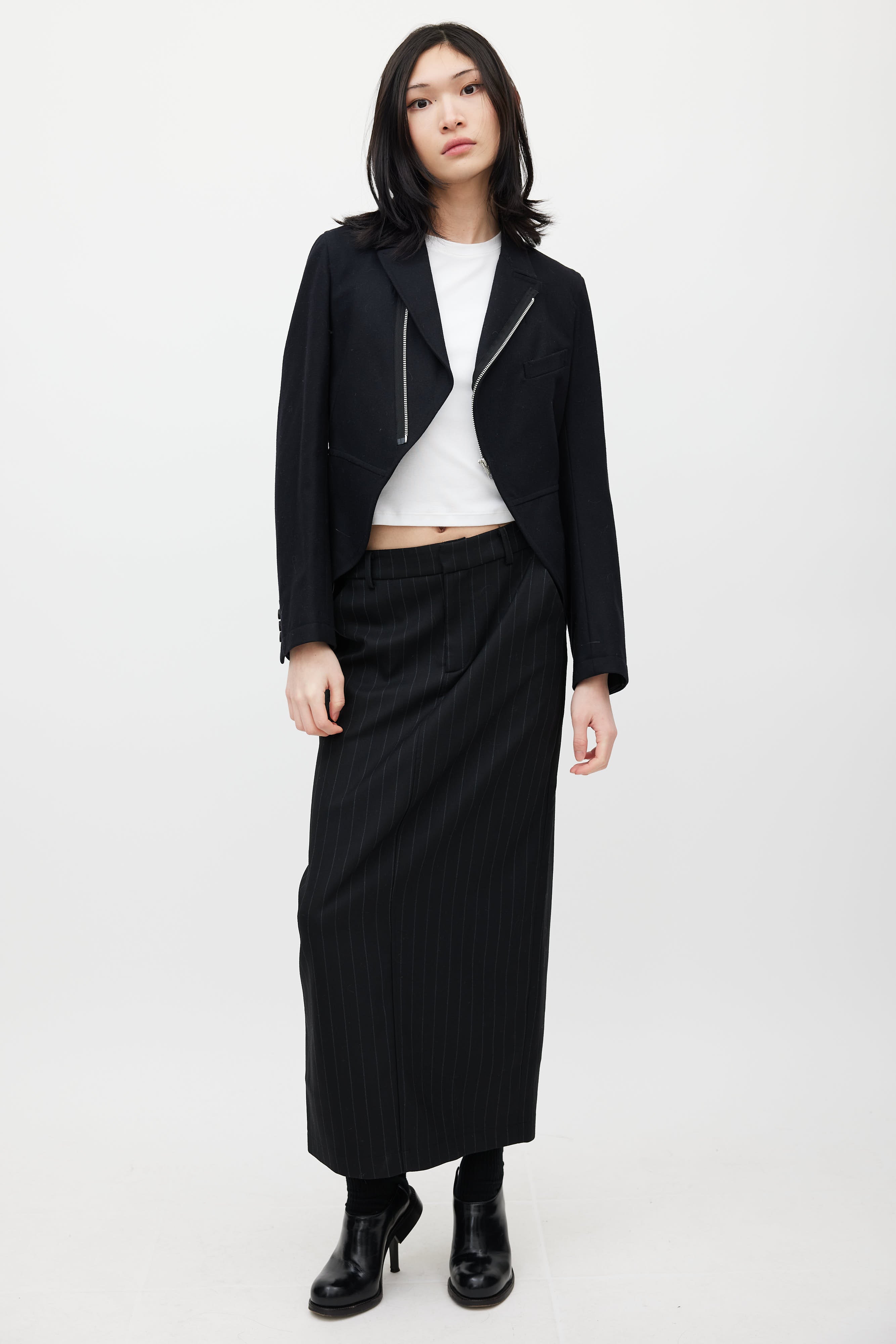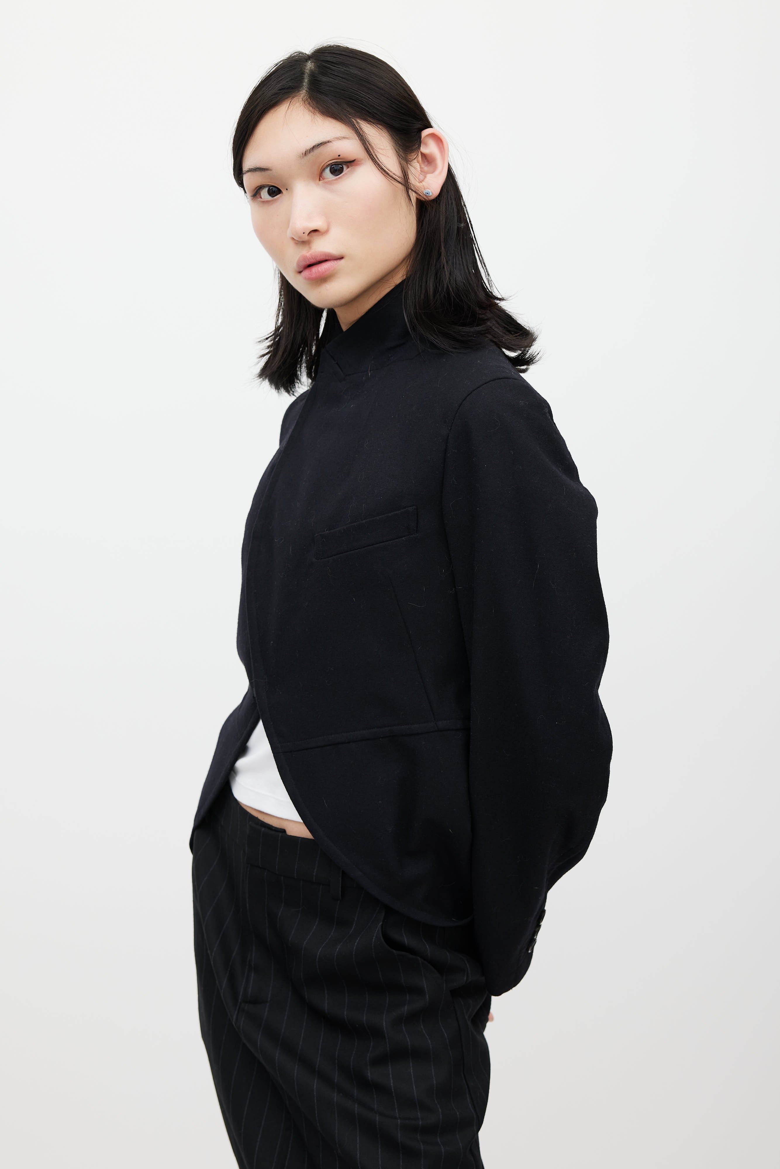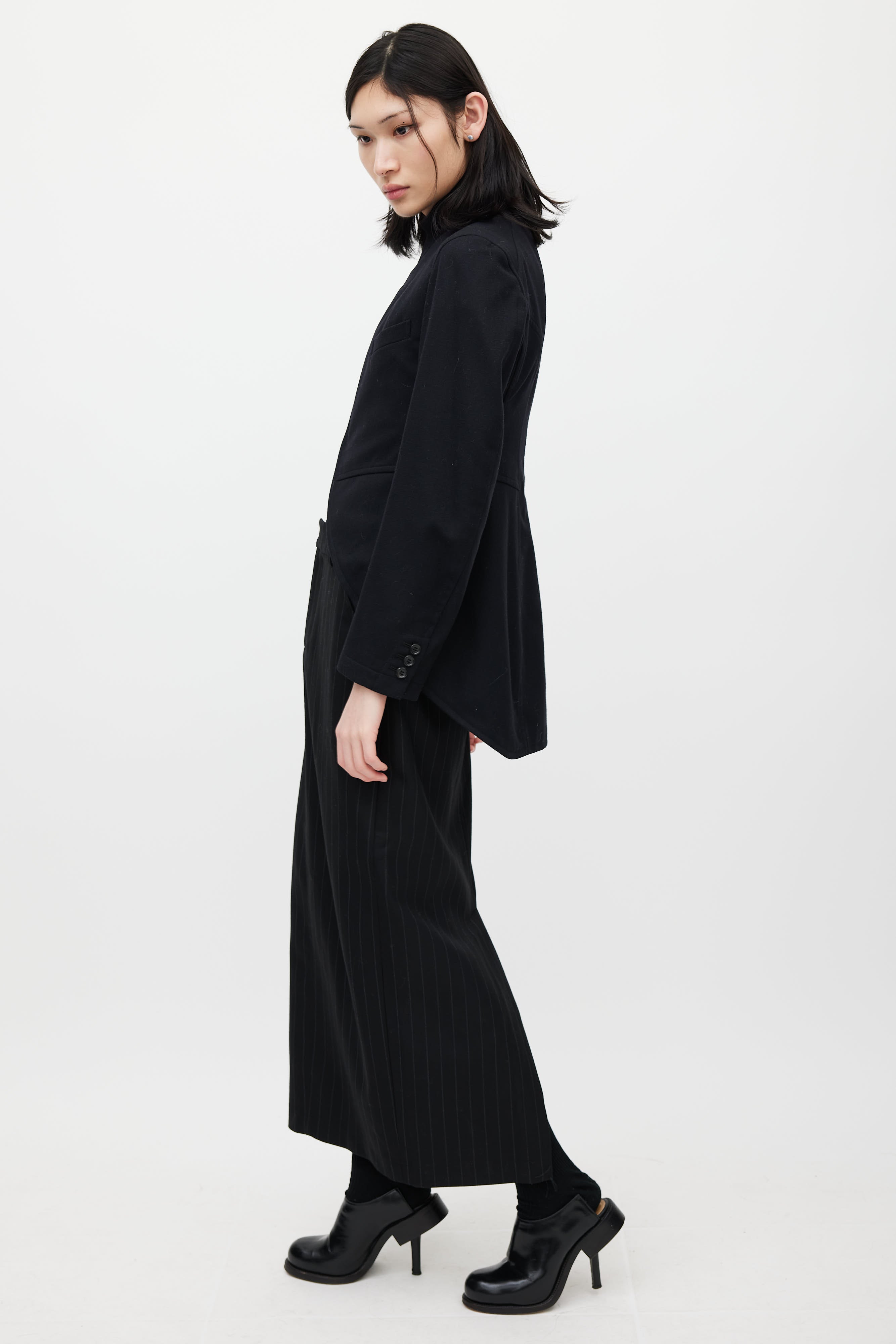 Pre-owned Comme des Garçons black wool blazer featuring a peak lapel, long sleeves, one welt pocket at chest, and zip closure. Lined.