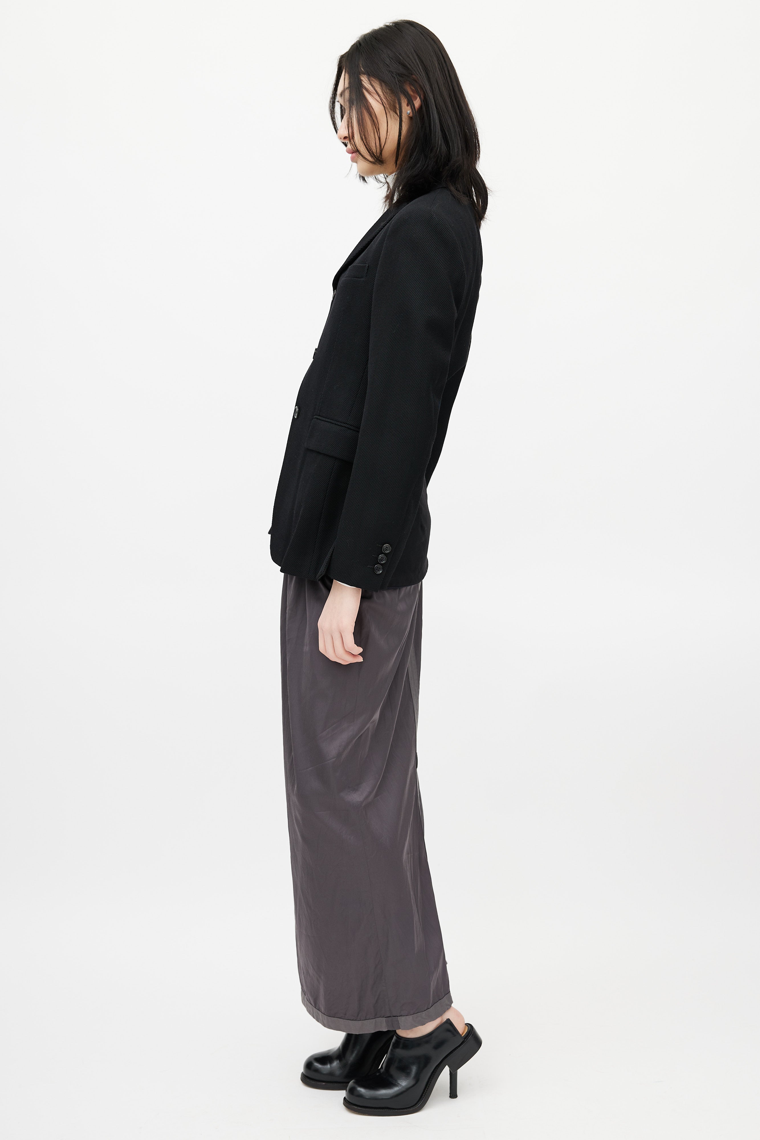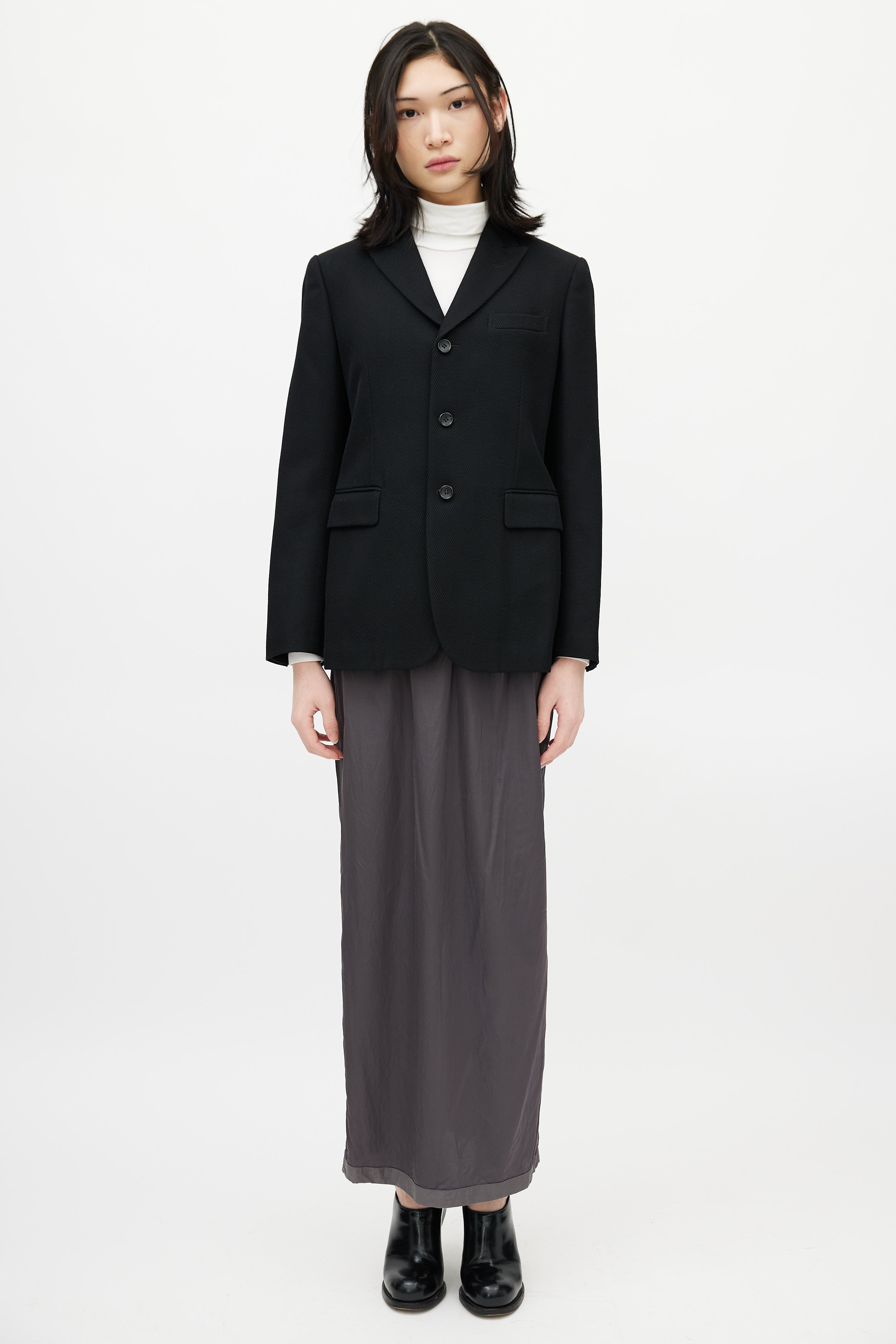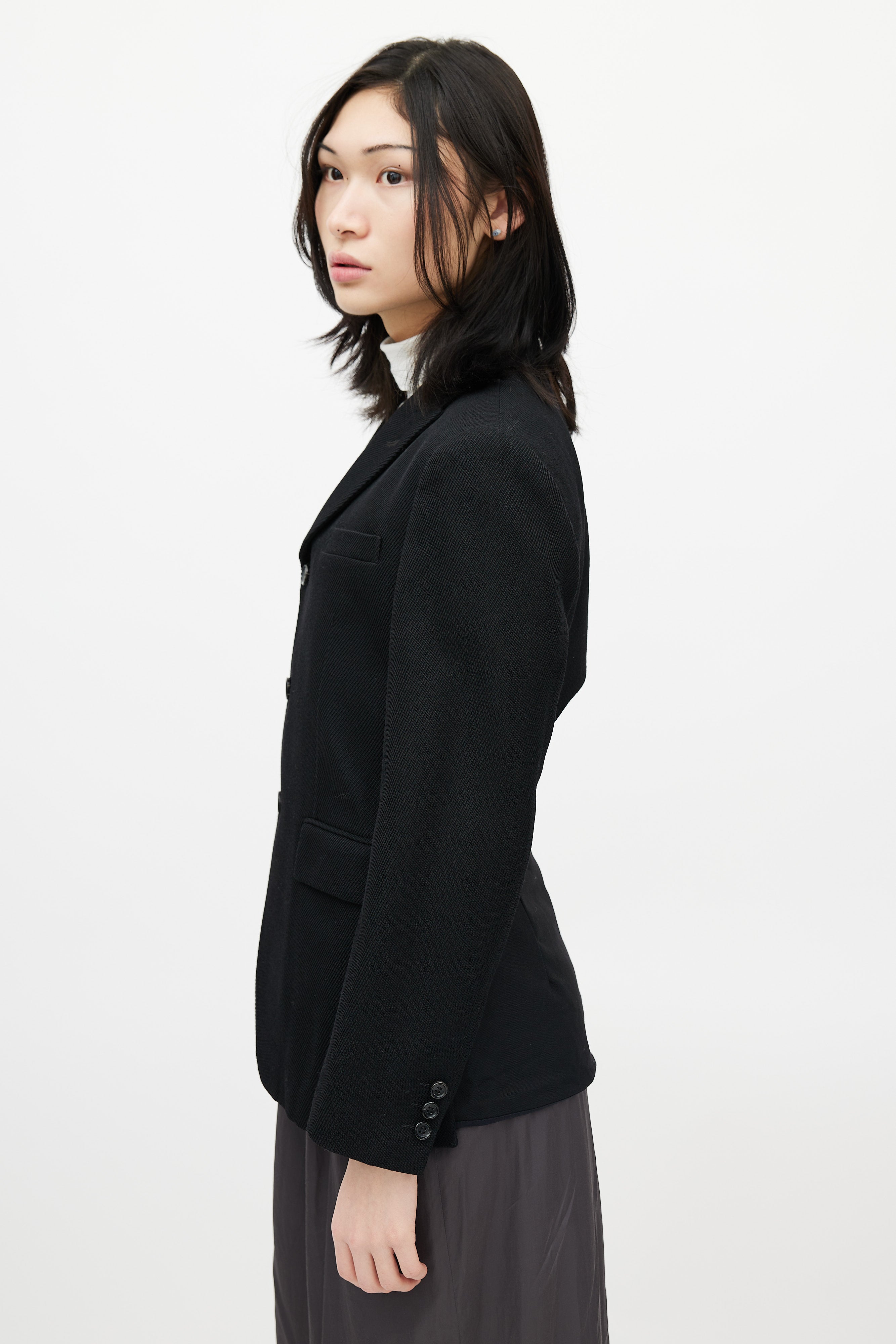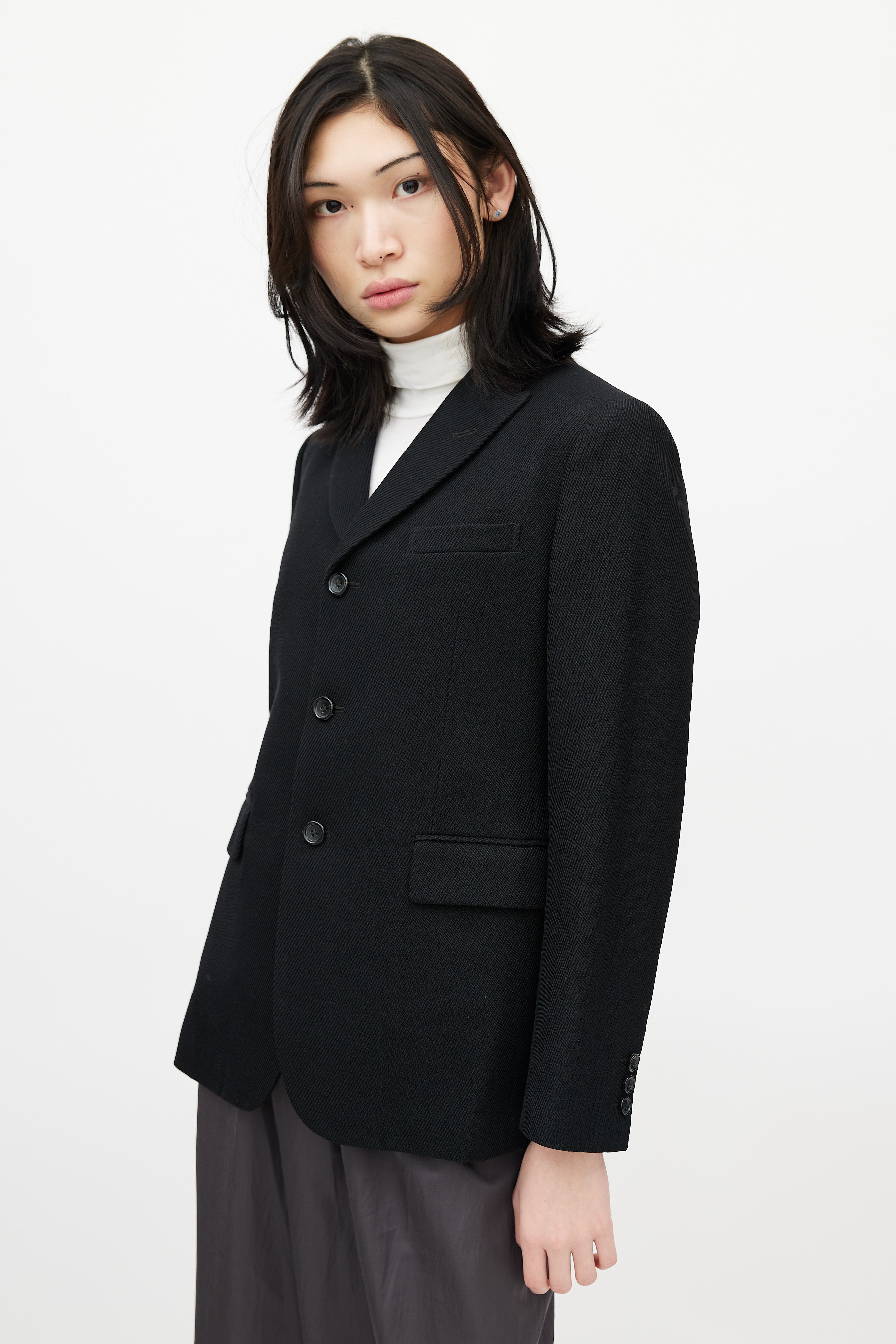 Pre-owned Comme des Garcons black wool blazer featuring a peak lapel, long sleeves with buttoned cuffs, one welt pocket at chest, two flap pockets at hip, high low hem with cut out at back, and button up closure. Lined.