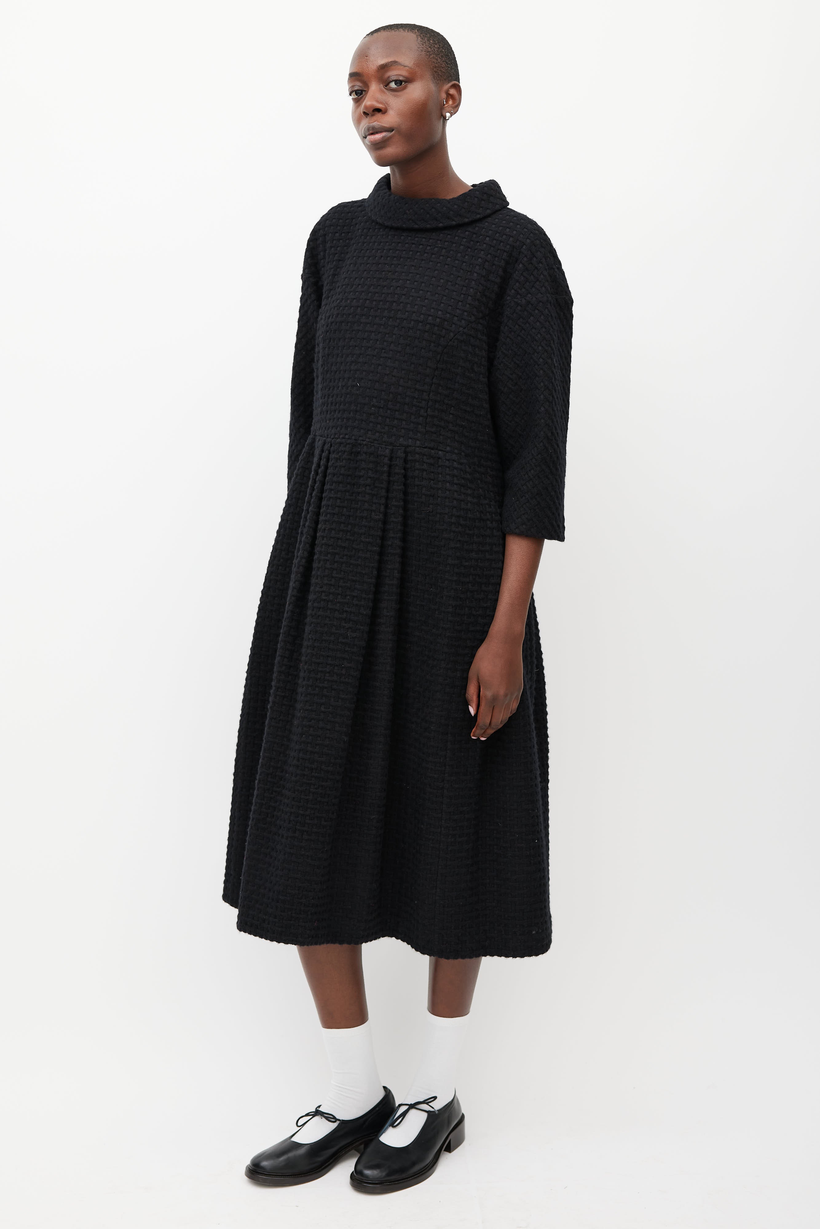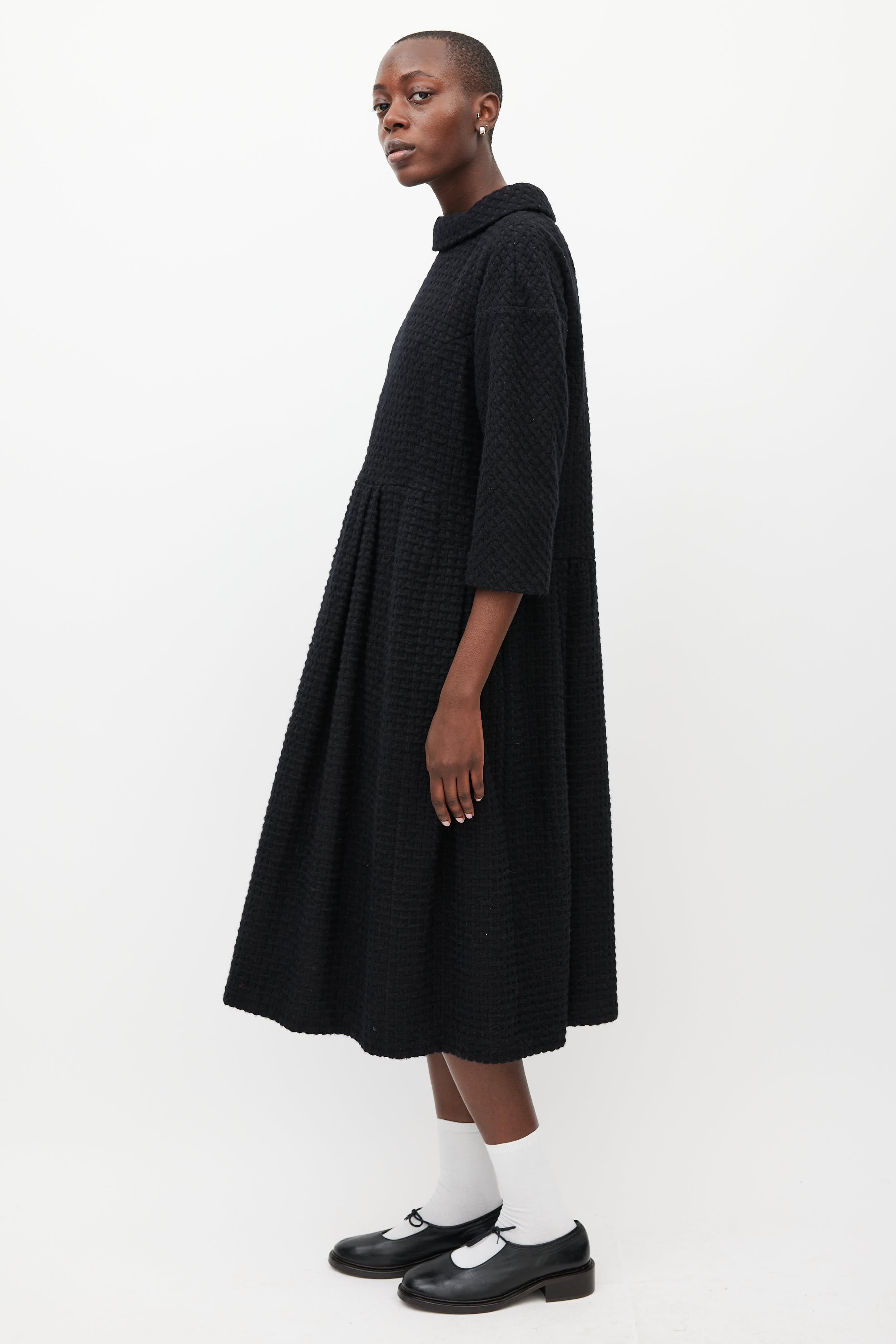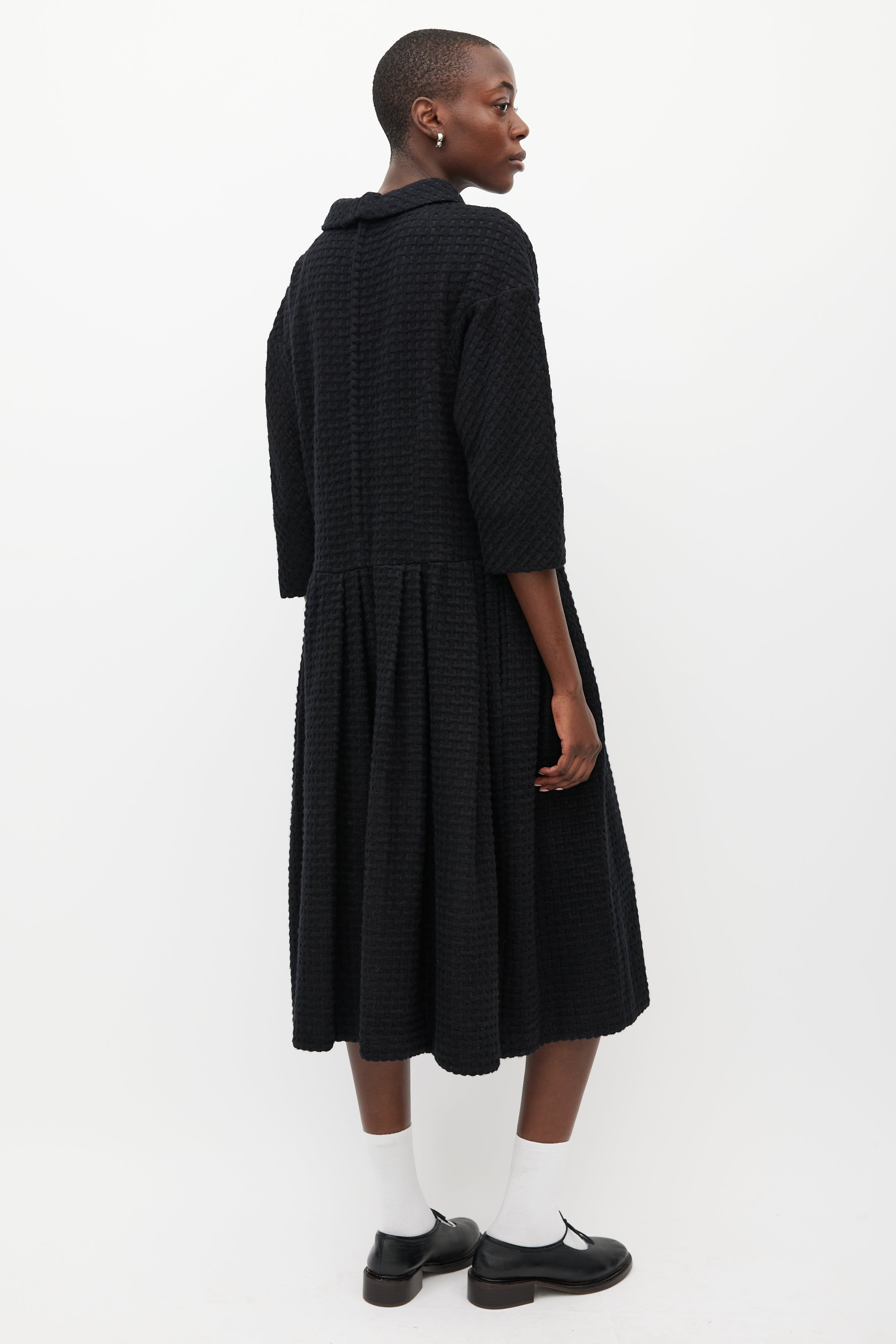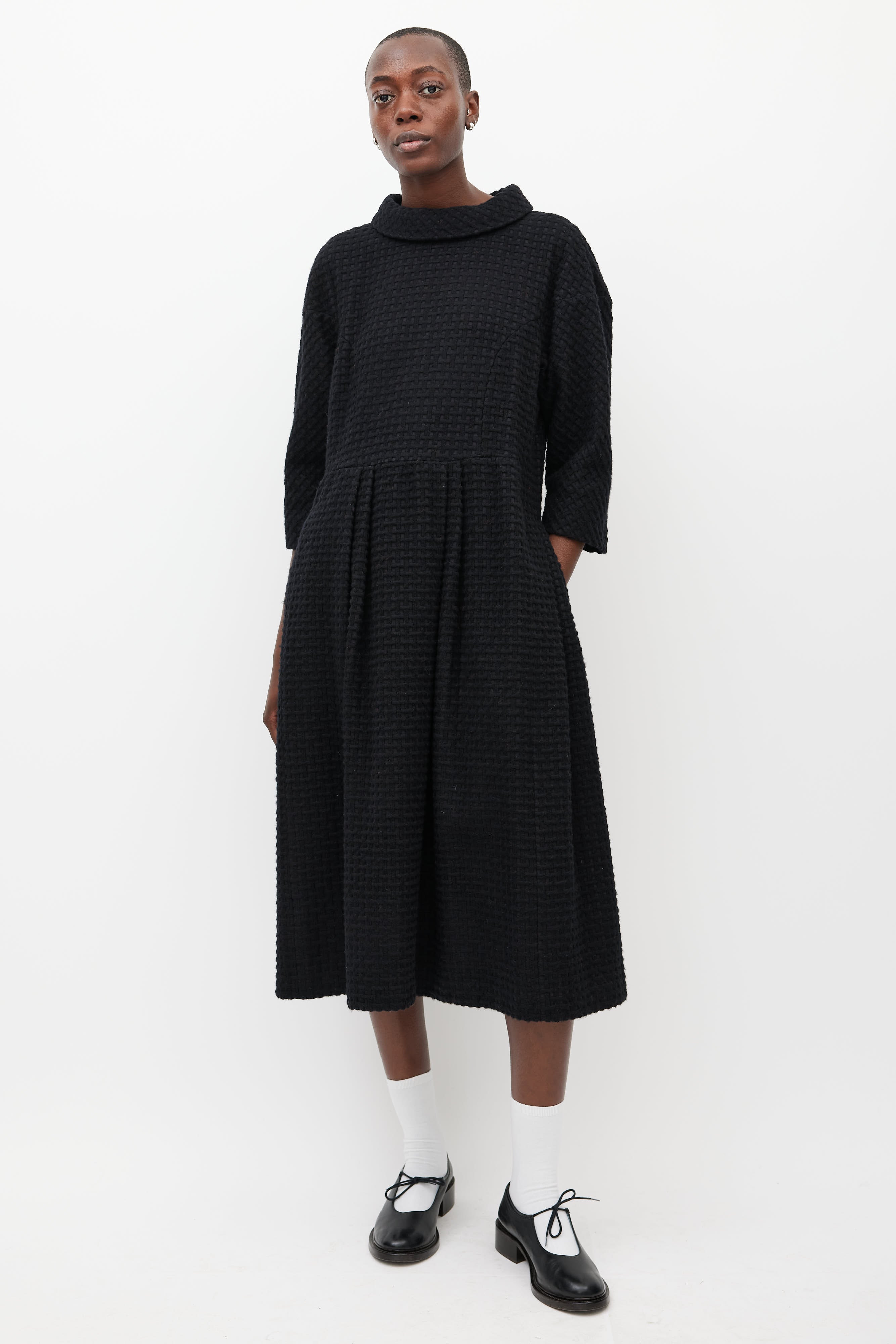 Pre-owned Comme des Garçons black wool woven dress featuring a round neckline, three quarter length sleeves, pleated skirt, and zip at back with hook and eye closure. Lined.
