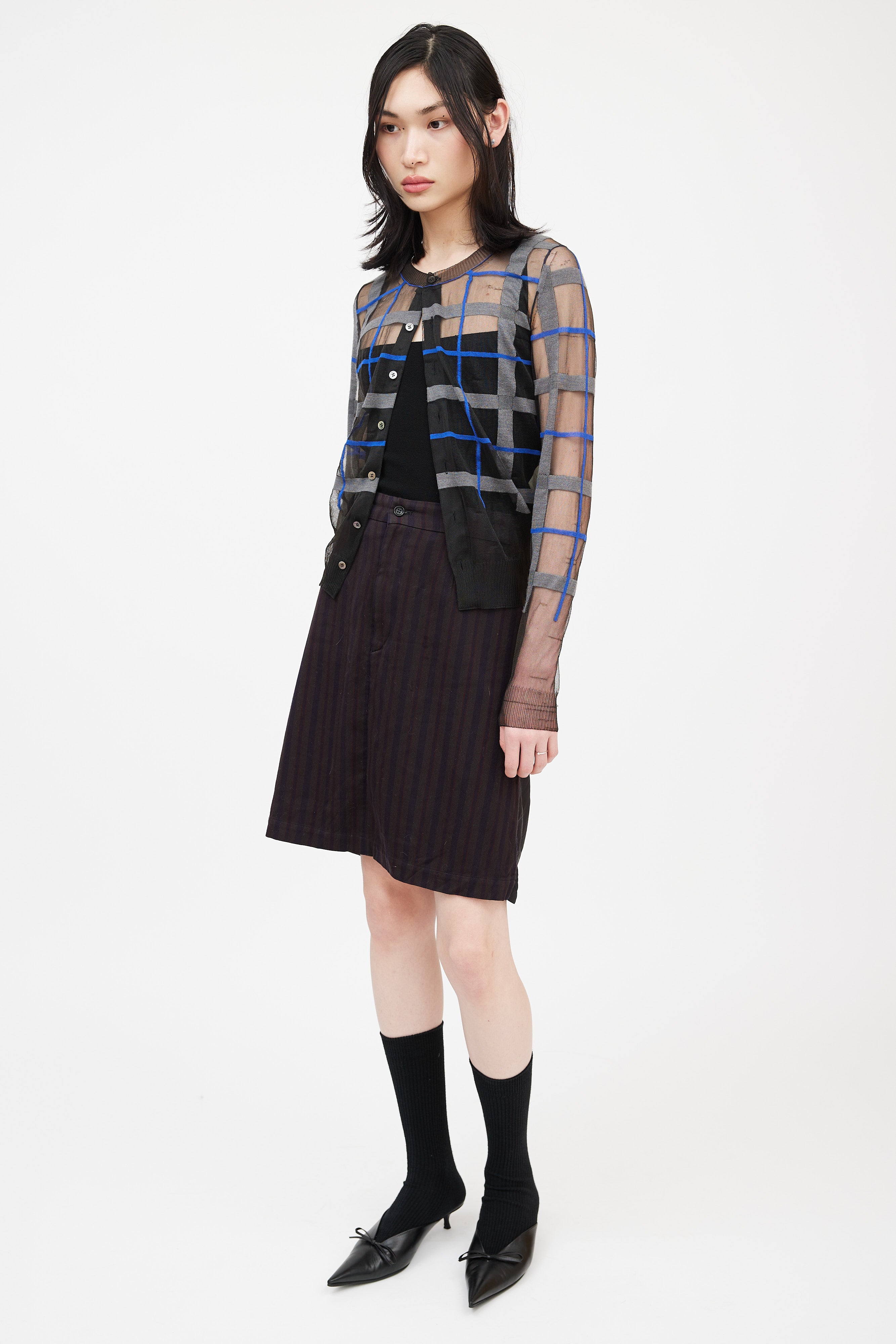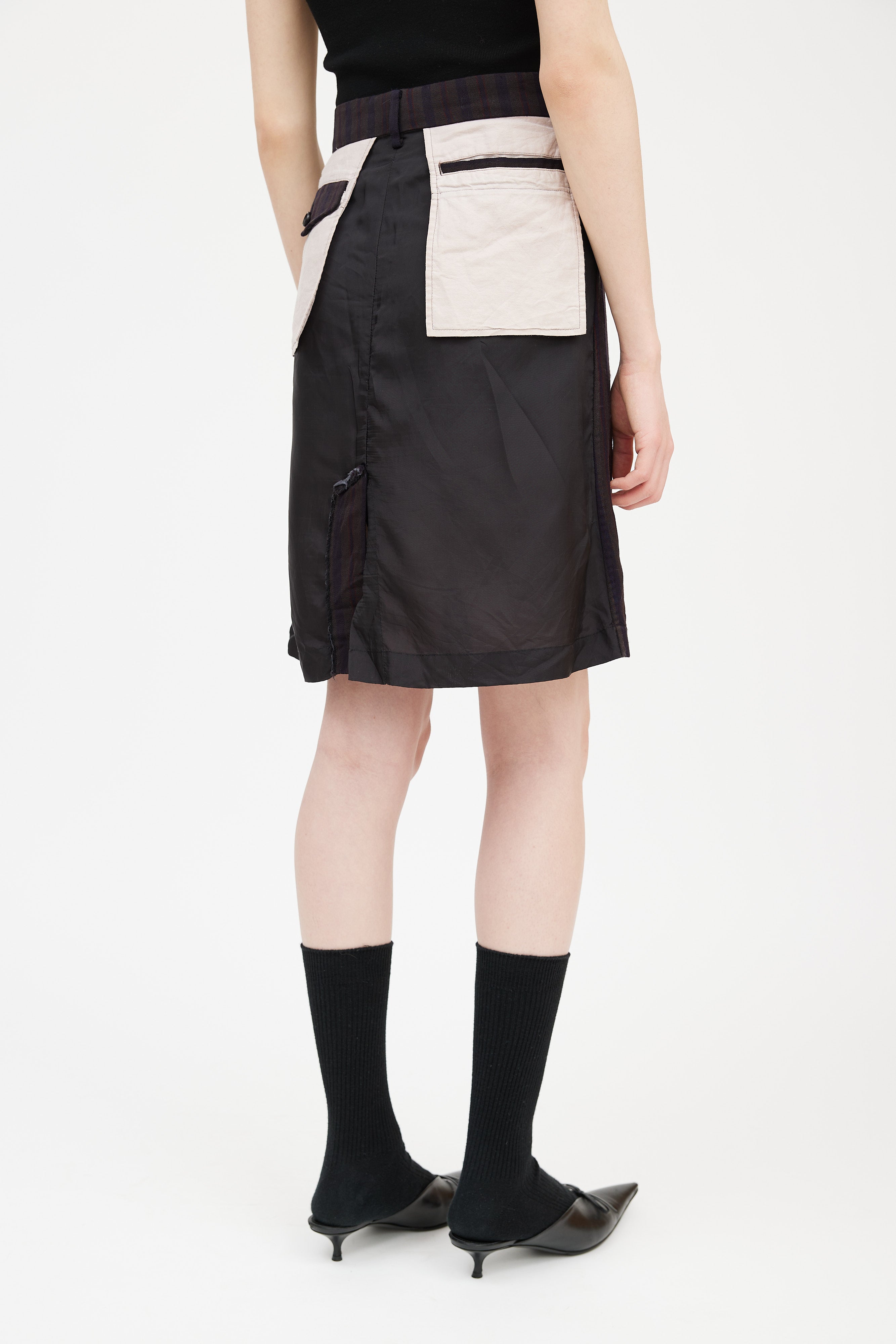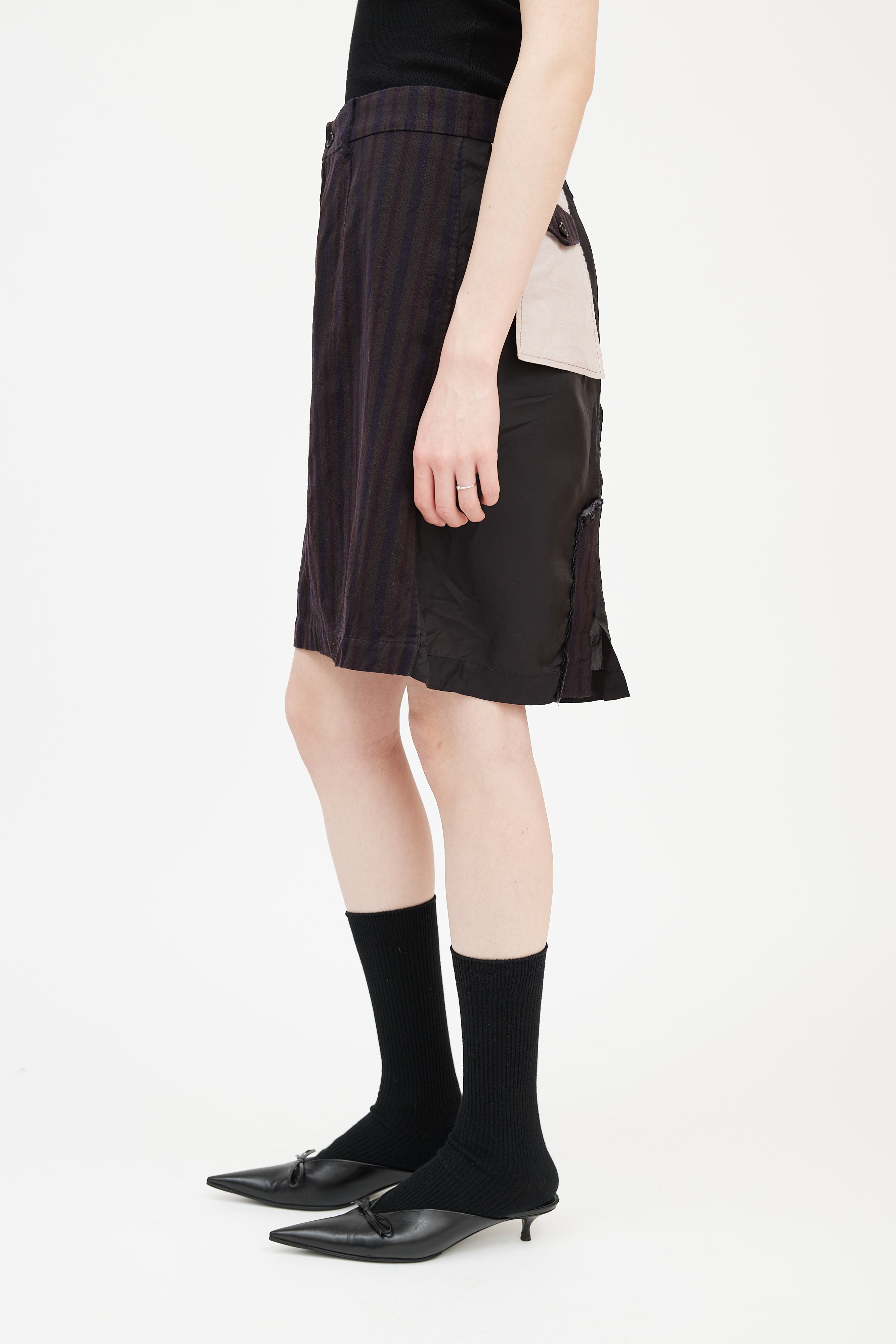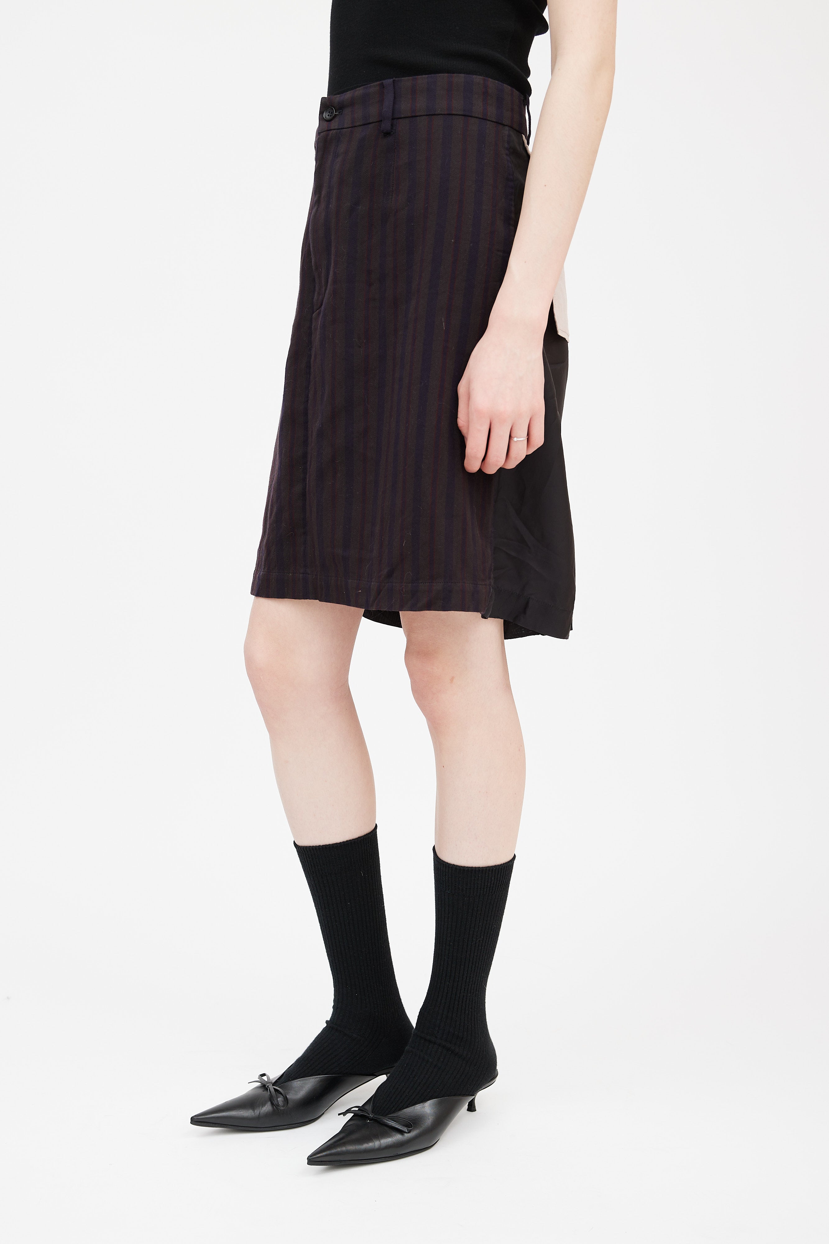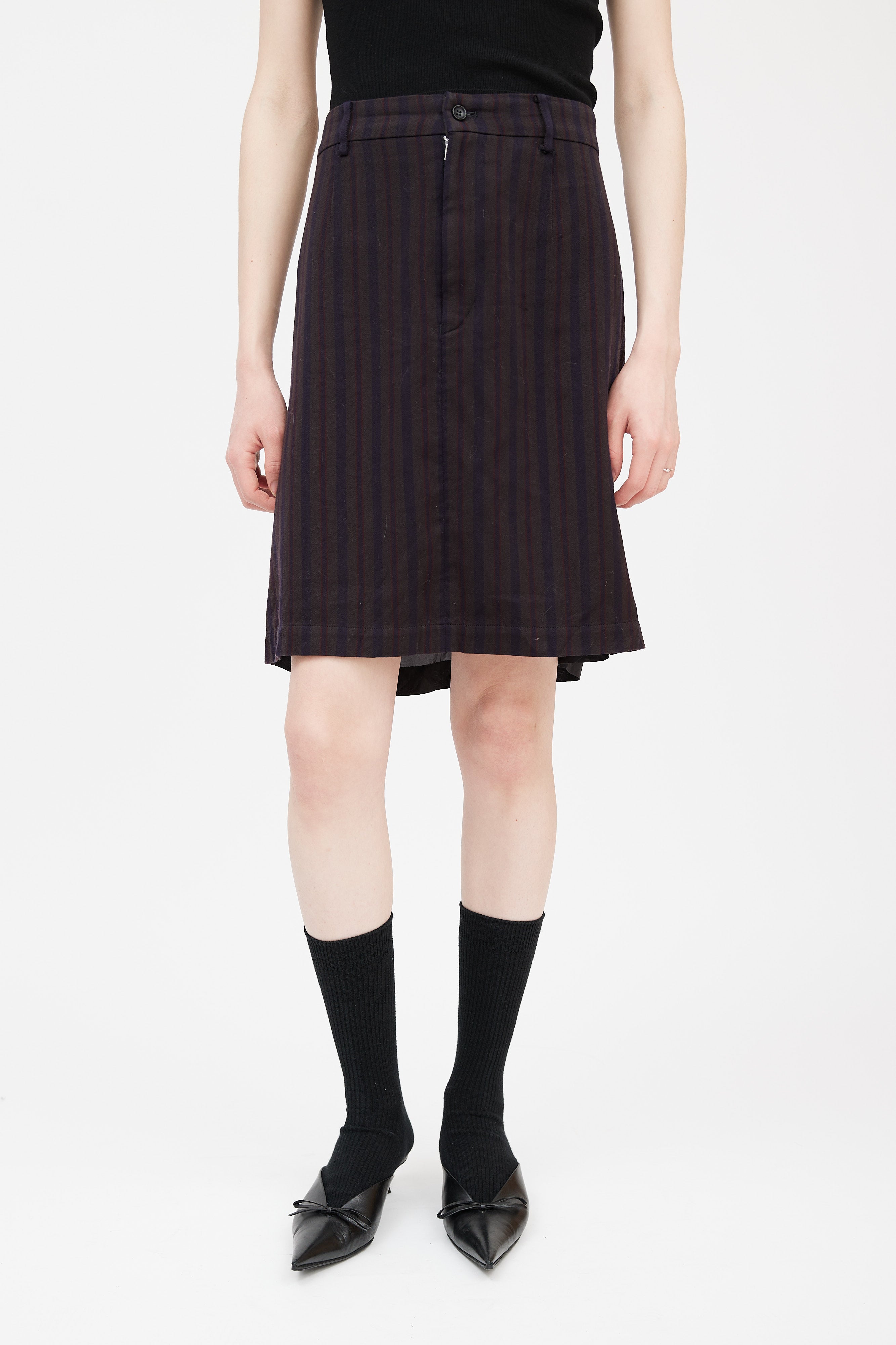 Pre-owned Comme des Garçons midi skirt featuring a brown, navy, and red striped front, front zip closure with top button fastening, and black deconstructed style back with exposed pocket bags and inverted vent.