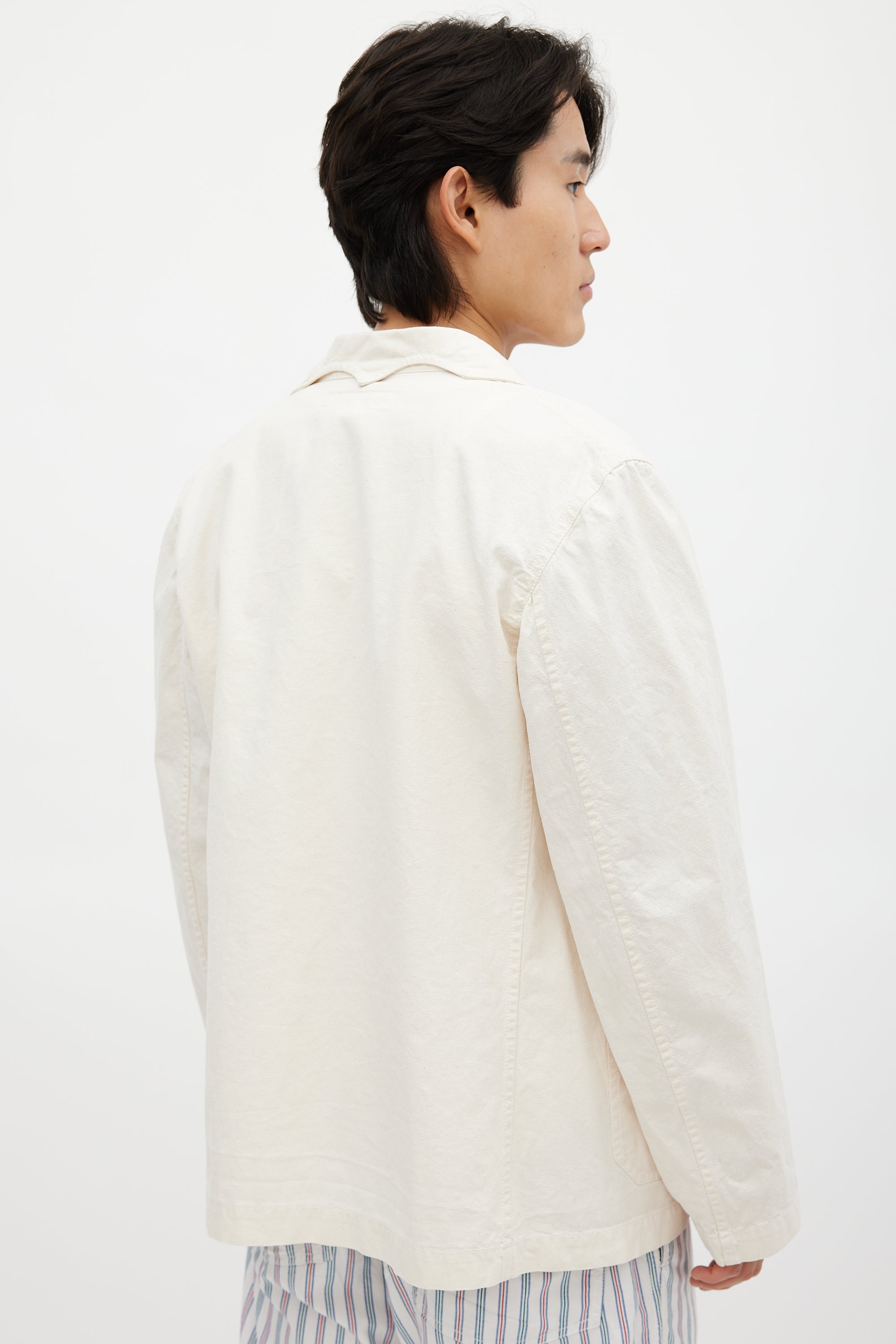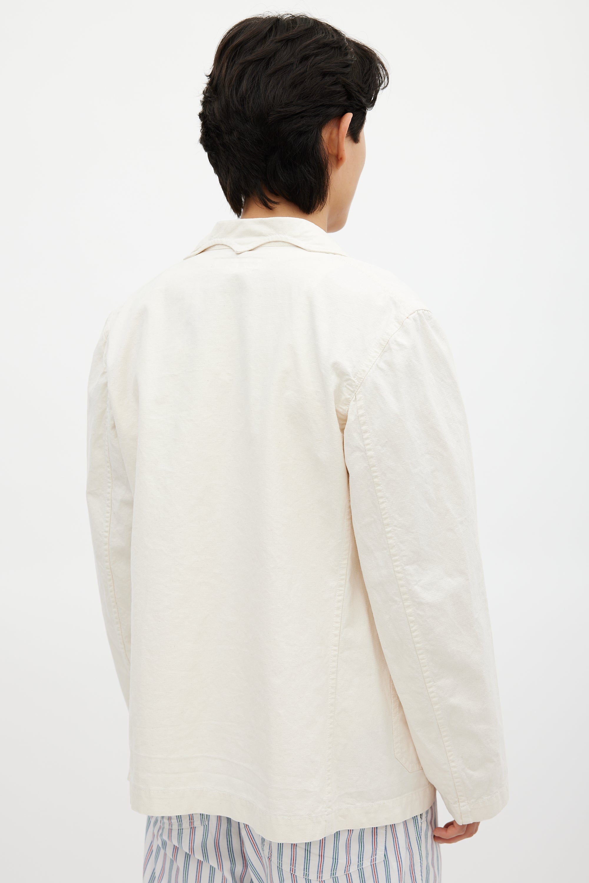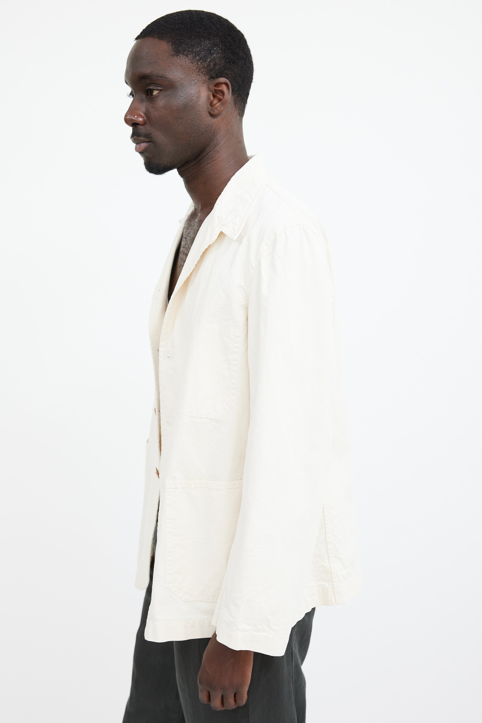 Pre-owned Comme des Garçons SHIRT cream chore coat featuring a pointed collar, long sleeves, two patch pockets at hip, and button up closure.