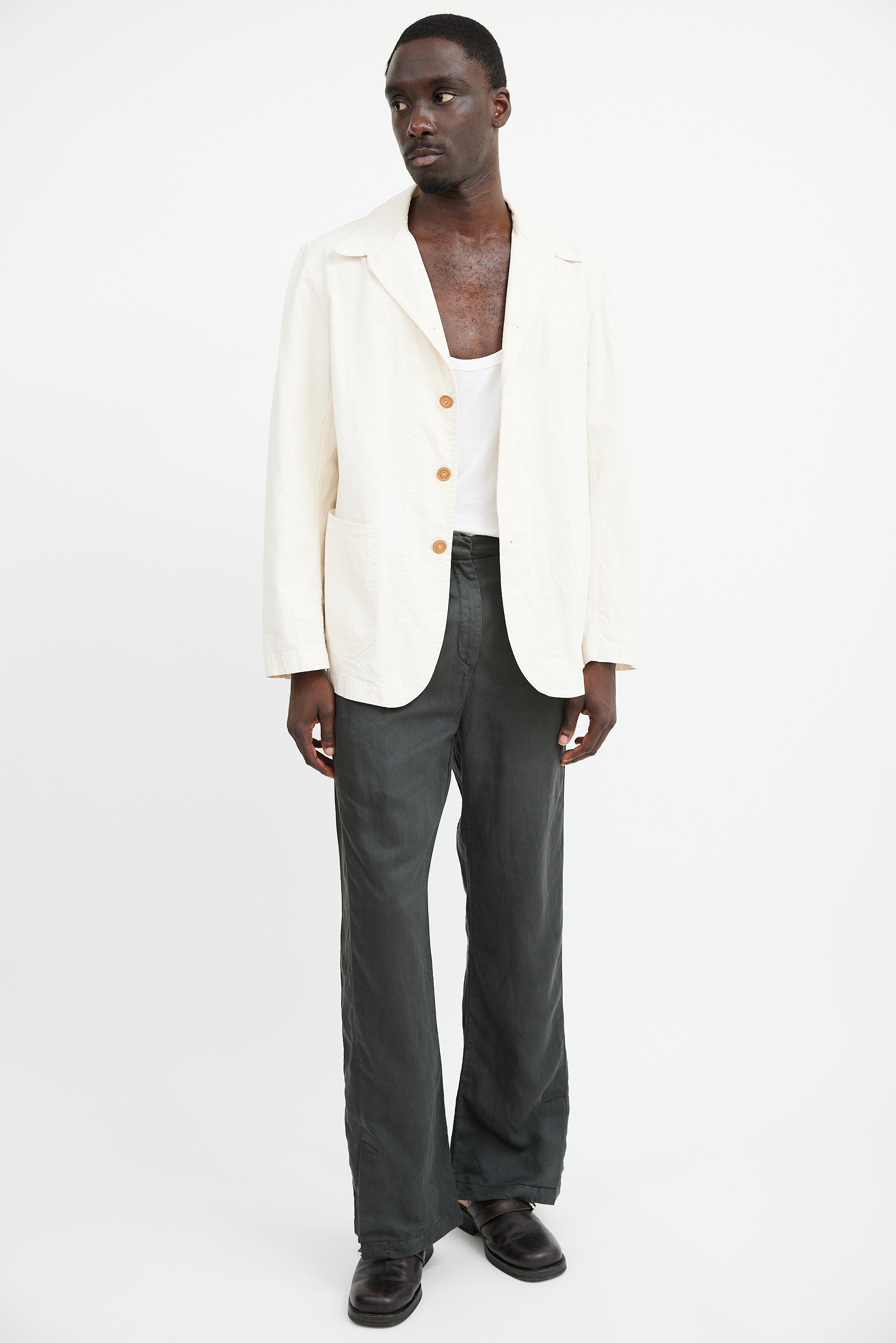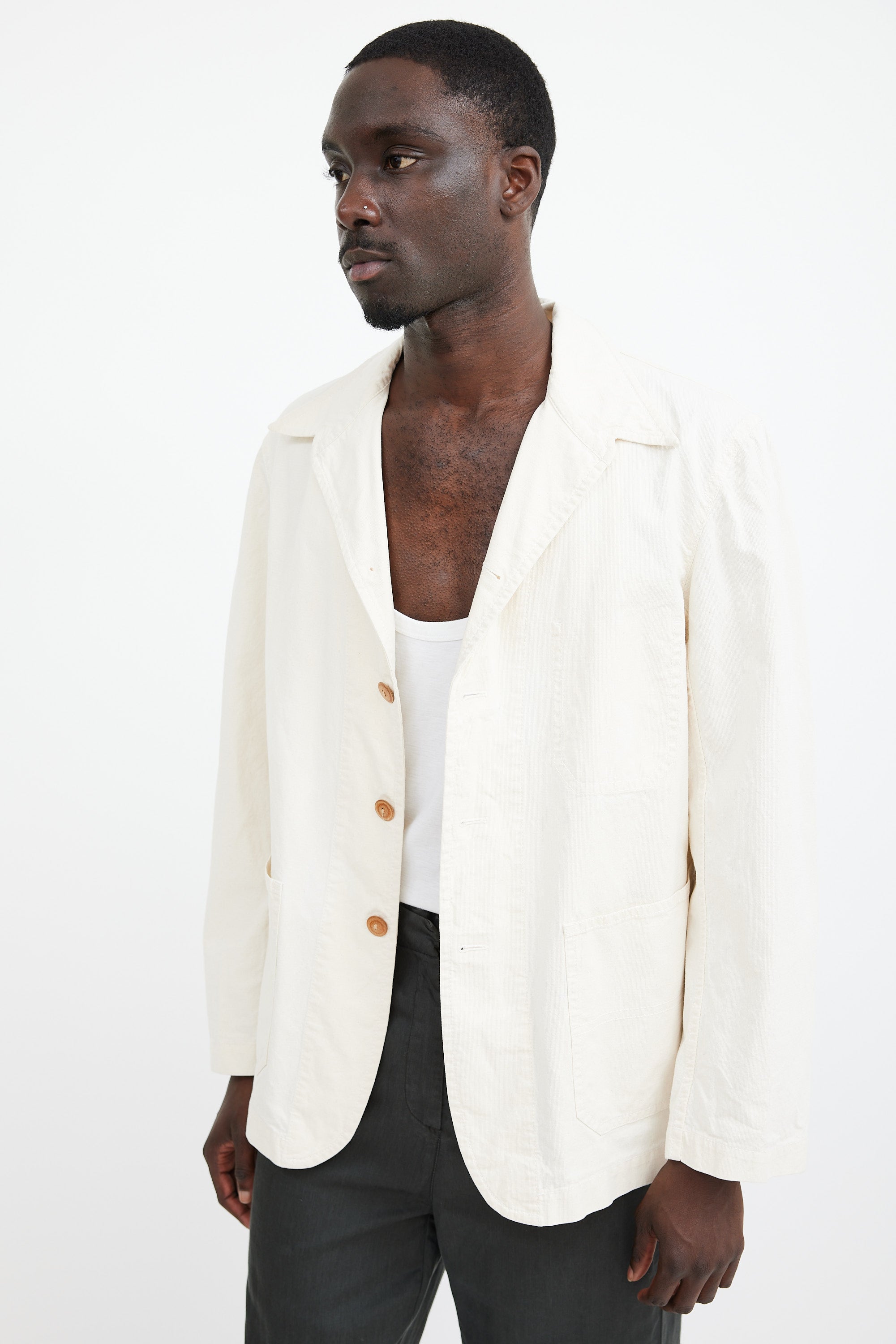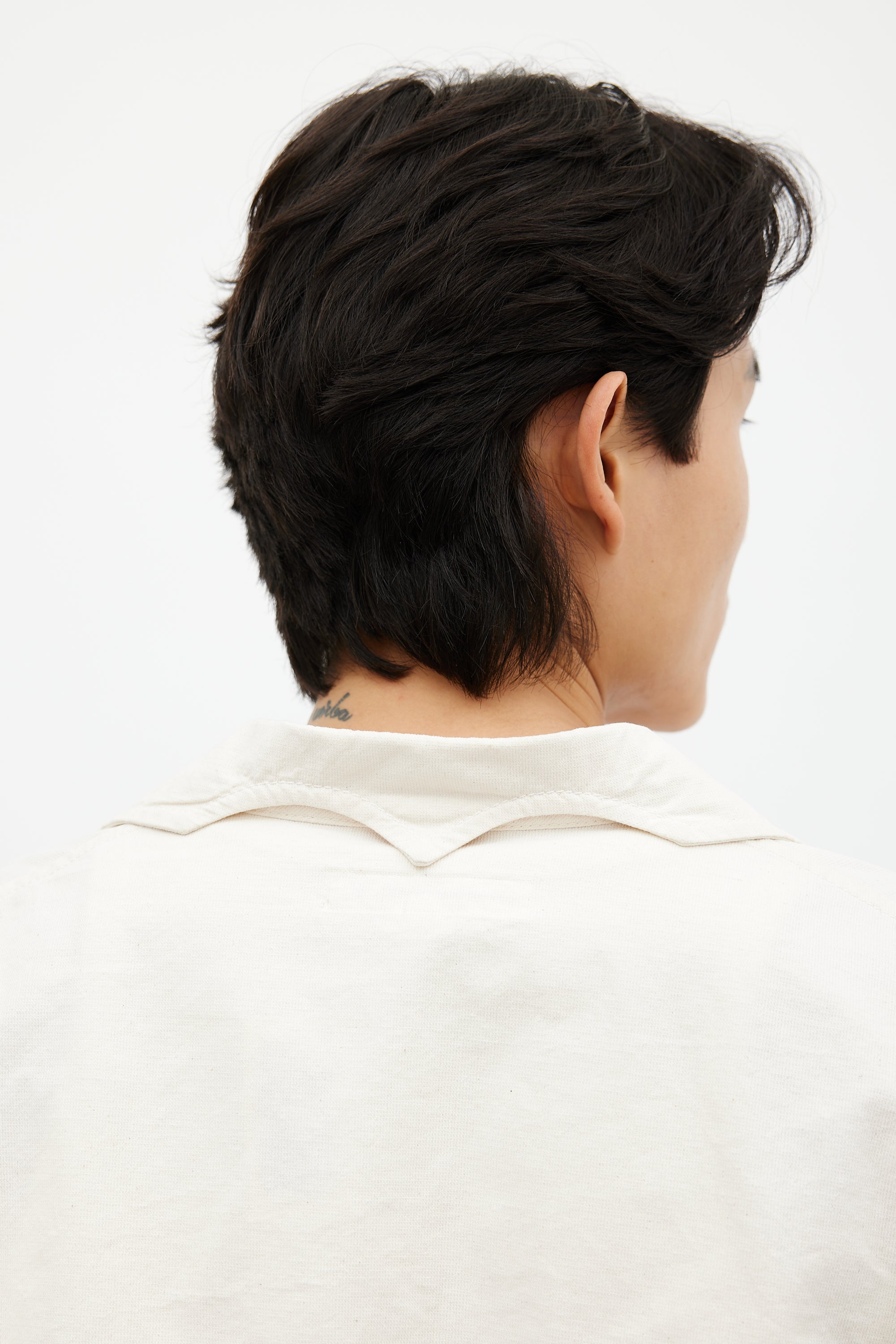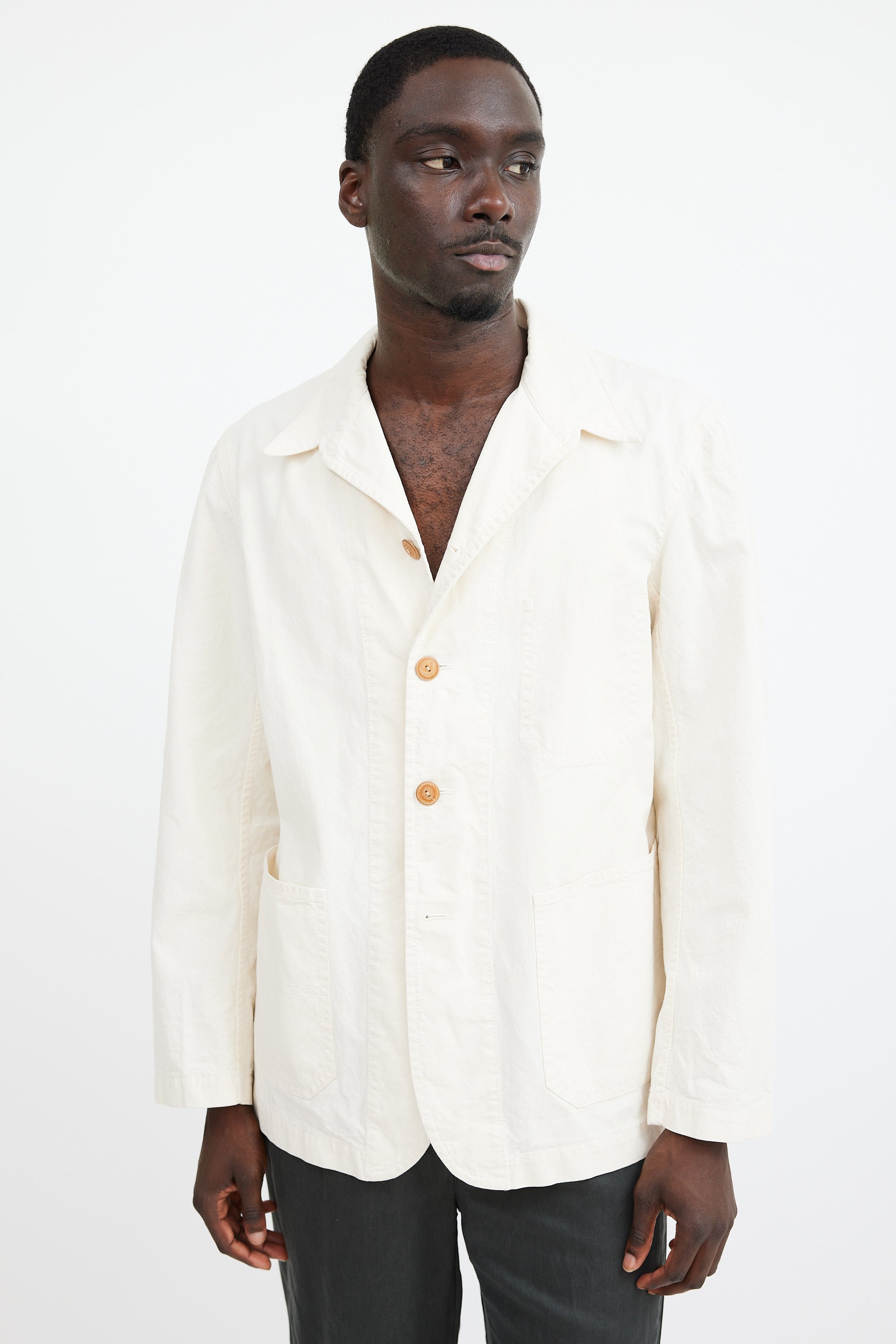 Pre-owned Comme des Garçons SHIRT cream chore coat featuring a pointed collar, long sleeves, two patch pockets at hip, and button up closure.