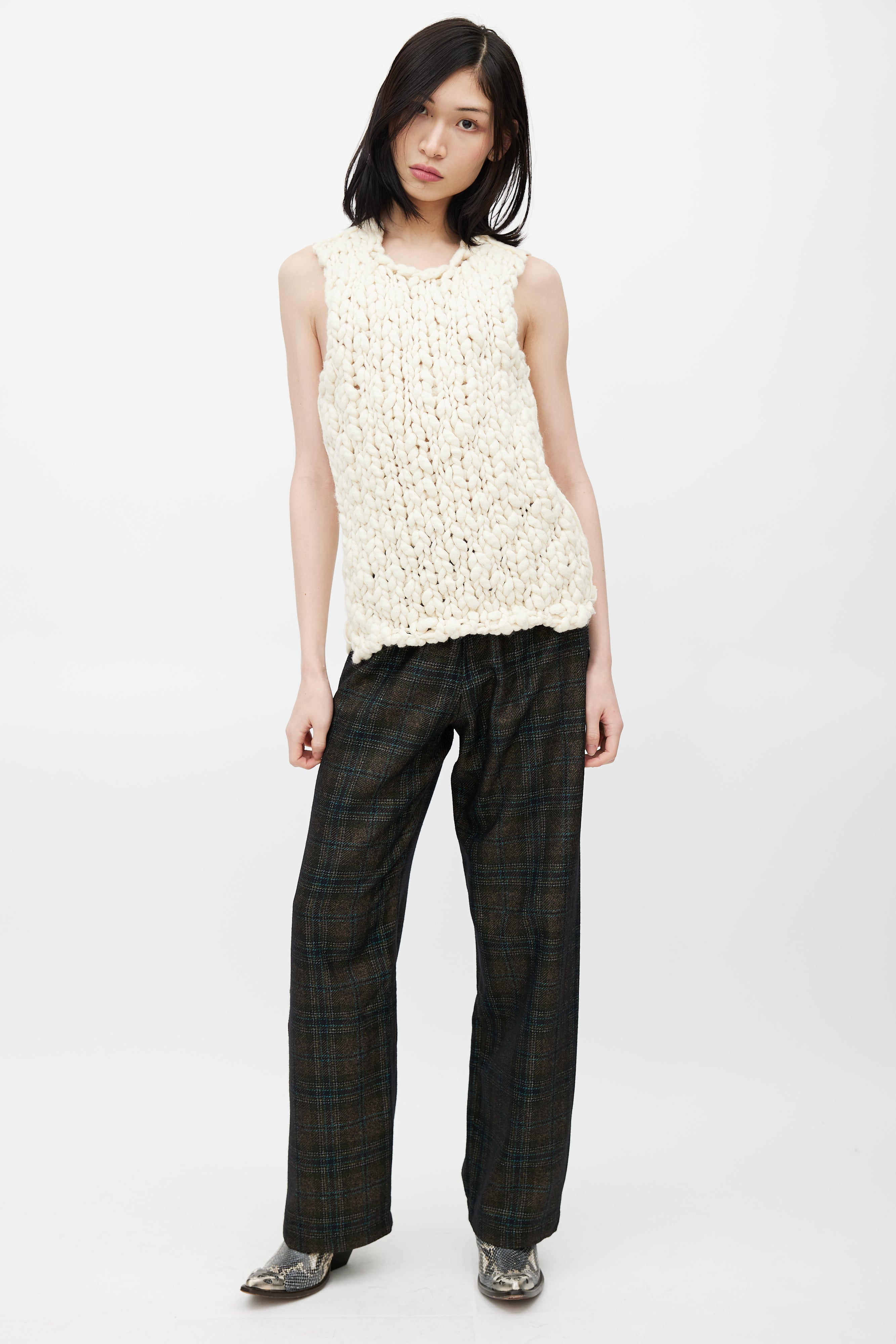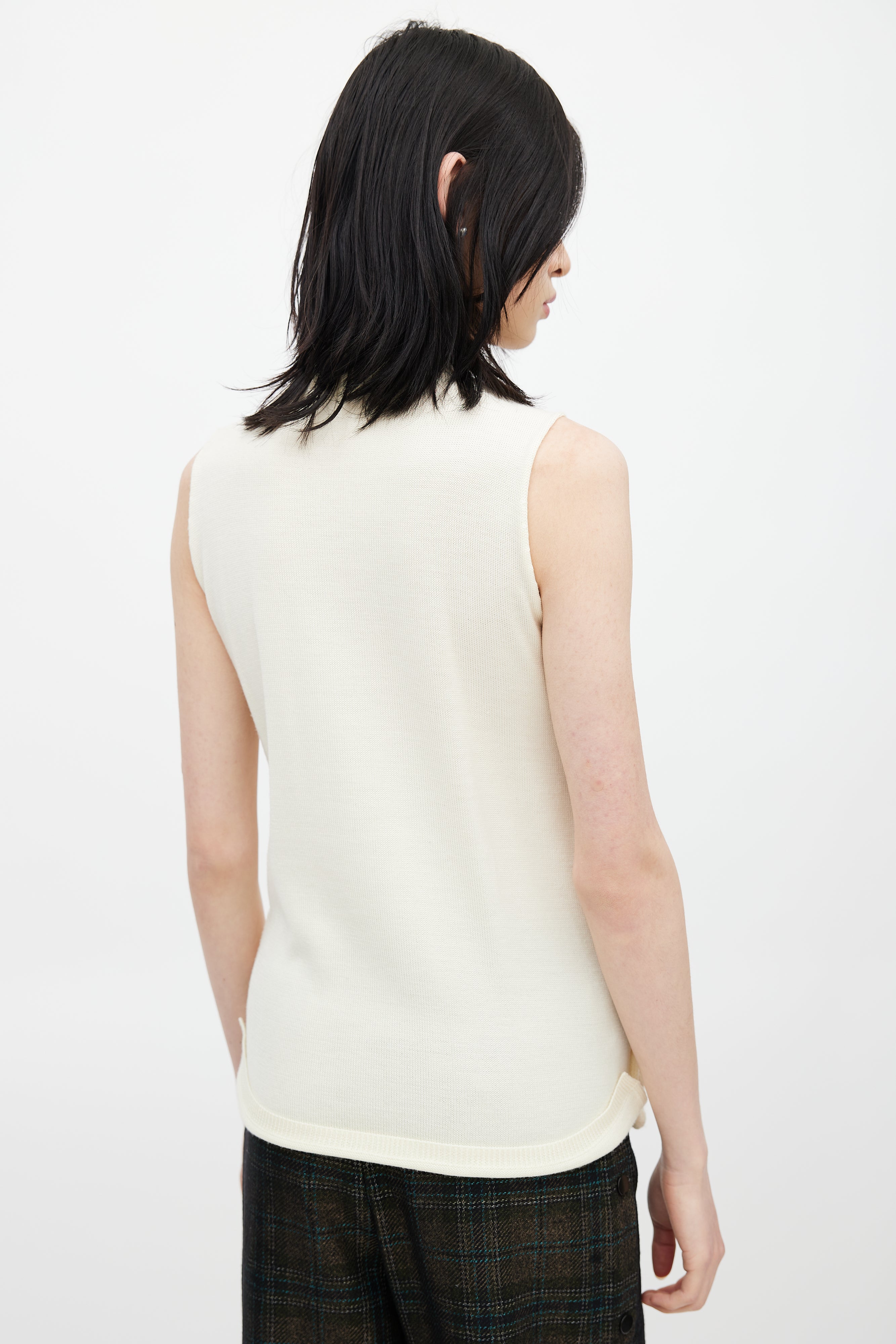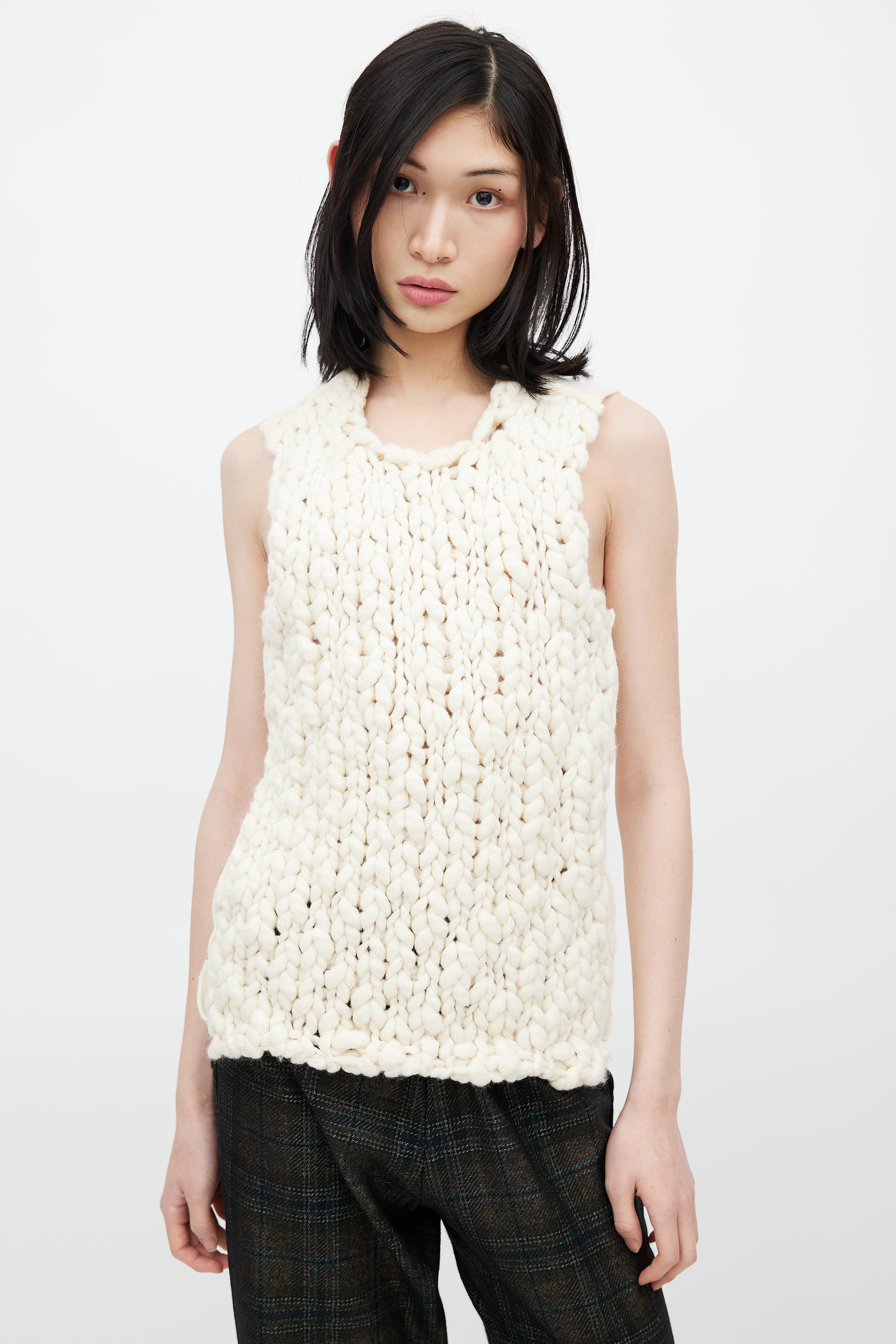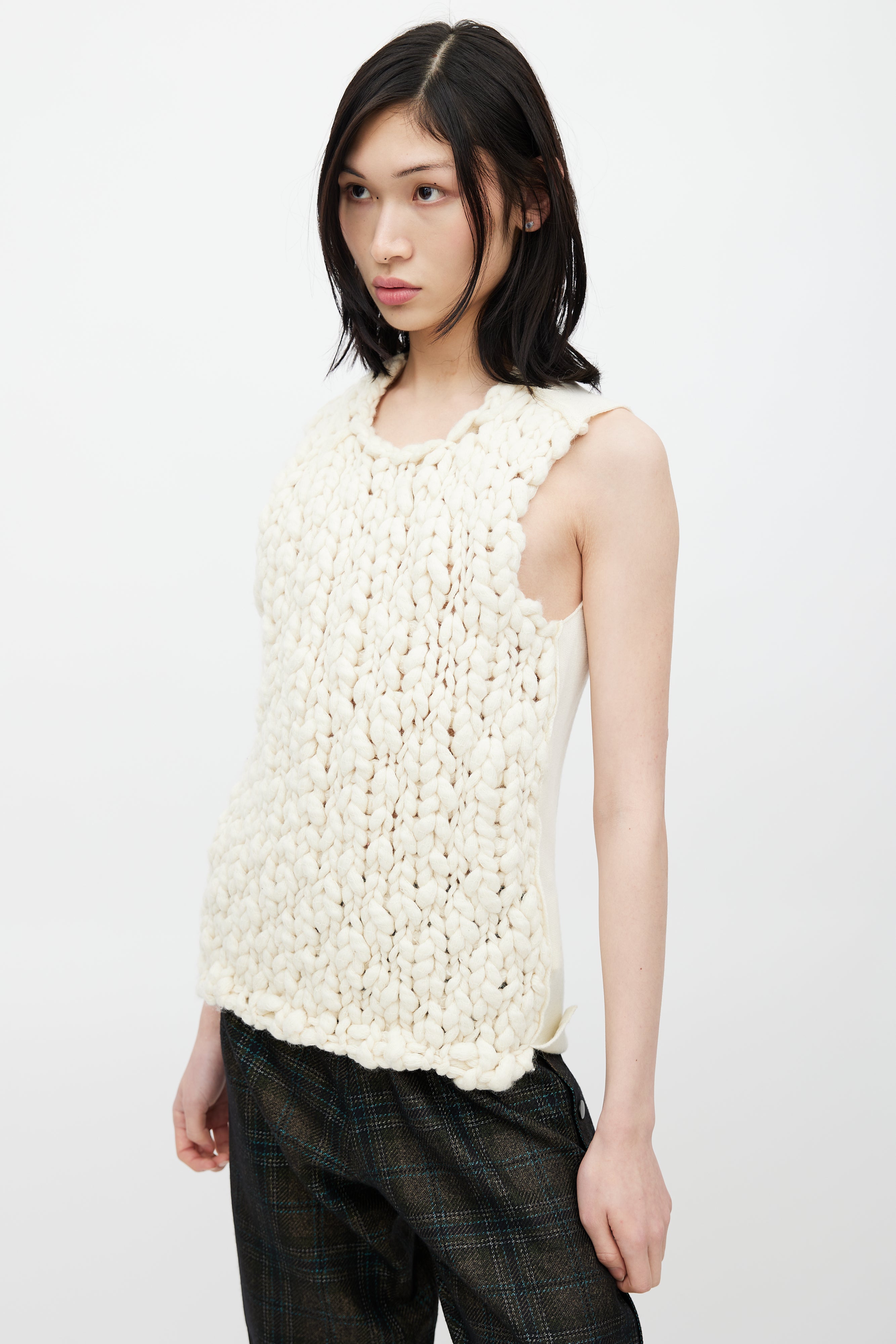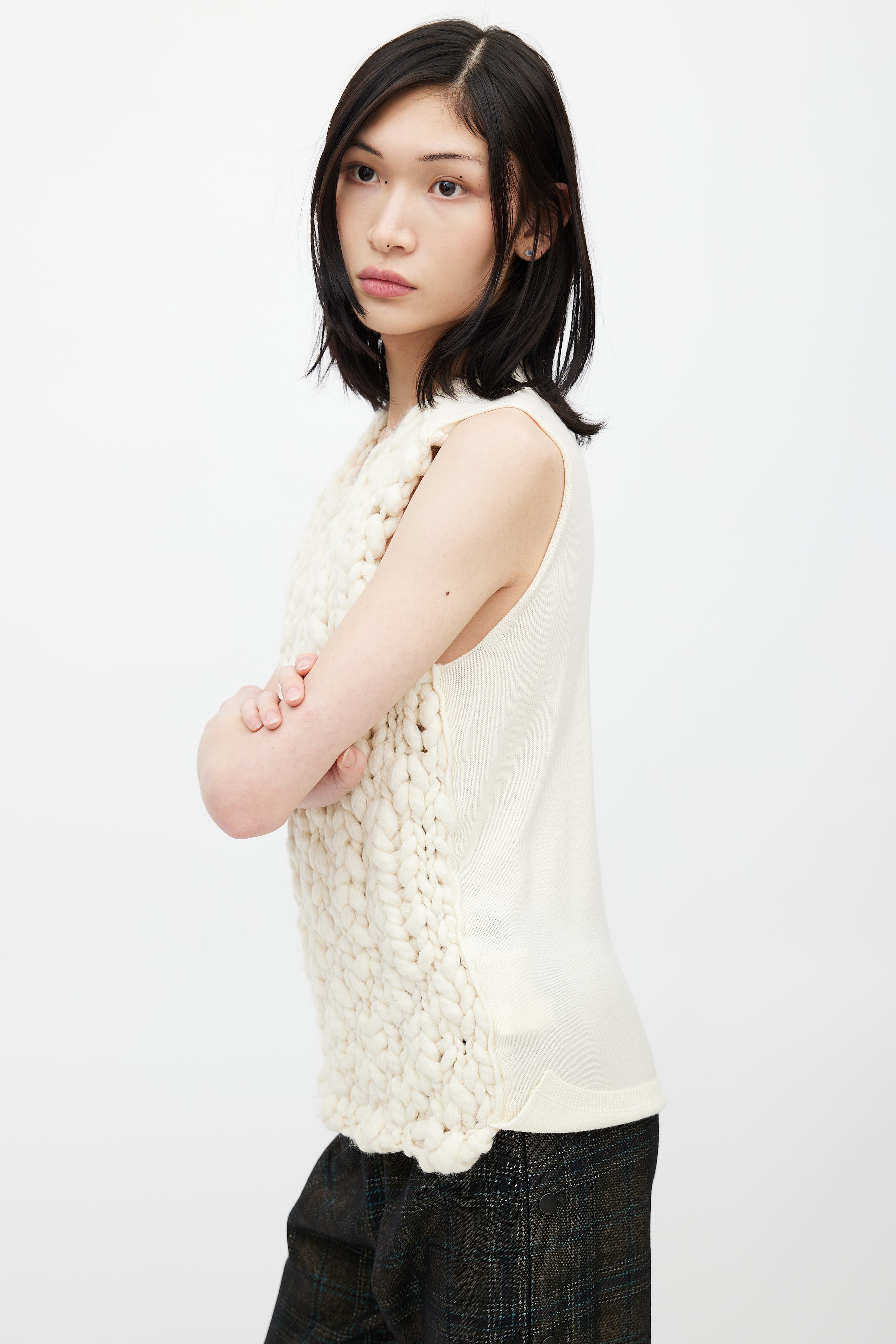 Pre-owned Comme des Garçons cream wool knit vest featuring a cable knit weave at front, round neckline, and sleeveless styling.