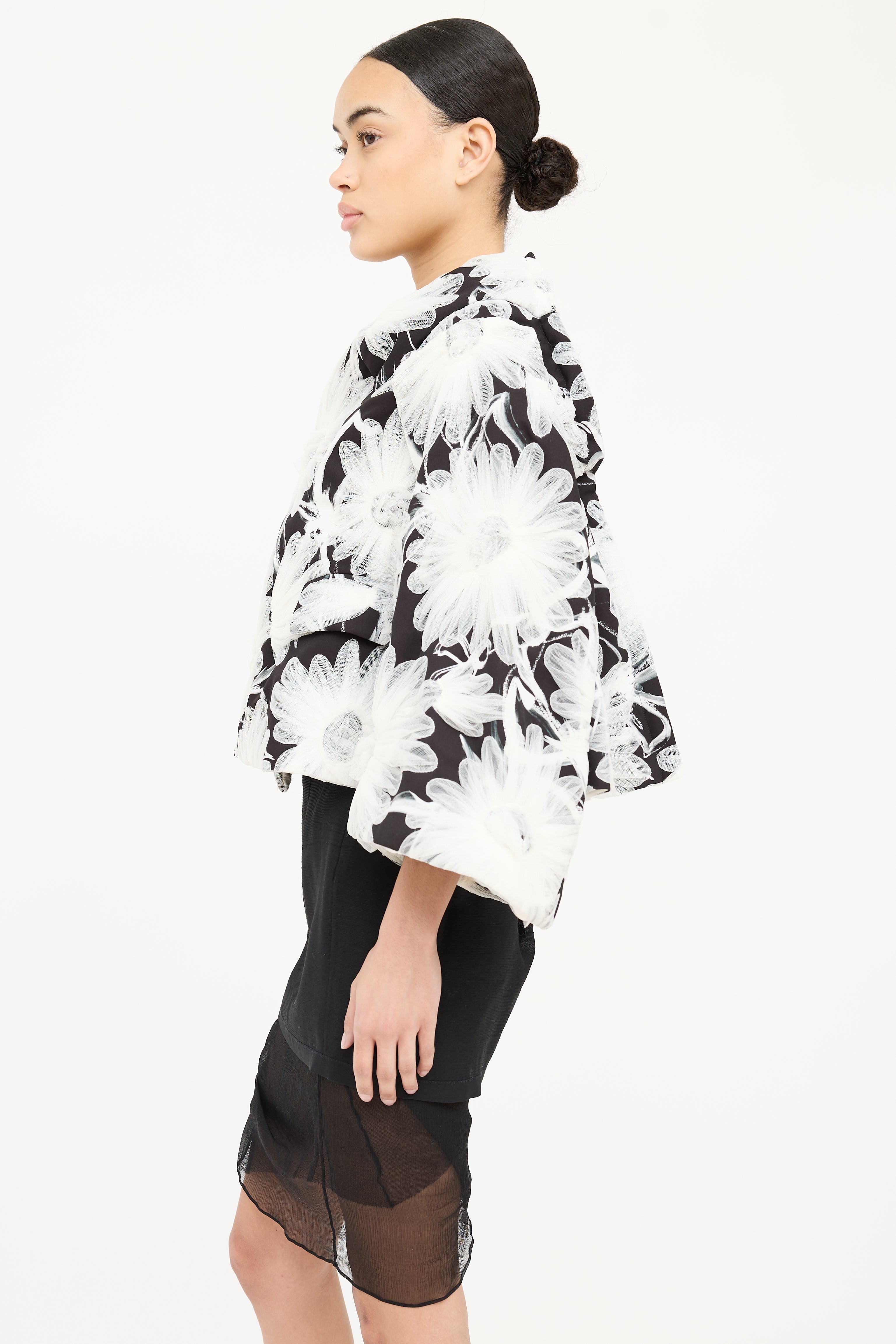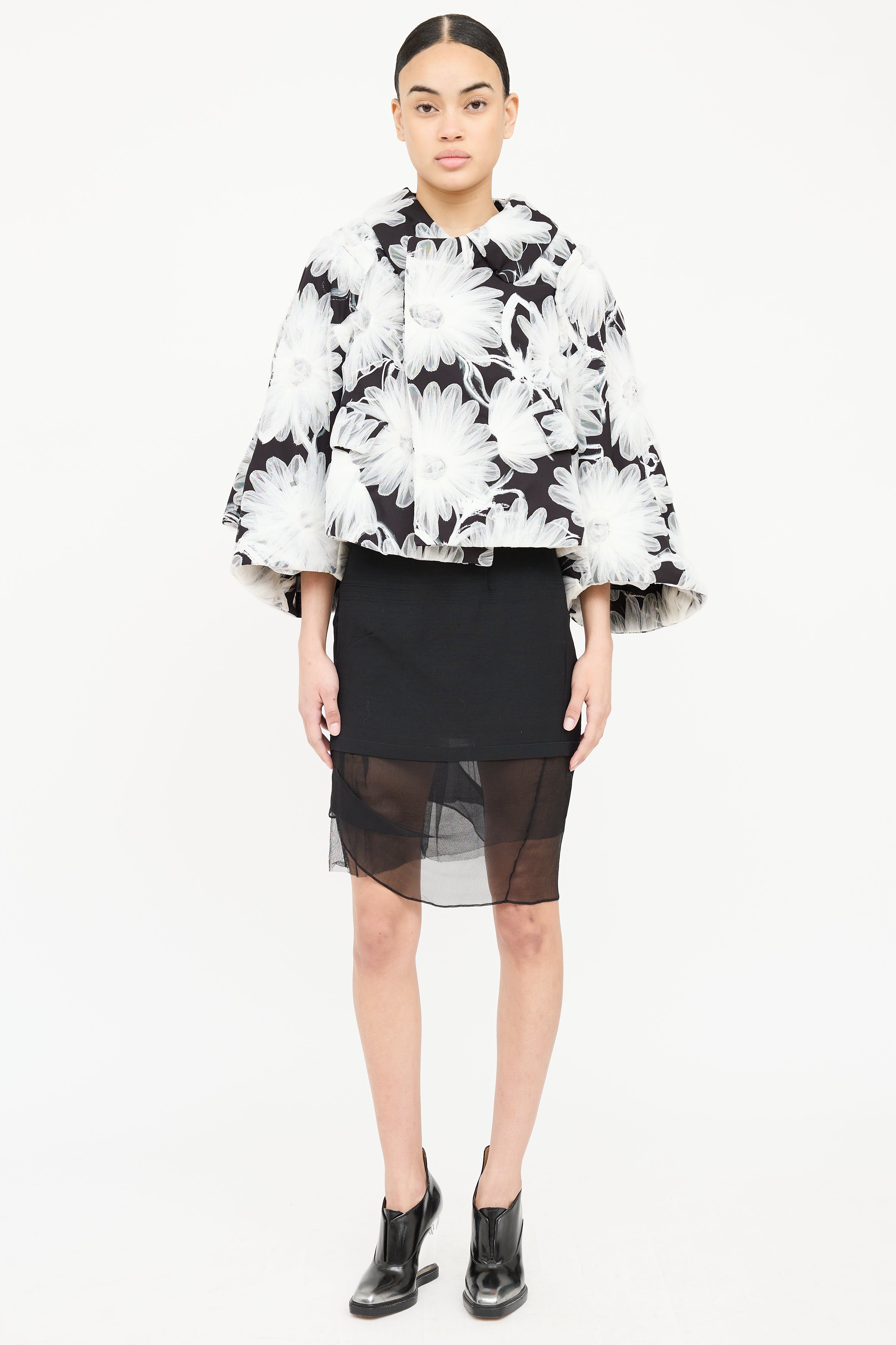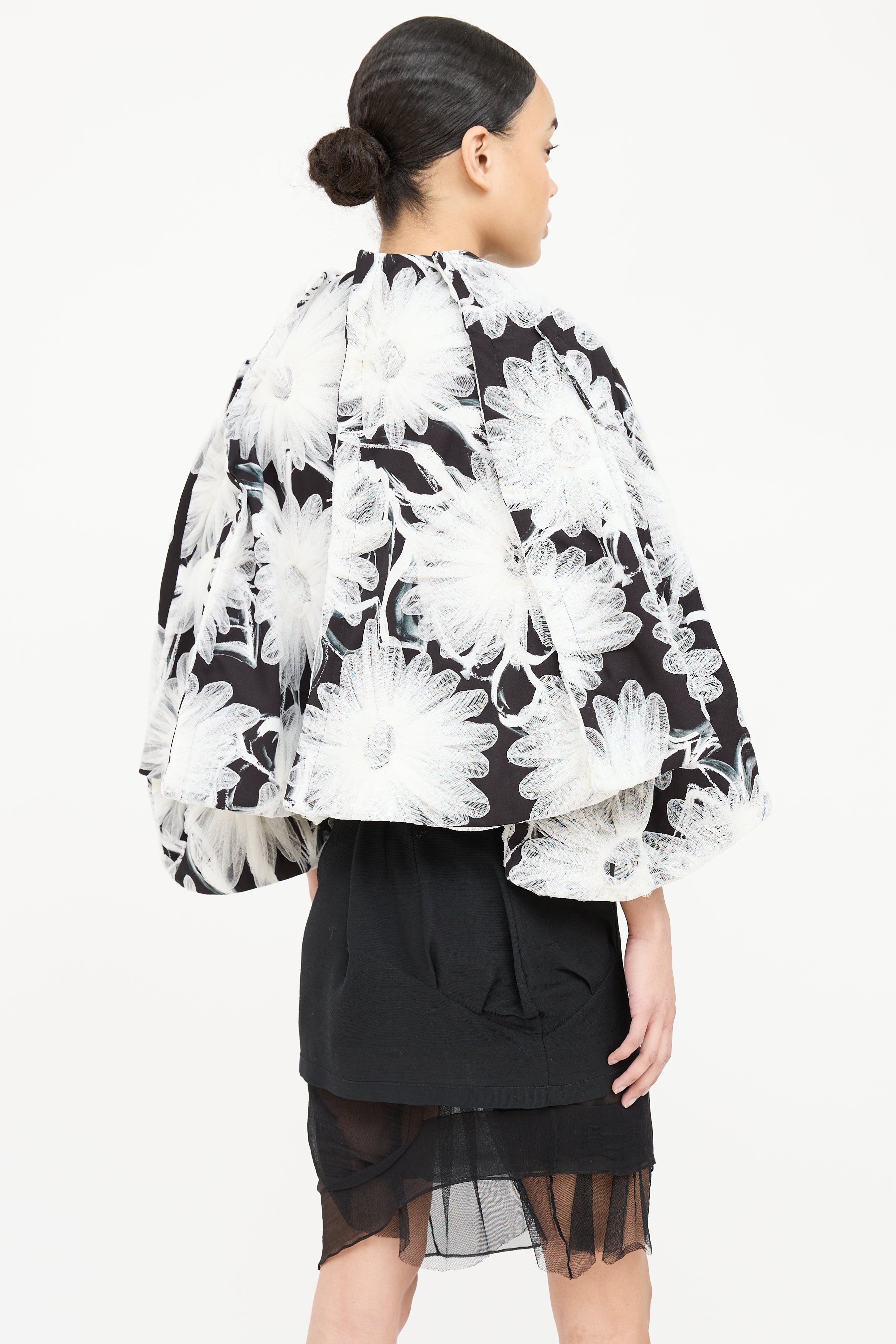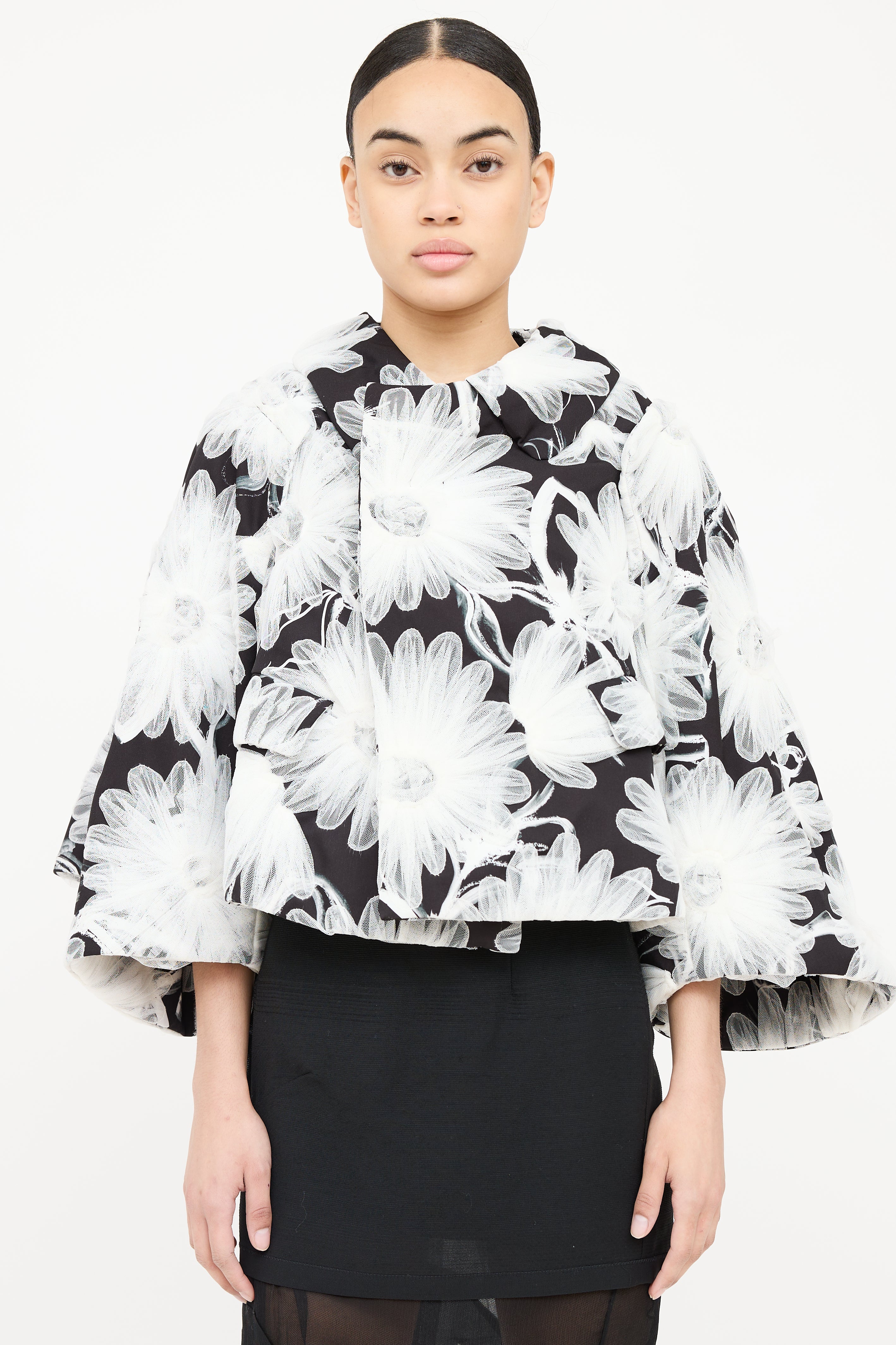 Pre-owned Comme des Garçons AD2021 black and white long sleeve jacket featuring peter pan collar, swing coat styling, concealed clasp closure, wide sleeves, mesh floral detail and crop fit.