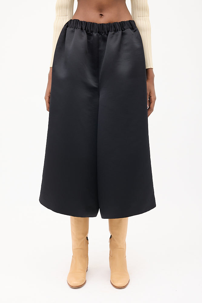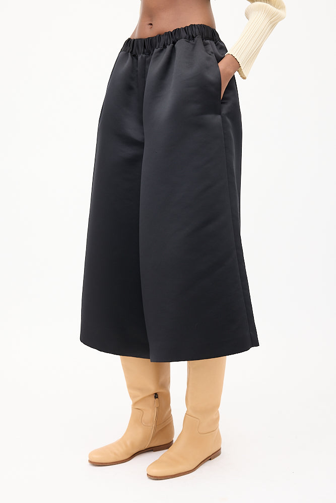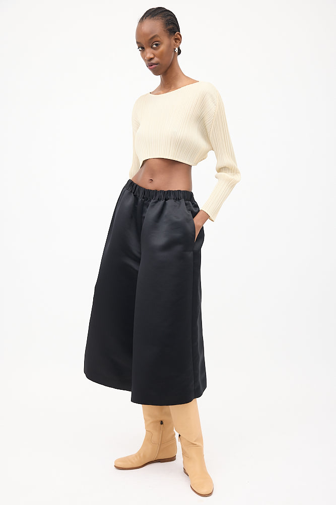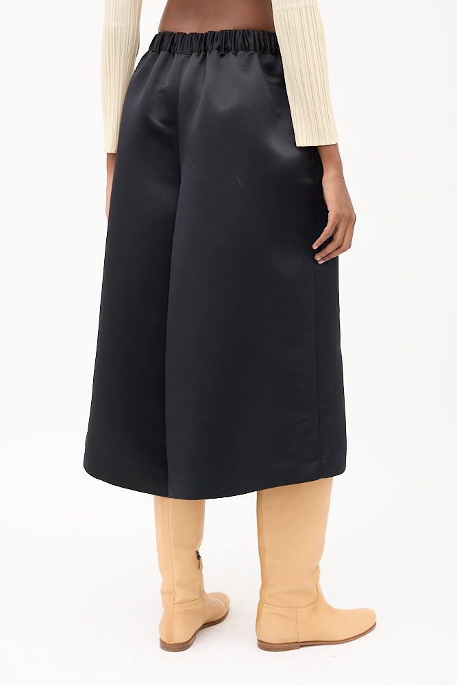 Pre-owned Comme des Garçons Fall/Winter 2022 black satin culotte trousers featuring a high elasticized waist with interior drawstring, pleated dropped seat, cropped wide leg, and in seam pockets.