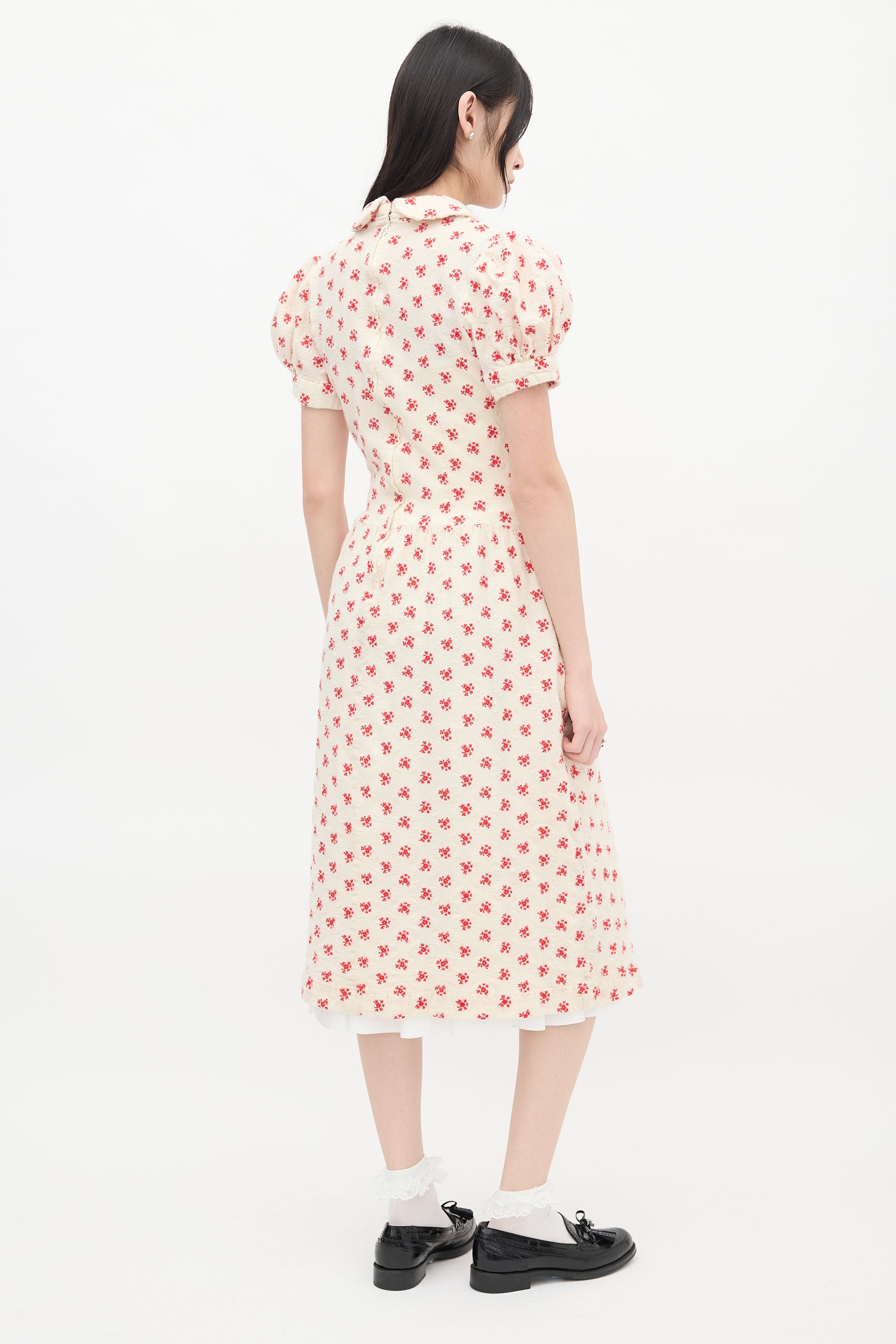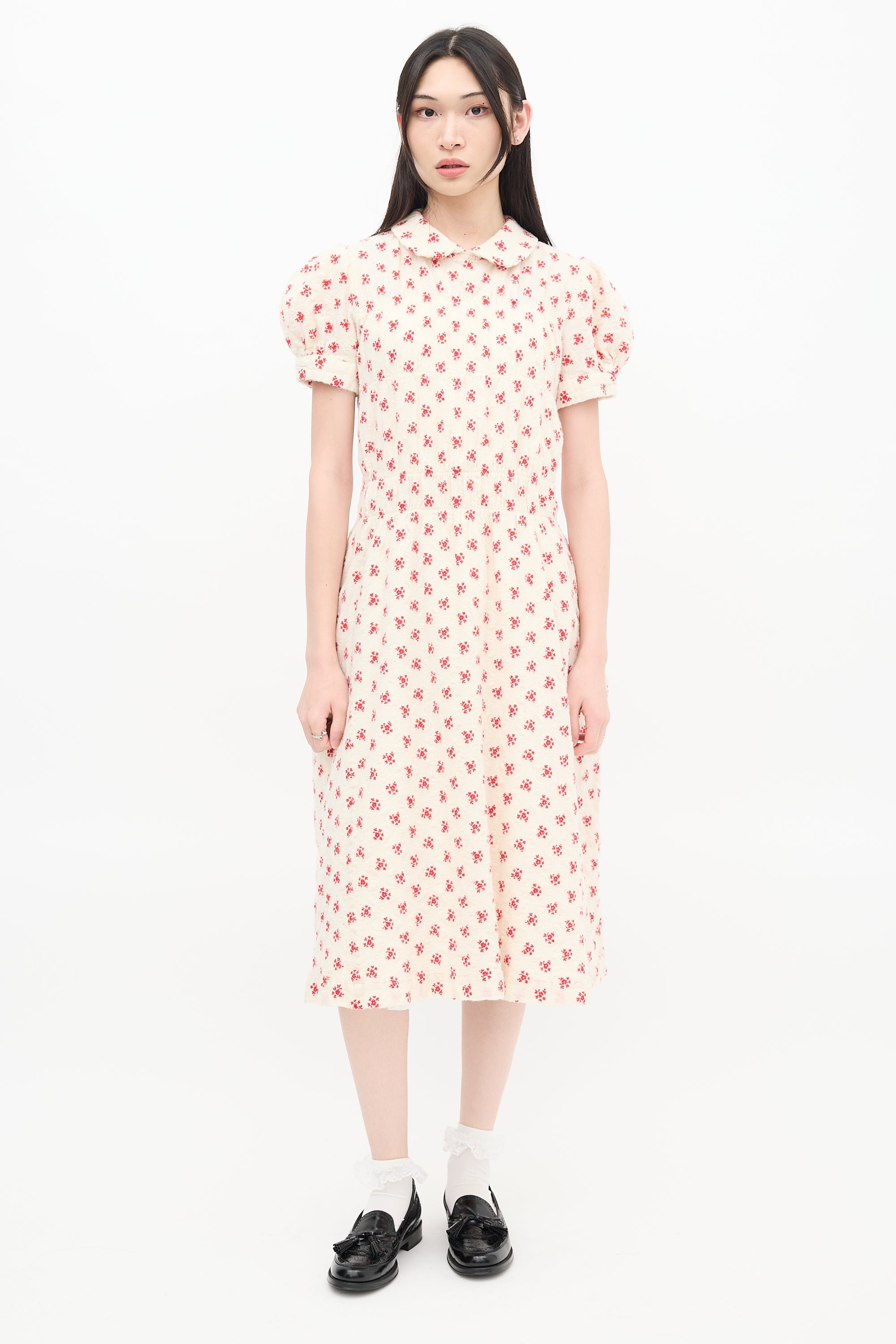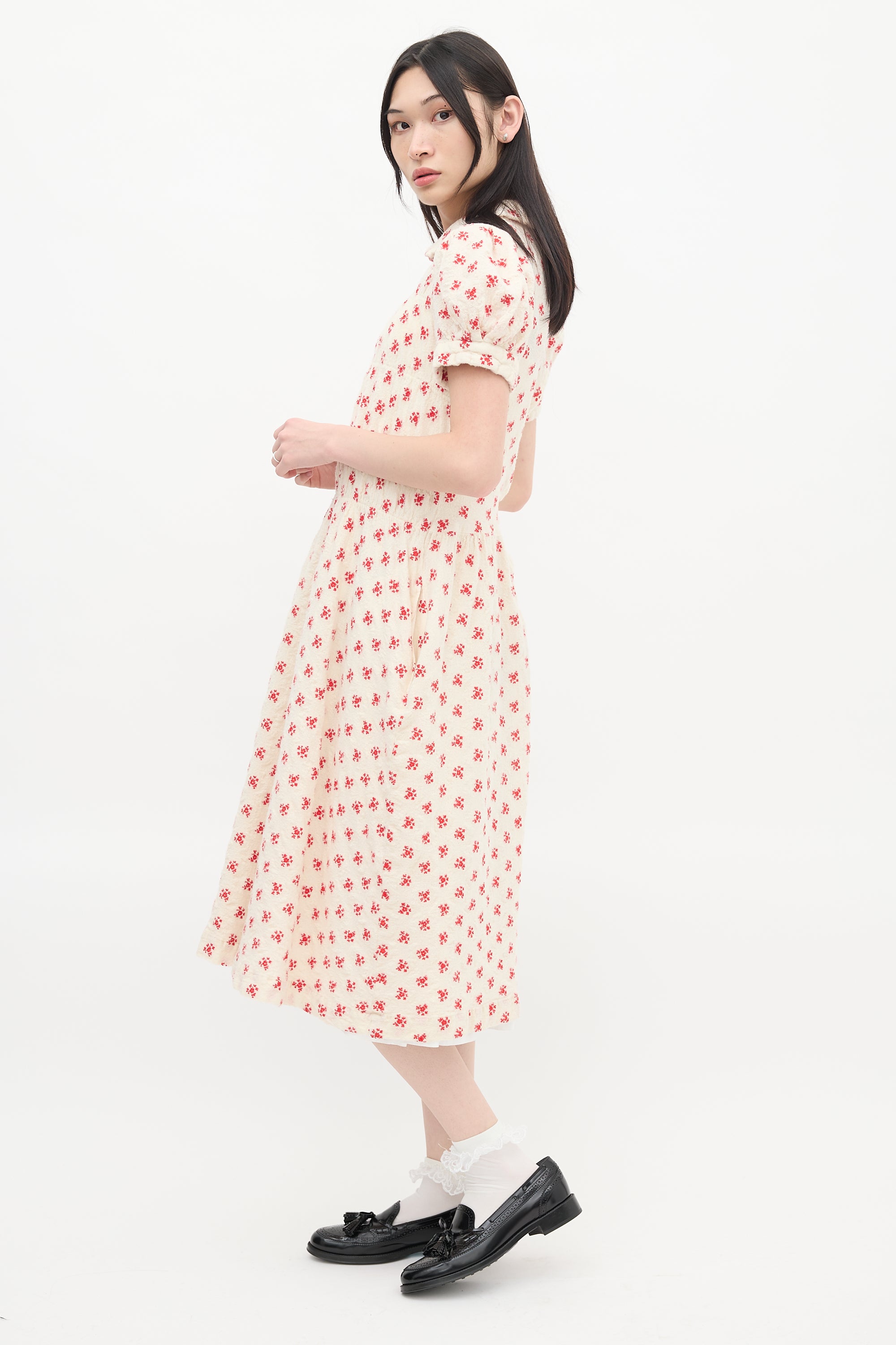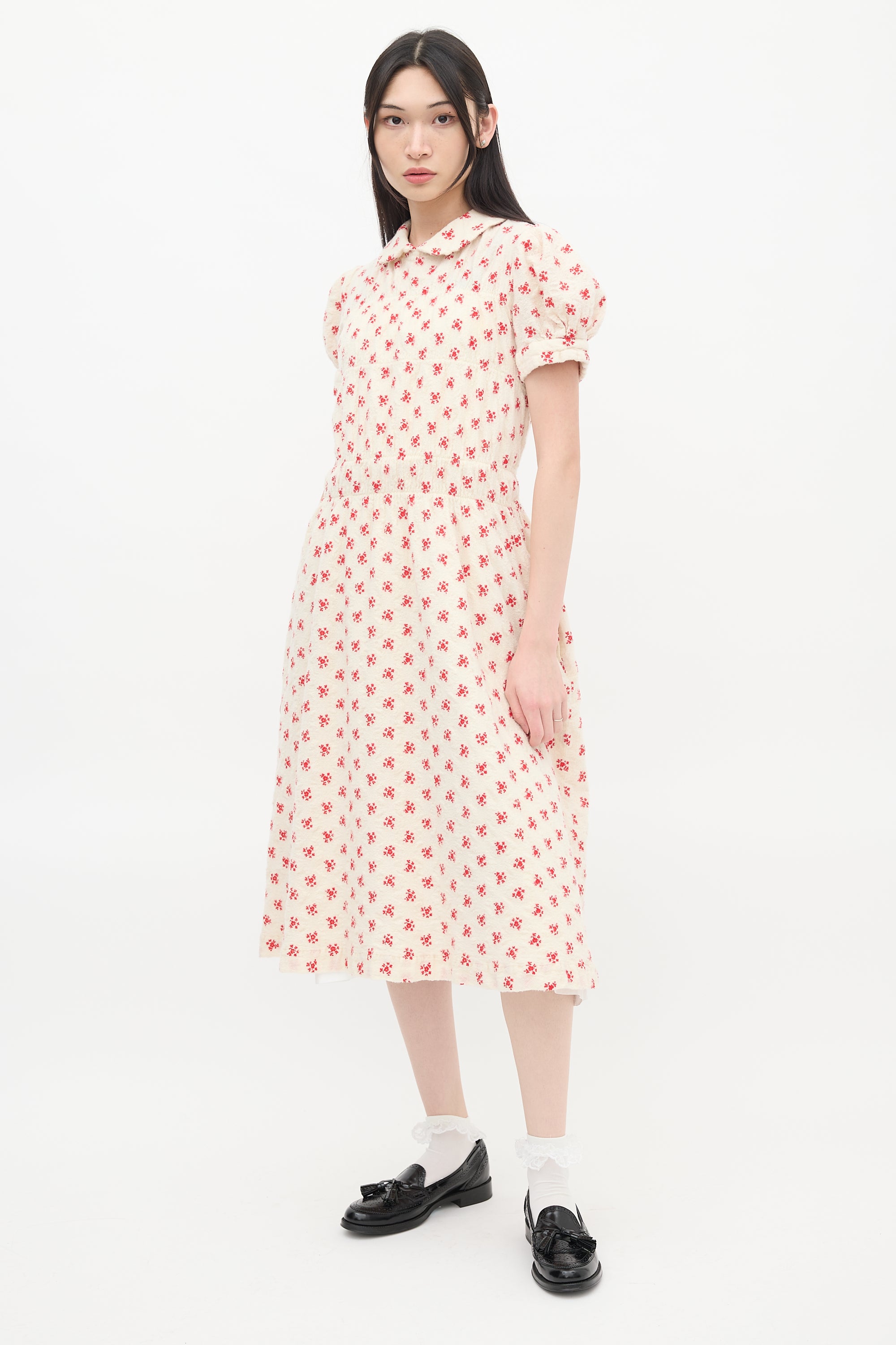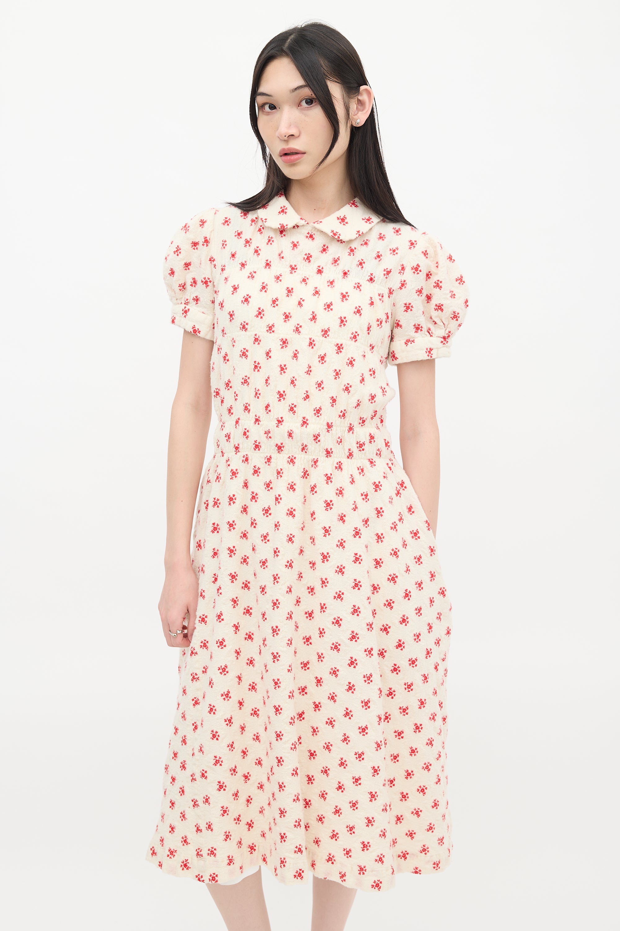 Pre-owned Comme des Garçons Girl cream midi dress featuring a Peter Pan collar, smocking throughout bodice, A-line skirt, in seam pockets, short puff sleeves, concealed back zip, and red floral embroidery throughout.