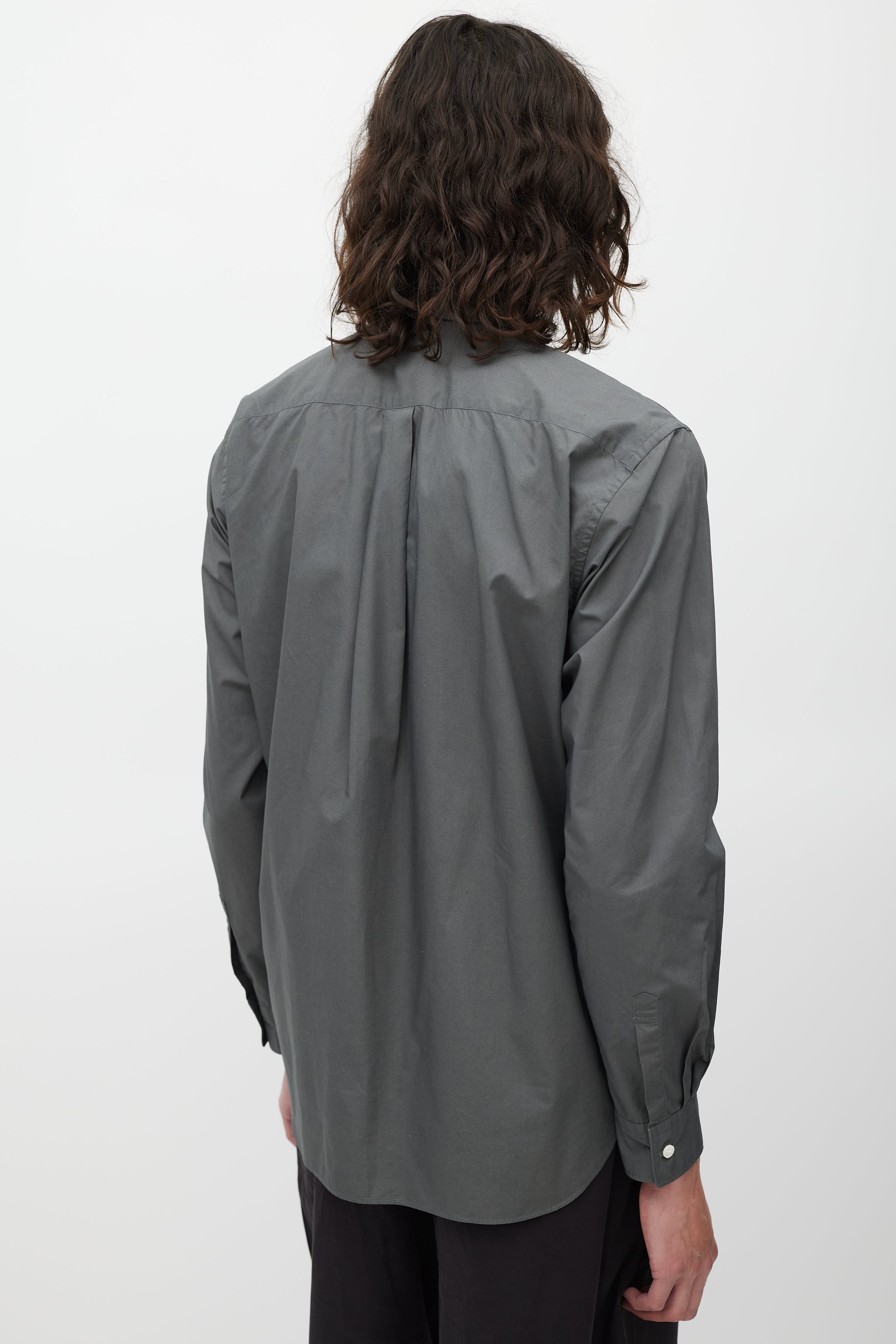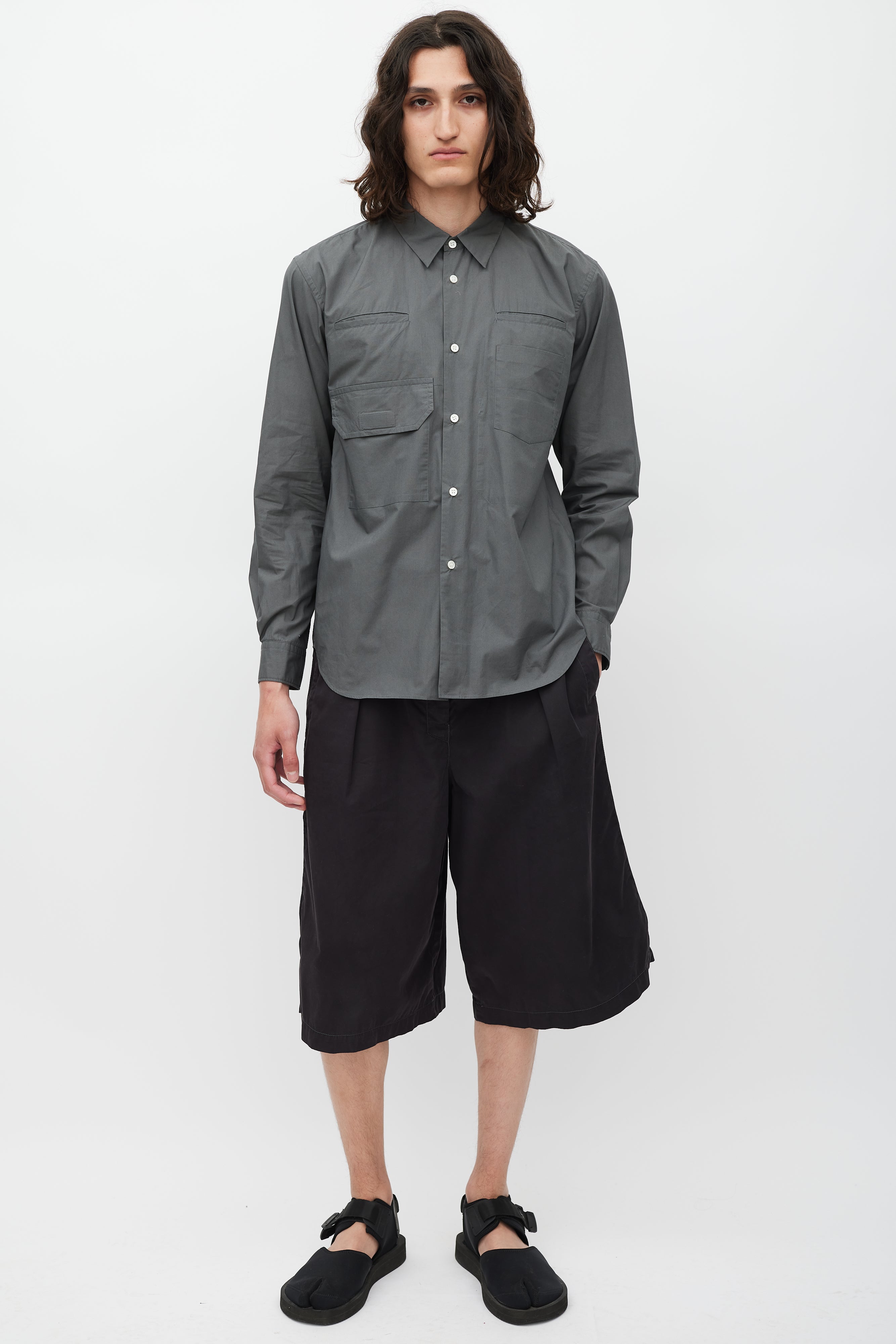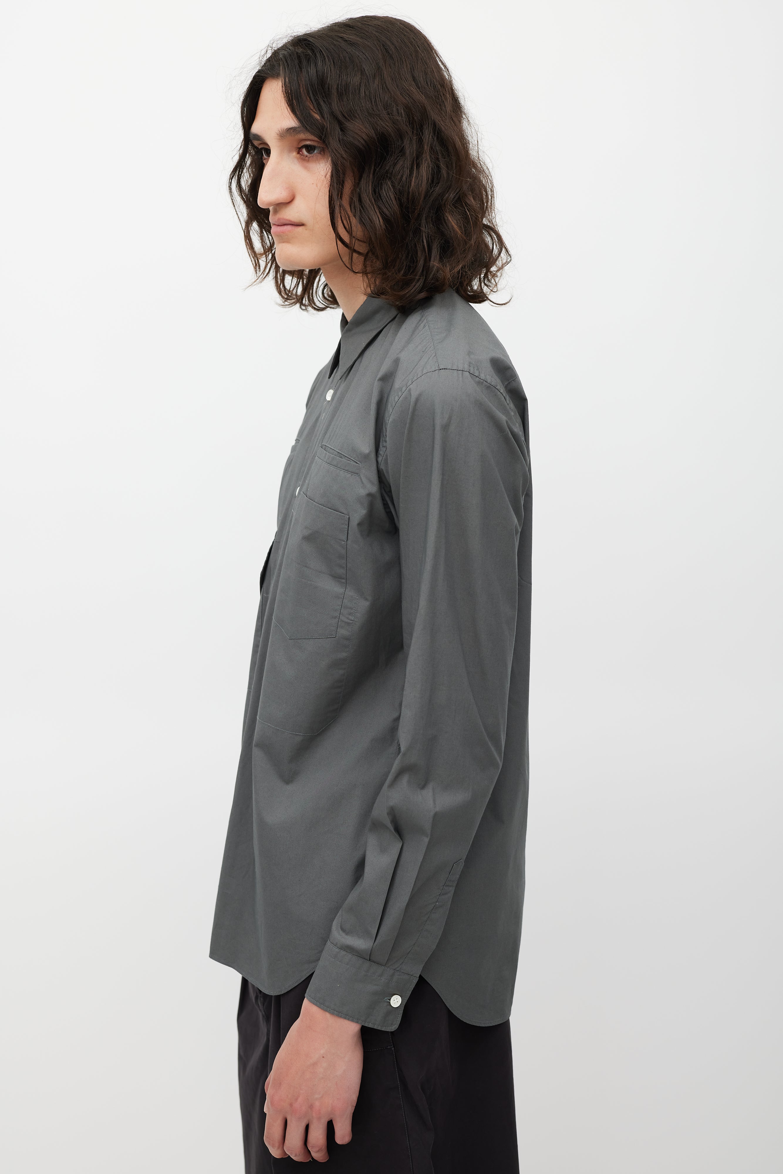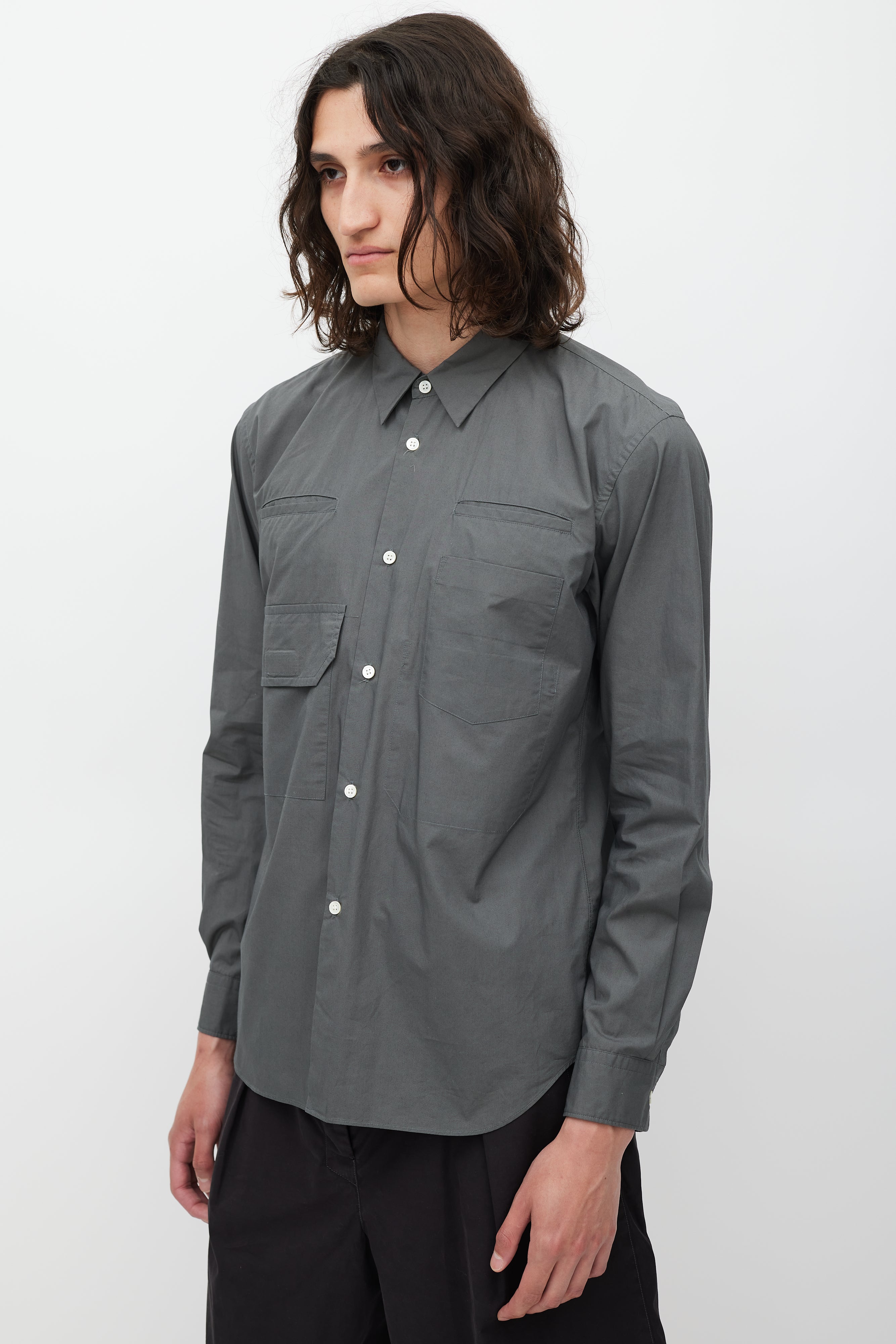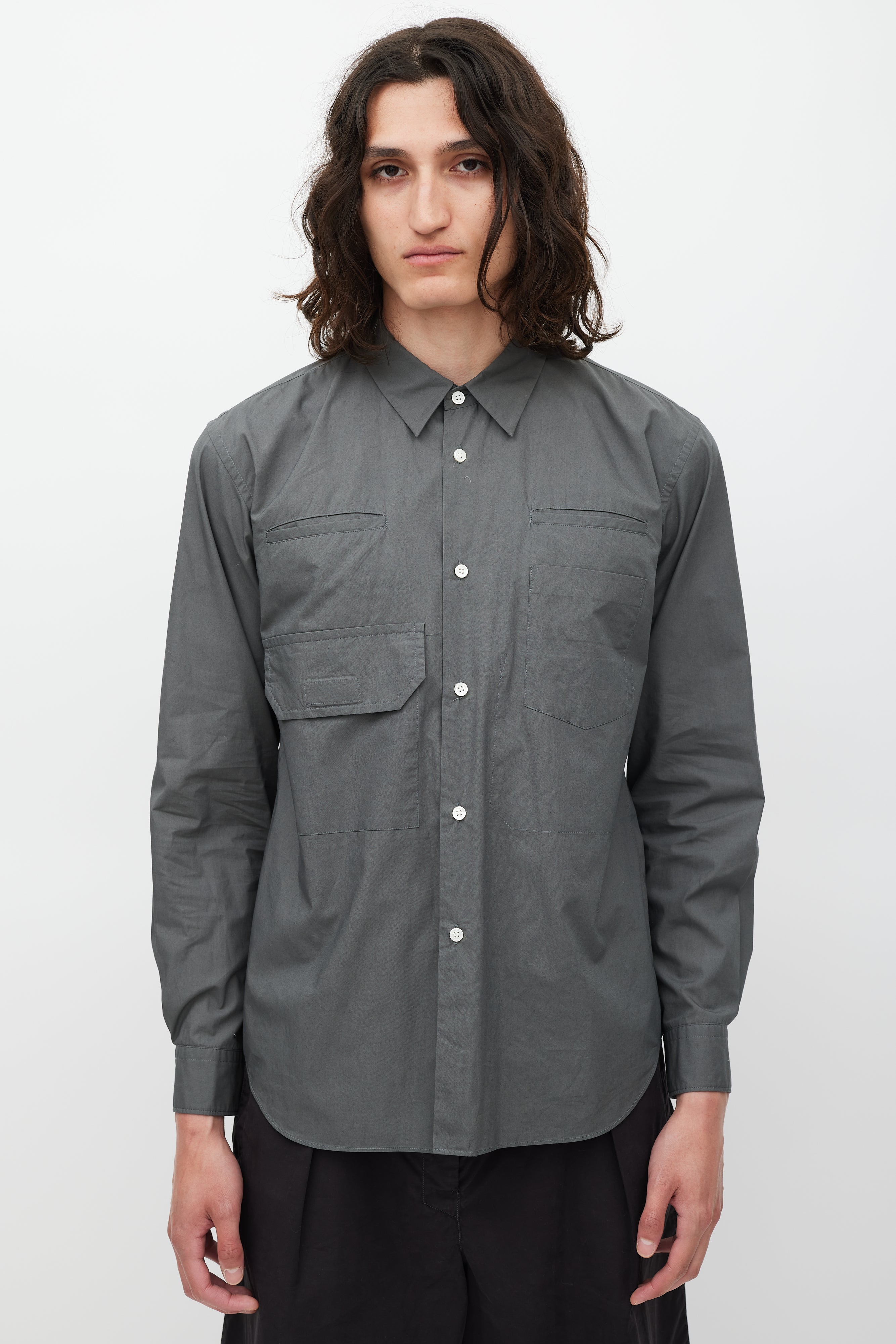 Pre-owned Comme des Garçons HOMME DEUX grey shirt featuring a pointed collar, long sleeves with buttoned cuffs, two welt pockets and two patch pockets at chest, and button up closure.