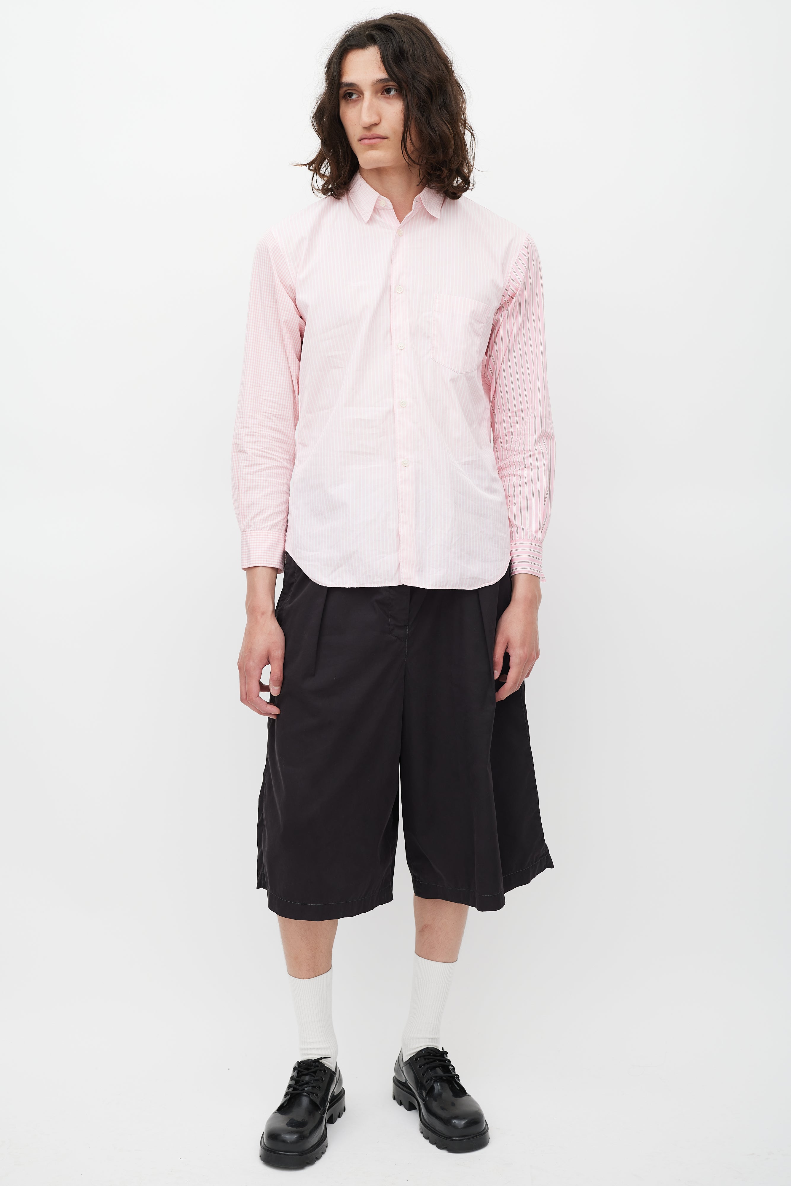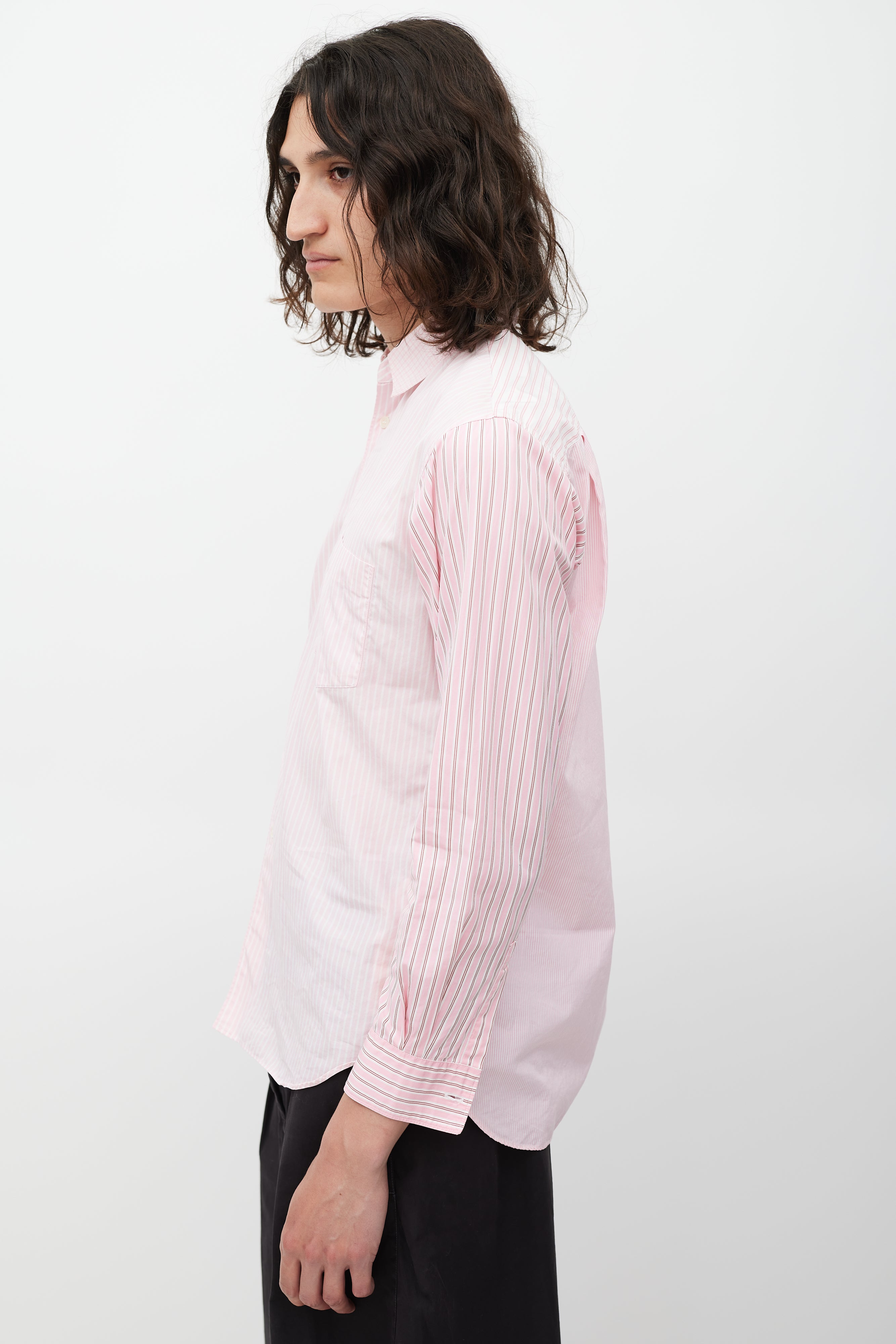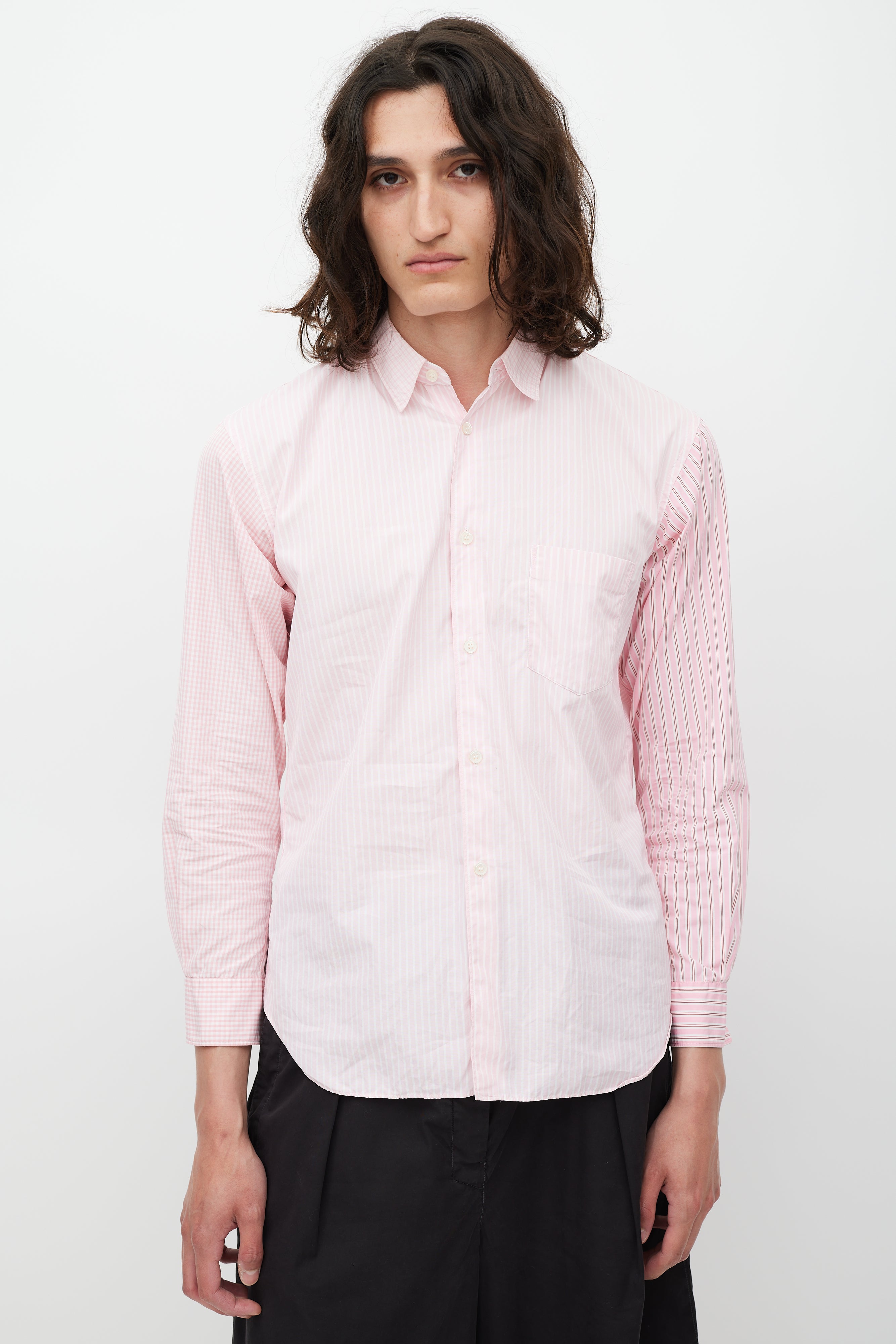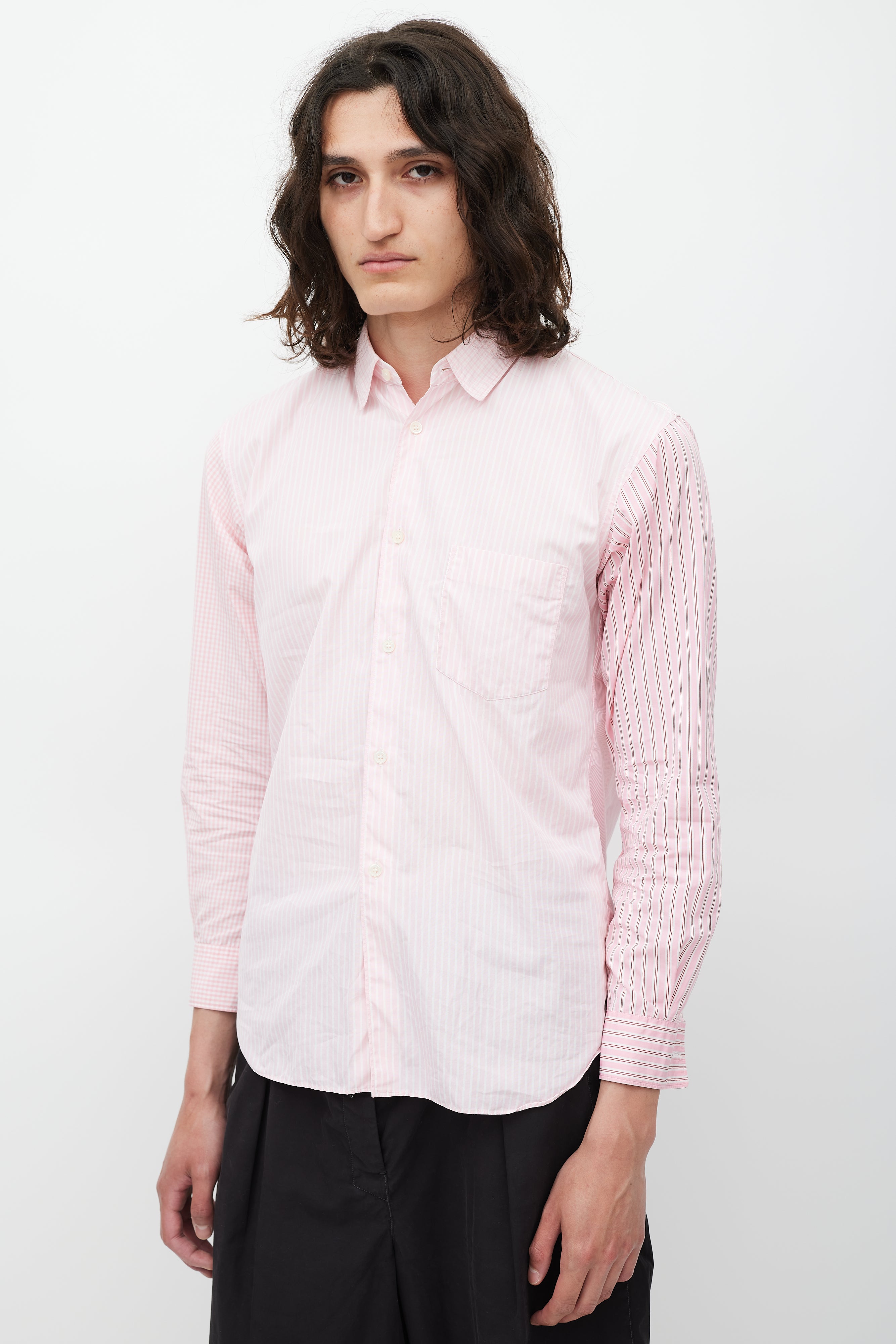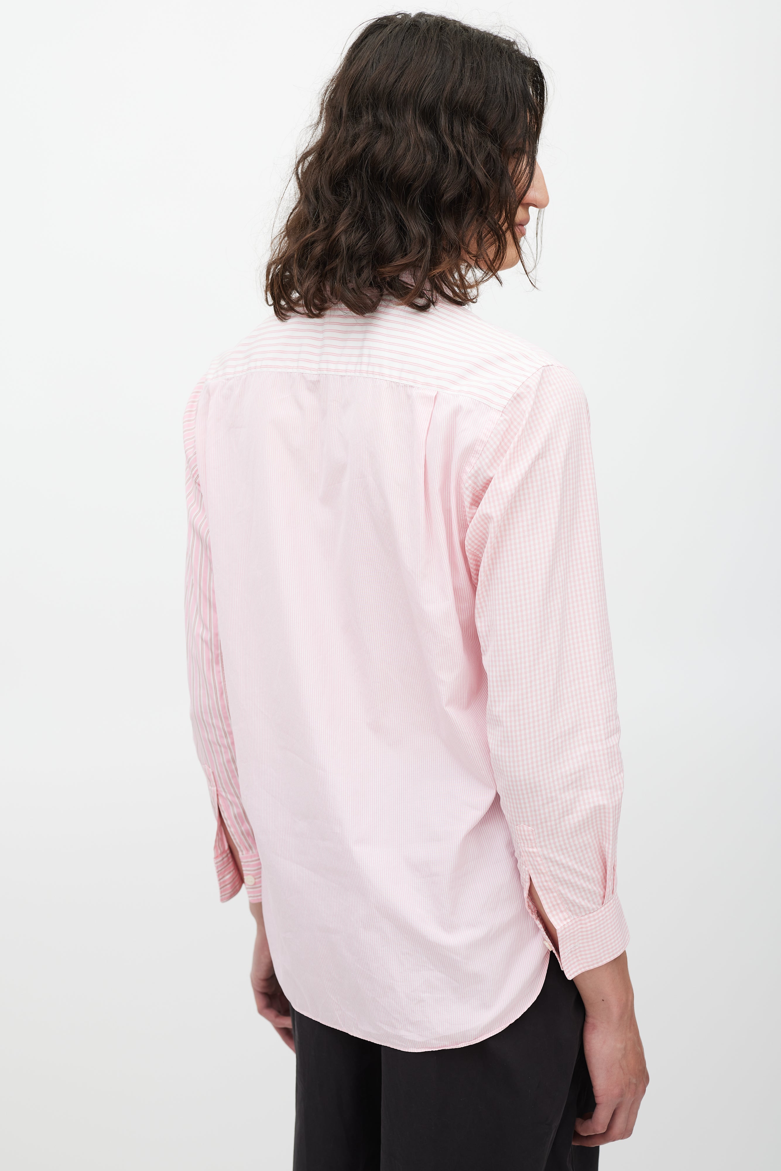 Pre-owned Comme des Garçons SHIRT pink shirt featuring a white striped gingham pattern throughout, pointed collar, long sleeves with buttoned cuffs, contrast panel at back, one patch pocket at chest, and button up closure.