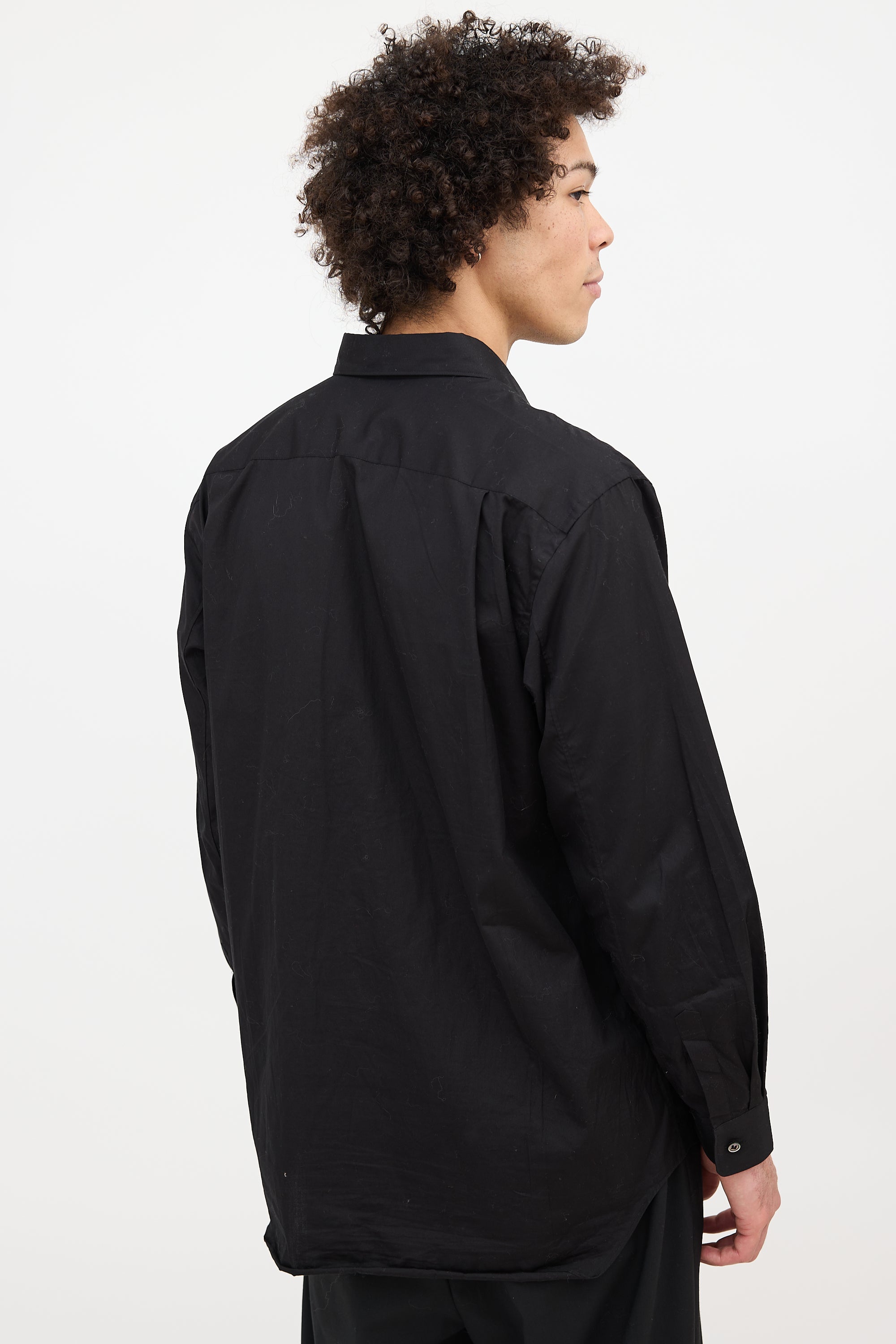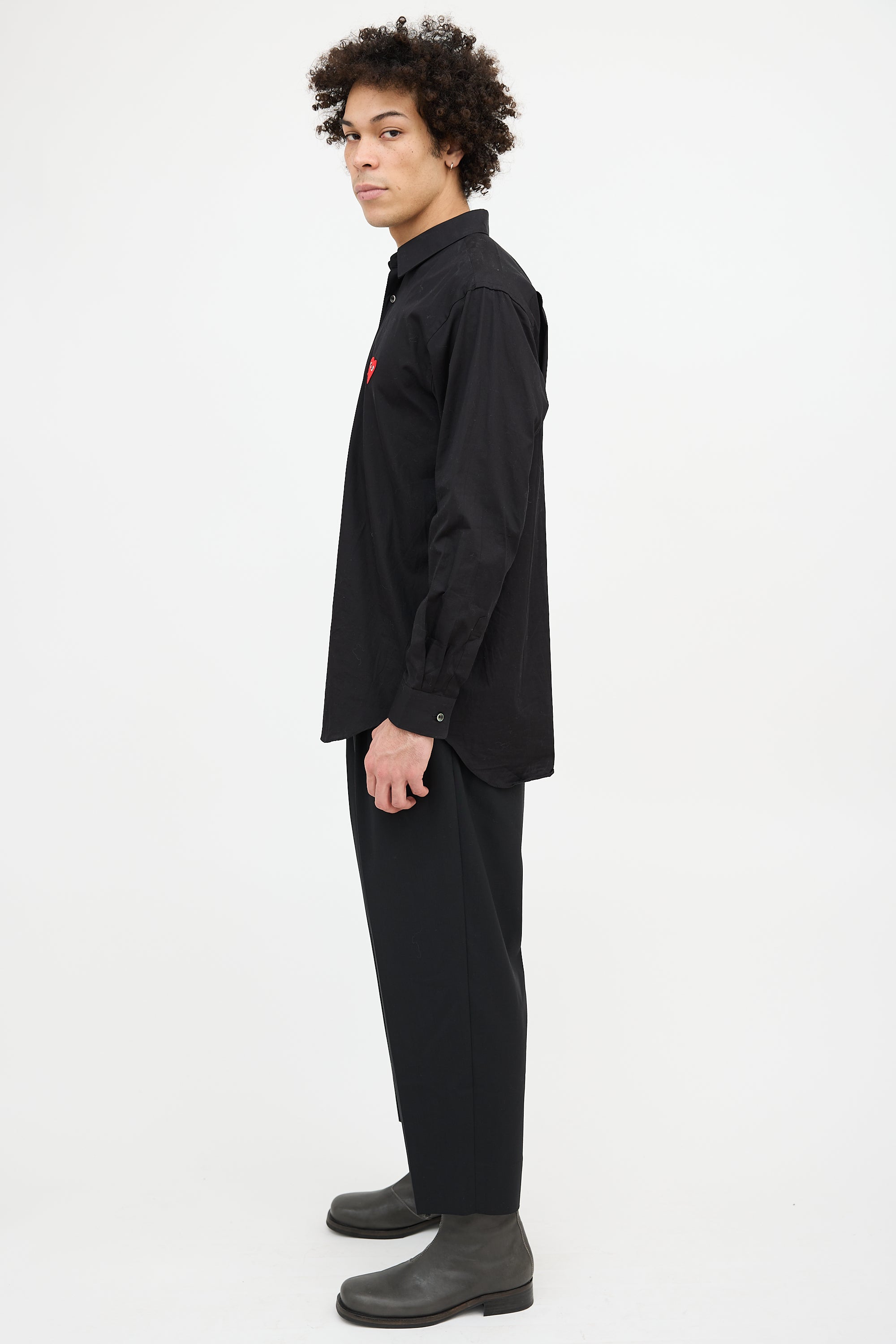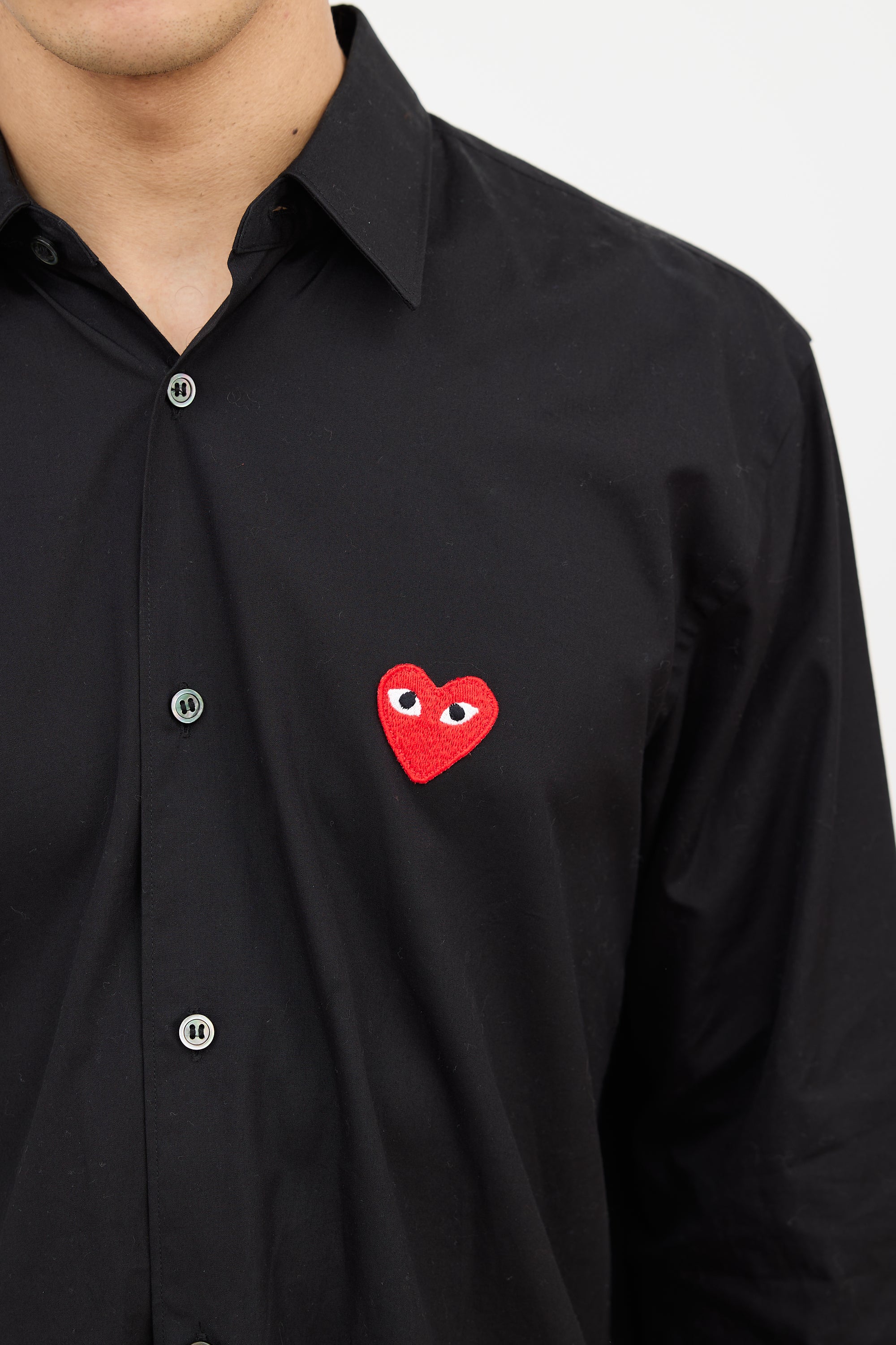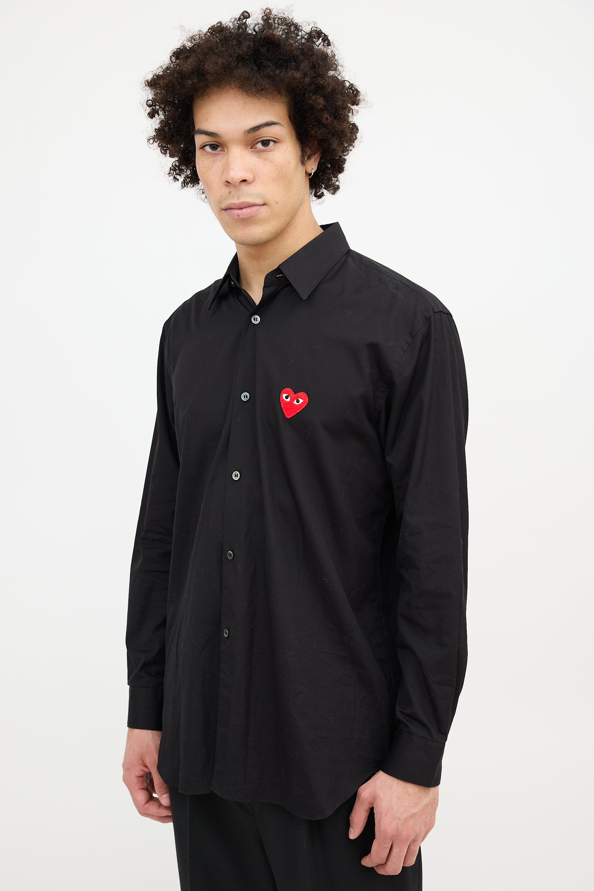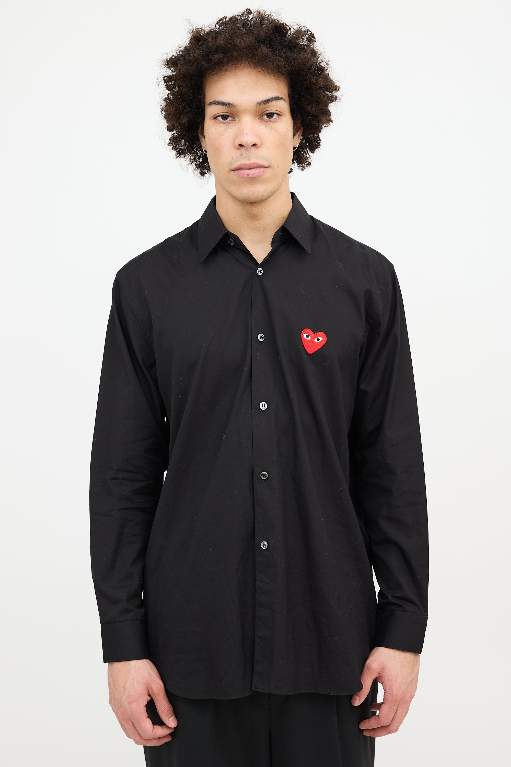 Pre-owned Comme des Garçons PLAY black shirt featuring a point collar, button up front, signature red heart logo patch at left chest, and buttoned cuffs.