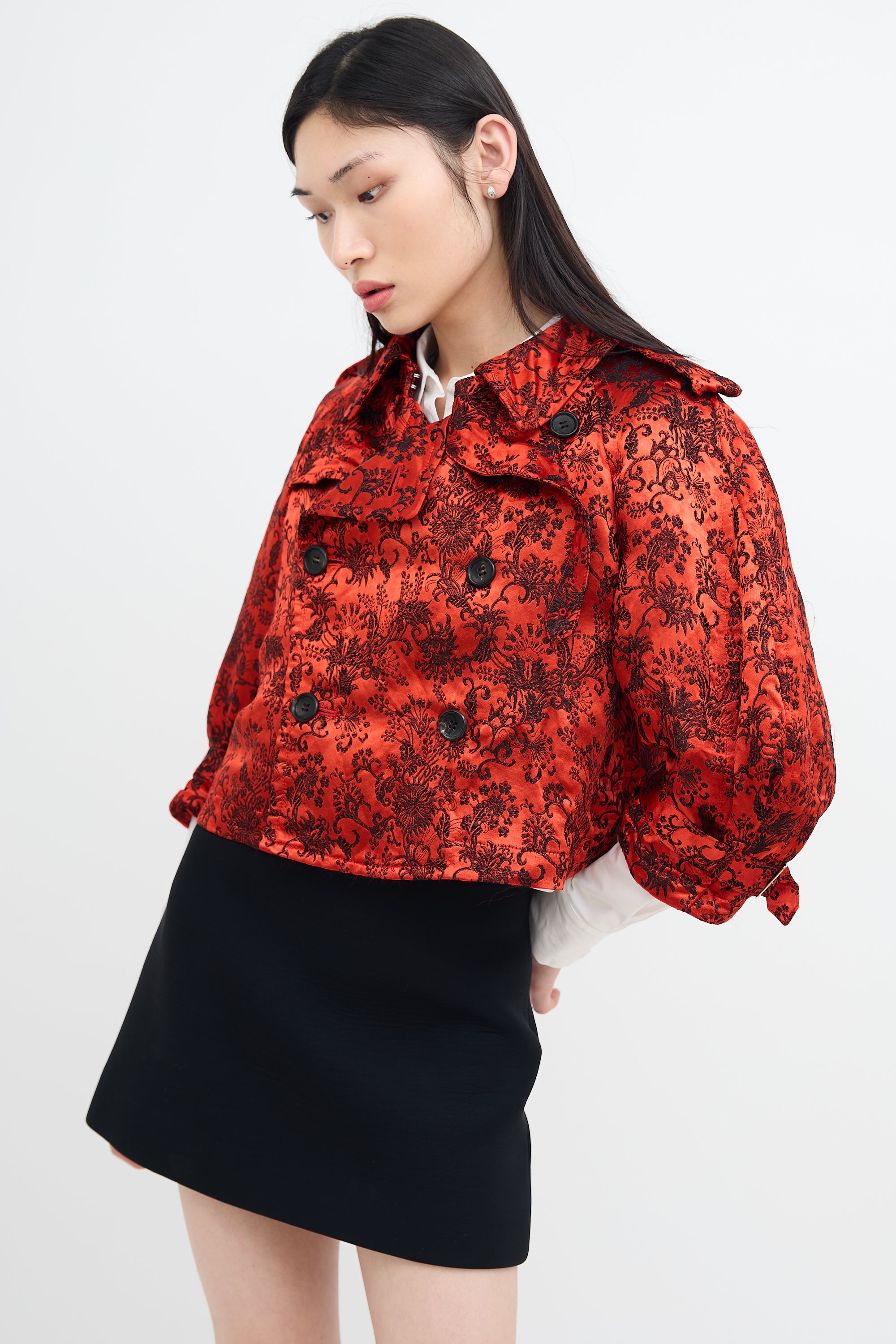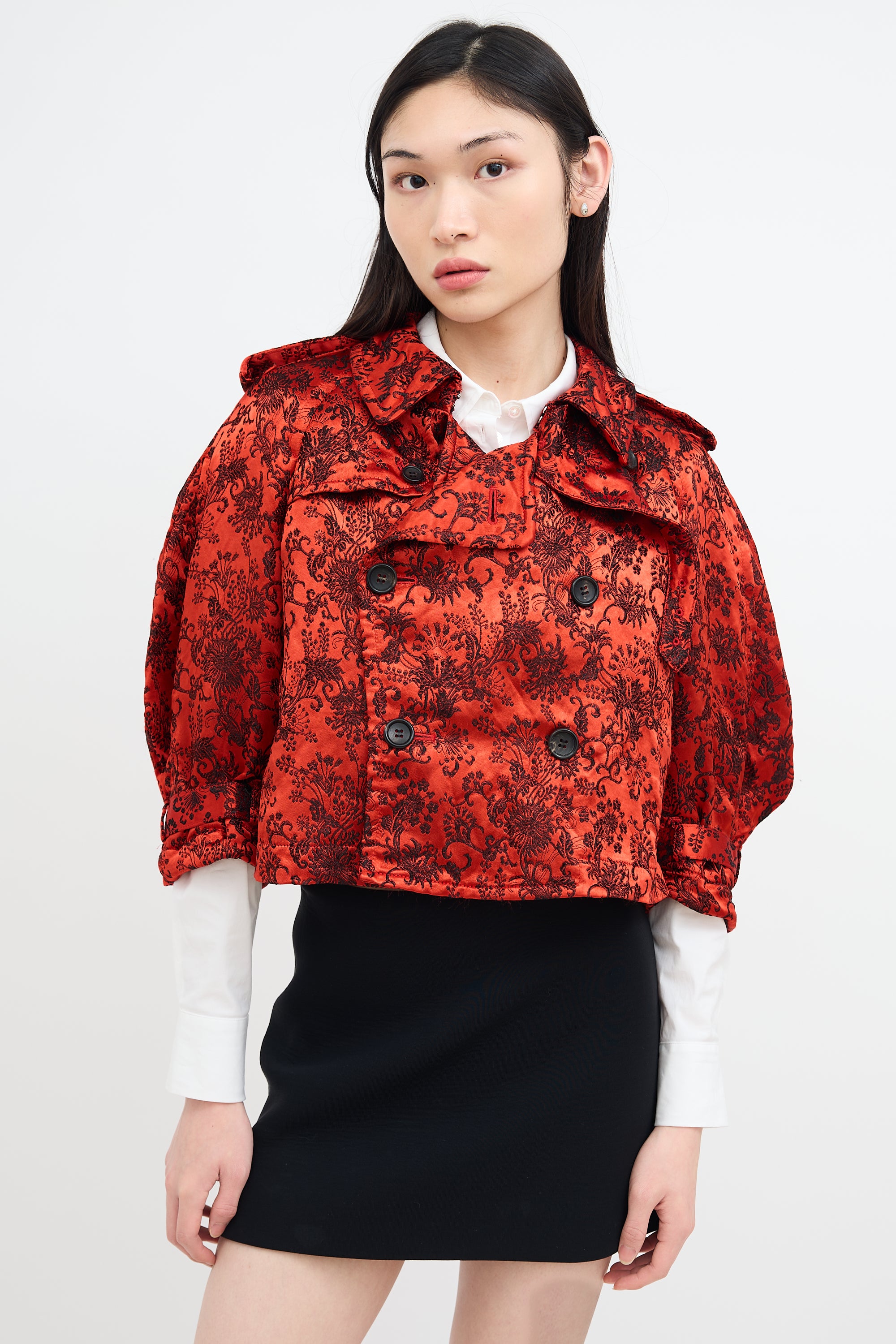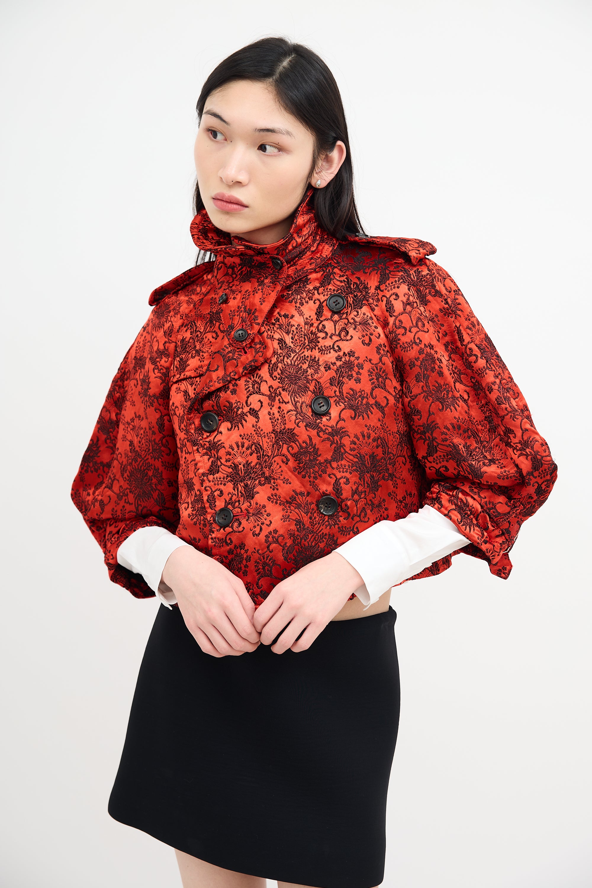 Pre-owned Comme des Garçons red and black satin jacquard cropped jacket featuring convertible collar with buttoned strap, black embroidery throughout, shoulder epaulets, storm flap at left chest and storm shield at back, quarter length sleeves with buckled cuffs, double breasted button up front, and one interior welt pocket. Lined.