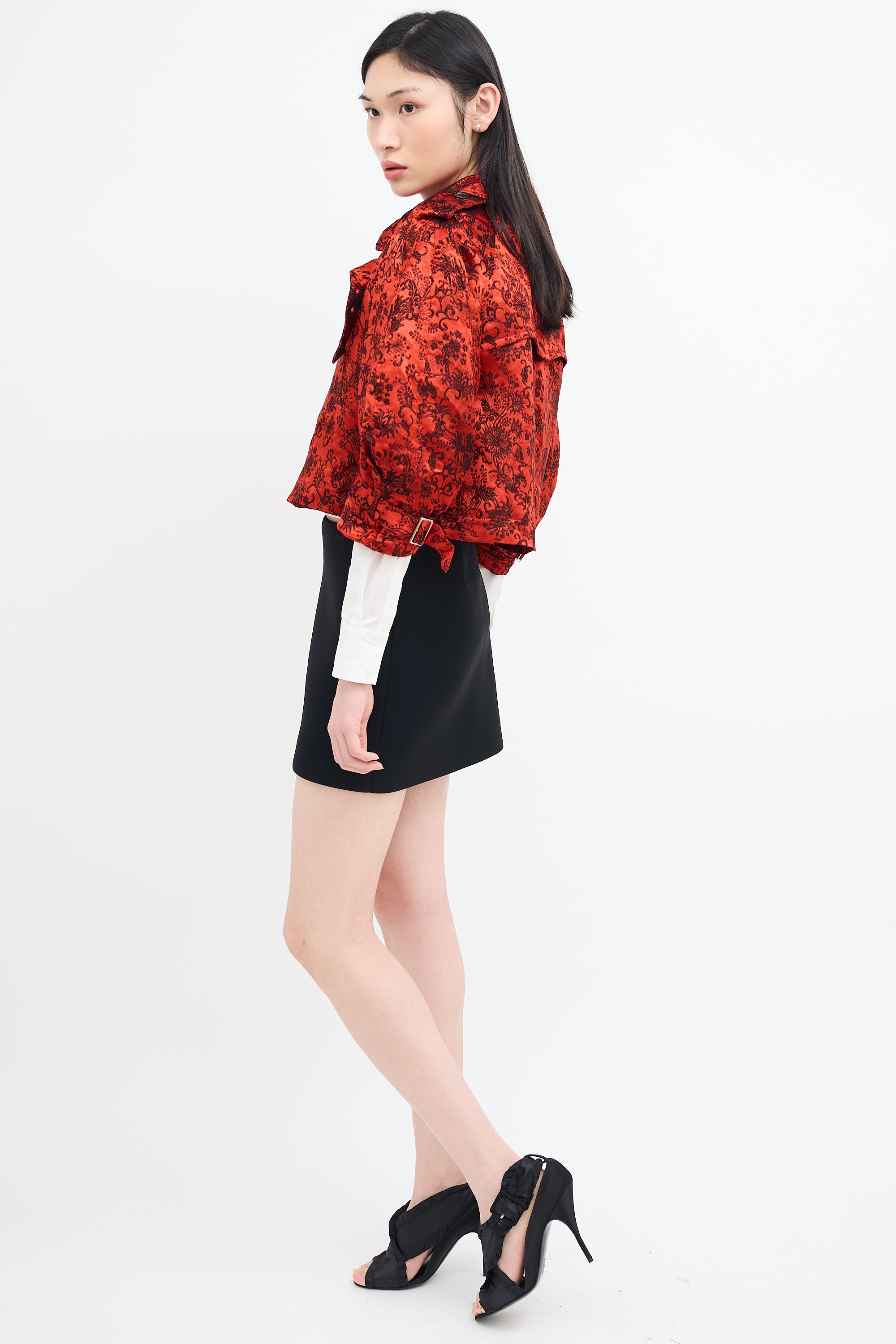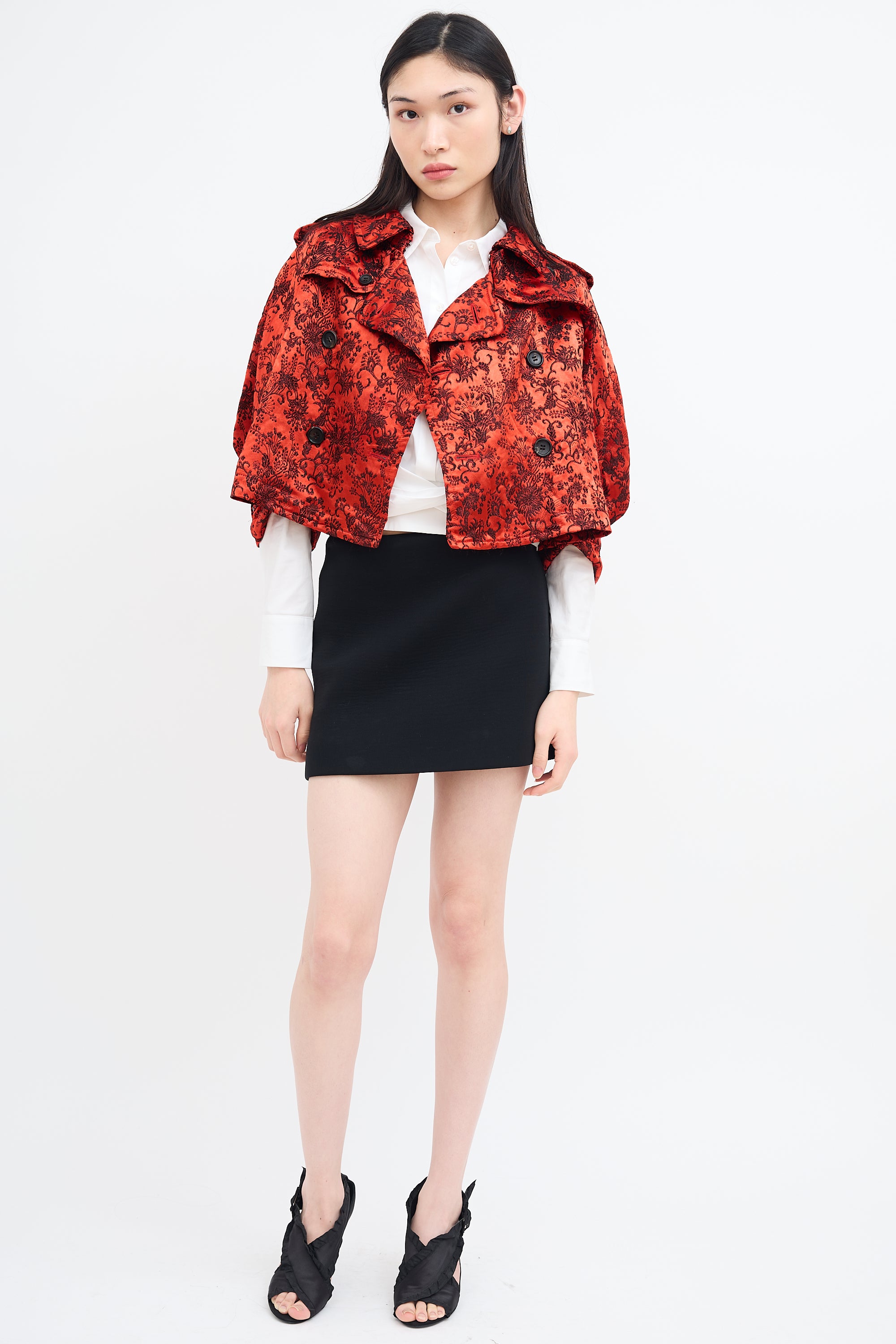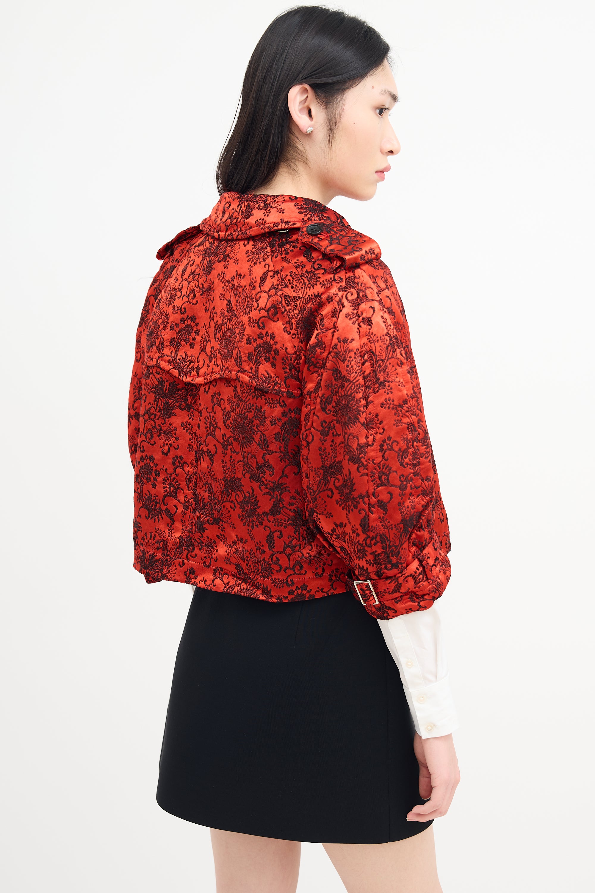 Pre-owned Comme des Garçons red and black satin jacquard cropped jacket featuring convertible collar with buttoned strap, black embroidery throughout, shoulder epaulets, storm flap at left chest and storm shield at back, quarter length sleeves with buckled cuffs, double breasted button up front, and one interior welt pocket. Lined.