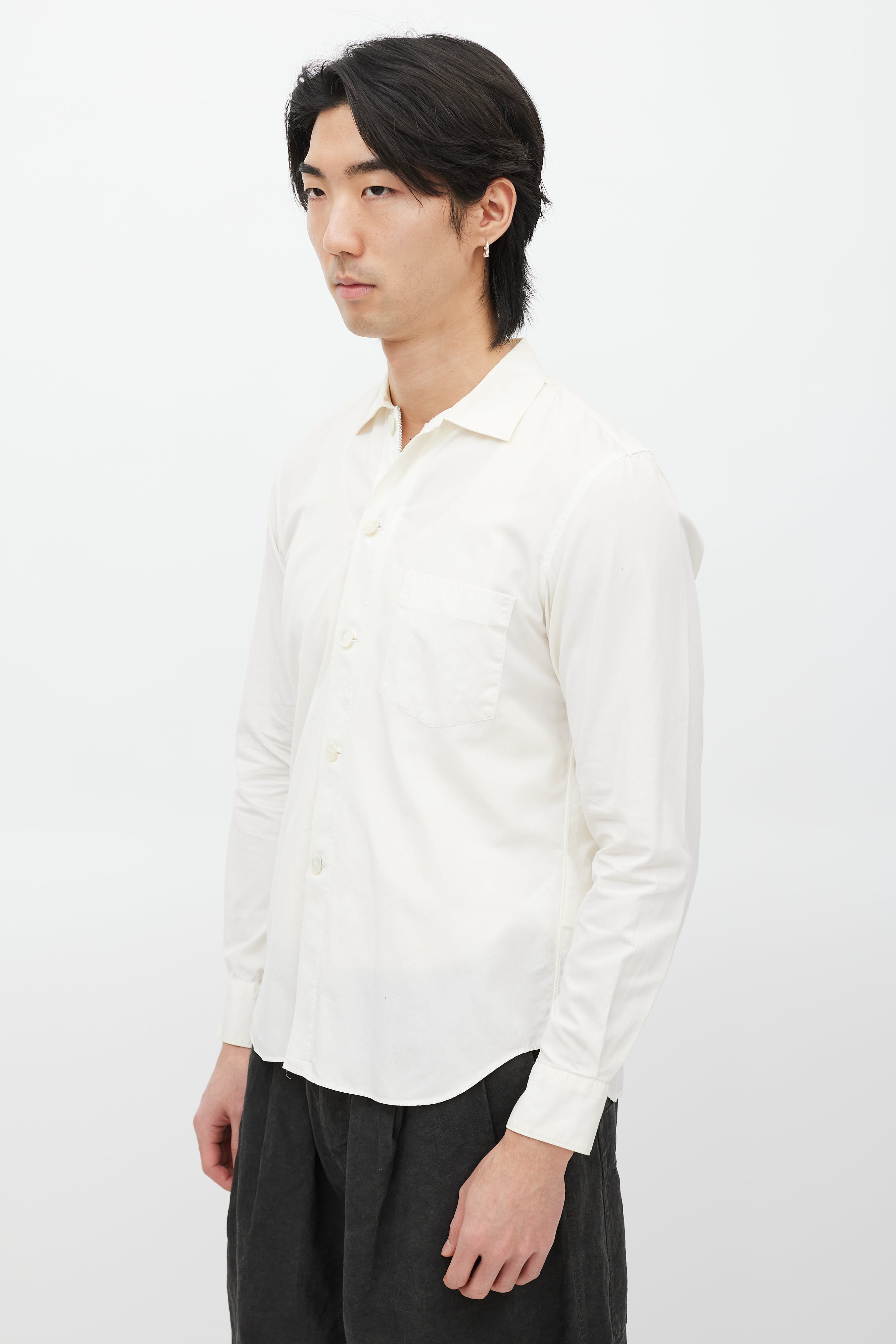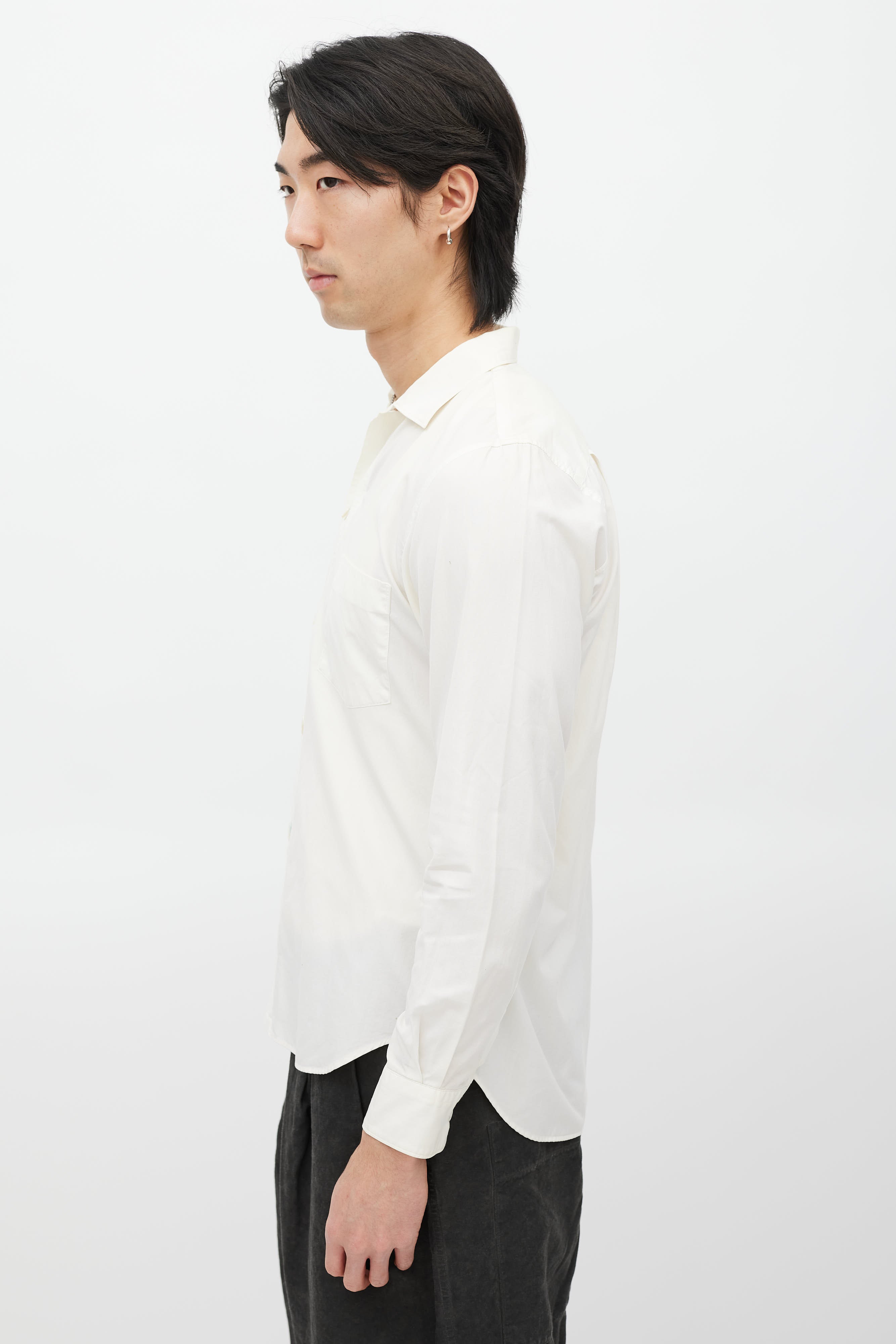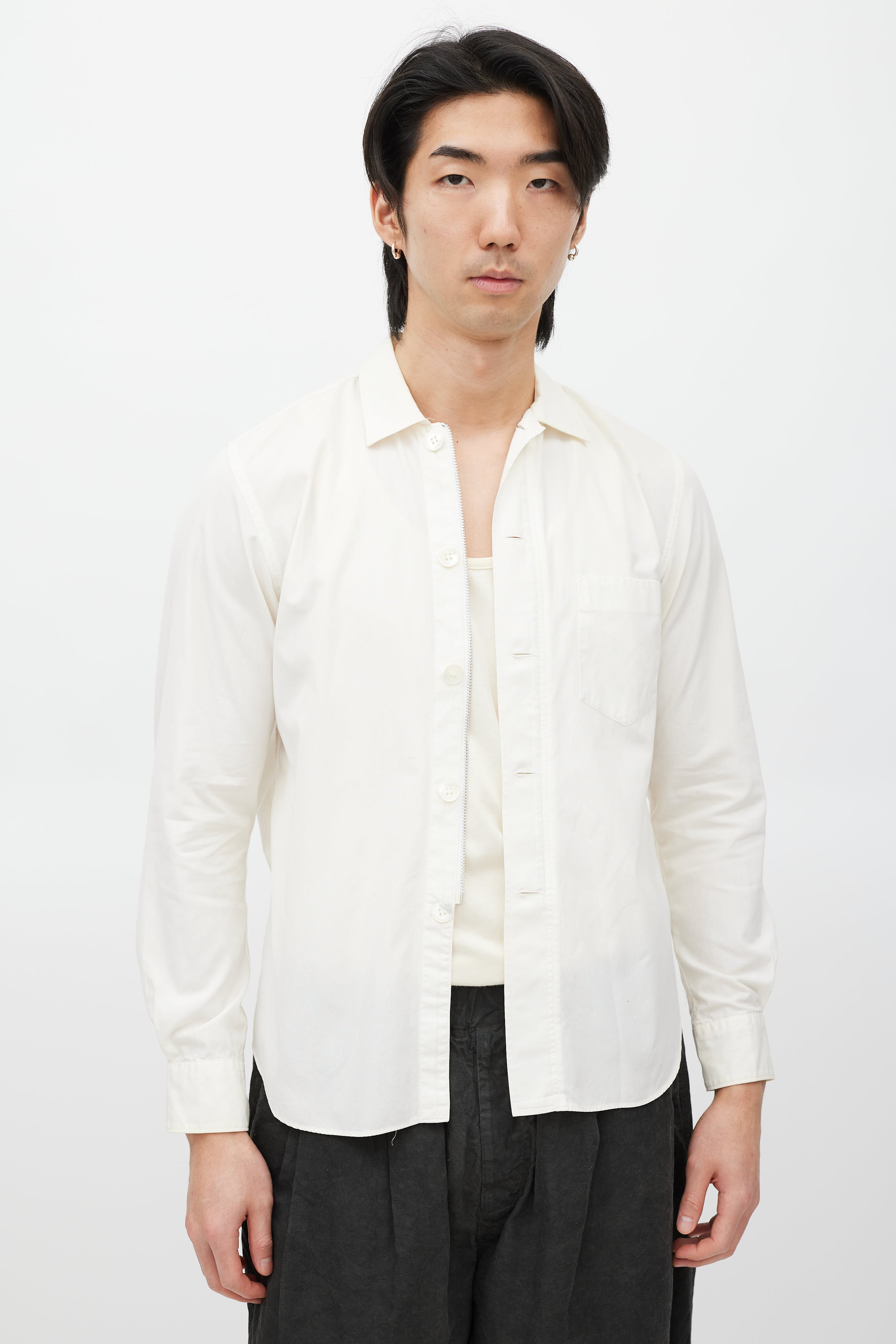 Pre-owned Comme des Garçons white jacket featuring a pointed collar, long sleeves with buttoned cuffs, one patch pocket at chest, and zip front with button closure.