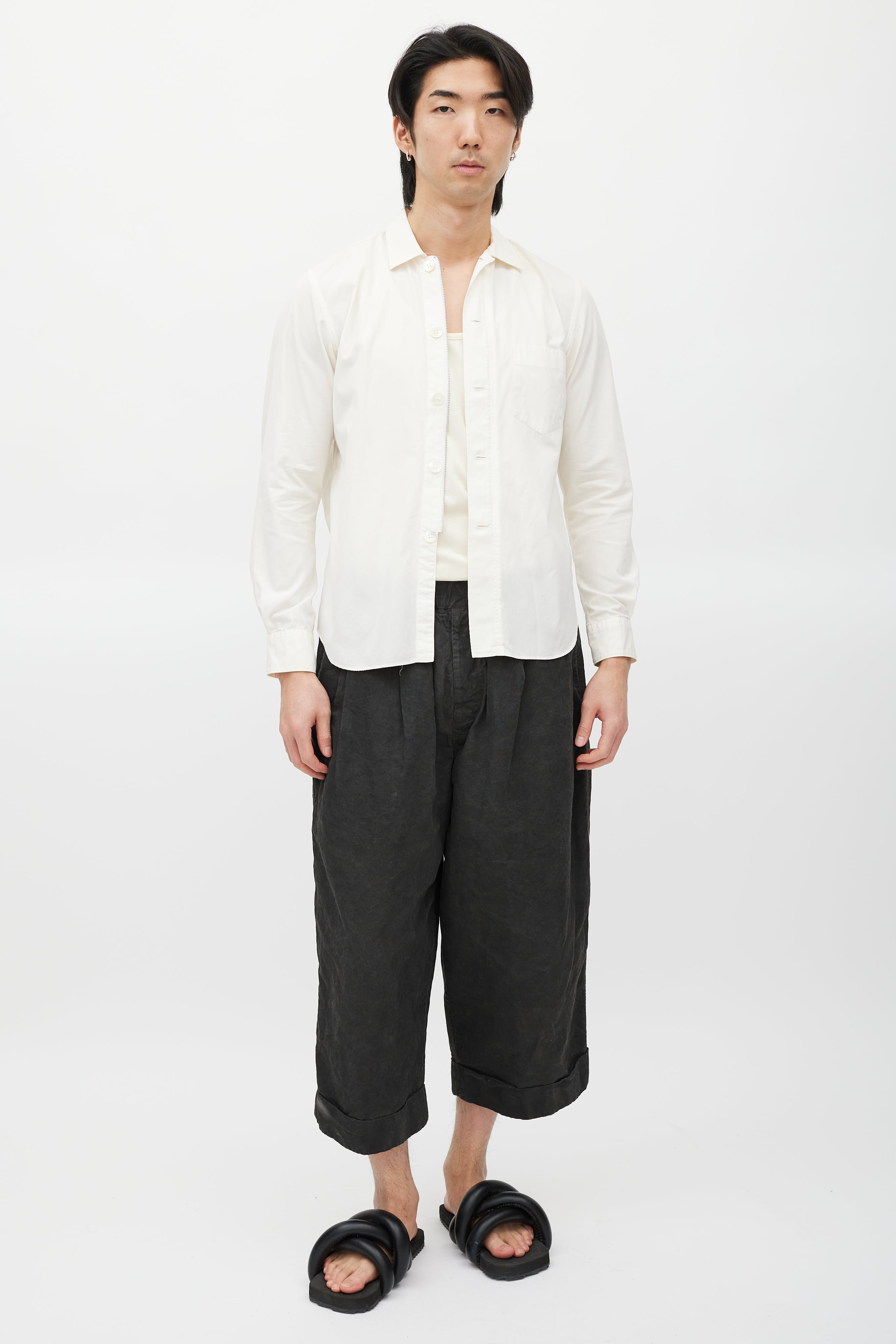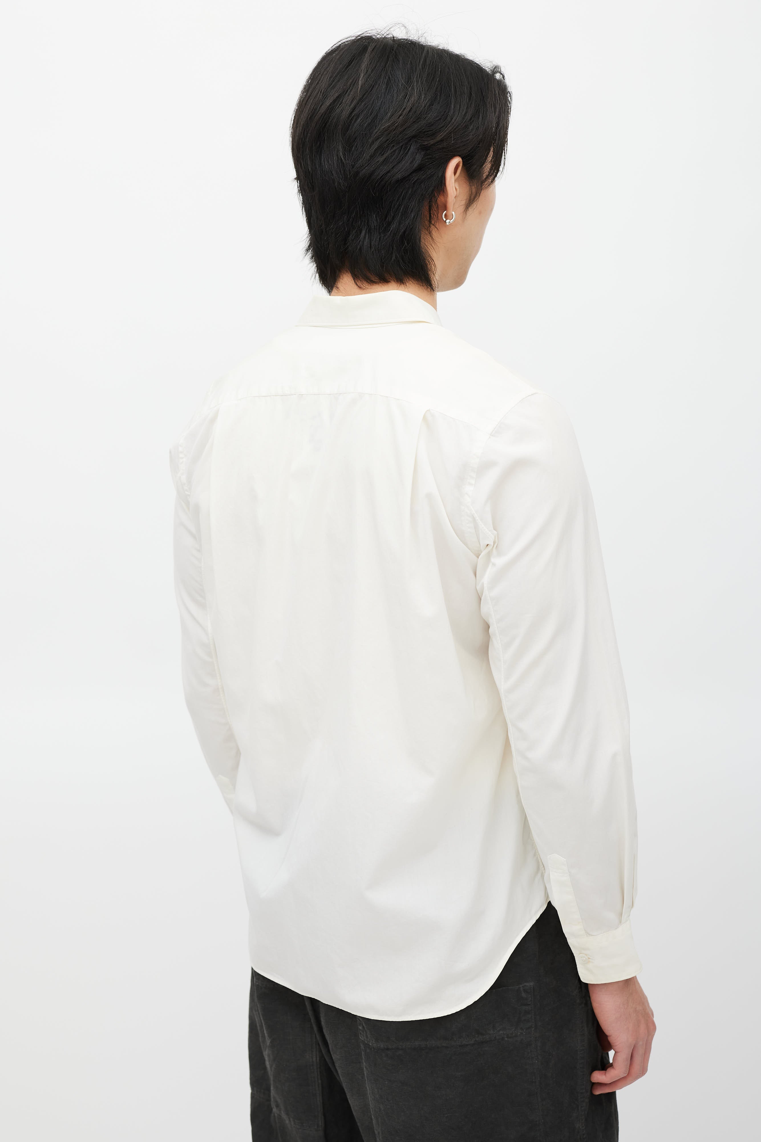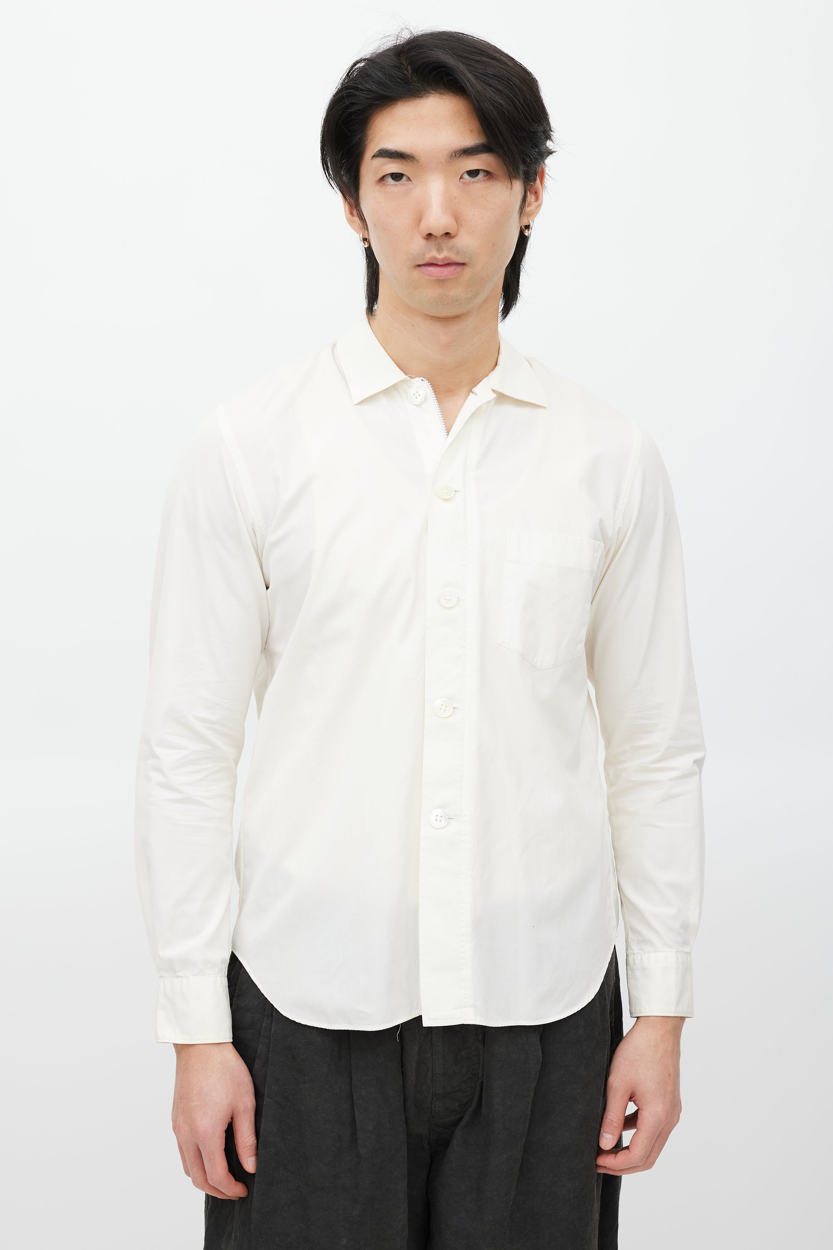 Pre-owned Comme des Garçons white jacket featuring a pointed collar, long sleeves with buttoned cuffs, one patch pocket at chest, and zip front with button closure.
