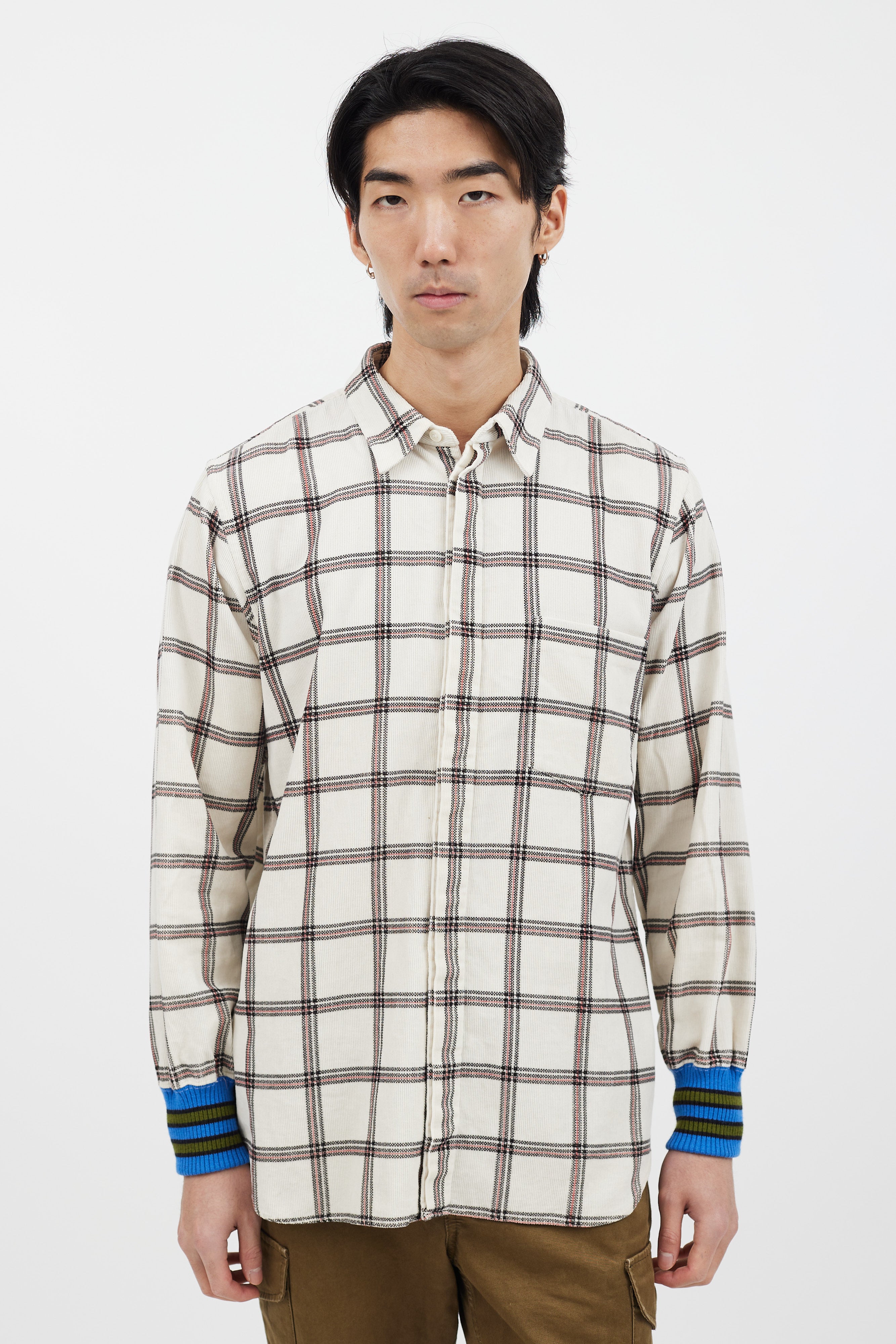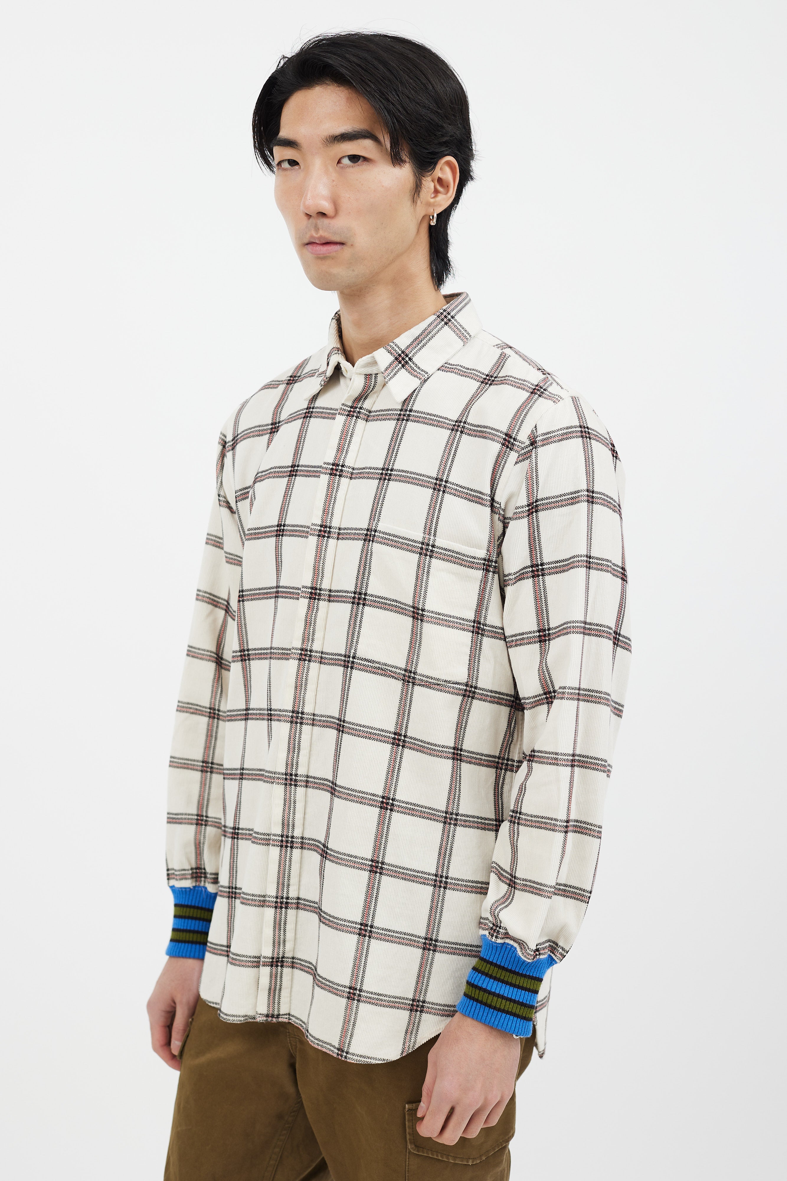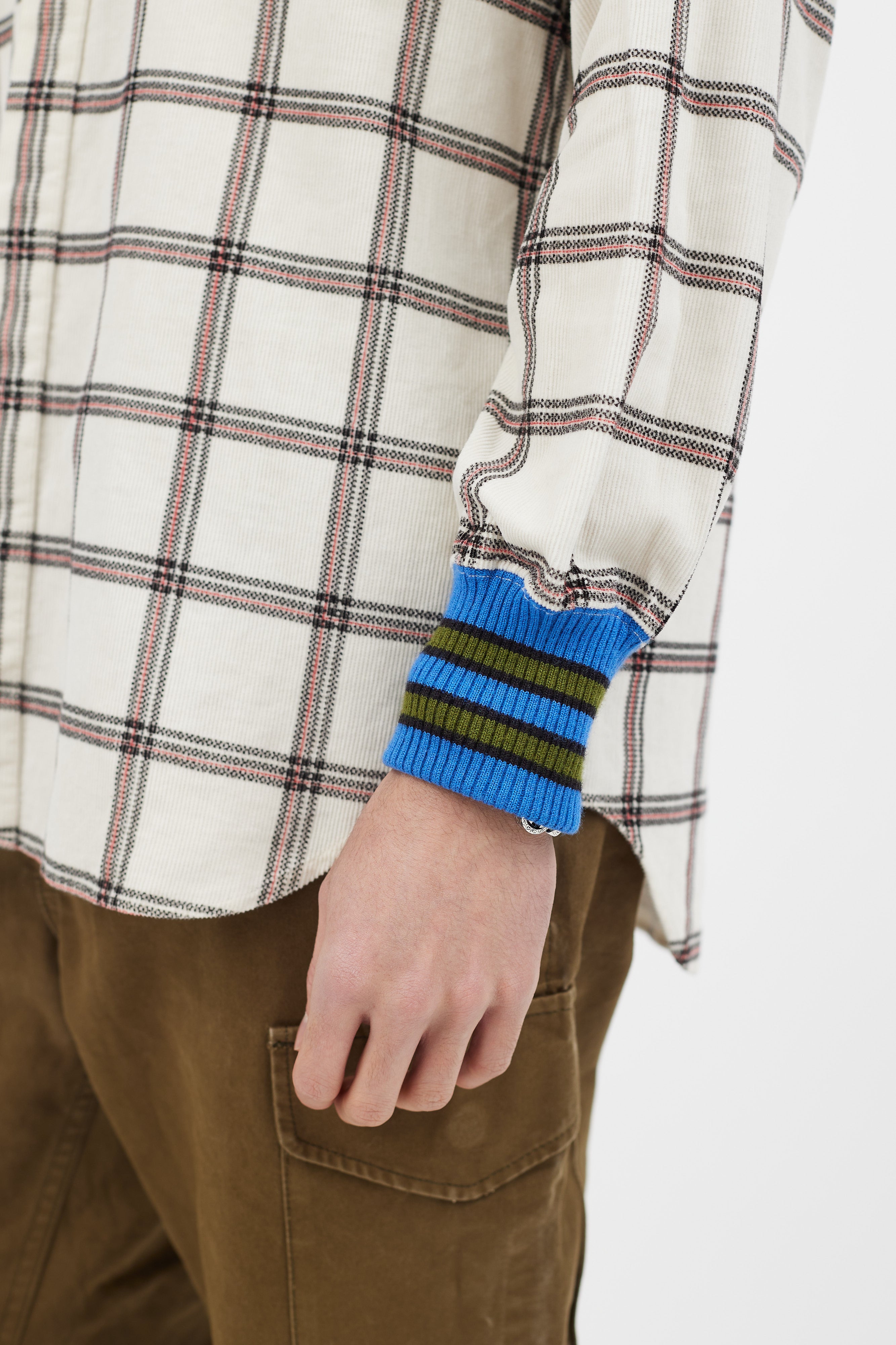 Pre-owned Comme Des Garçons white & pink plaid corduroy long sleeve shirt featuring button up front, point collar and knit blue and green ribbed cuffs.