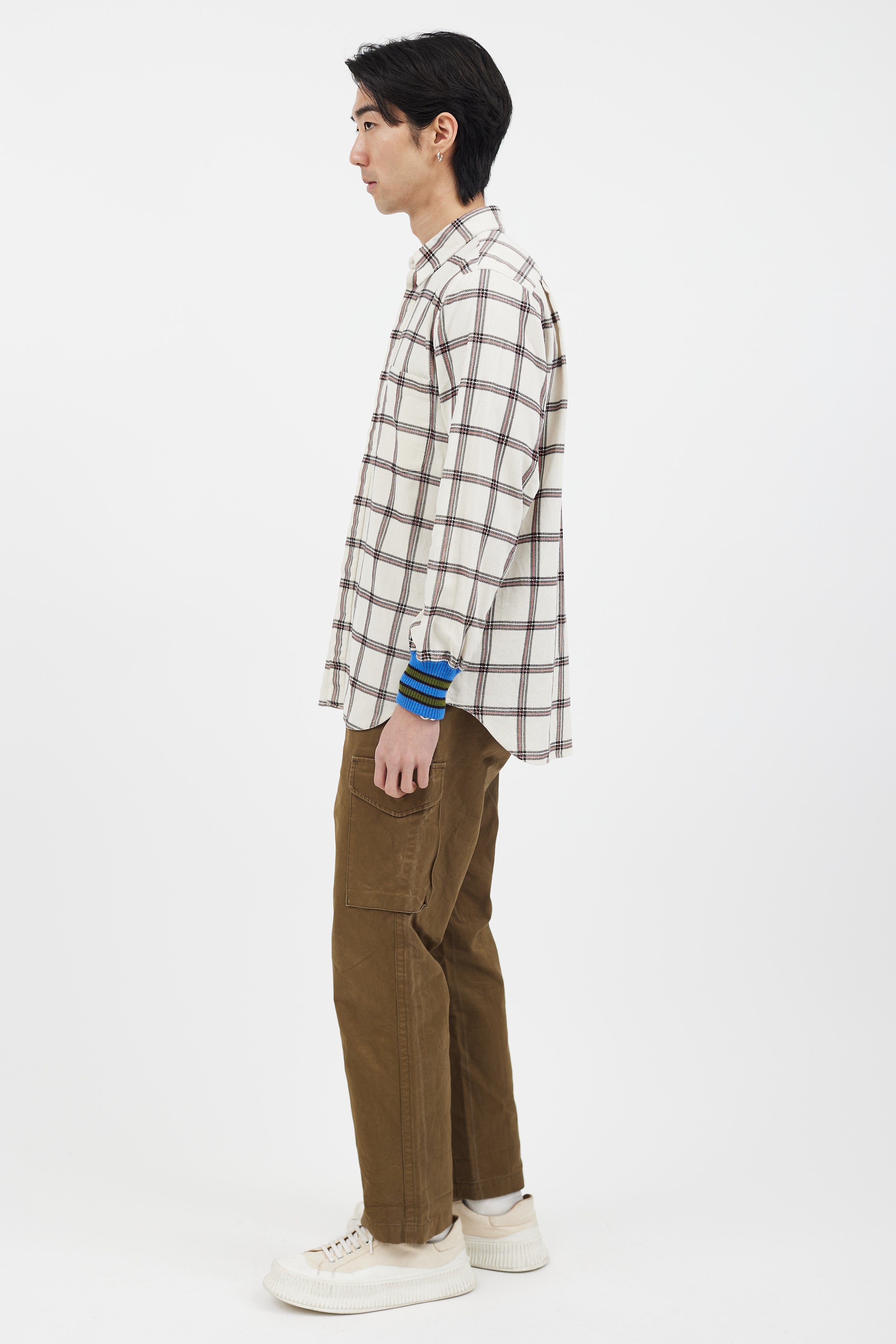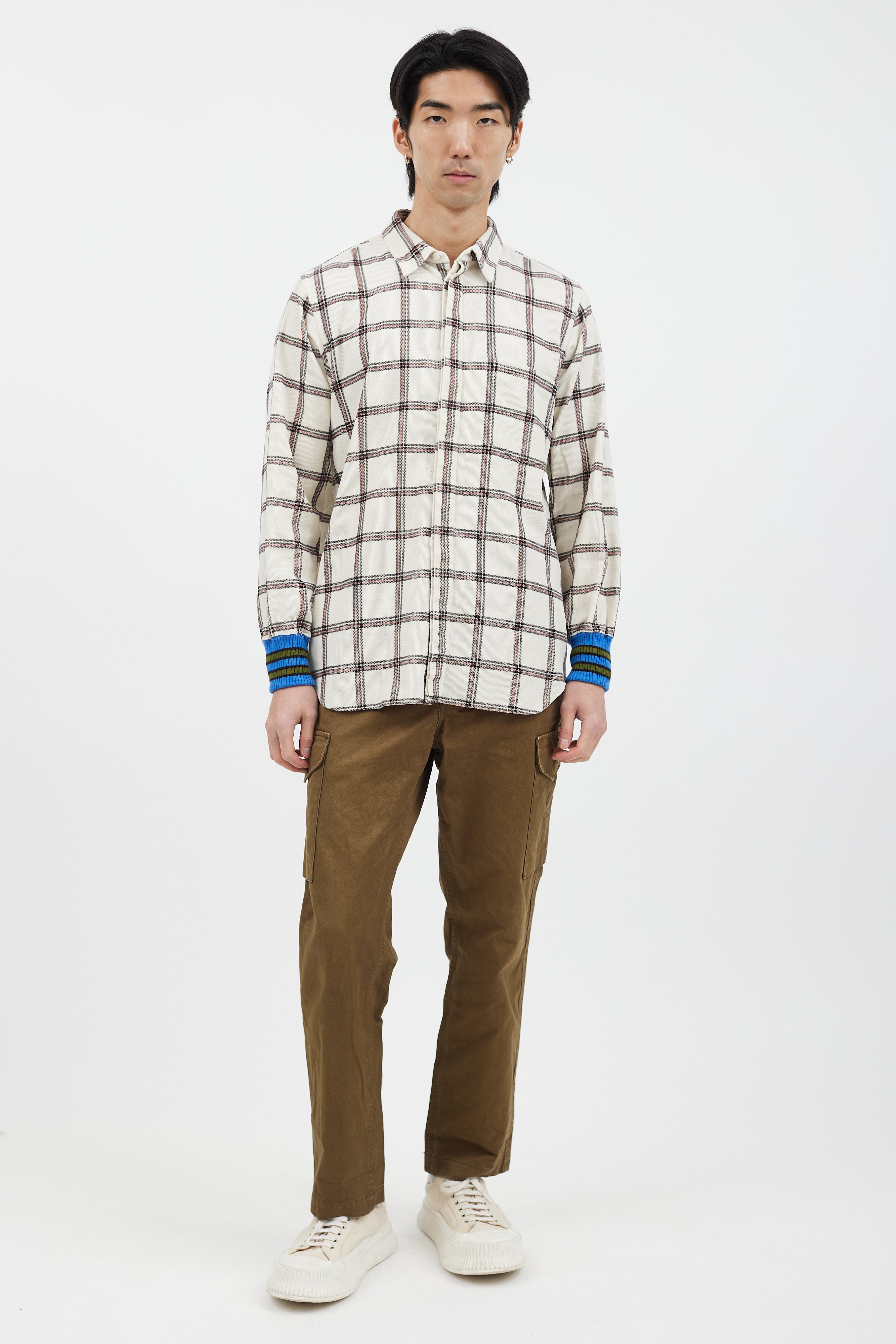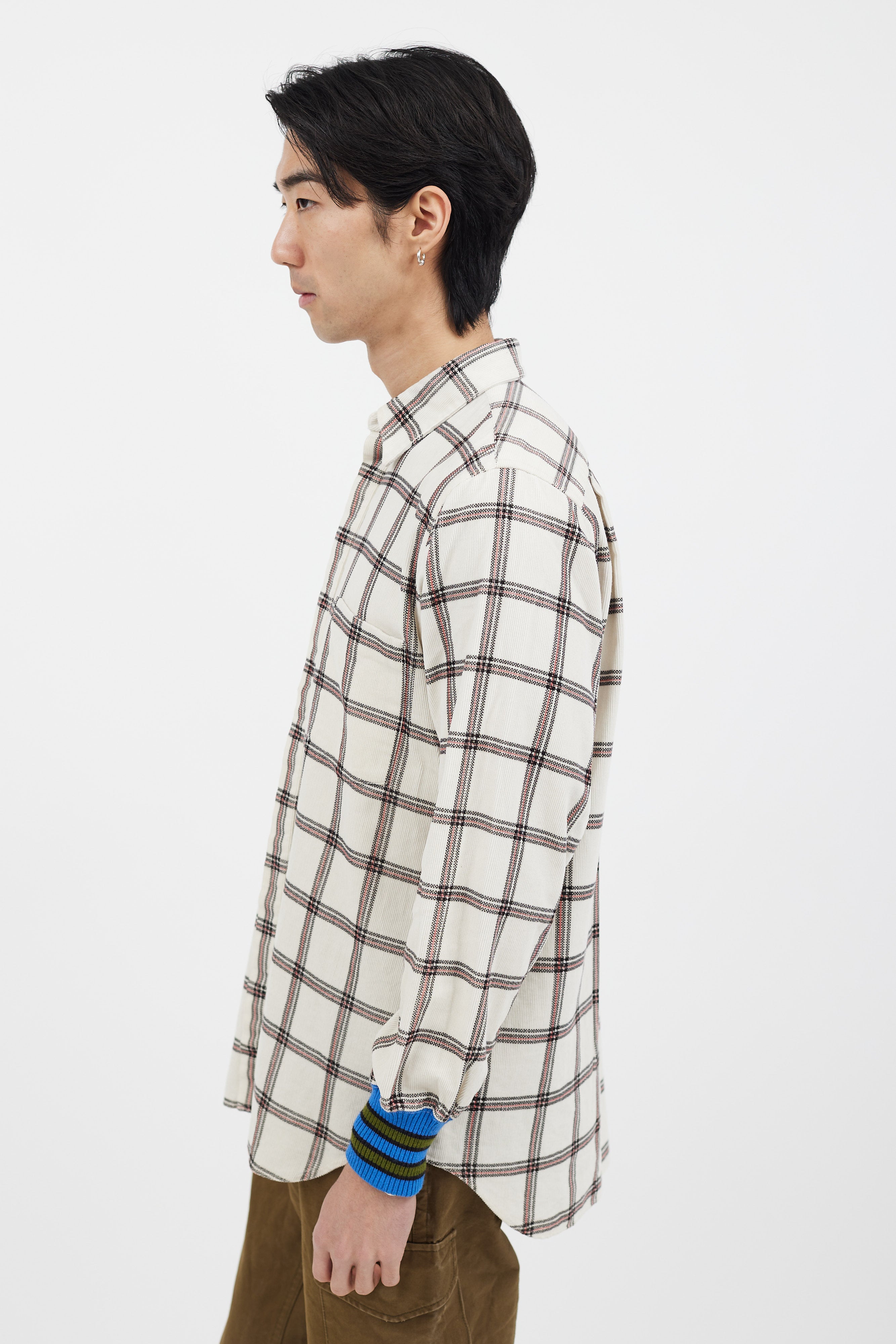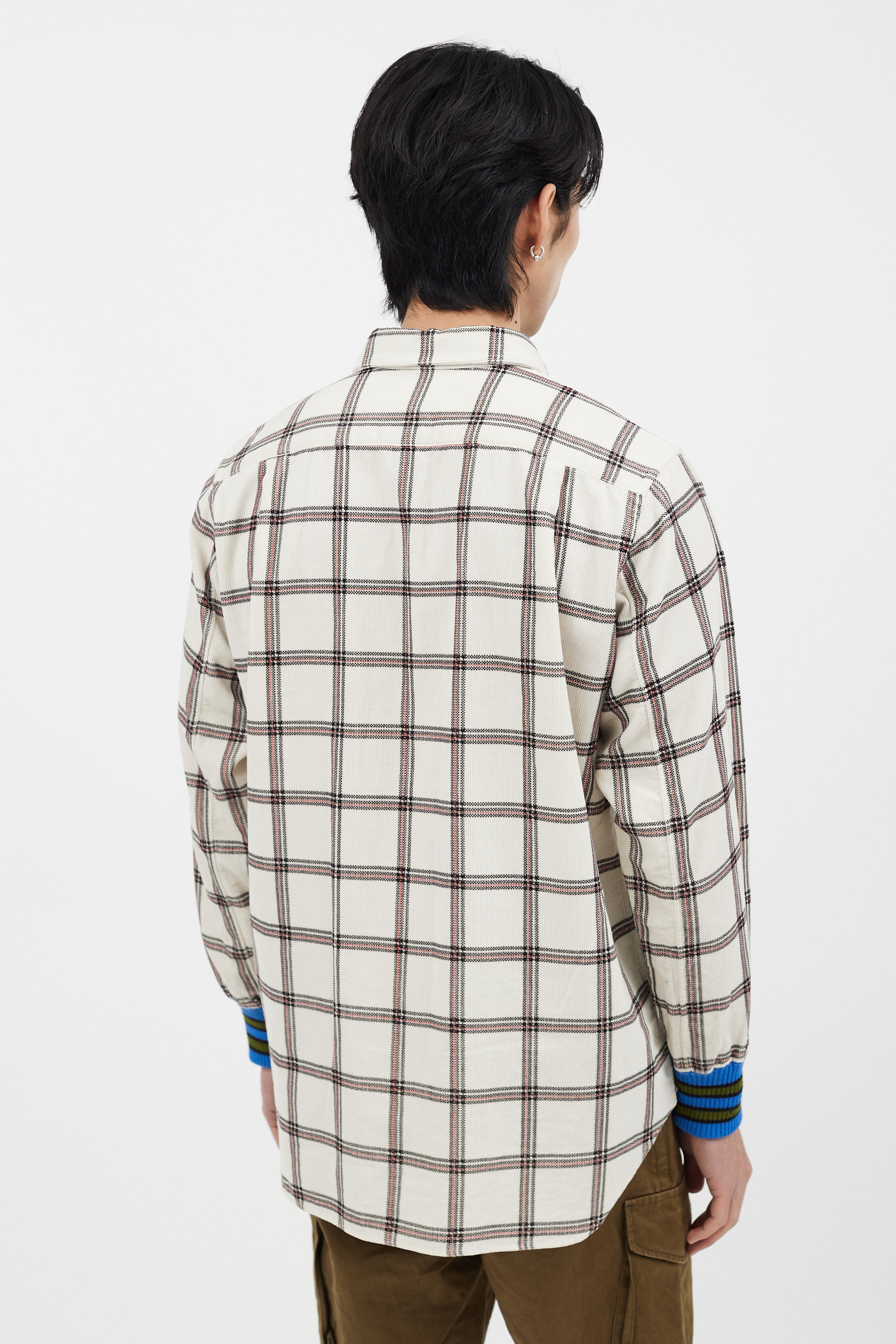 Pre-owned Comme Des Garçons white & pink plaid corduroy long sleeve shirt featuring button up front, point collar and knit blue and green ribbed cuffs.