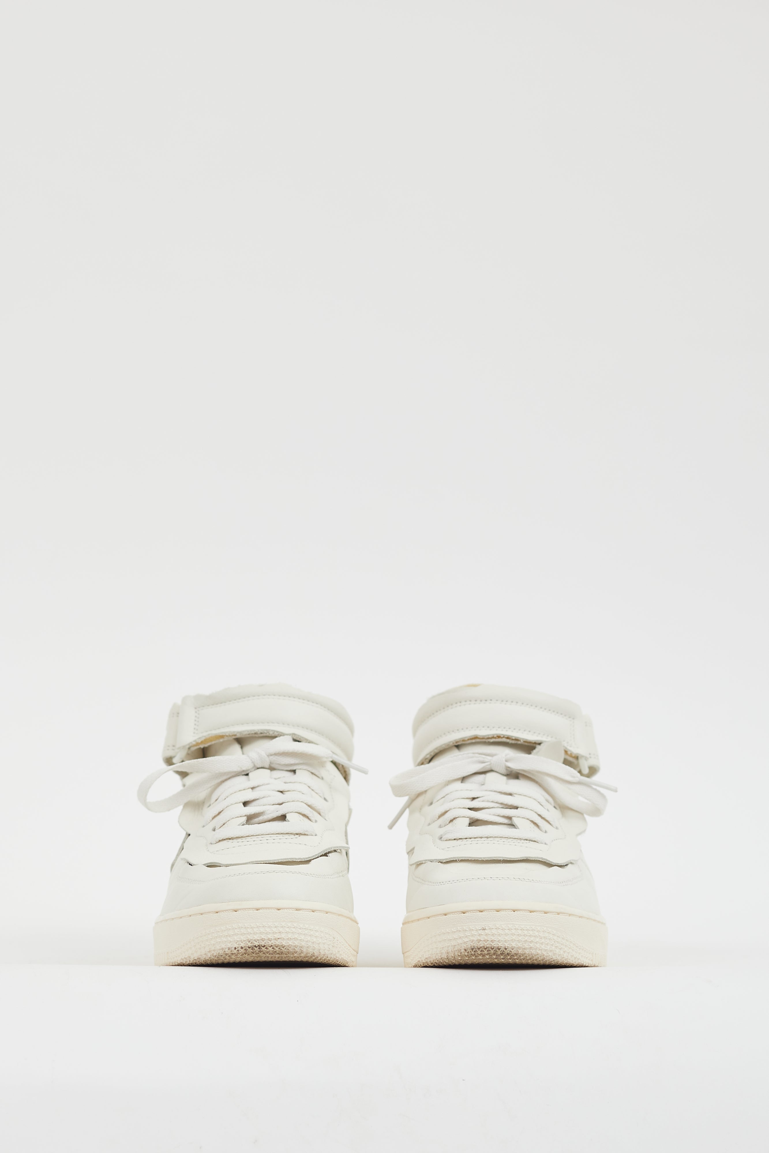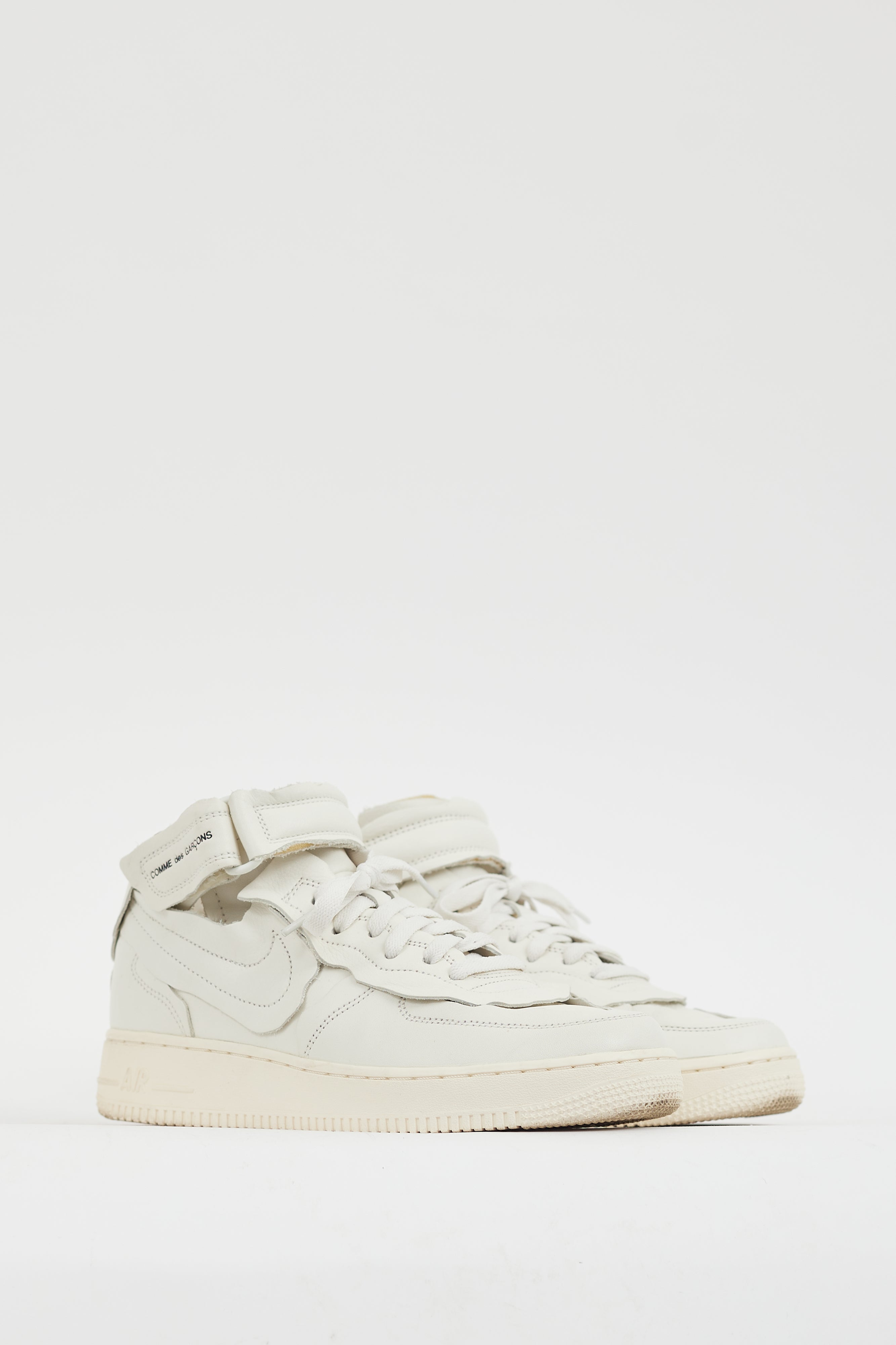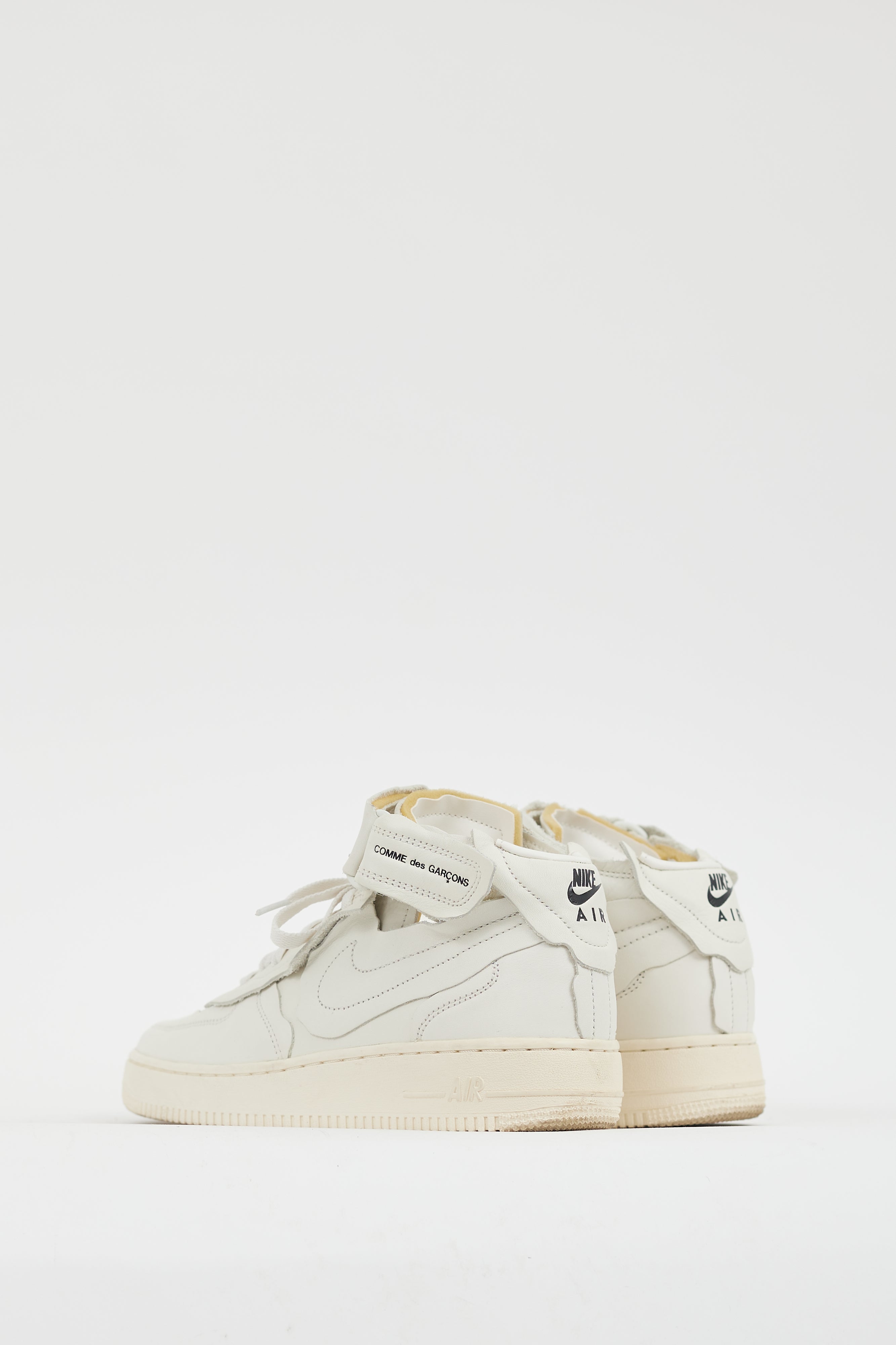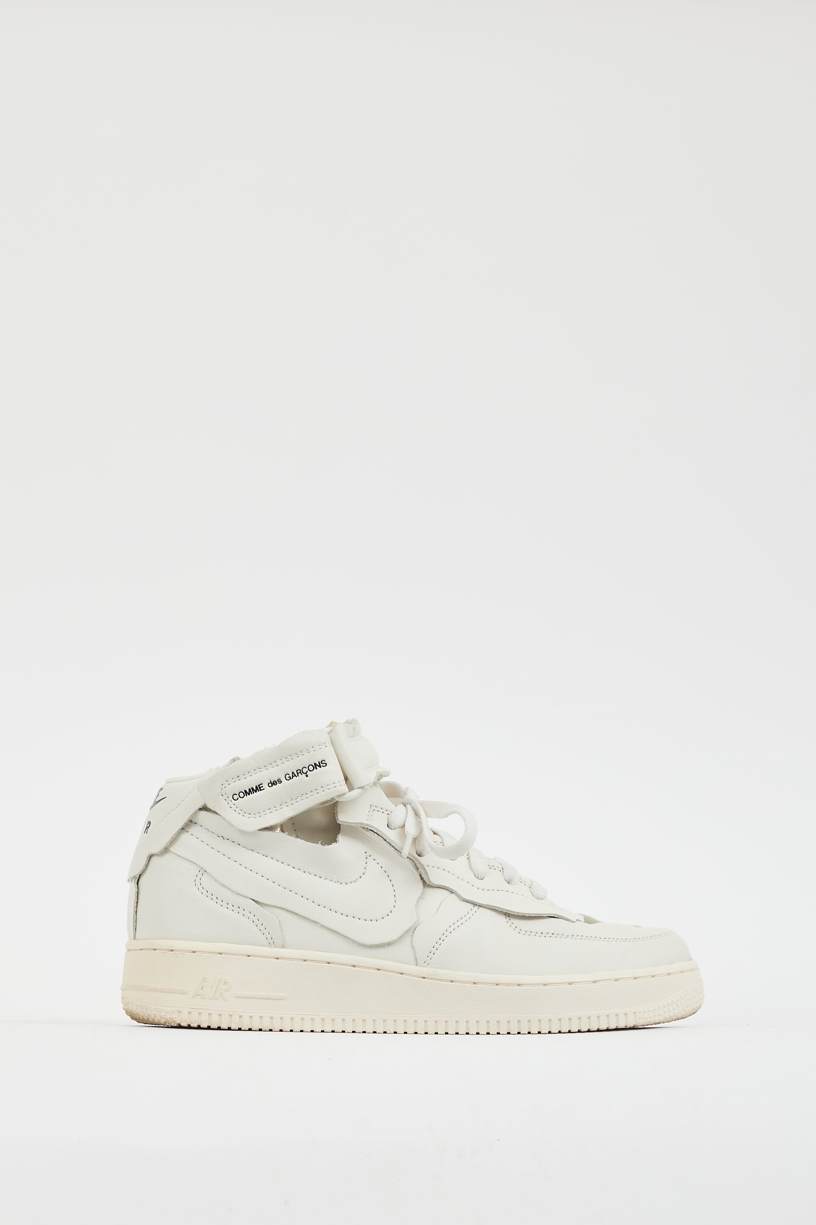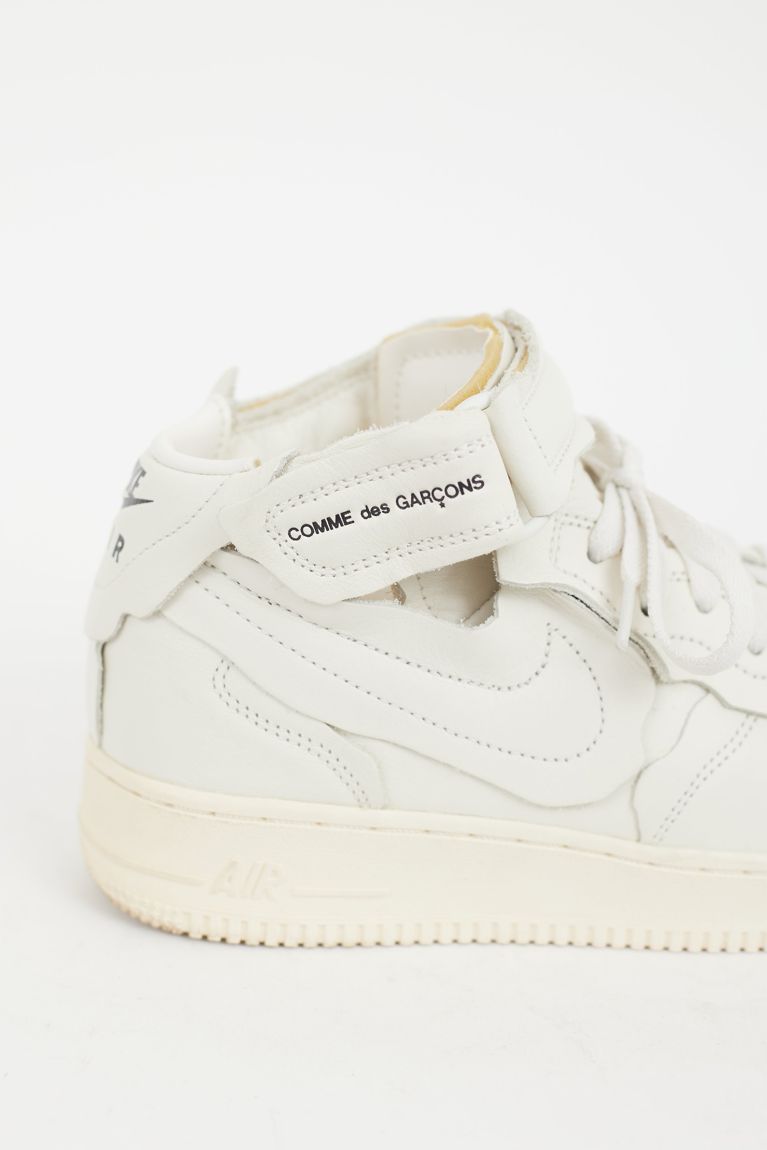 Pre-owned Nike x Comme des Garçons white Air Force 1 Mid sneakers featuring cut out panelling at ankle, unfinished raw edges throughout, and printed CDG logo at ankle strap.