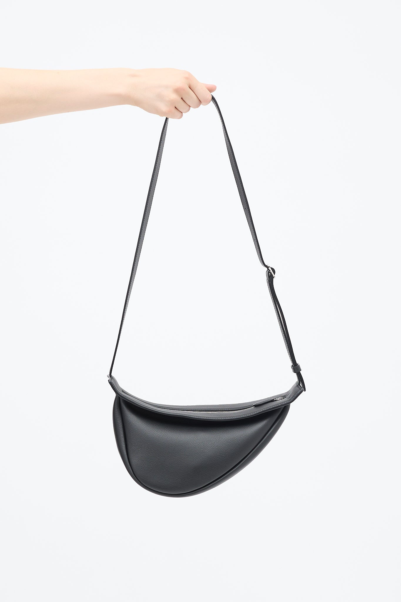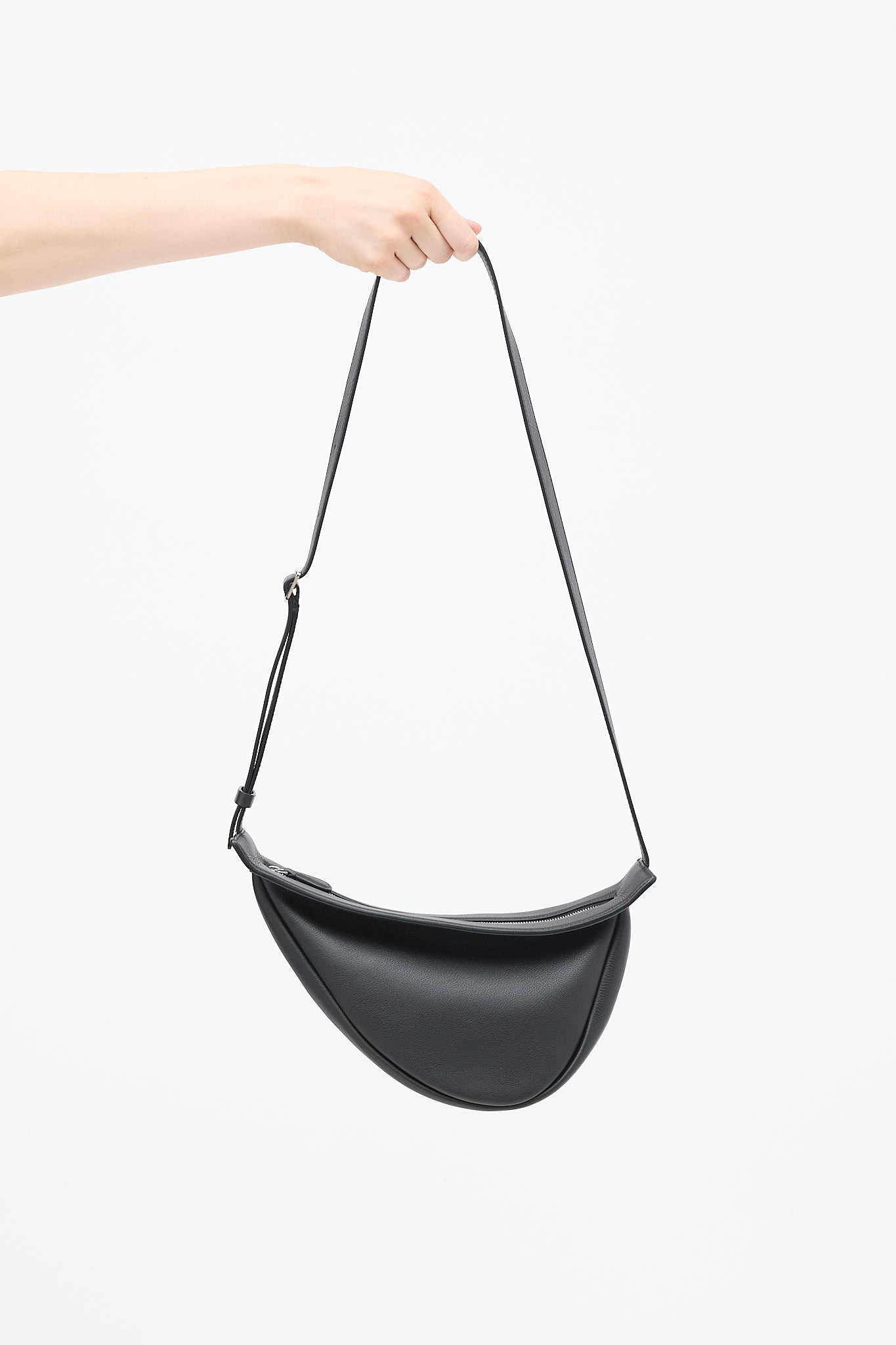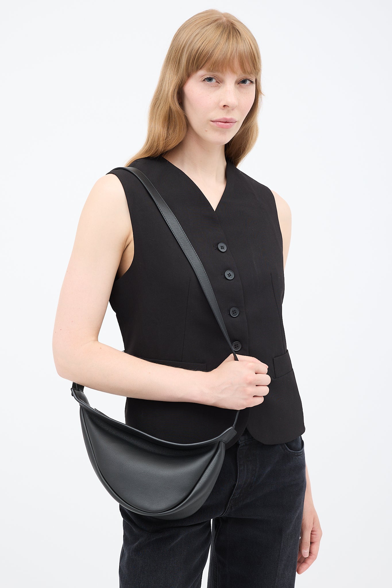 Pre-owned The Row black leather Slouchy Banana small bag featuring curved body, adjustable and fixed shoulder strap, silver tone top zip closure, debossed logo under top placket, and suede lined main compartment. Comes with original dust bag.