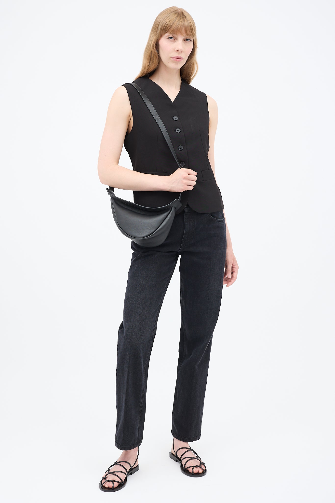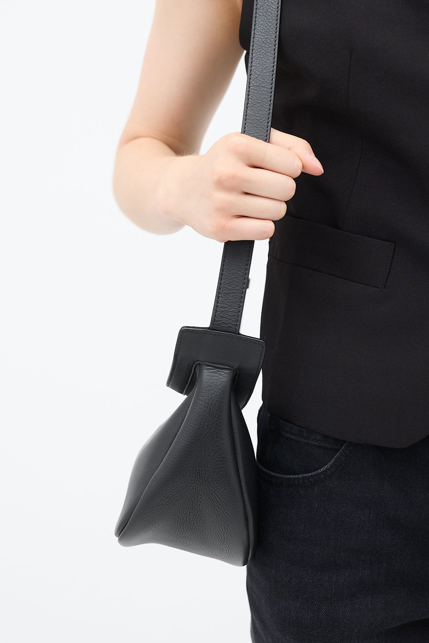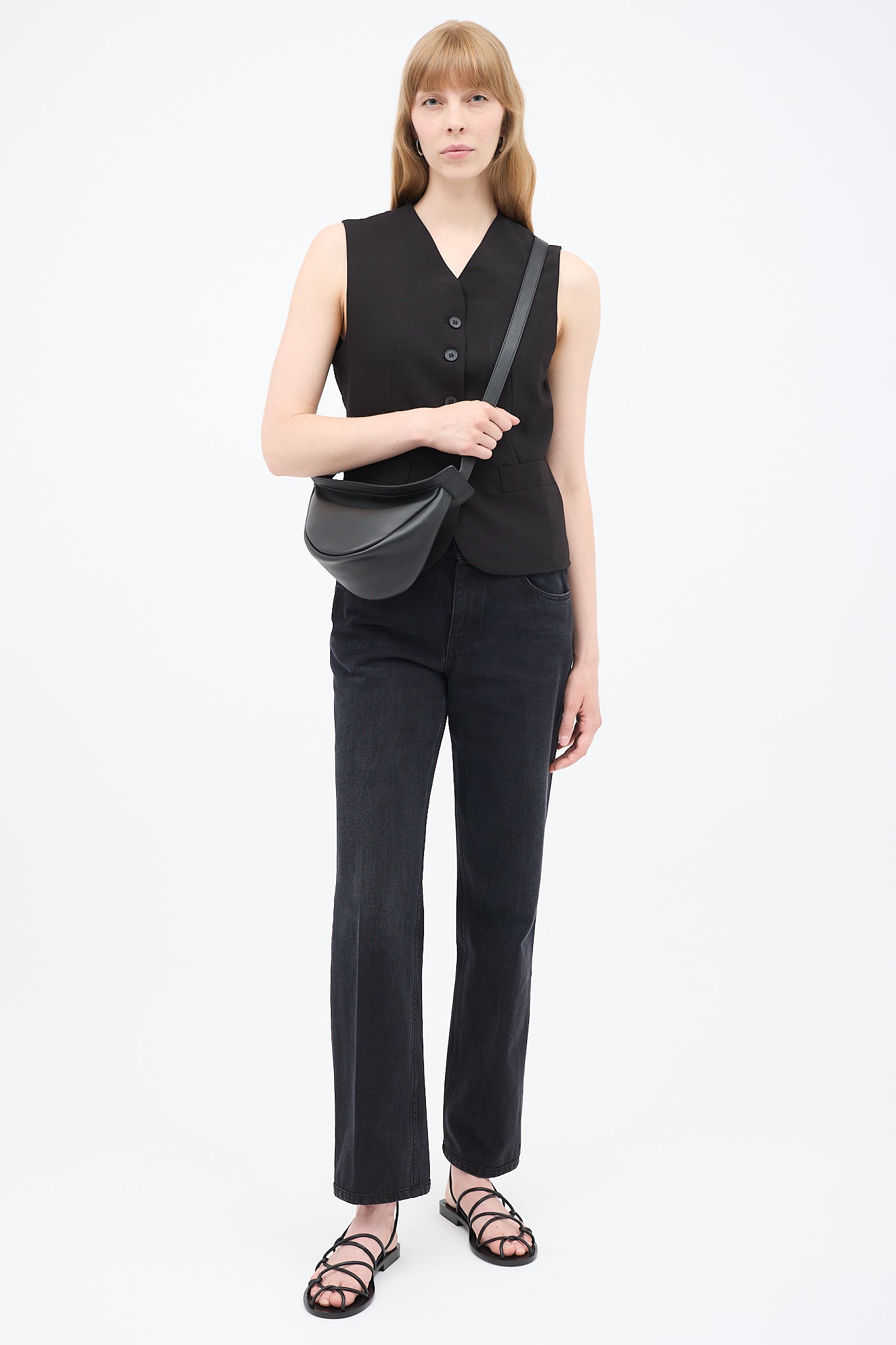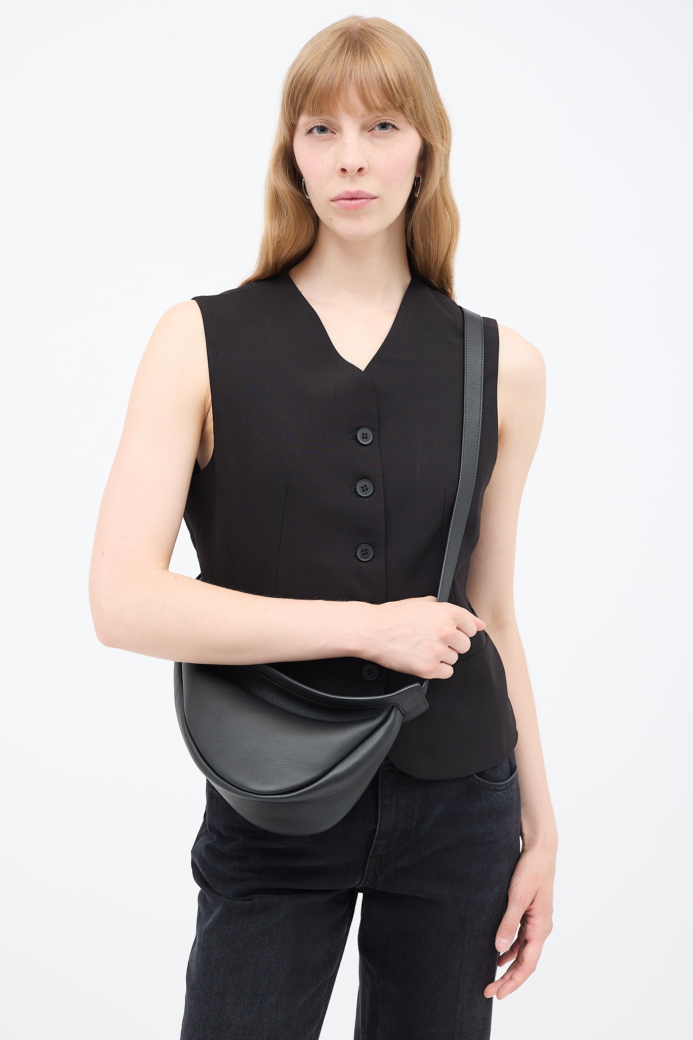 Pre-owned The Row black leather Slouchy Banana small bag featuring curved body, adjustable and fixed shoulder strap, silver tone top zip closure, debossed logo under top placket, and suede lined main compartment. Comes with original dust bag.