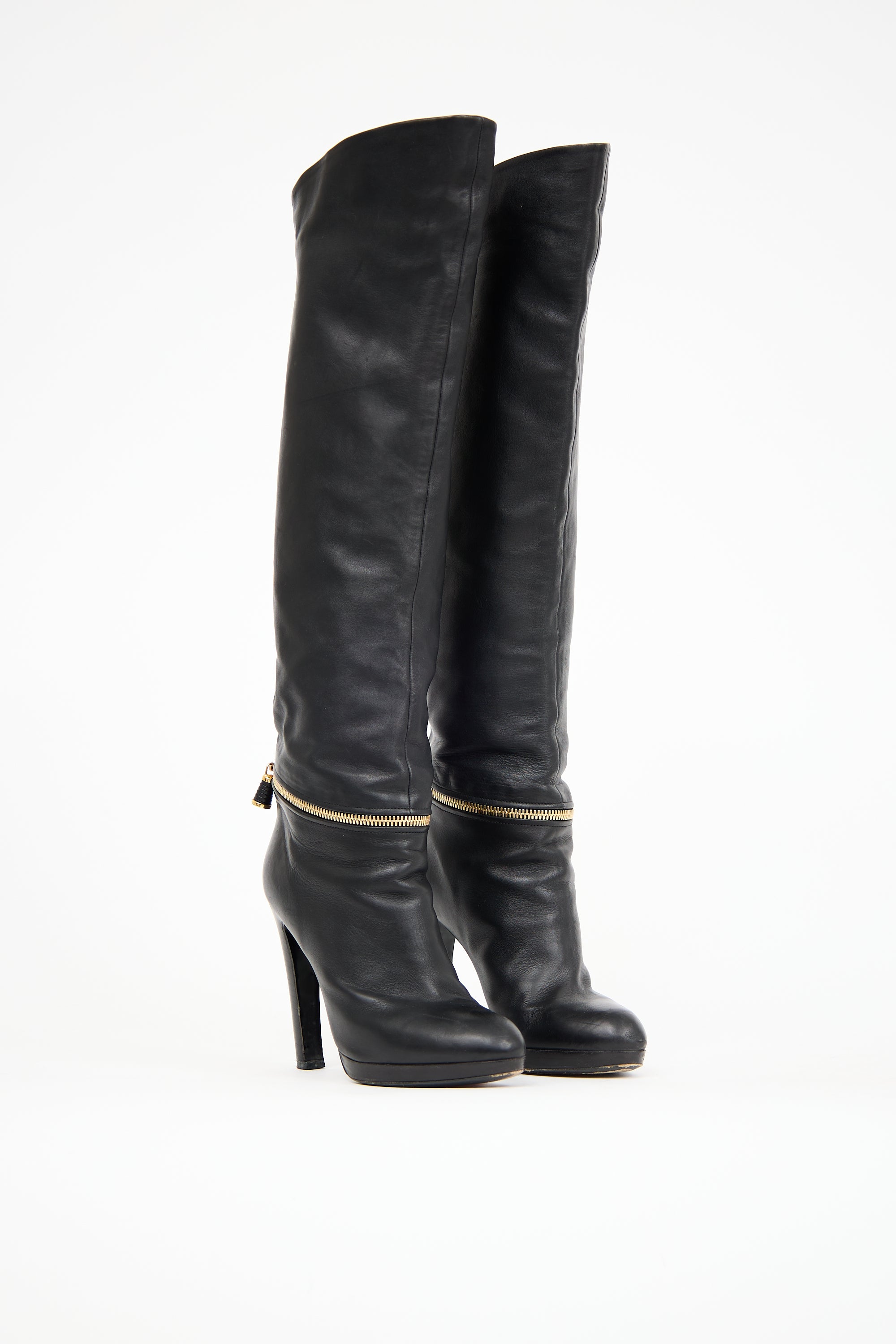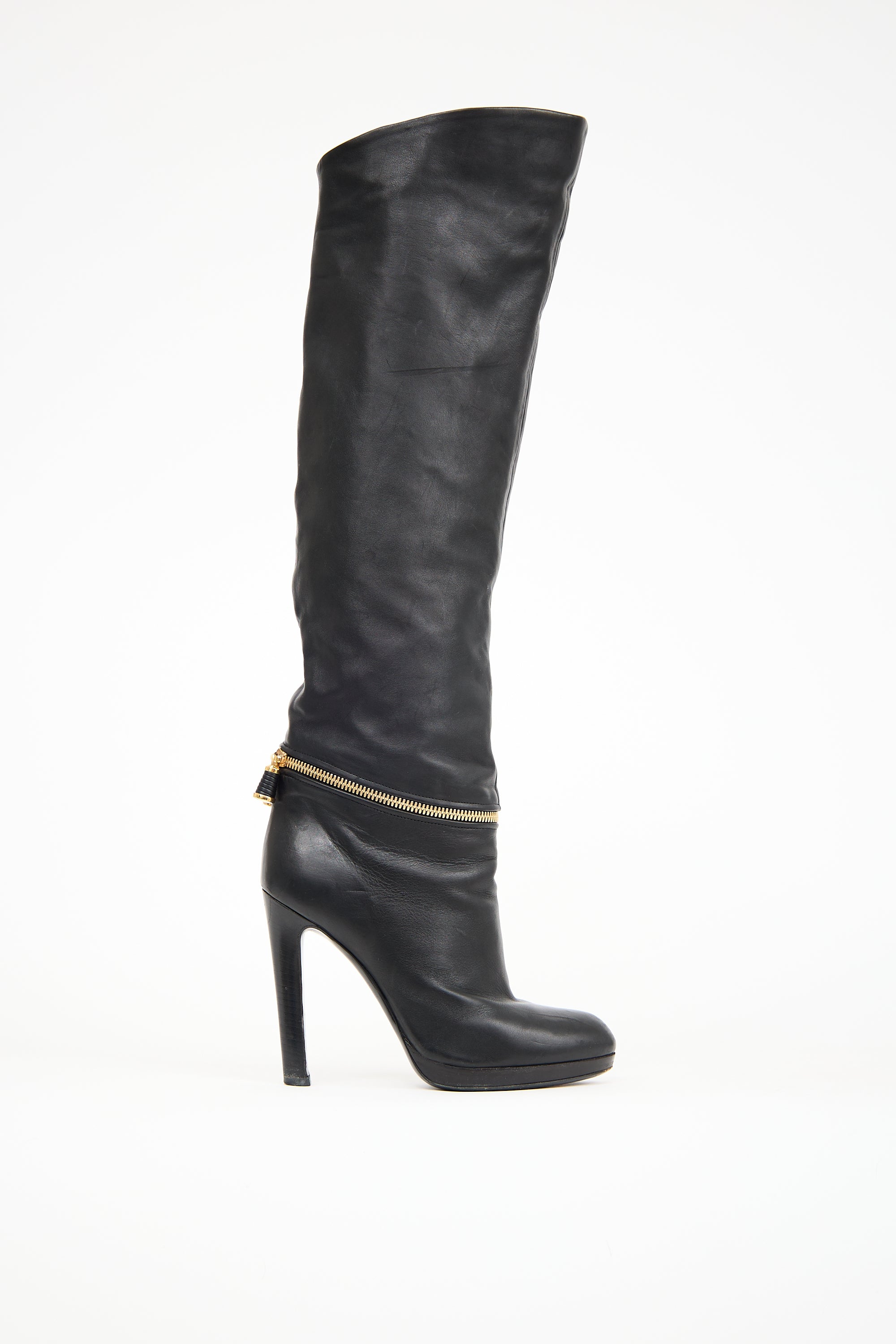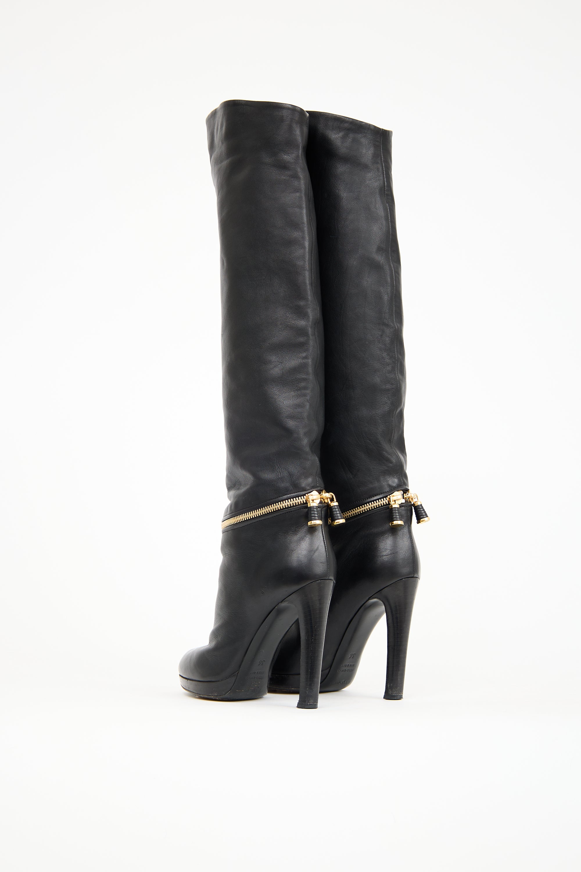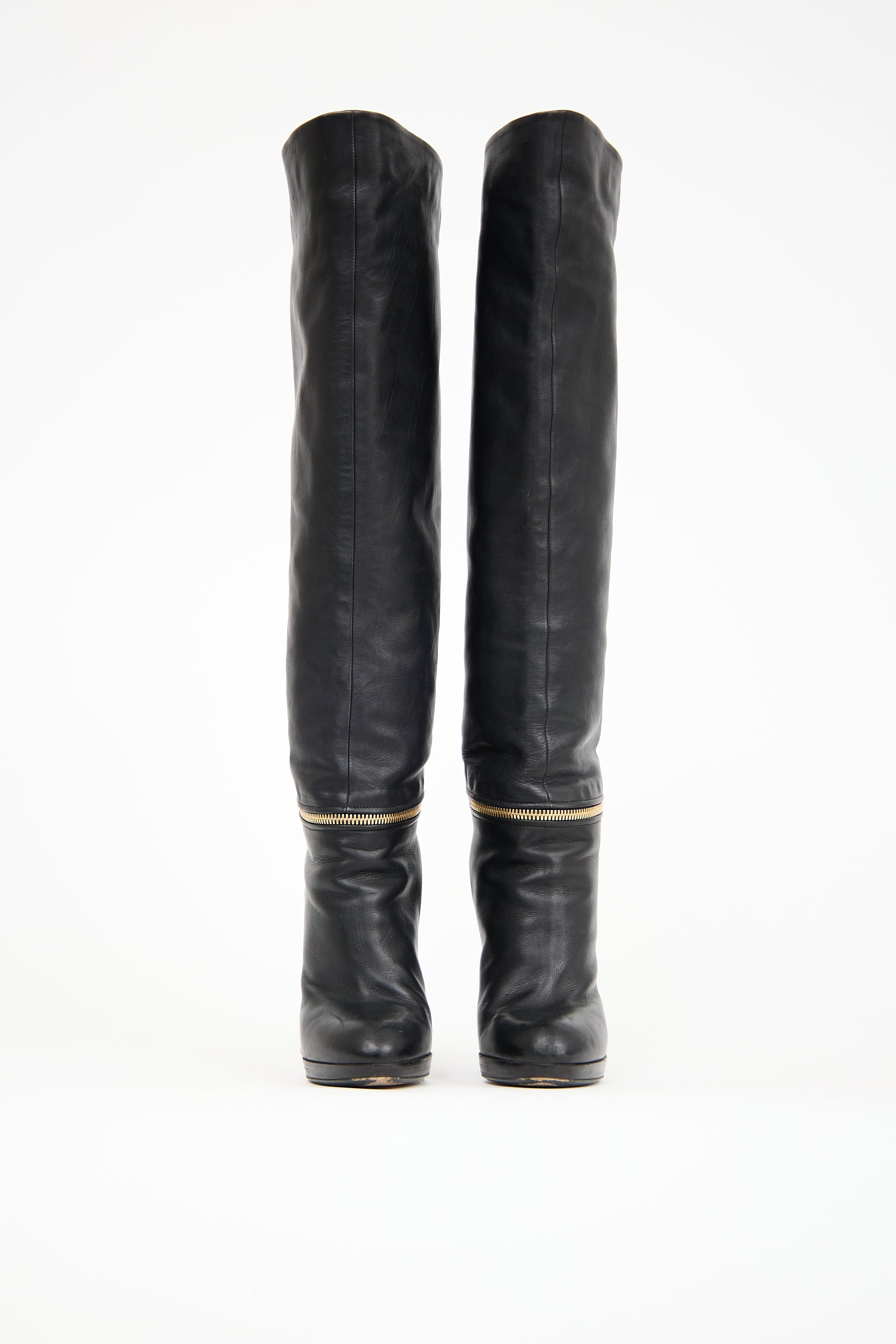 Pre-owned Sergio Rossi black leather boots featuring an almond toe, gold tone zip detail across vamp, knee high shaft, a stacked heel with a platform sole.