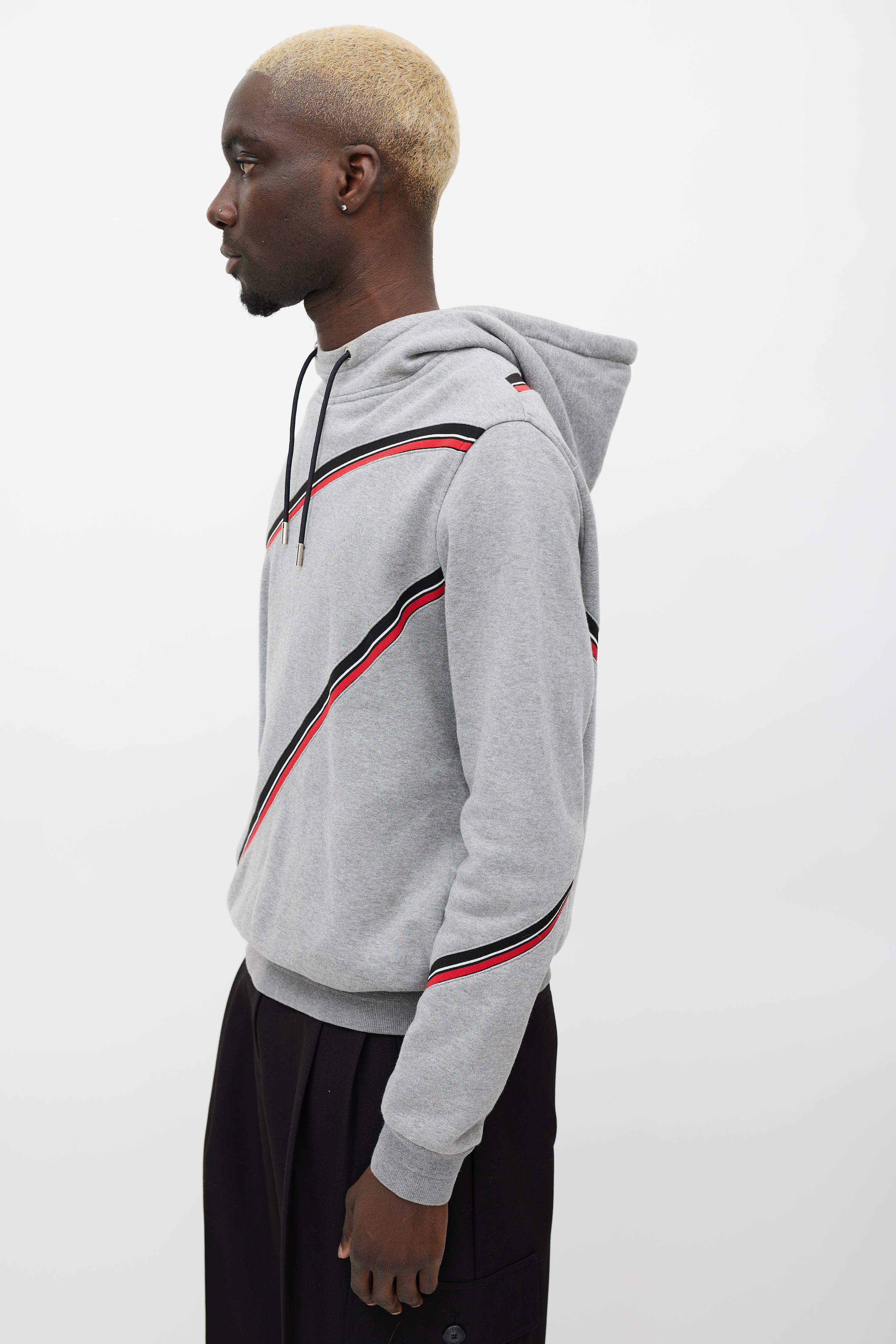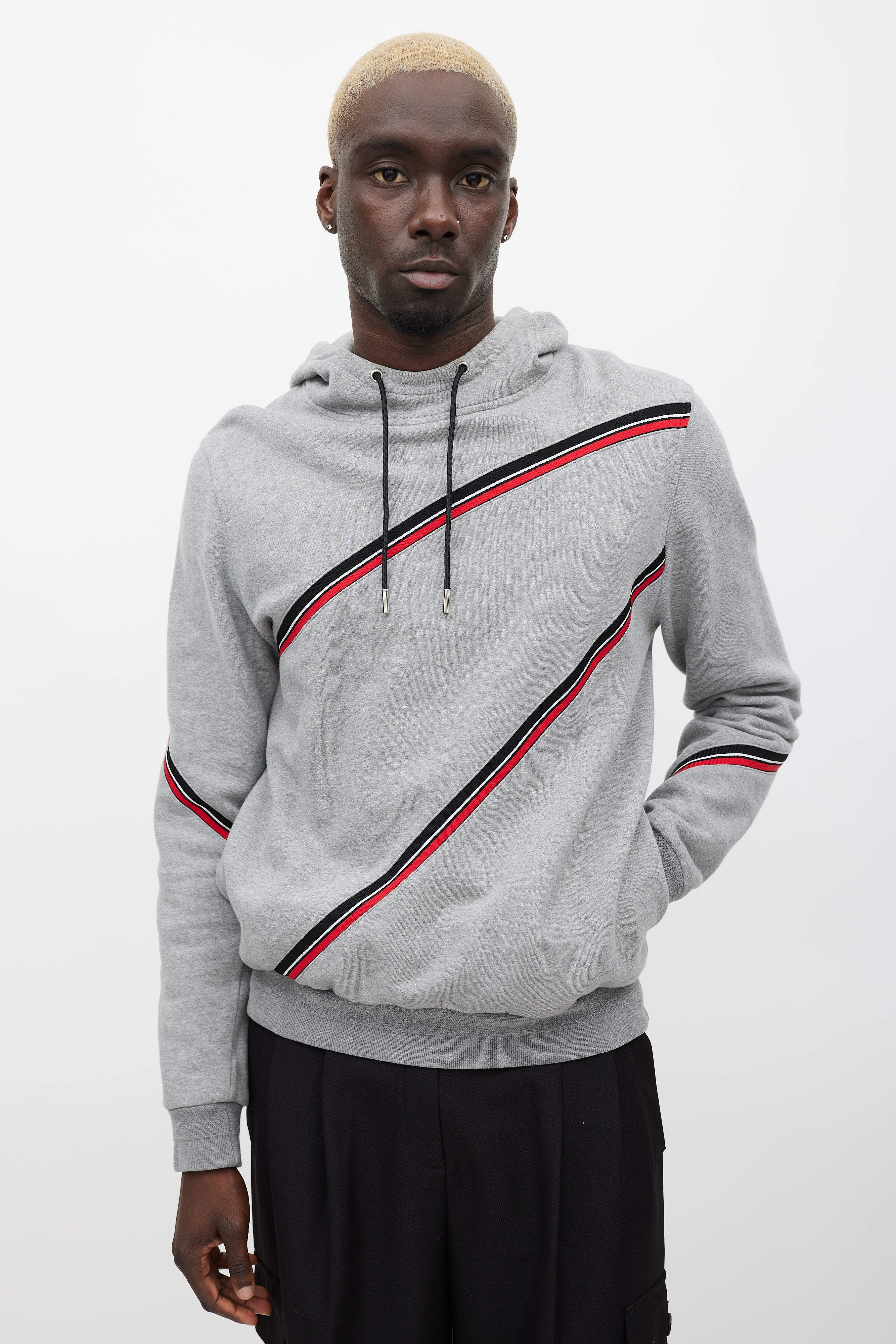 Pre-owned Dior grey hoodie featuring a multicolour striped pattern throughout, drawstring hood, tonal embroidered logo at chest, two slip pockets at hip, and ribbed hem.