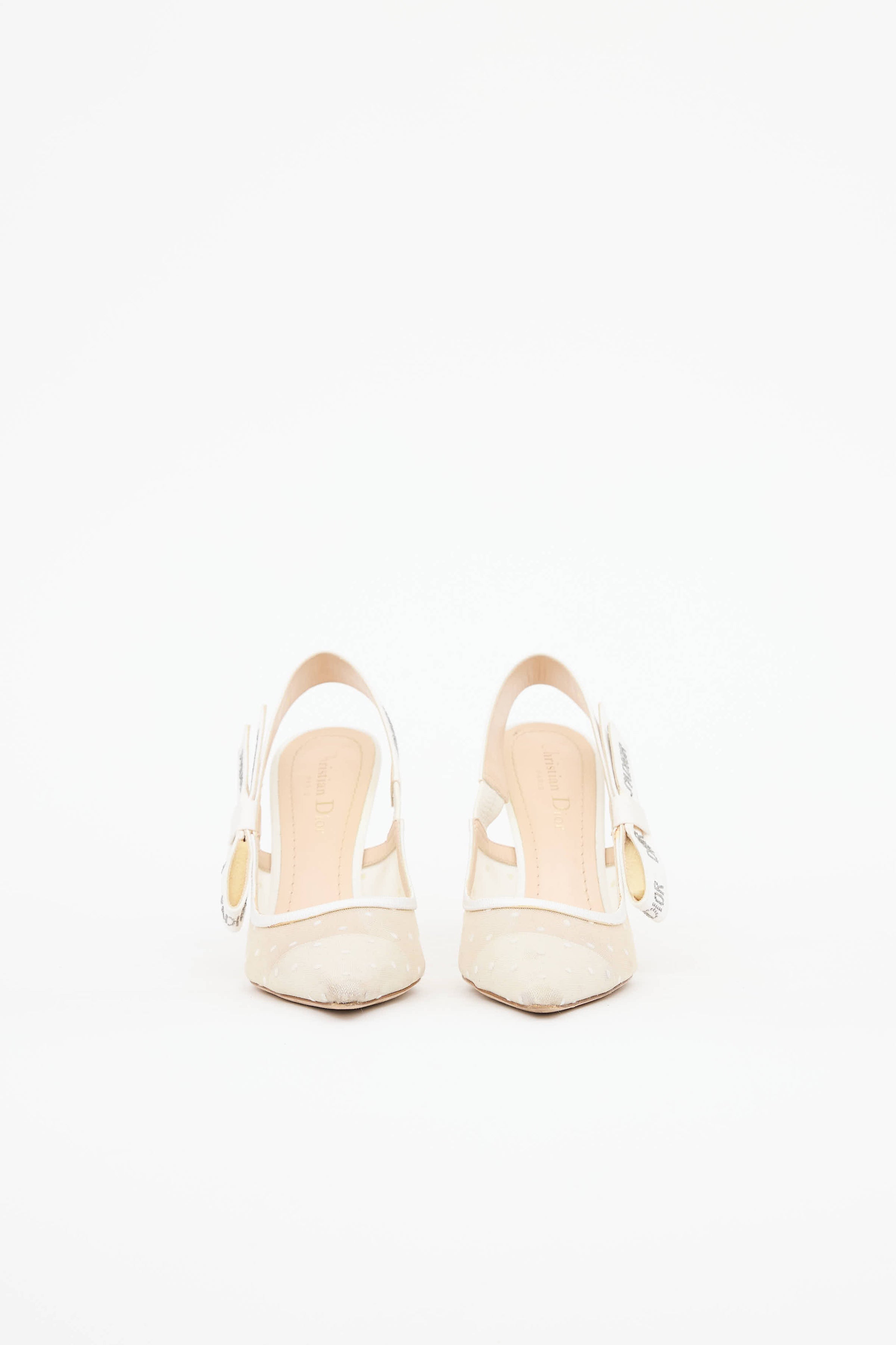 Pre-owned Dior white J'Adior slingback heels featuring pointed toe, mesh upper, grosgrain slingback strap with rhinestone J'Adior, polka dot applique, leather insole, and slanted kitten heel.