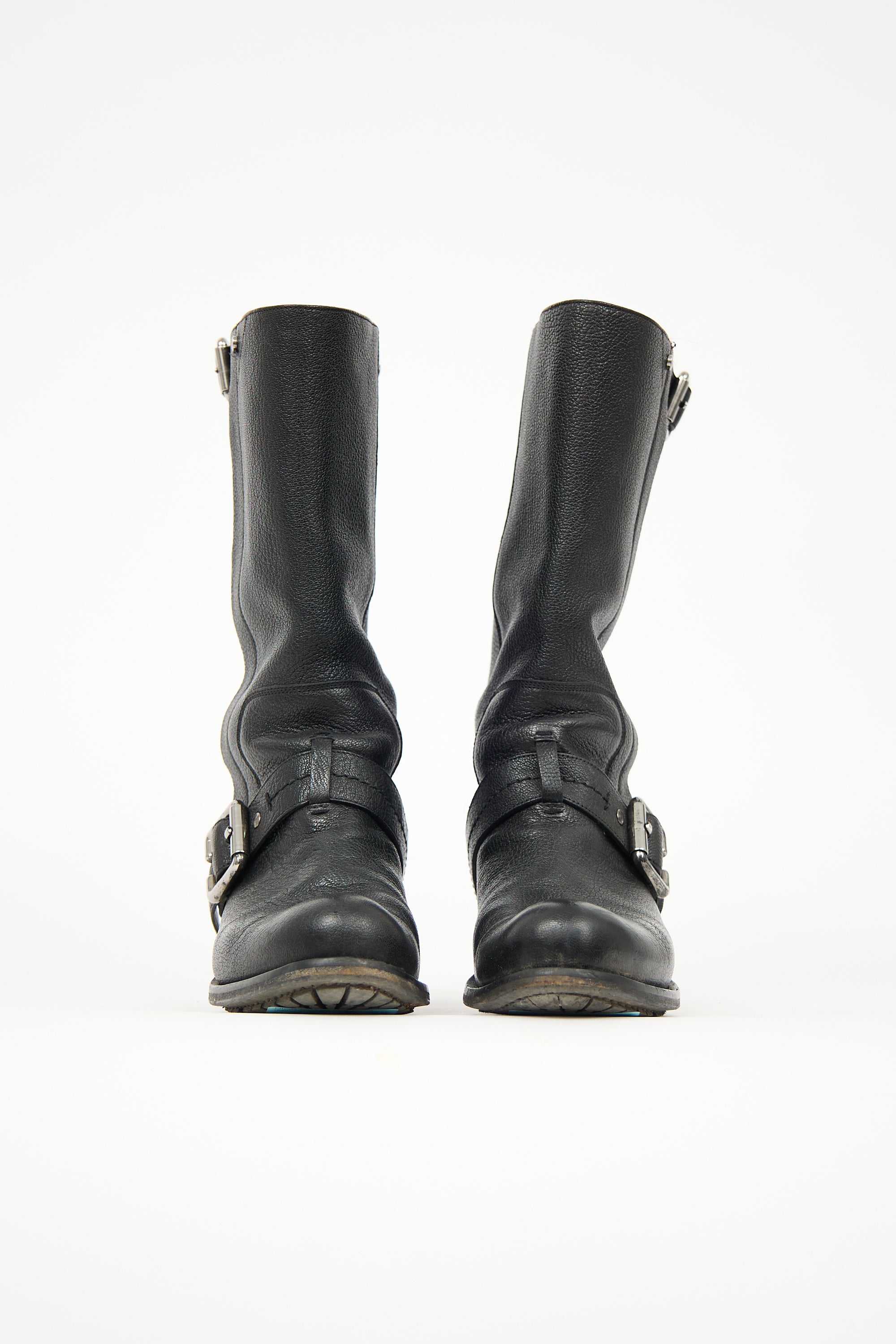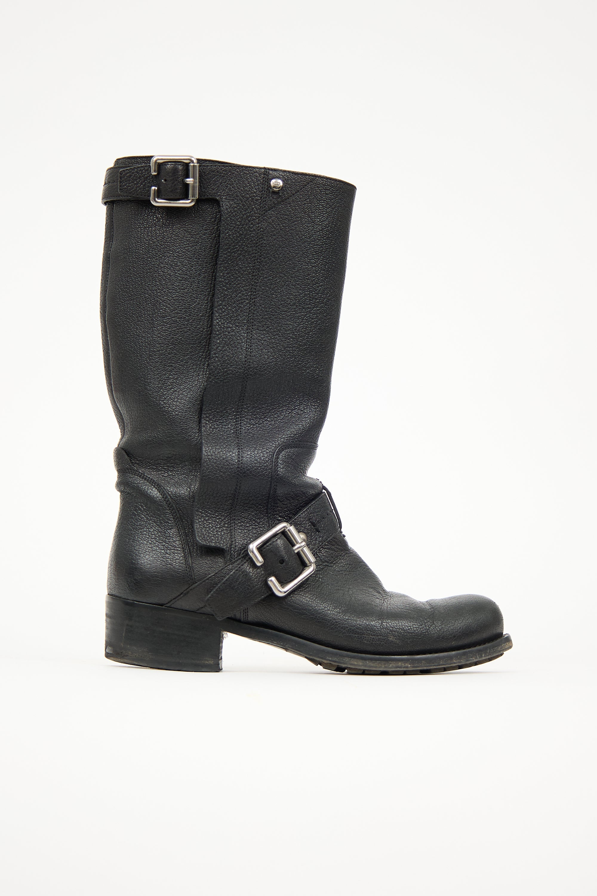 Pre-owned Dior black leather biker boots featuring rounded toe, buckled straps at instep and topline, etched logo rivet at outer topline, pull on entry, and tonal block heel.