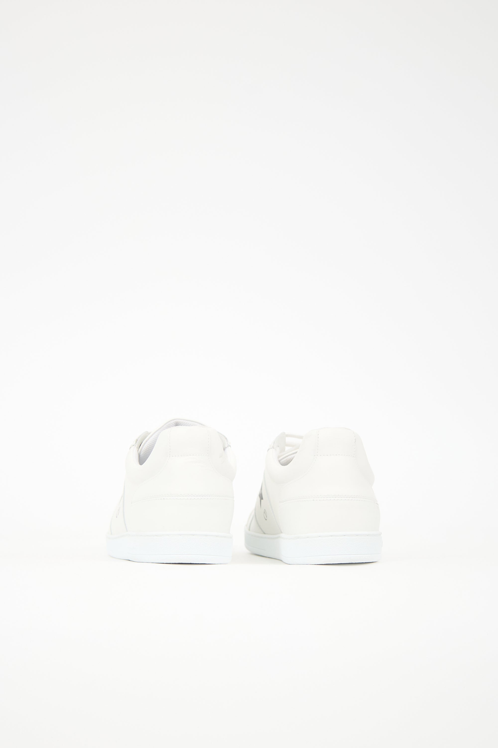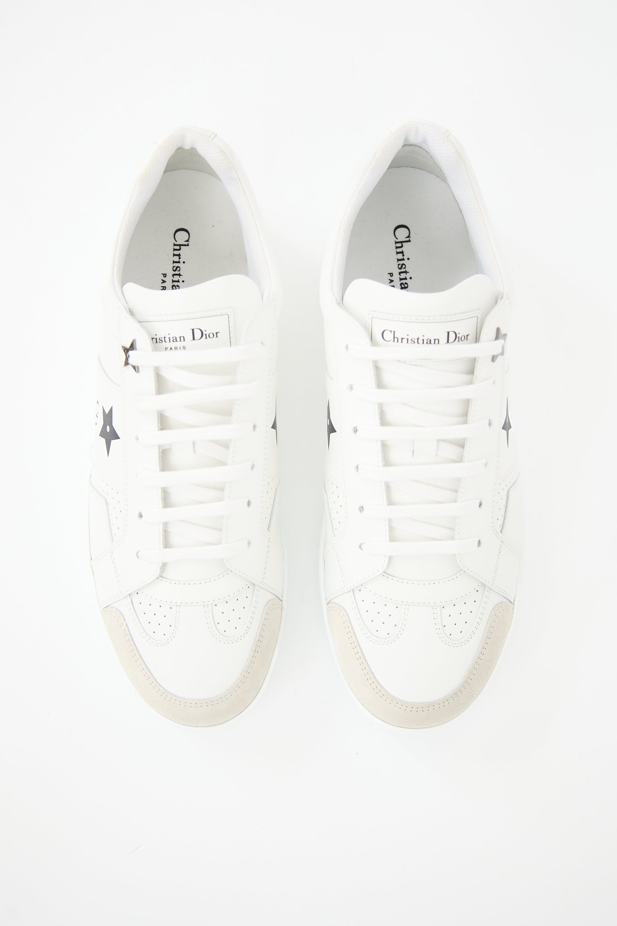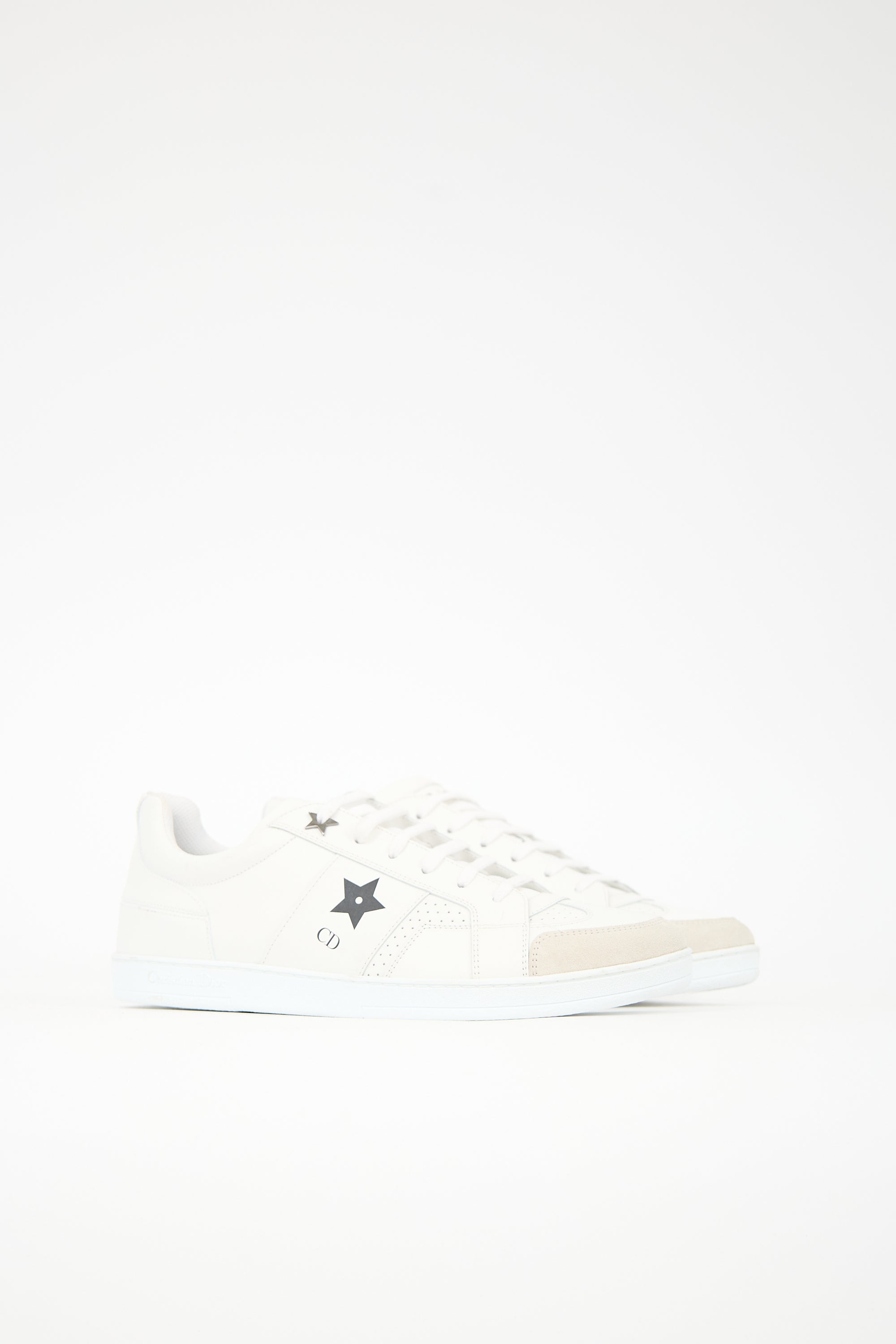 Pre-owned Dior white leather Star sneakers featuring rounded toe, perforated panelled upper, grey suede toe box panel, lace up vamp with gun metal star accents, logo tab at tongue, printed star logos at sides, and white rubber sole with embossed logo at quarter.