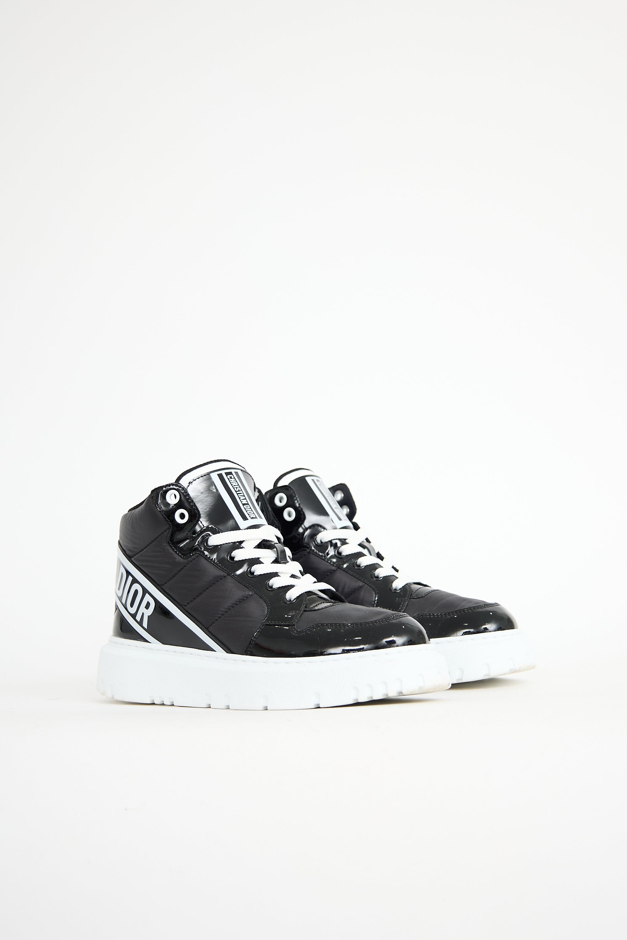 Pre-owned Dior black D-Player sneakers featuring rounded toe, padded nylon and patent leather upper, lace up instep, logo stripe panel at tongue and counter, and white rubber sole. Comes with original dust bag.