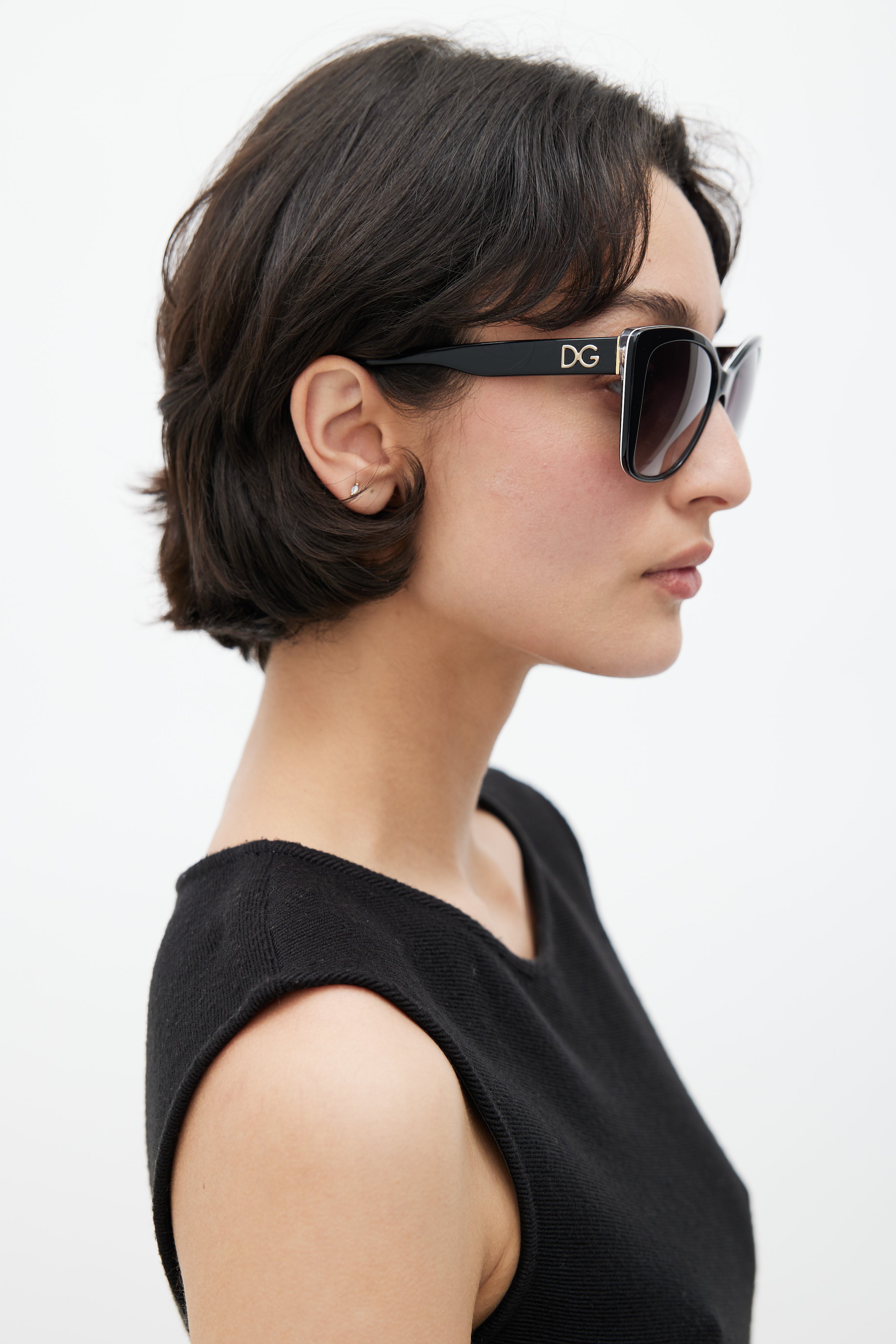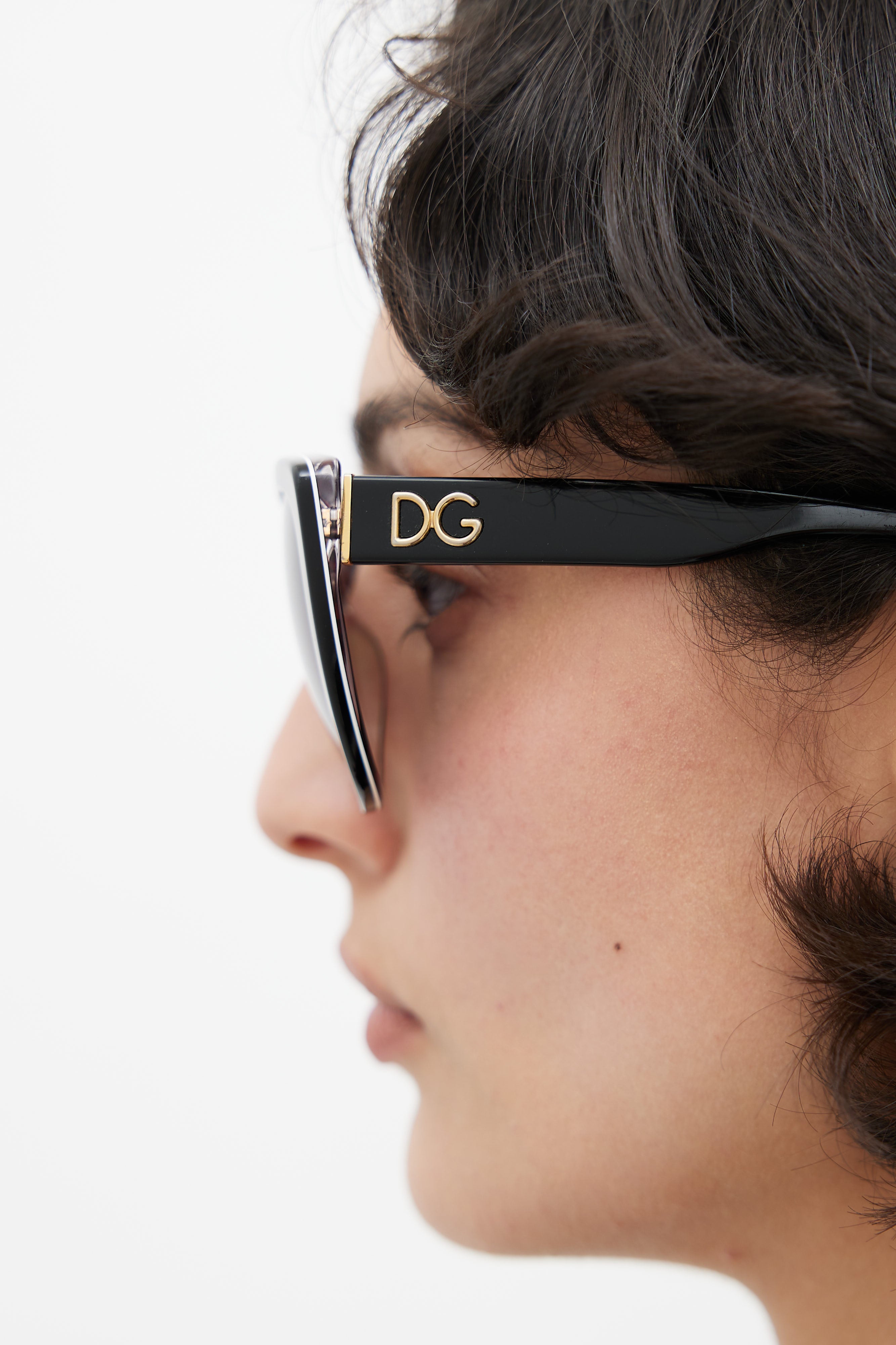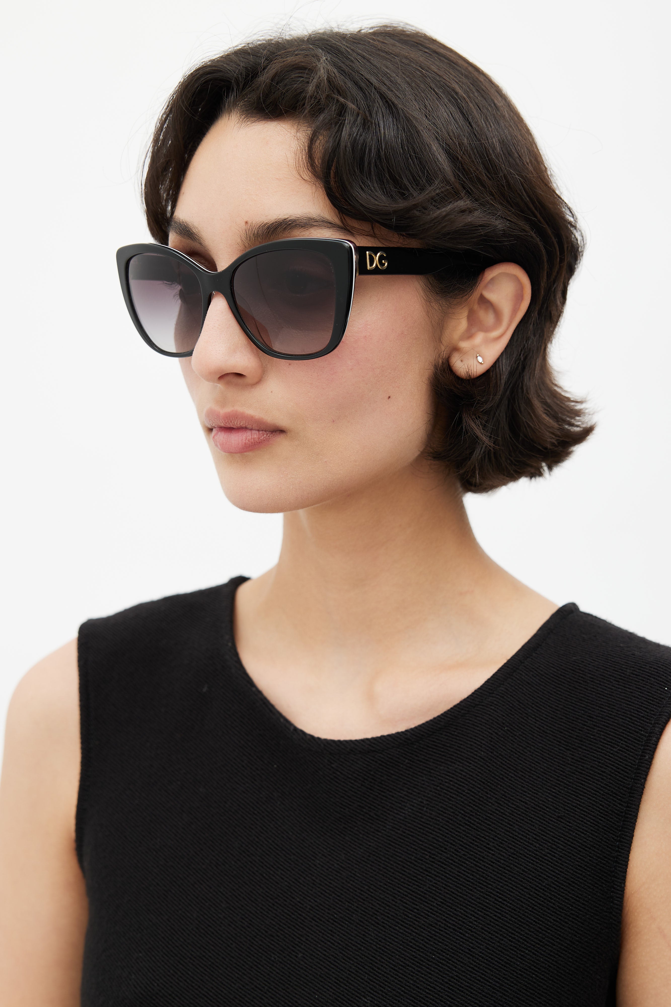 Pre-owned Dolce & Gabbana black DG4216 sunglasses featuring oversized cat eye frame, nose saddle bridge, gold tone logo at side, and floral print reversed.