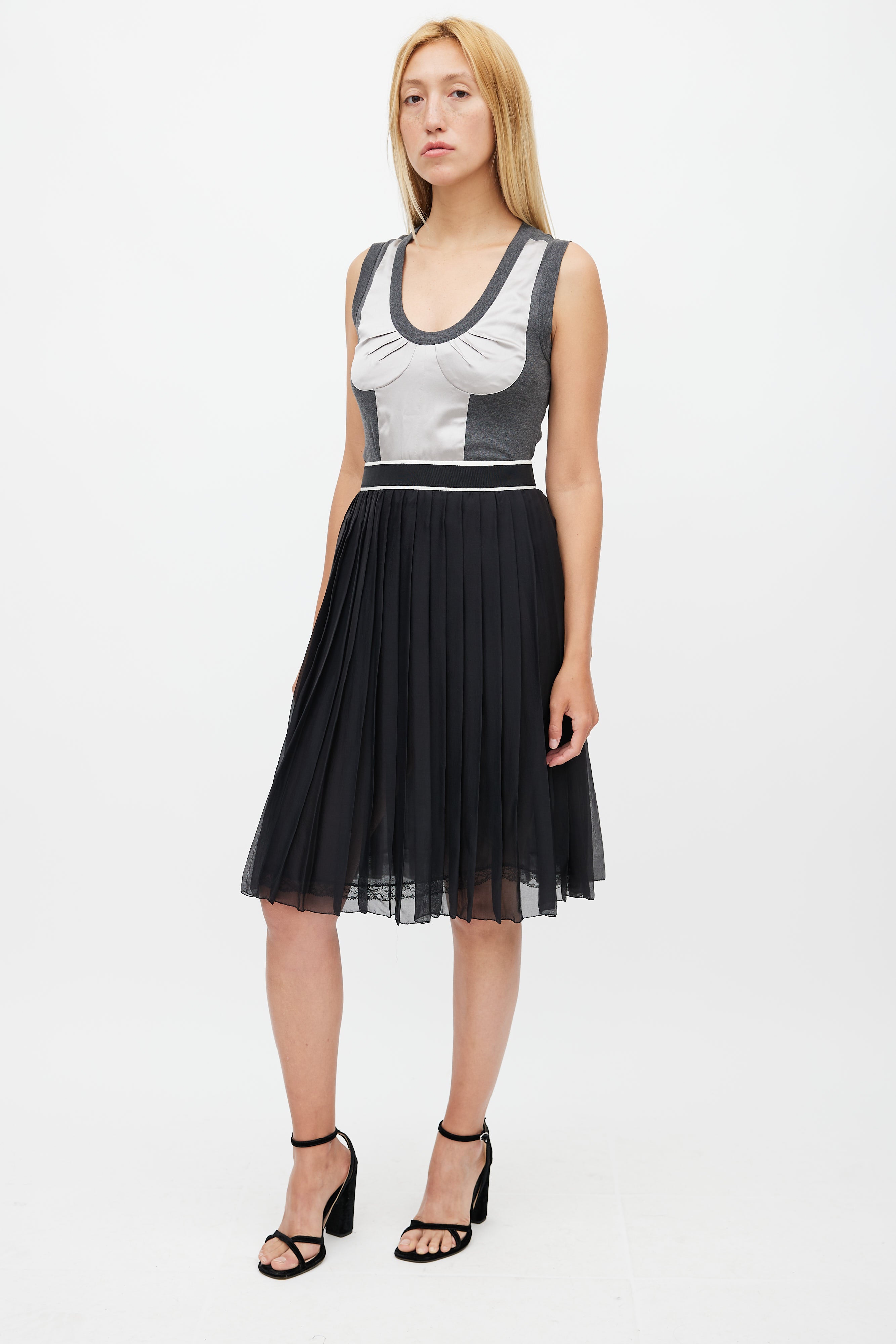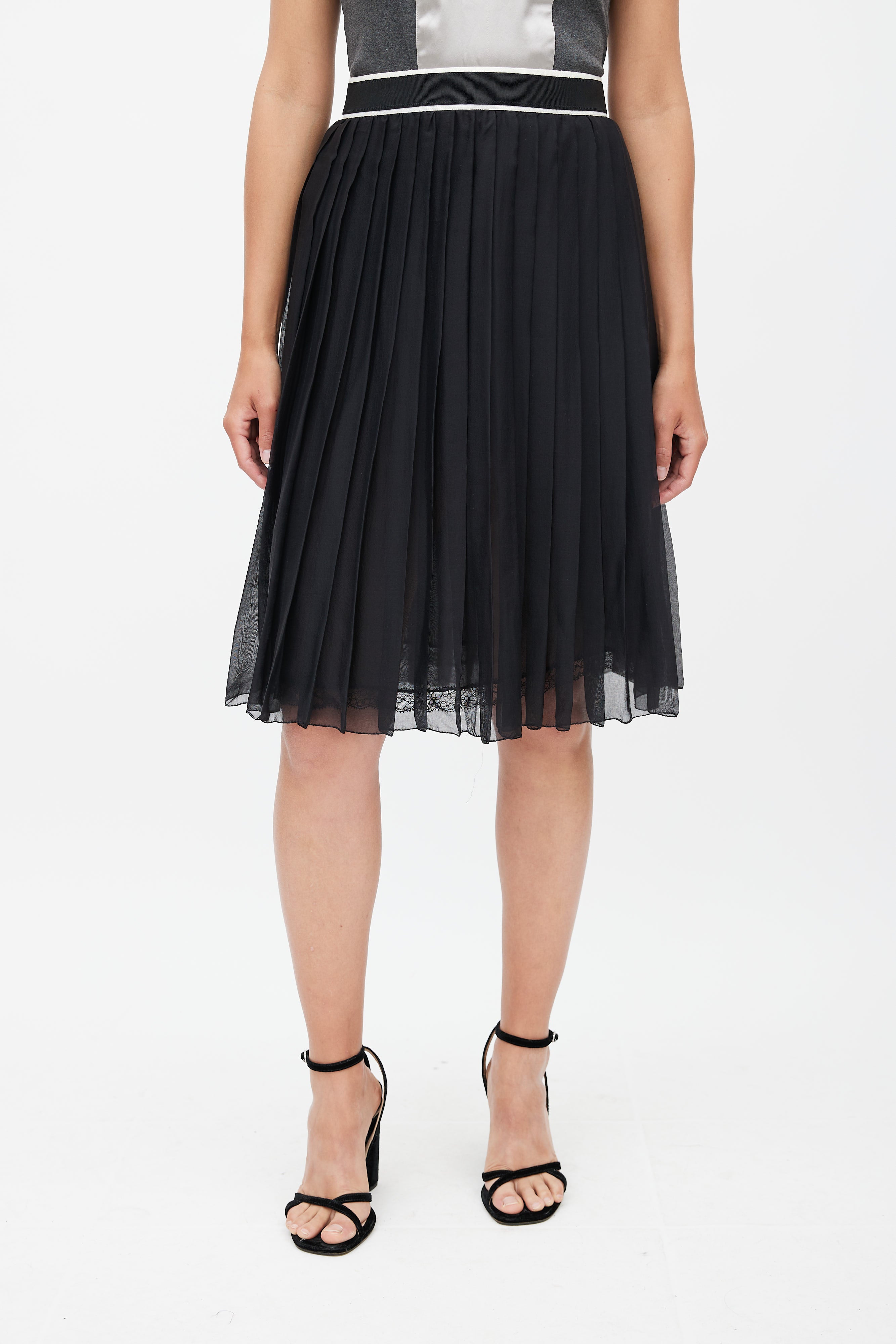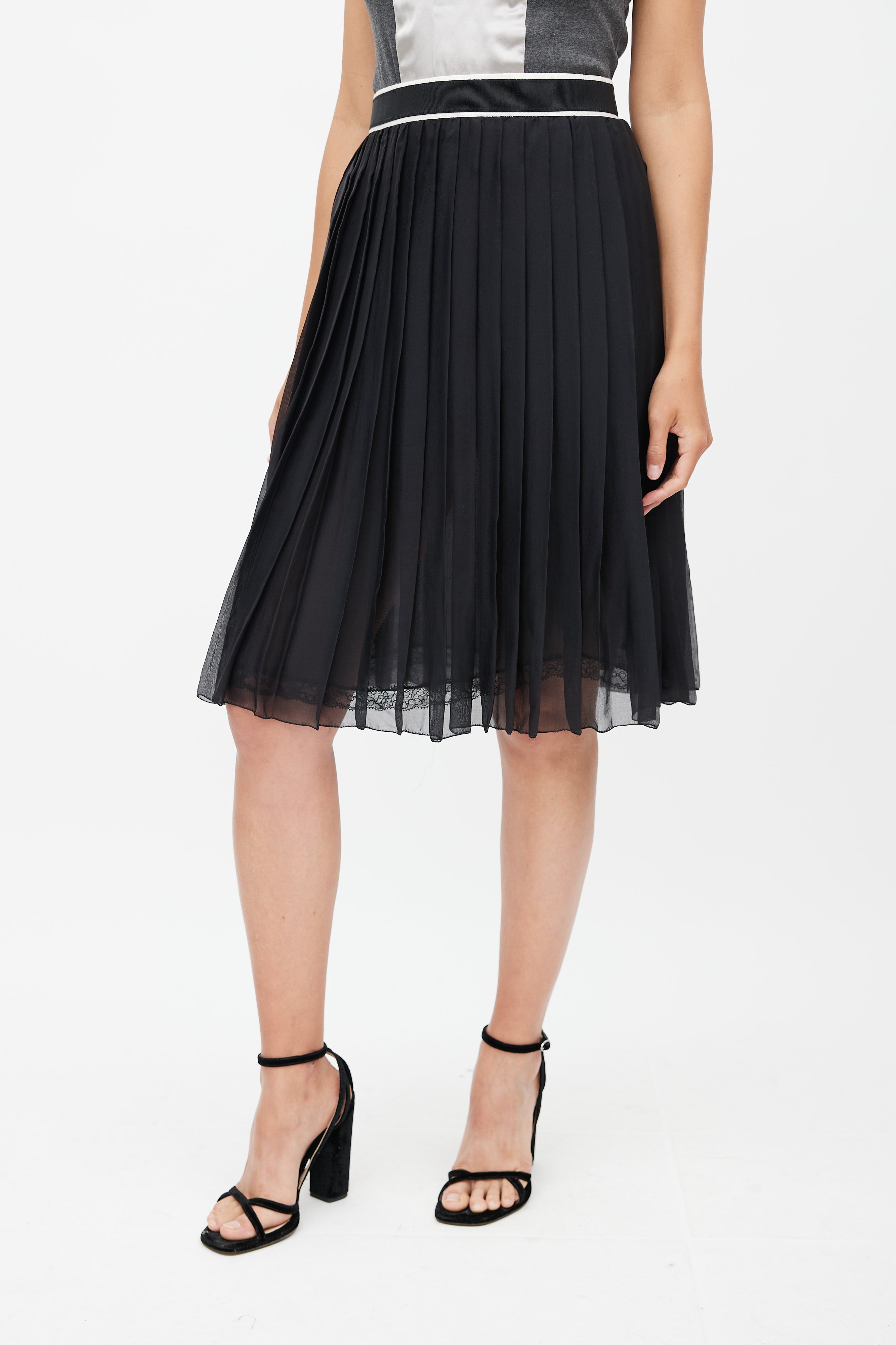 Pre-owned D&G black sheer silk skirt featuring elasticized waist with white stripe, pleated overlay, and silver tone zip closure at back.