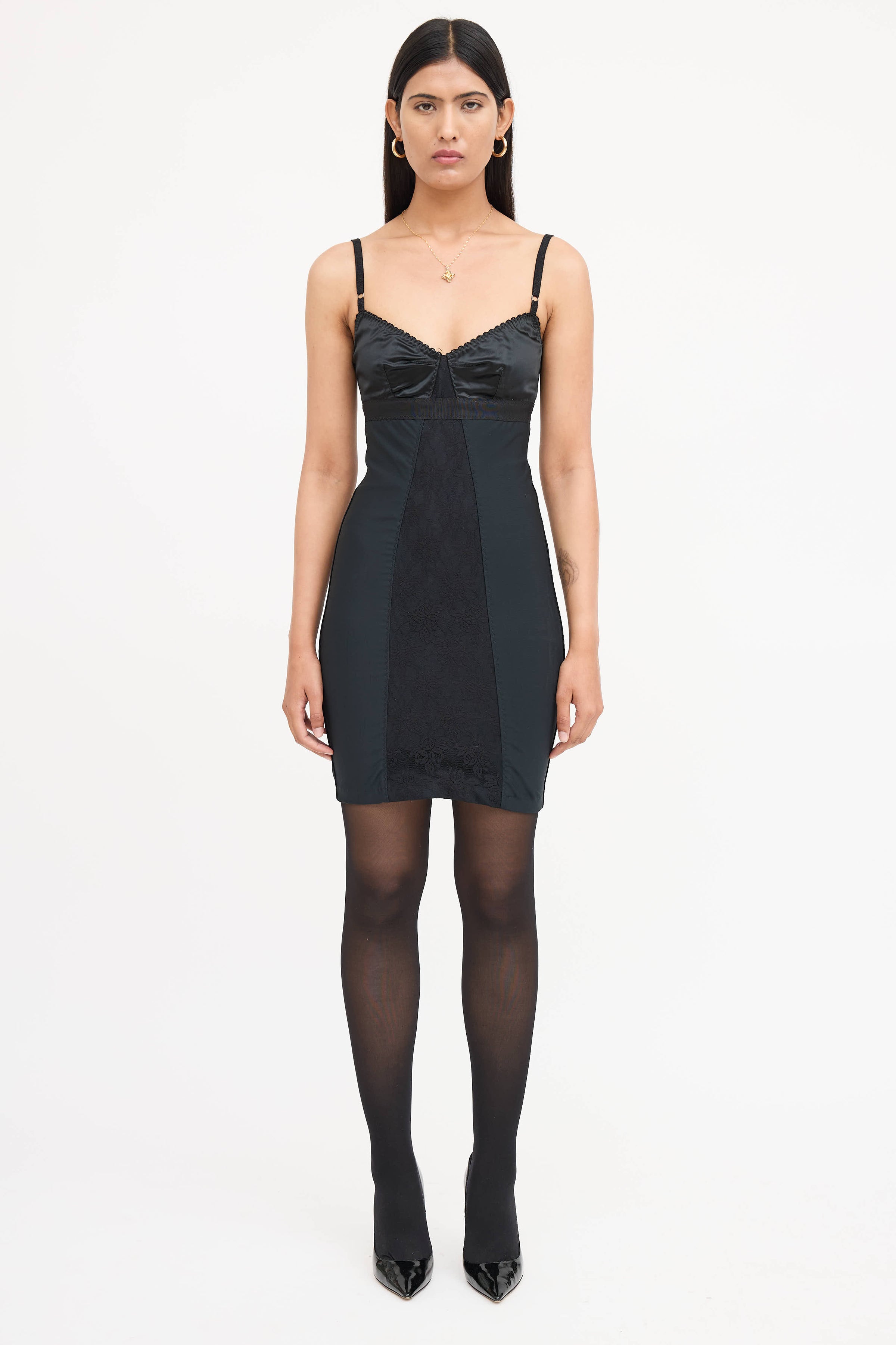 Pre-owned D&G black sleeveless dress featuring sweetheart neckline, adjustable shoulder straps, lace paneling at front, and zip at back.