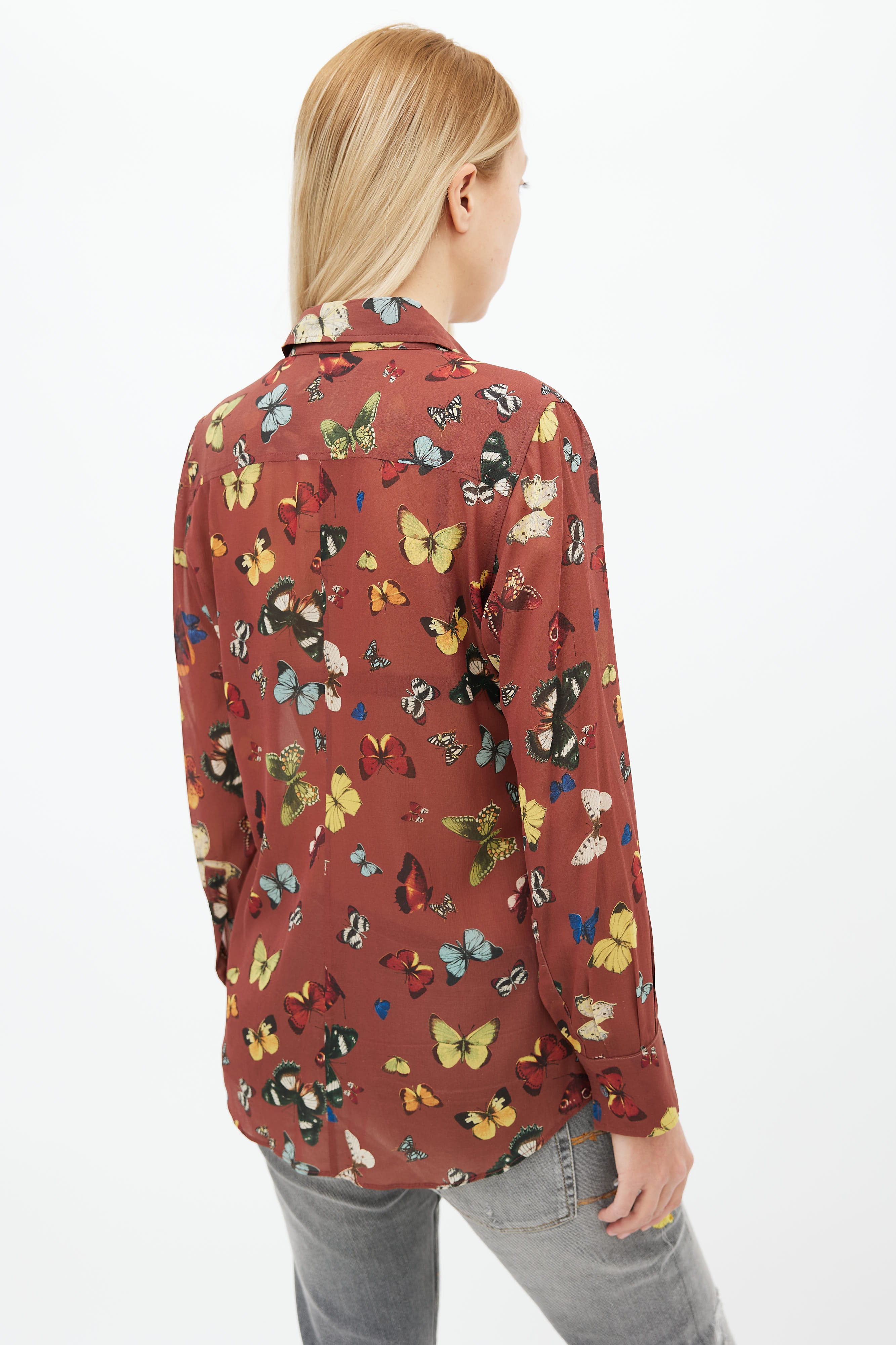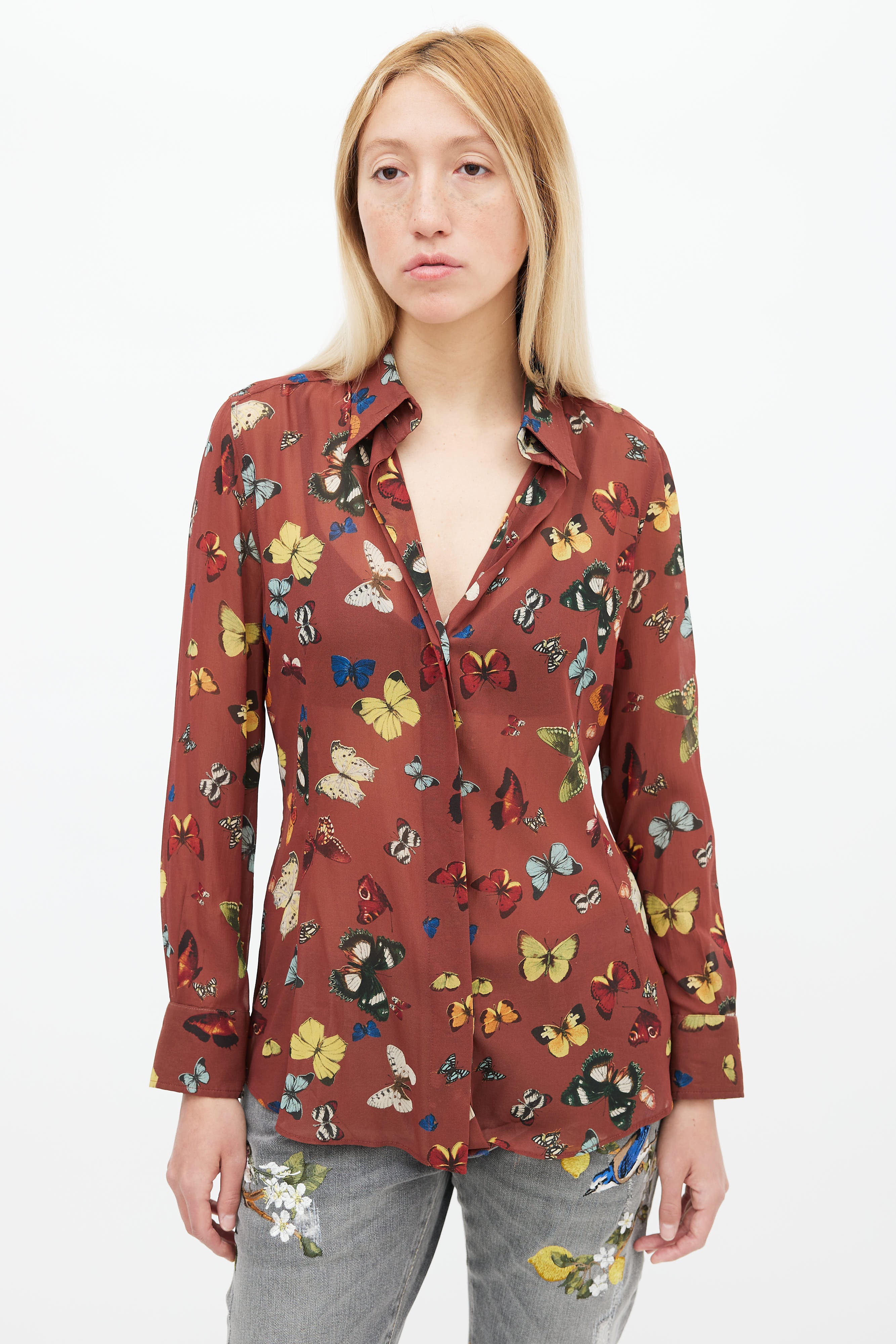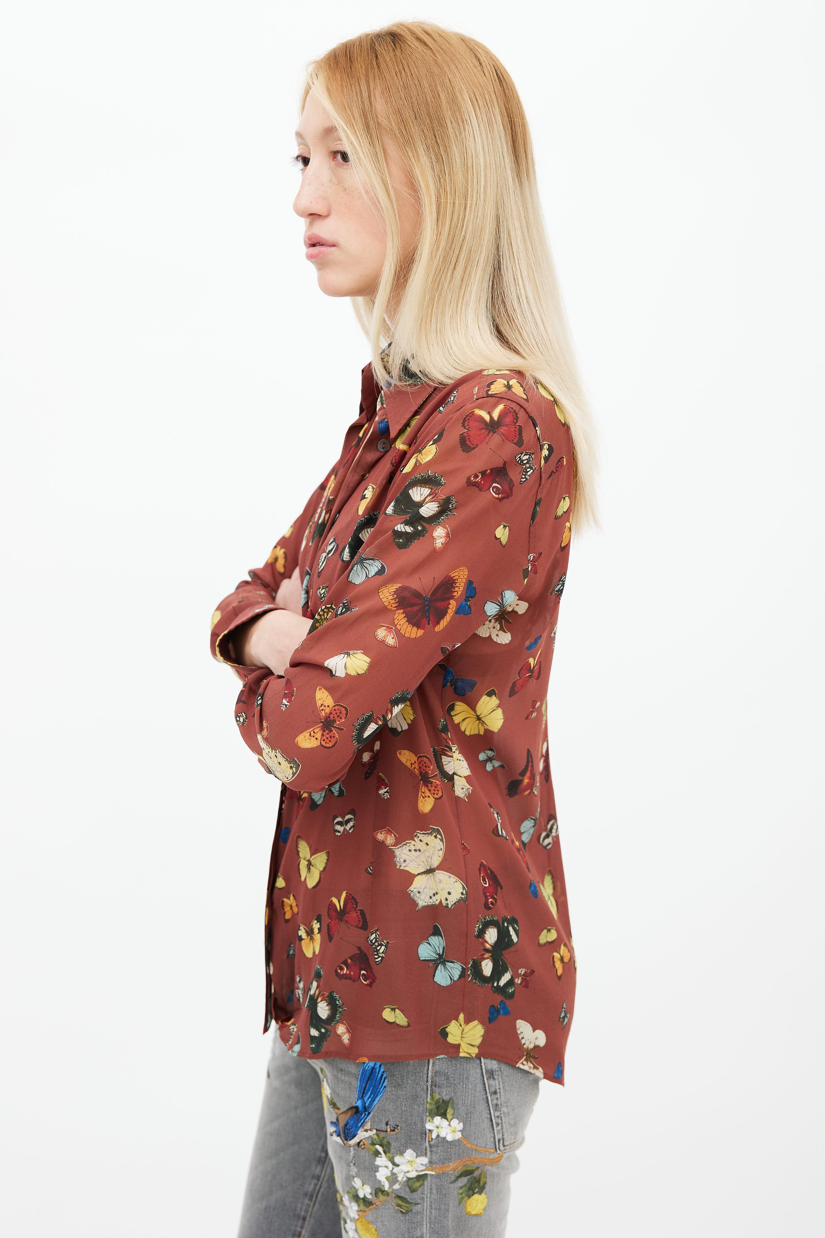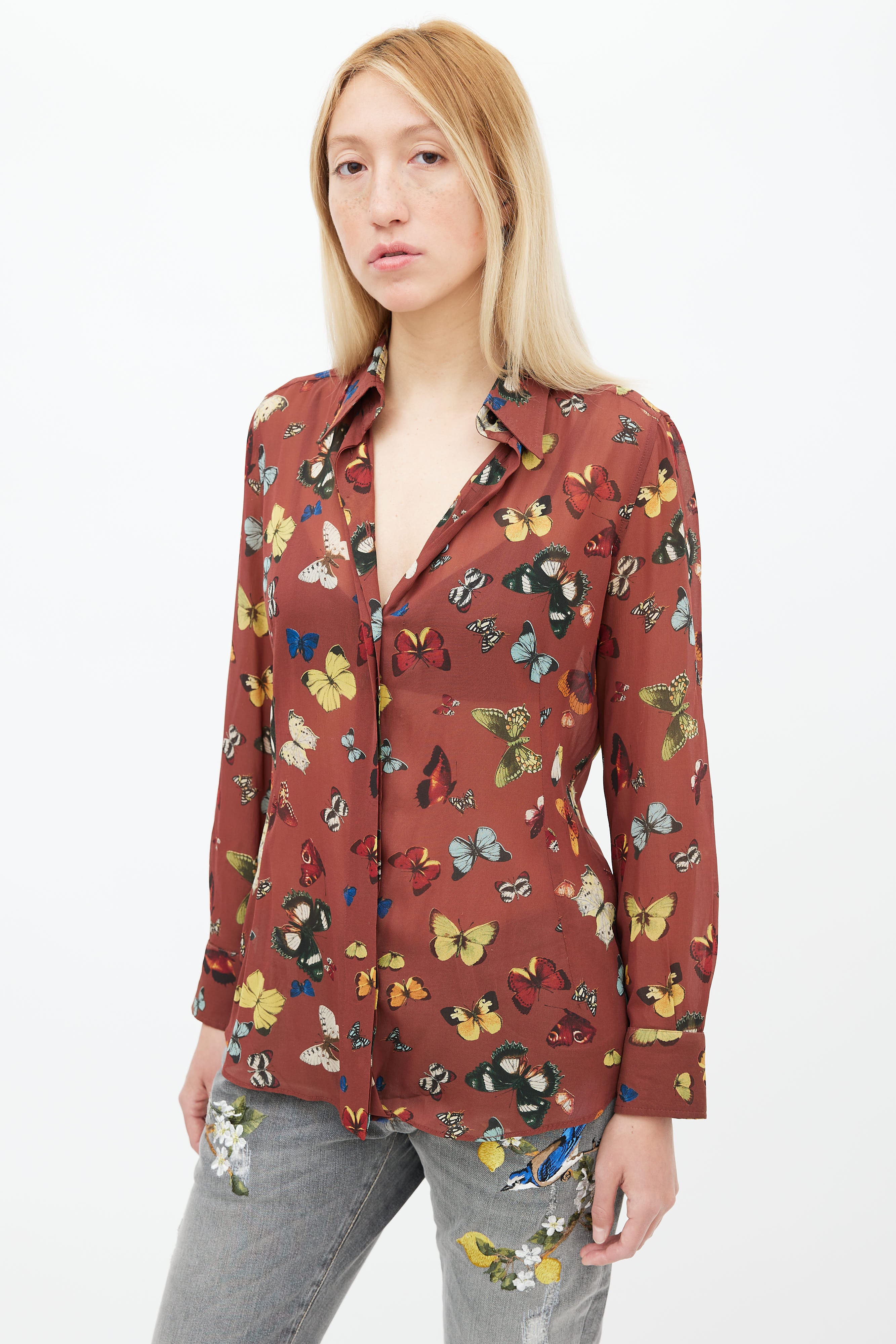 Pre-owned Dolce & Gabbana shirt in brown featuring multicolor butterfly print throughout, pointed collar, concealed button up front, and long sleeves.