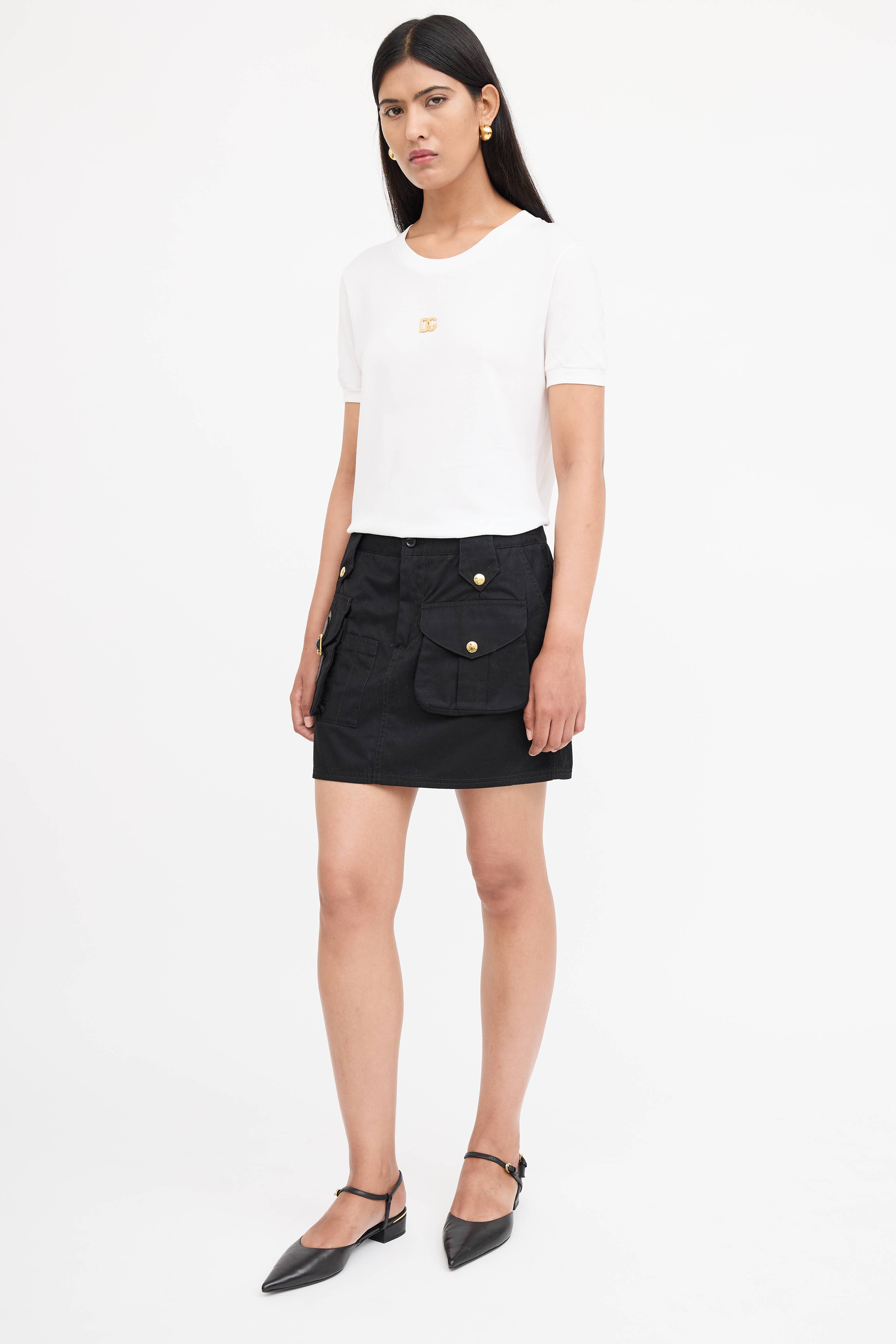 Pre-owned Dolce & Gabbana black mini skirt featuring zip fly, cargo pockets, adjustable buckle at back, gold tone hardware, and slit pockets at hip.