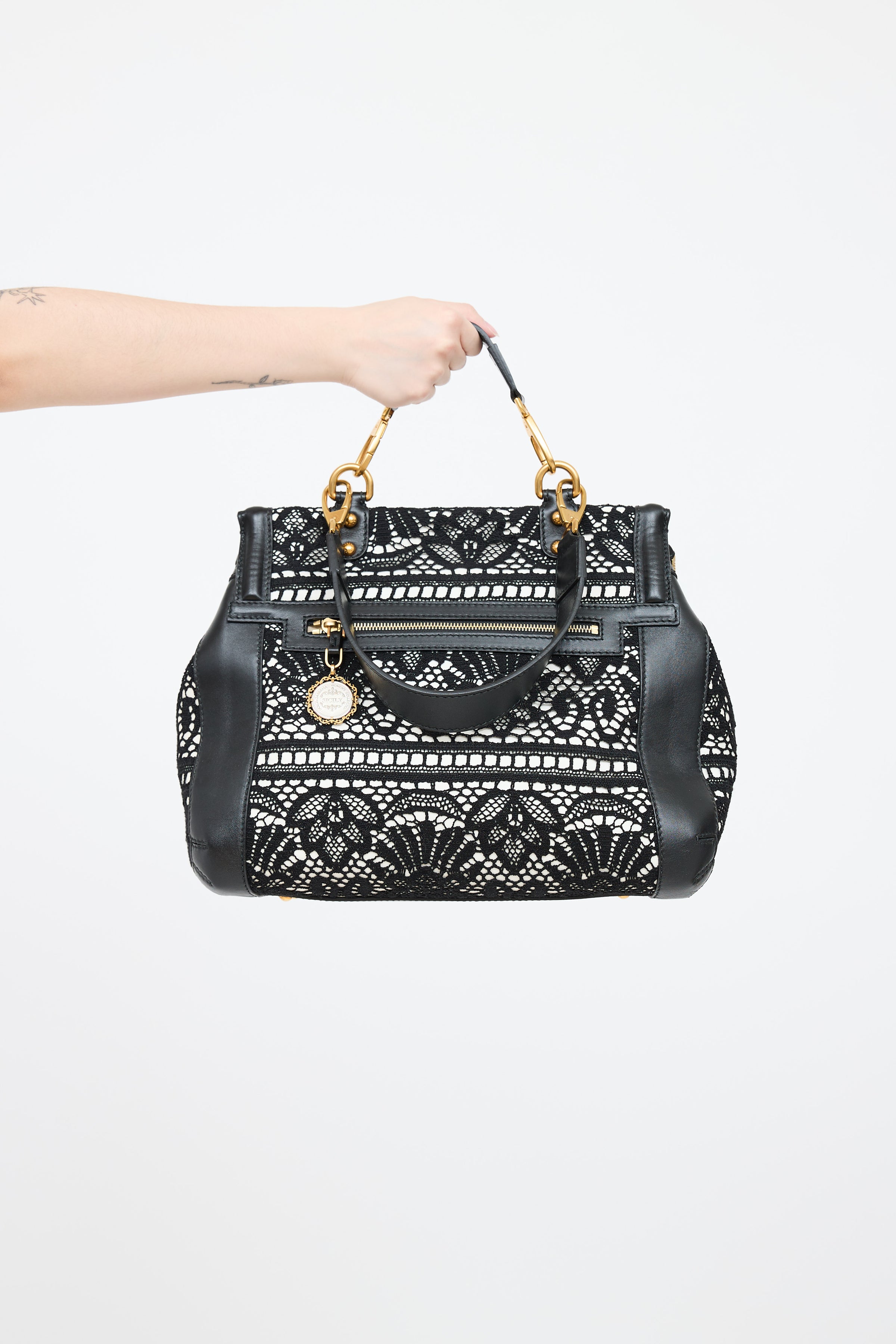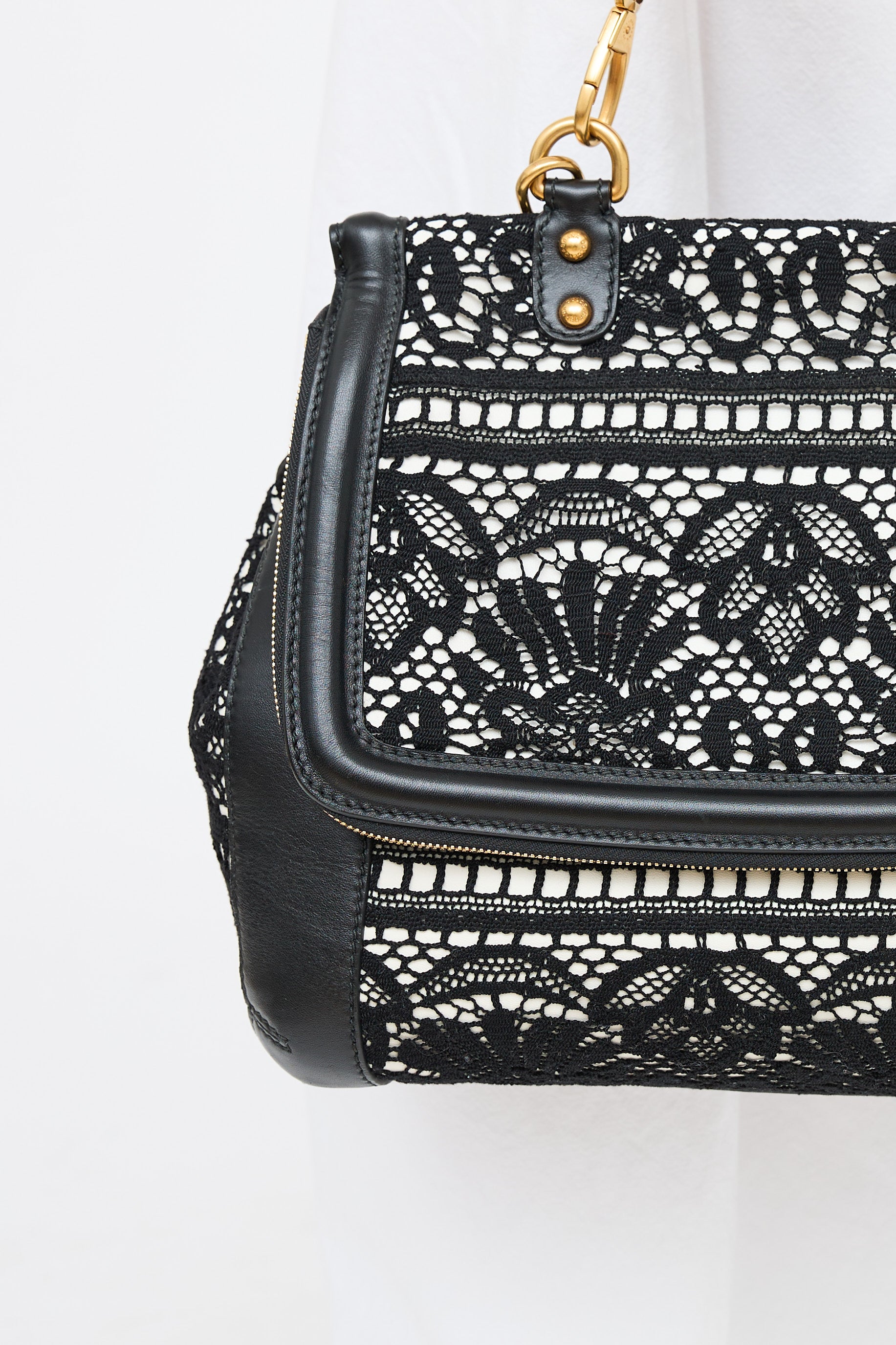 Pre-owned Dolce & Gabbana black and white Miss Sicily top handle bag featuring dual detachable flat leather top hands with gold tone hardware, structured base with metal feet, exterior zip pocket at back, top flap zip pocket with logo charms and one main compartment with one zip and slip pocket.