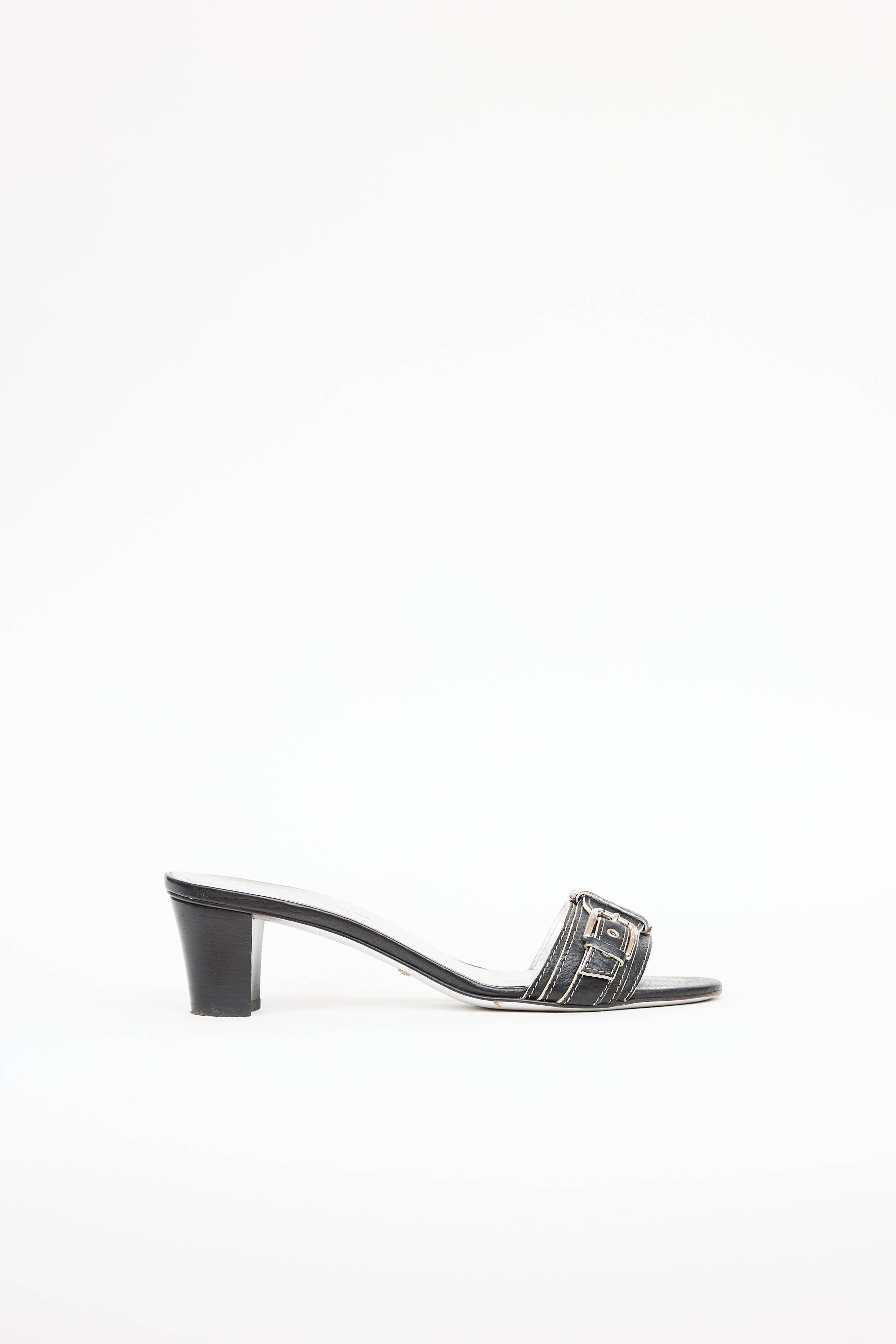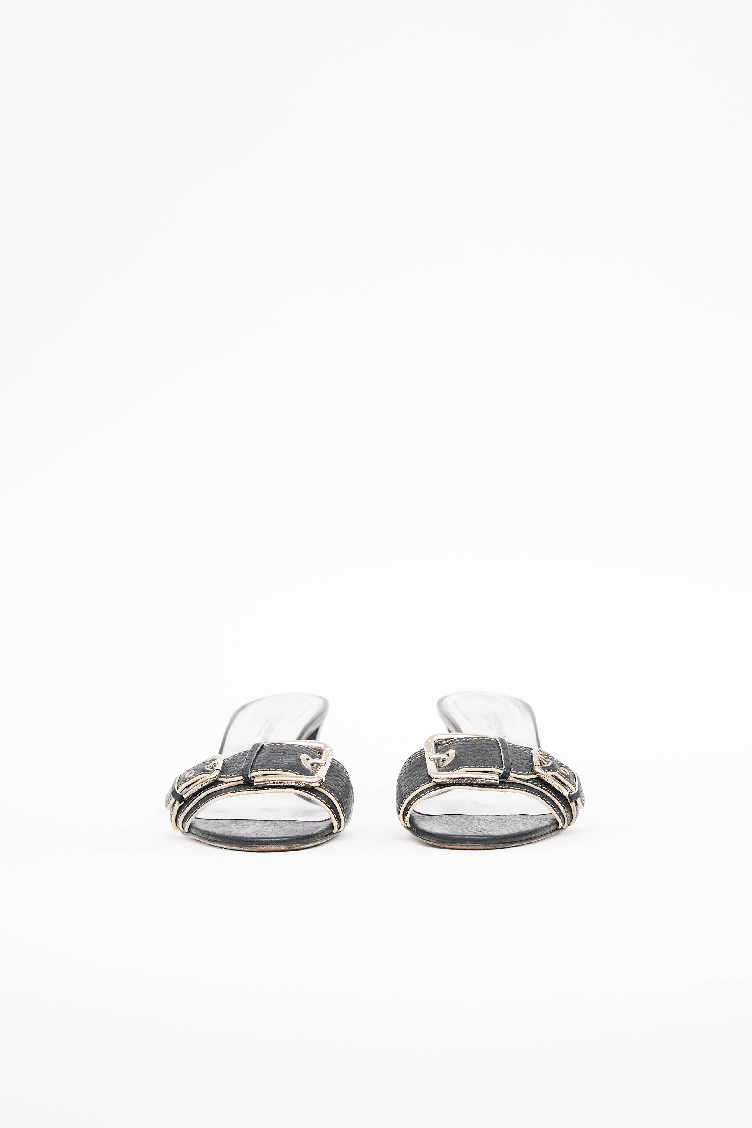 Pre-owned Dolce & Gabbana black mules featuring a rounded open toe, leather upper, slip on entry, silver toned buckle strap at vamp and a short block heel.