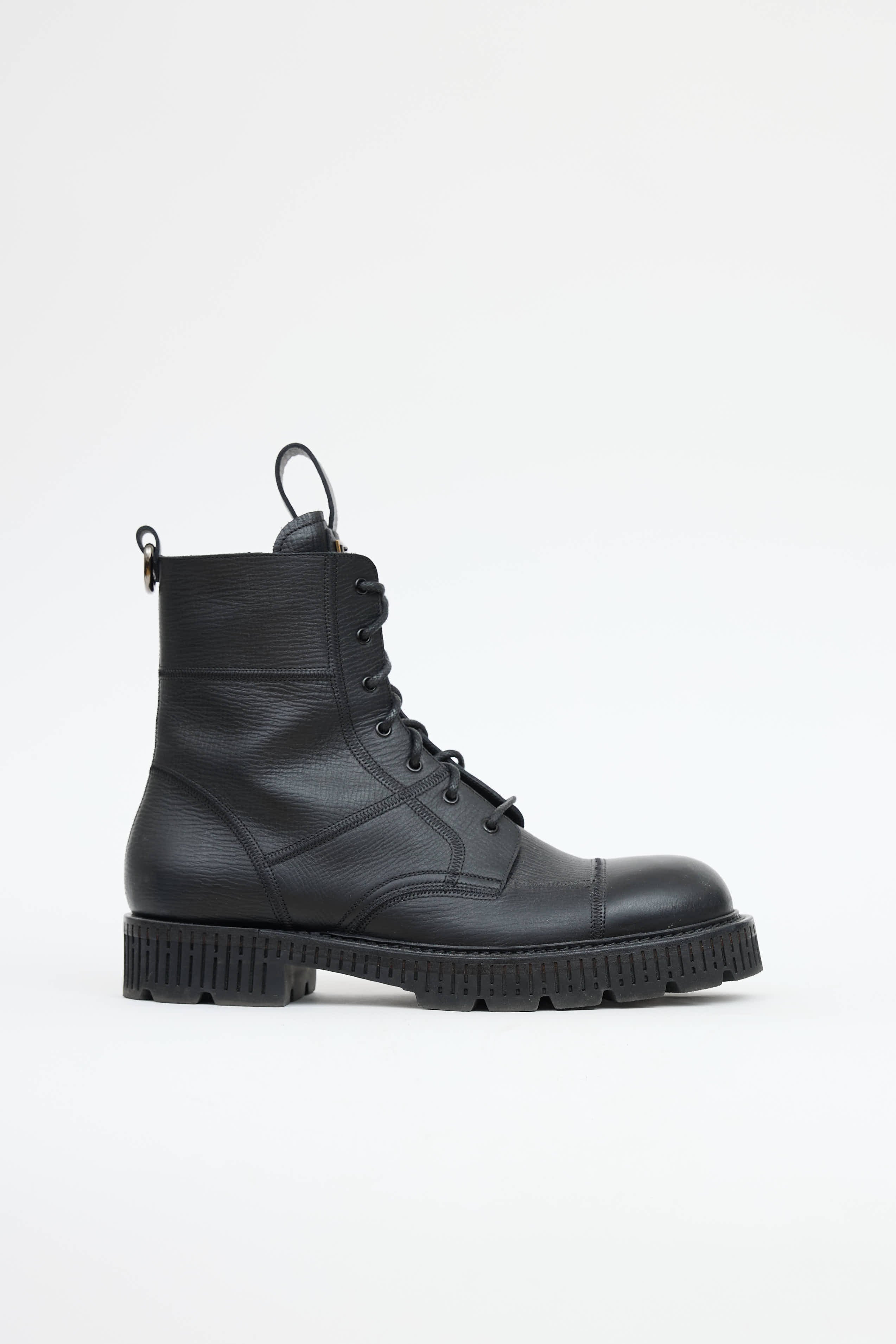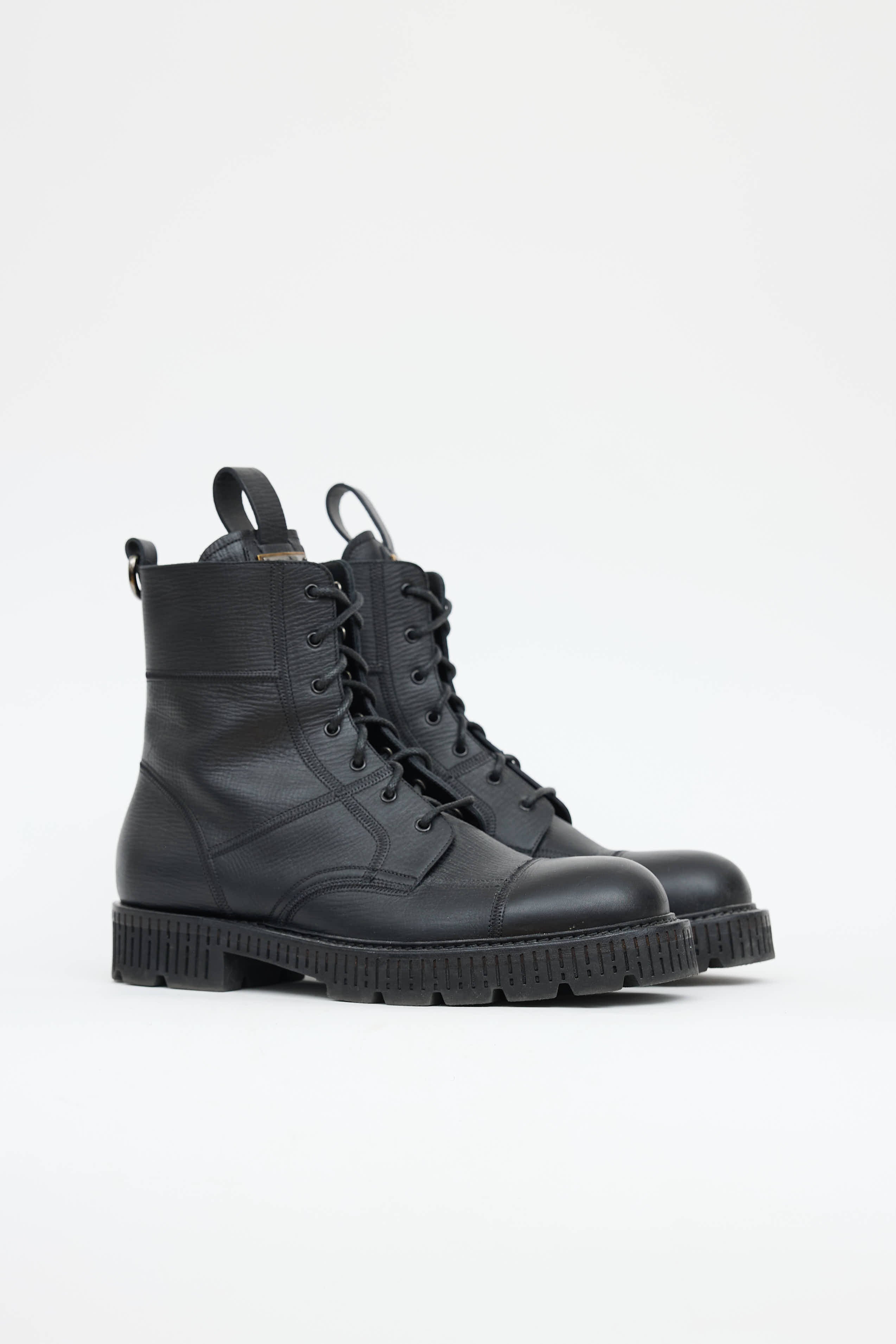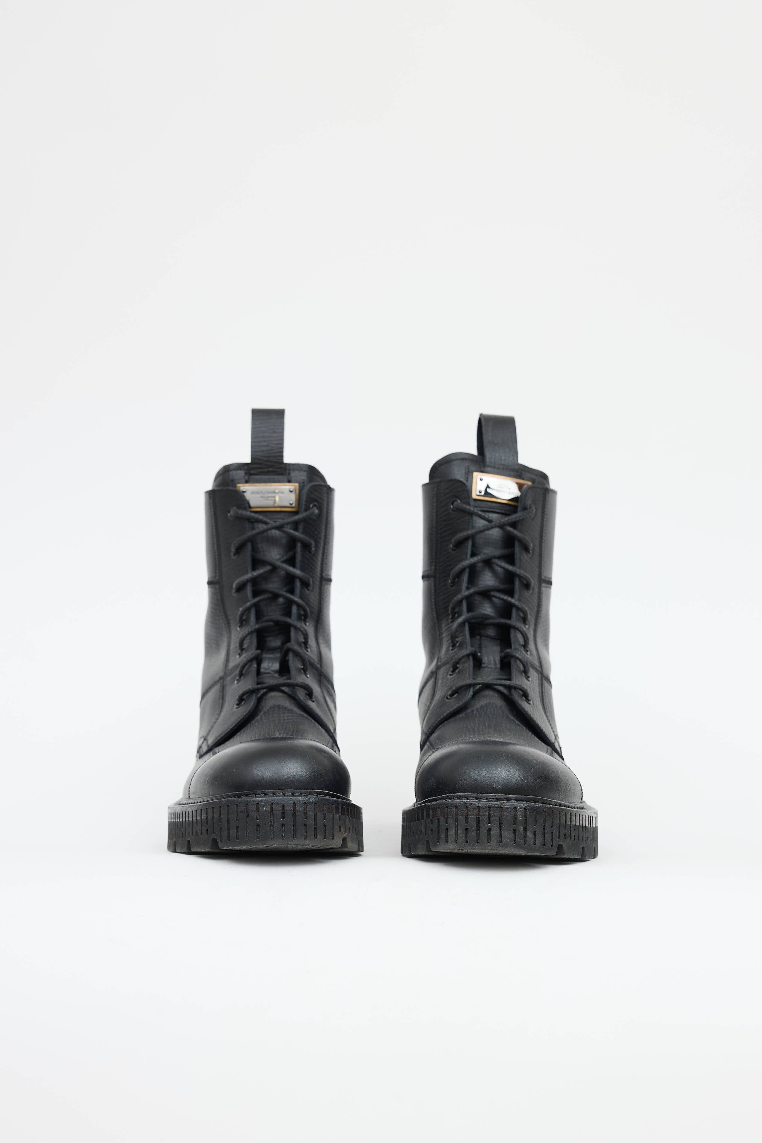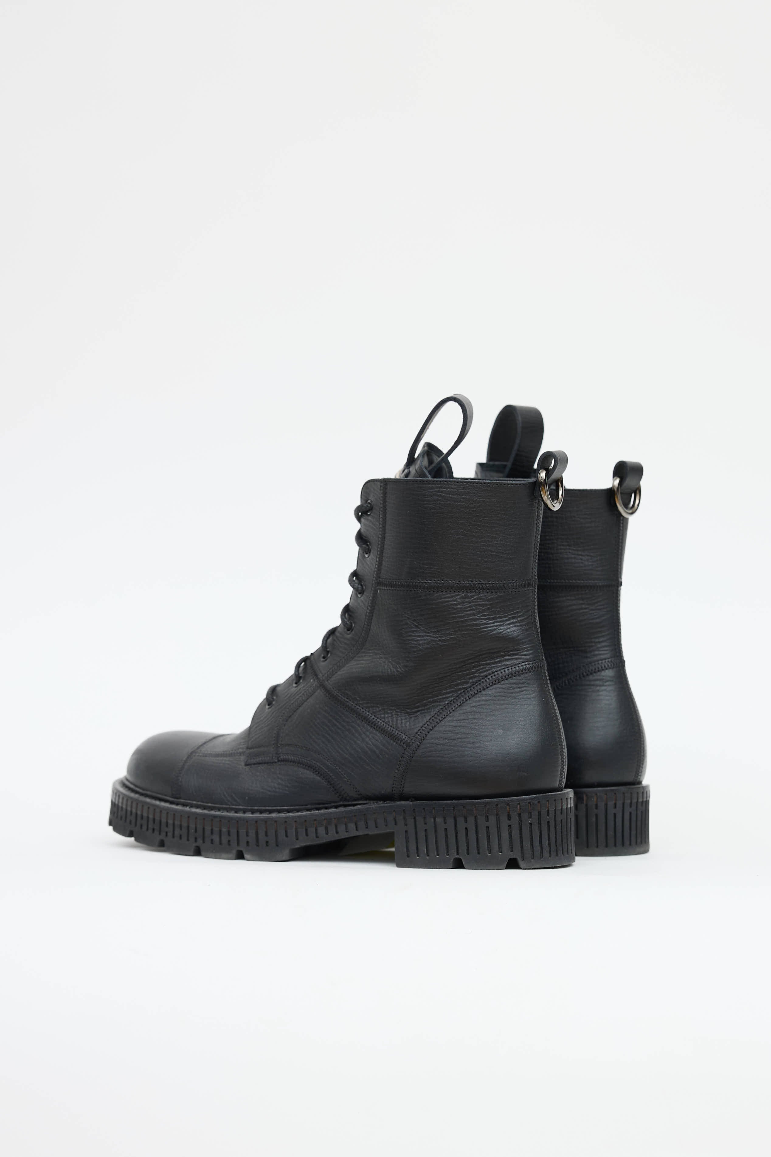 Pre-owned Dolce & Gabbana men's black combat boot featuring rounded toe, rubber treaded outsole, lace up vamp, silver tone logo plaque at tongue, and pull tab with D-rings at shaft.