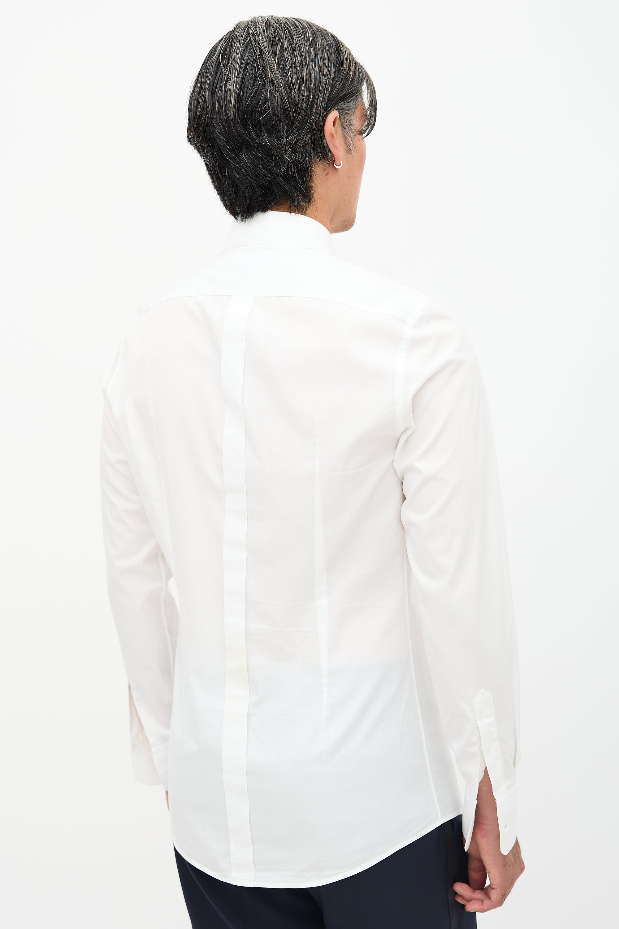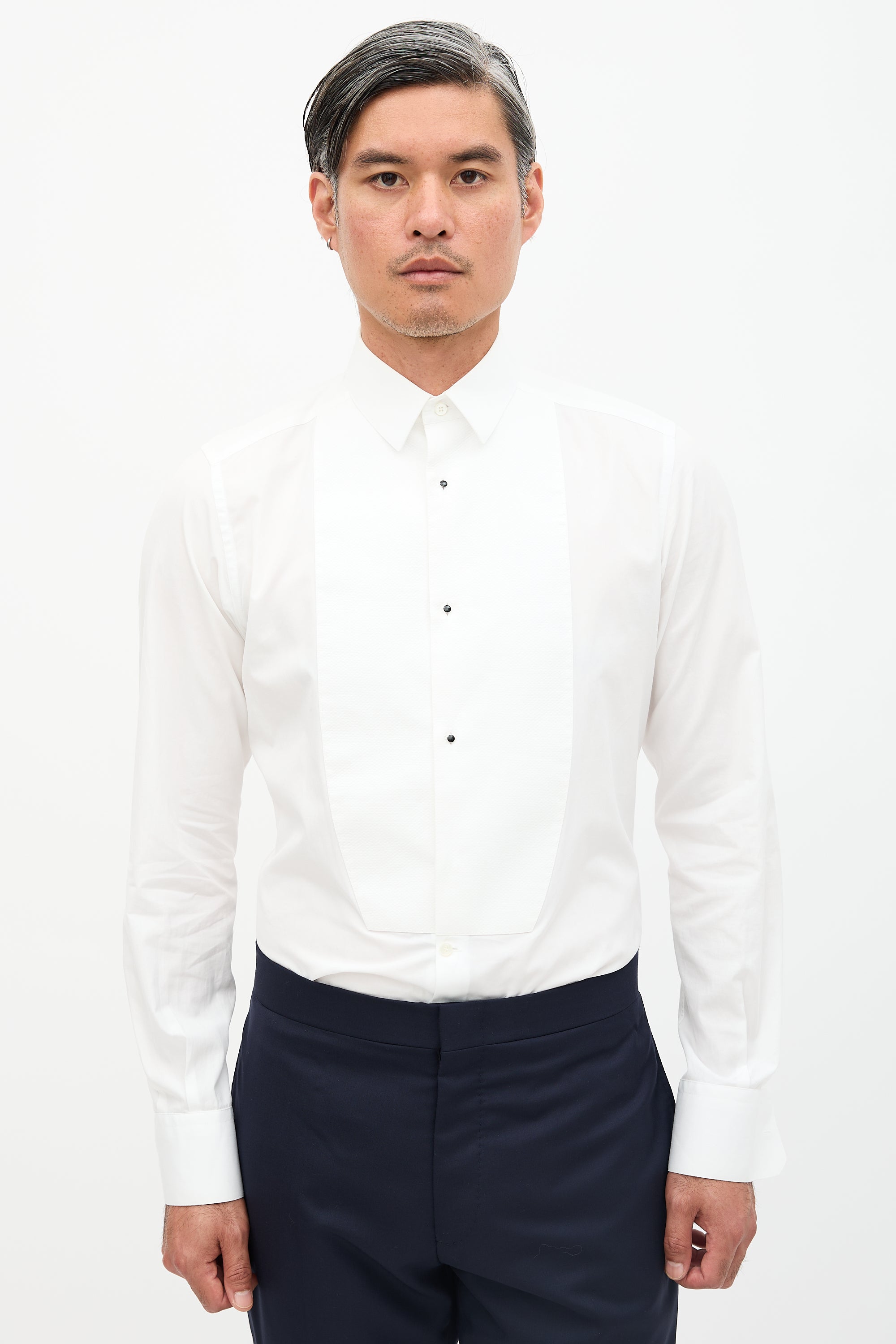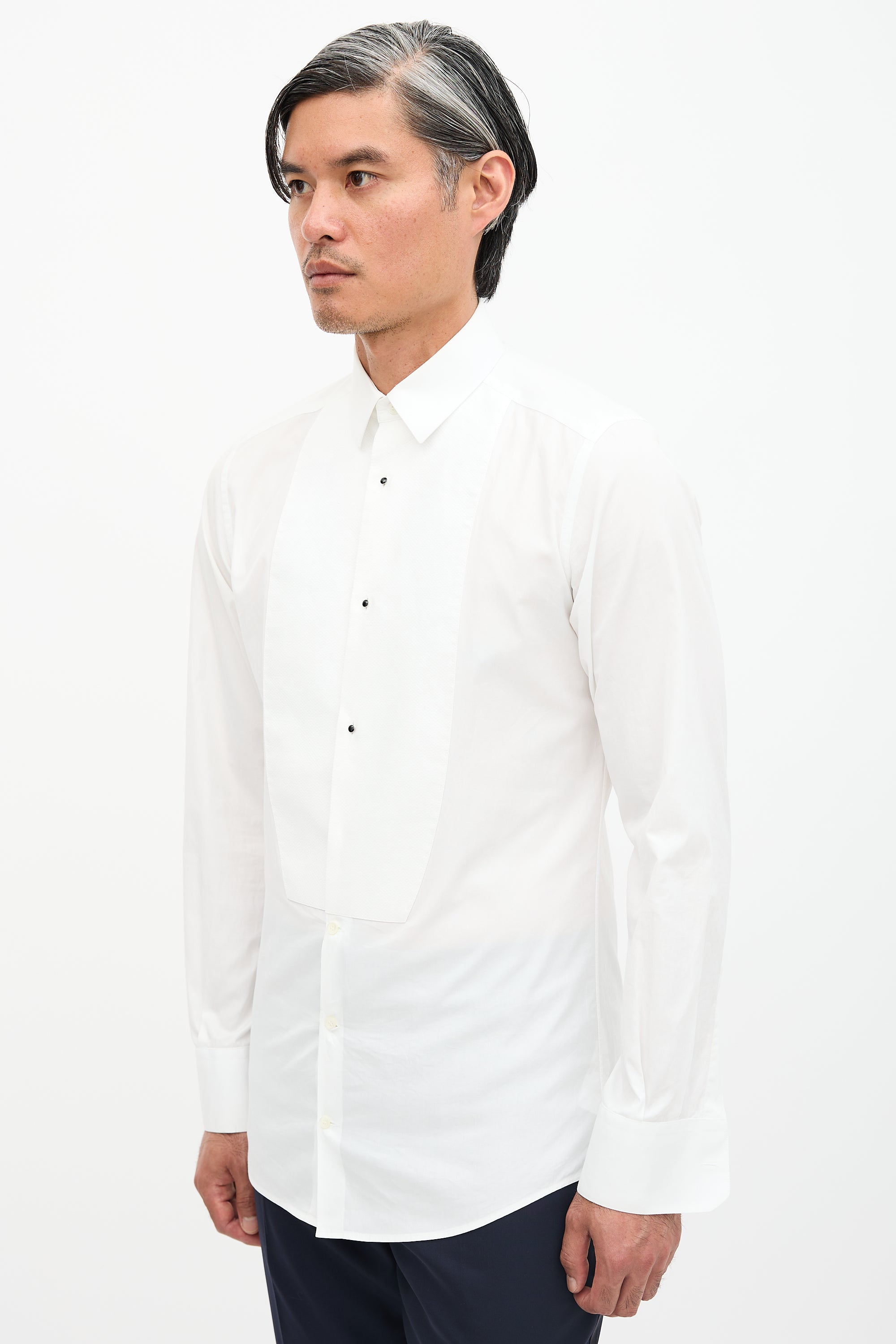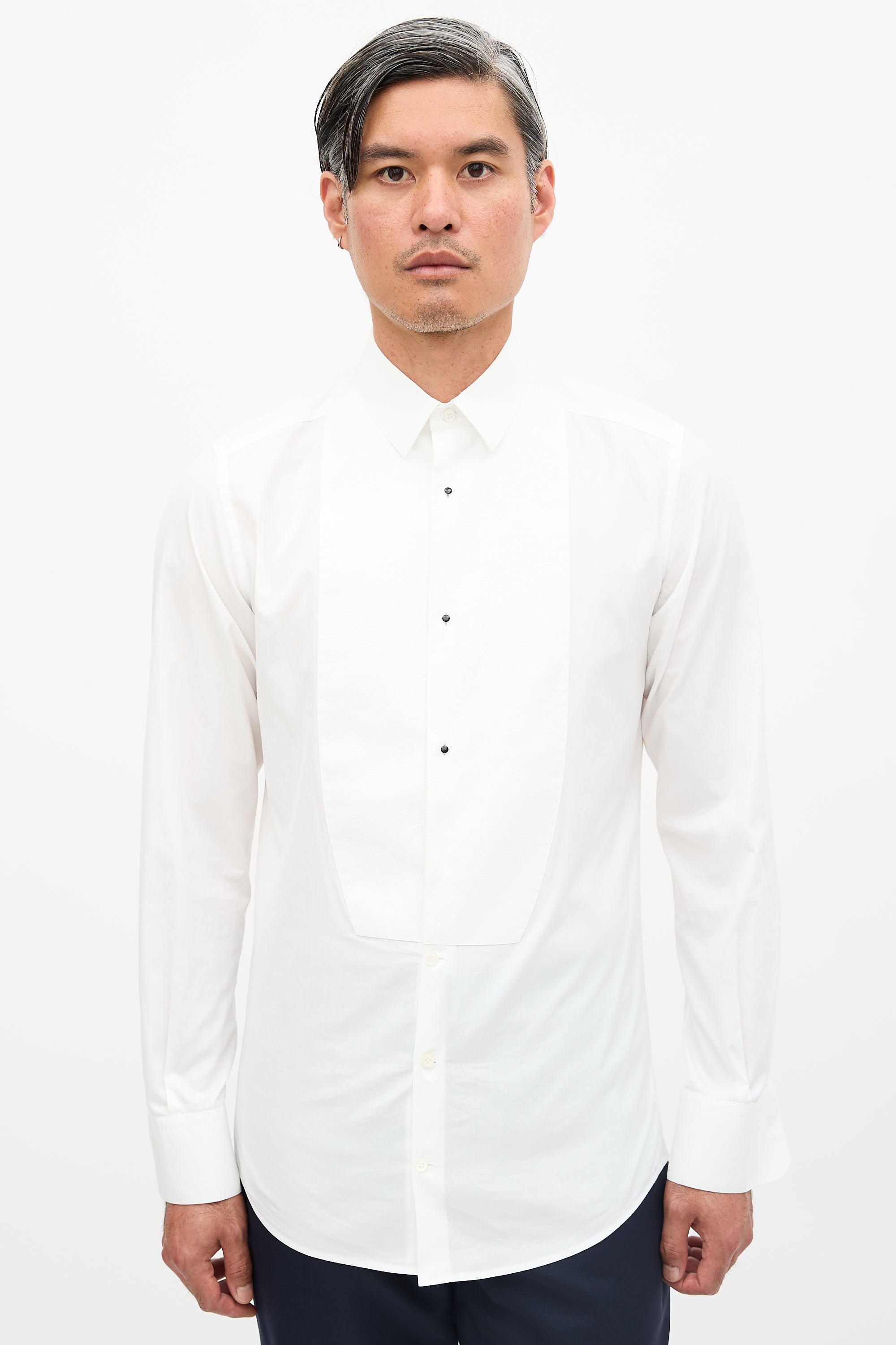 Pre-owned Dolce & Gabbana white tuxedo shirt featuring a spread collar, pique bib placket with traditional metal stud fastenings, box pleated back, and french cuffs.