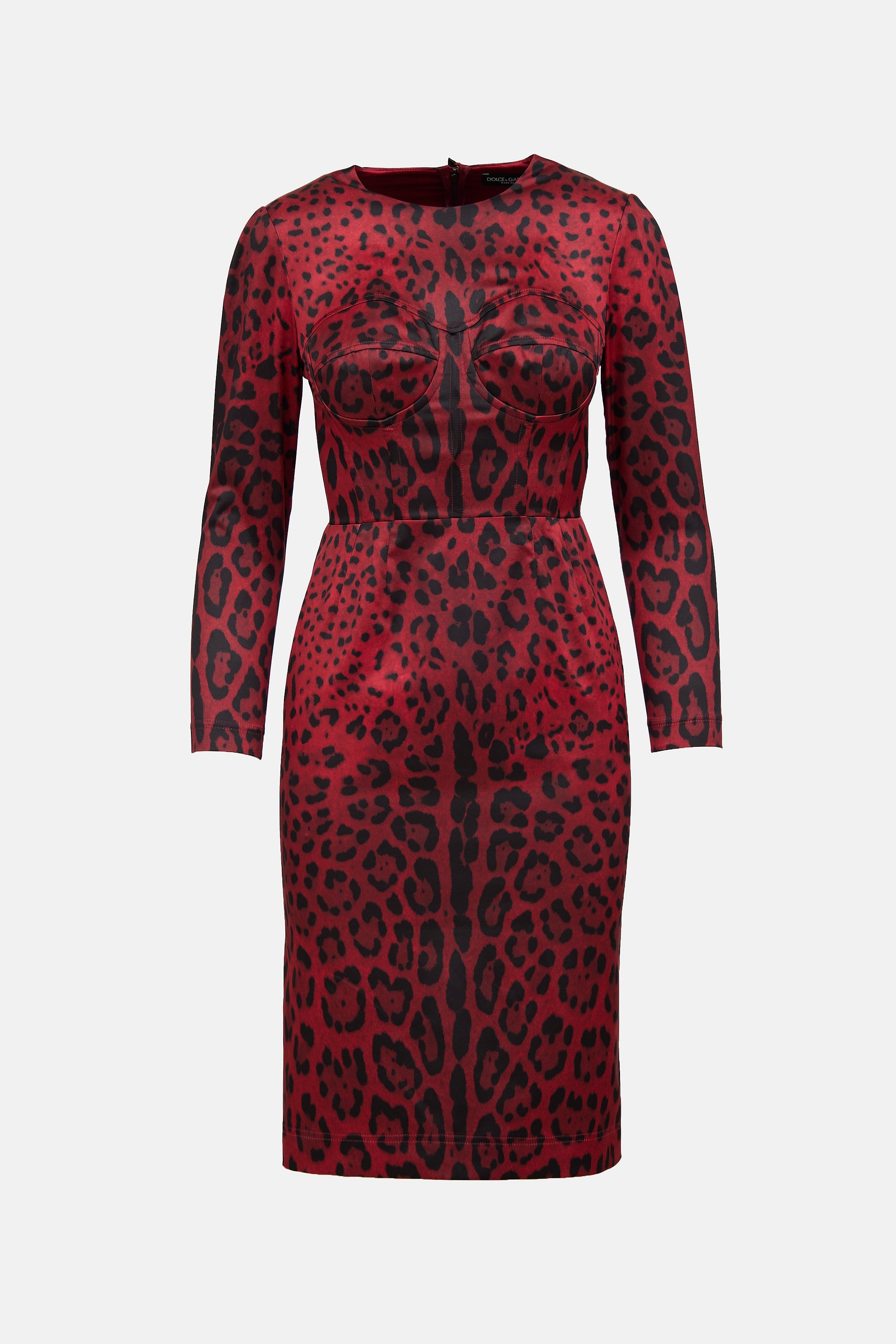 Pre-owned Dolce & Gabbana red and black dress featuring round neckline, leopard print, molded cup wit underwiring, long sleeves, and zip closure at back. Lined.