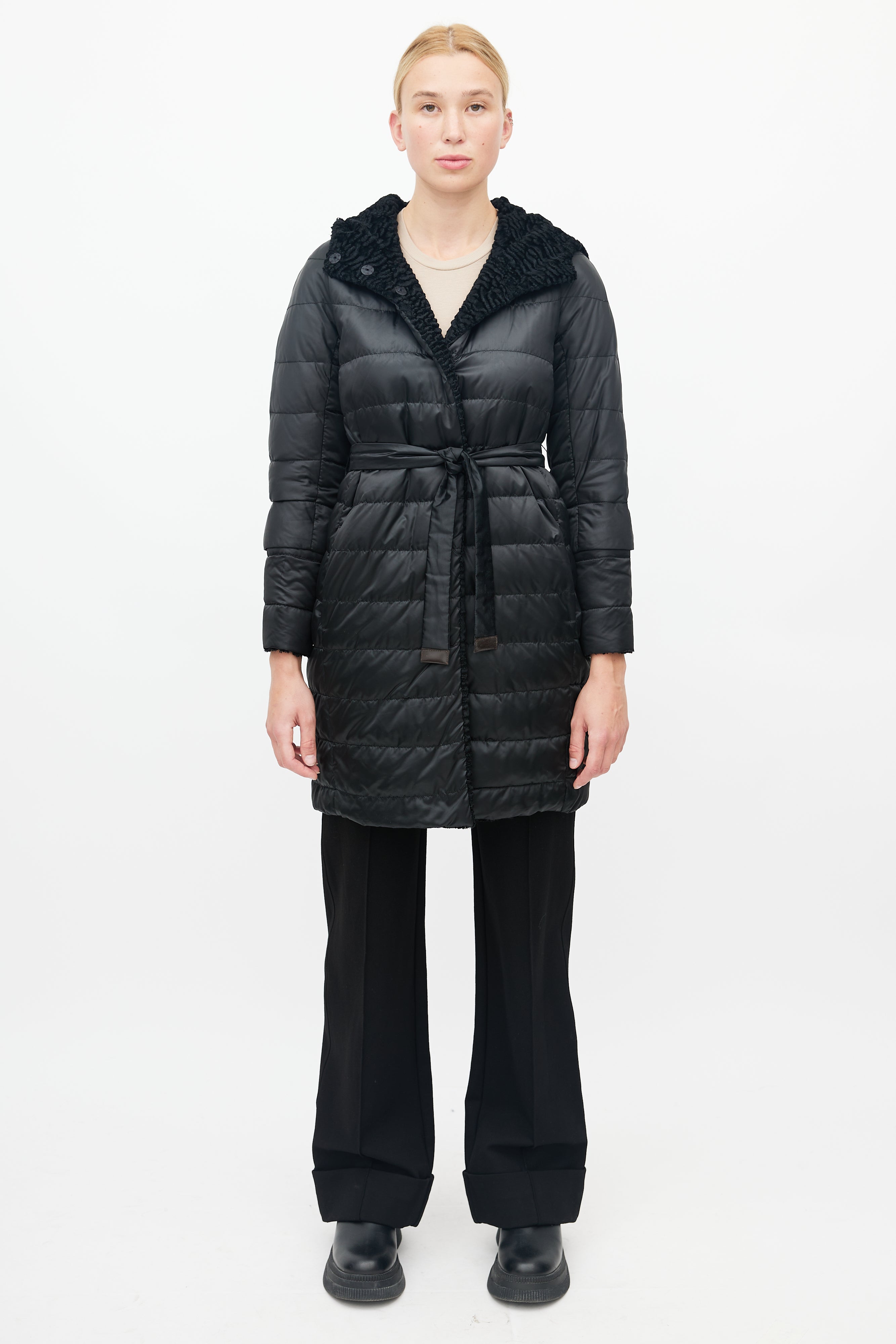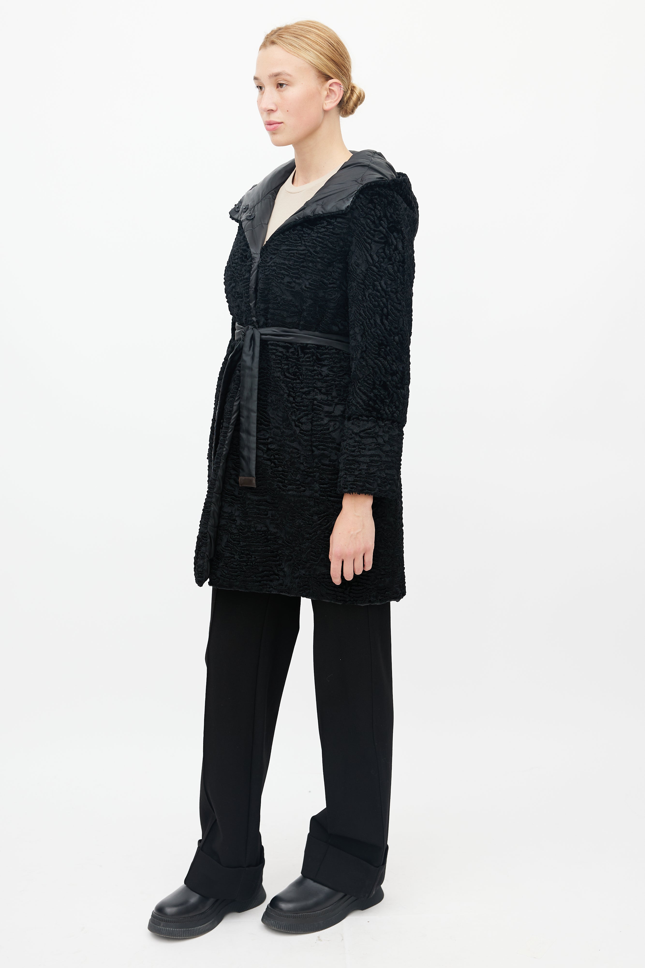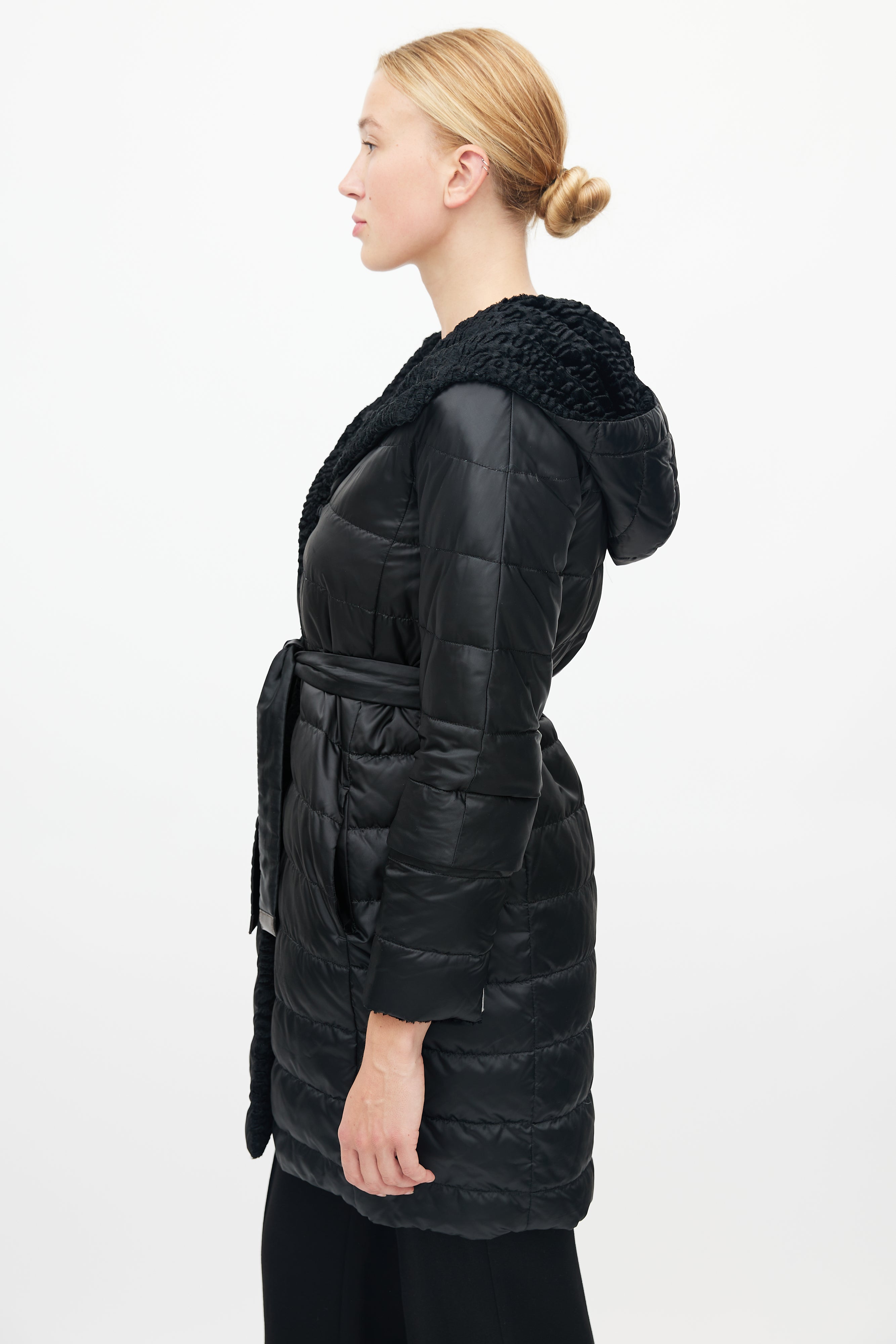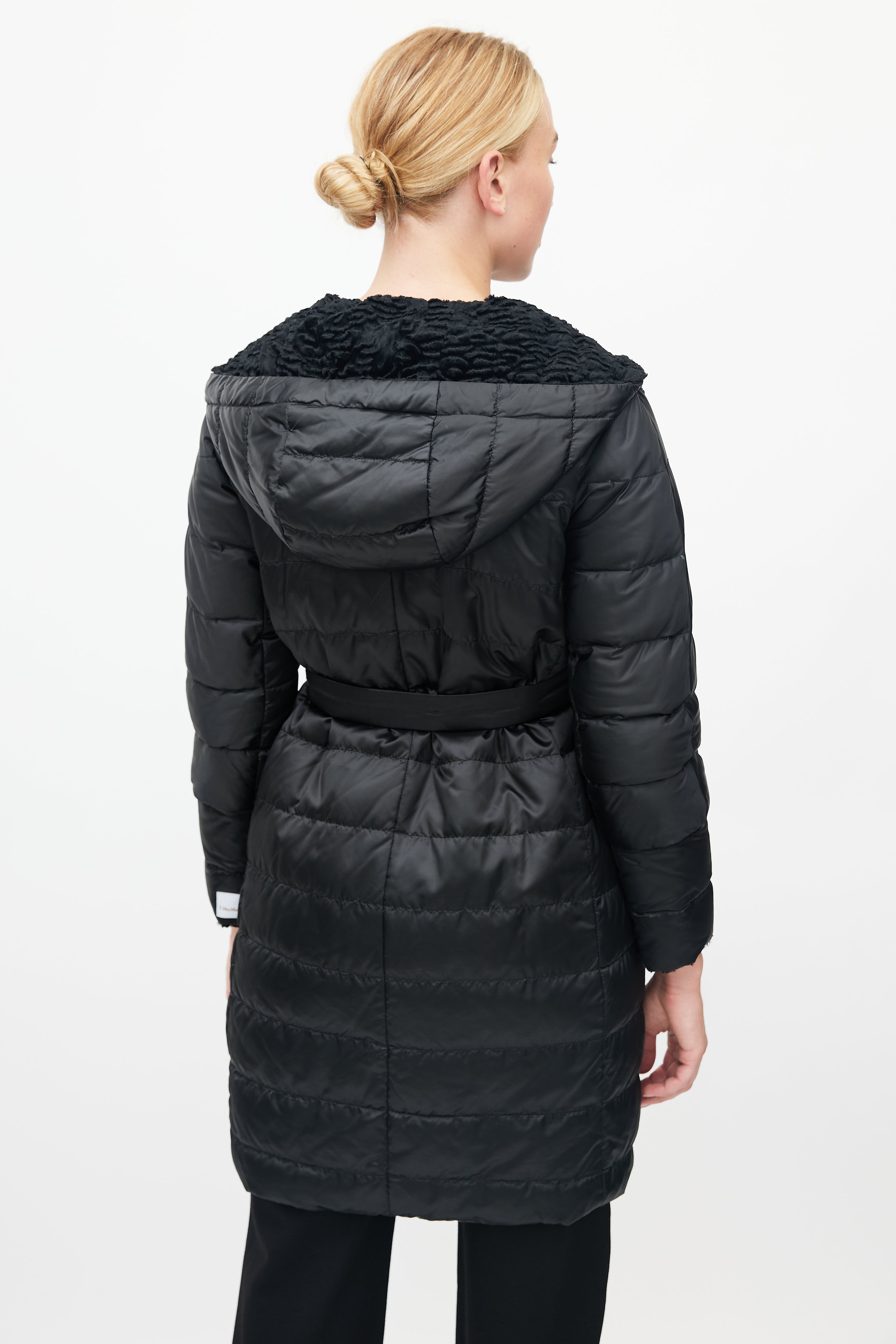 Pre-owned 'S Max Mara reversible coat featuring quilted nylon on one side and textured faux fur on the other, reversible hood, snap buttons, down fill, reflective 'S Max Mara tag at wrist and detachable belt which can be used for both sides.